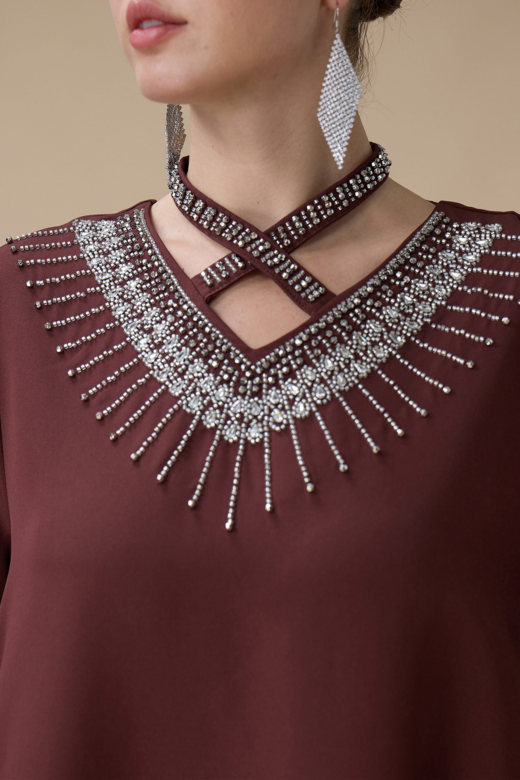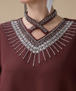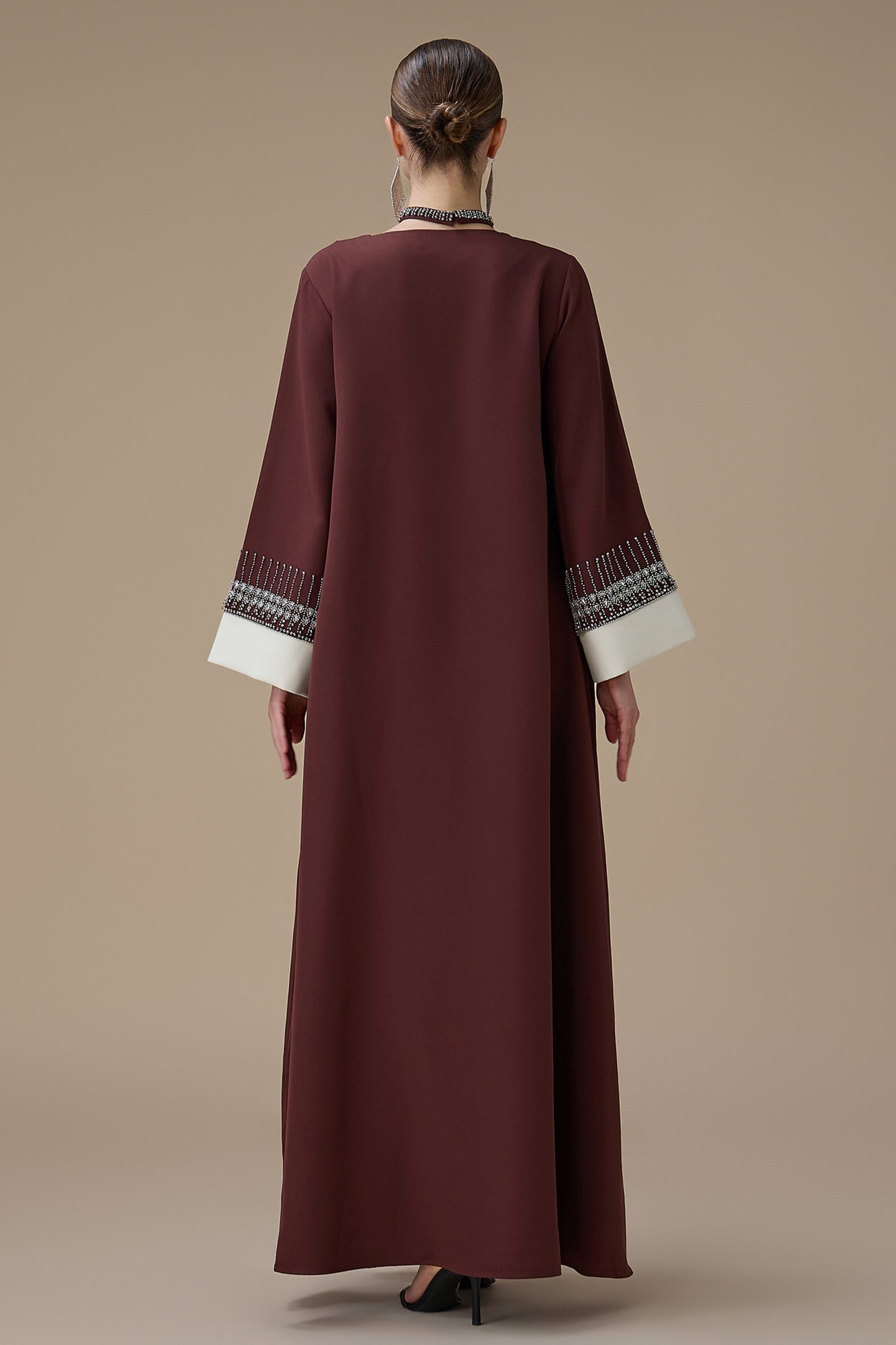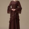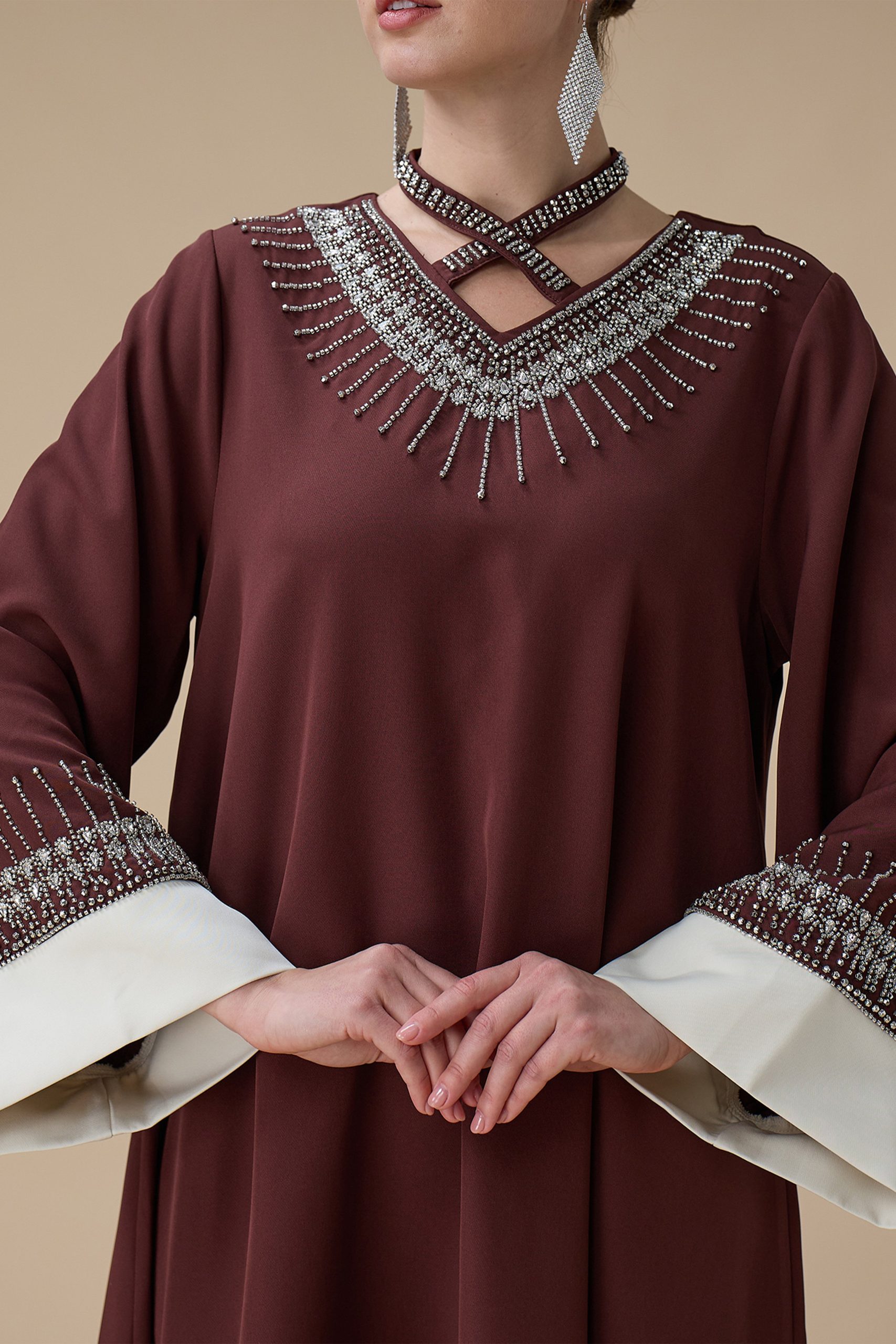 نوع القصة: جلابية طويلة بني بتطريز انيق بياقة متقاطعة وأكمام طويلة –