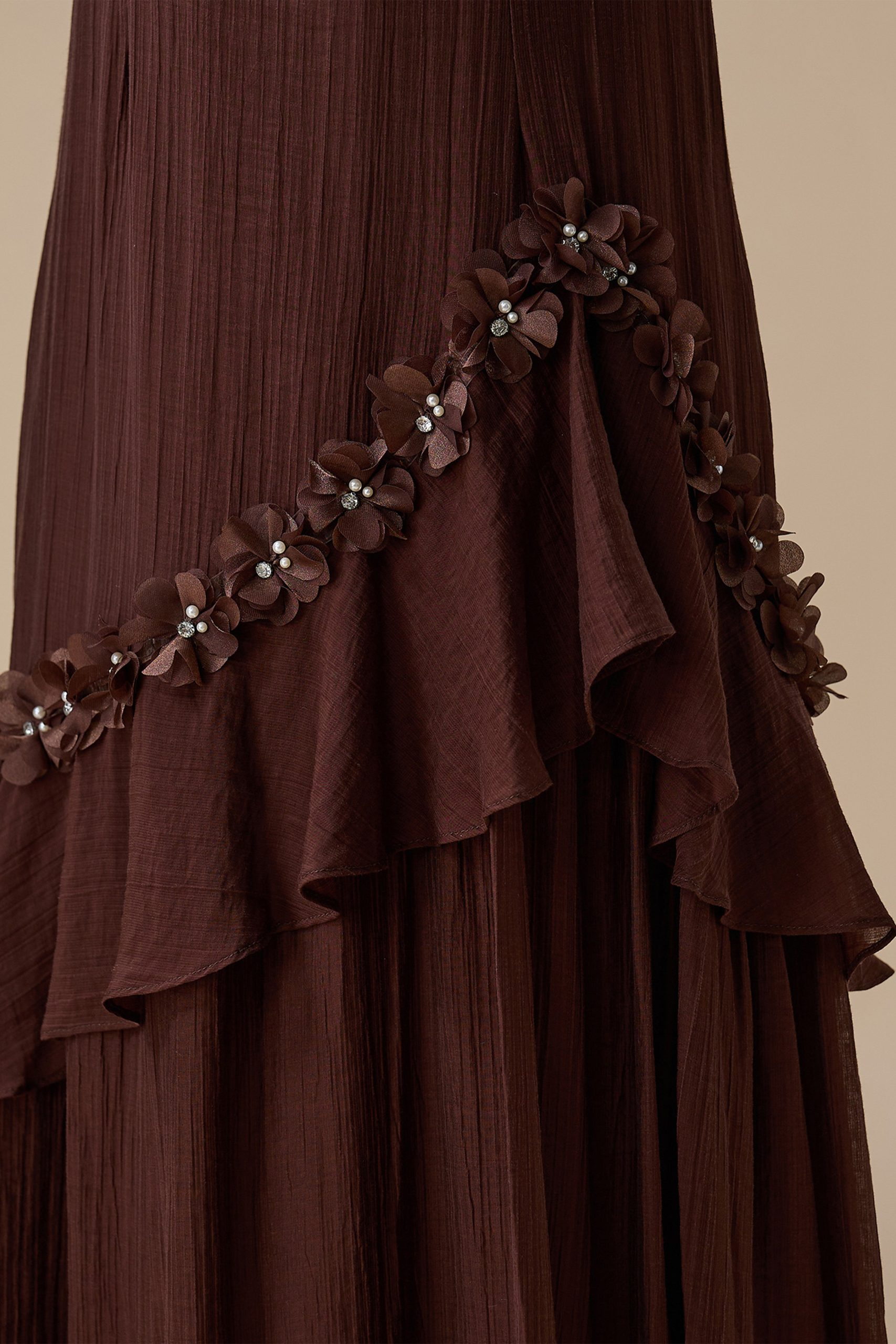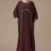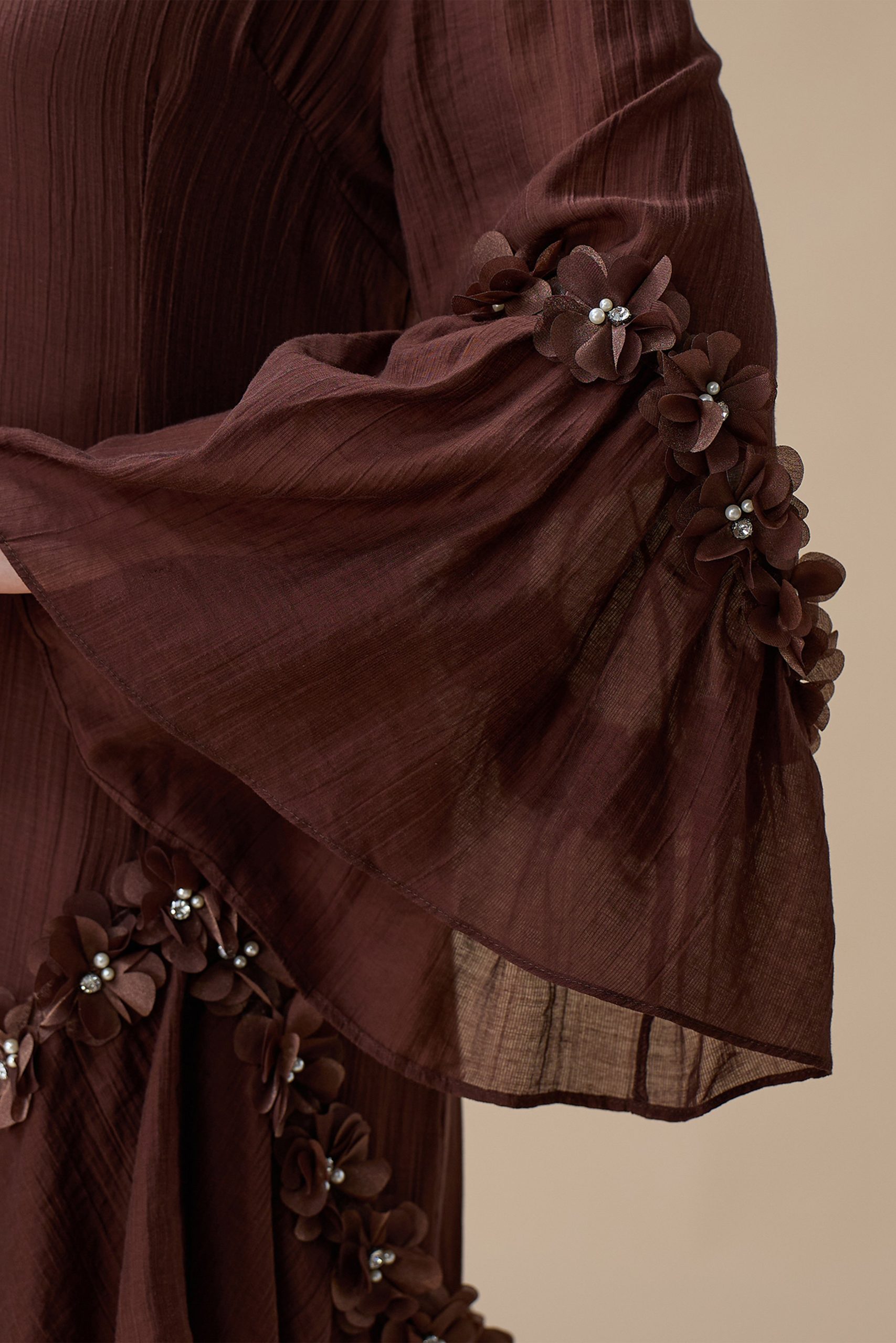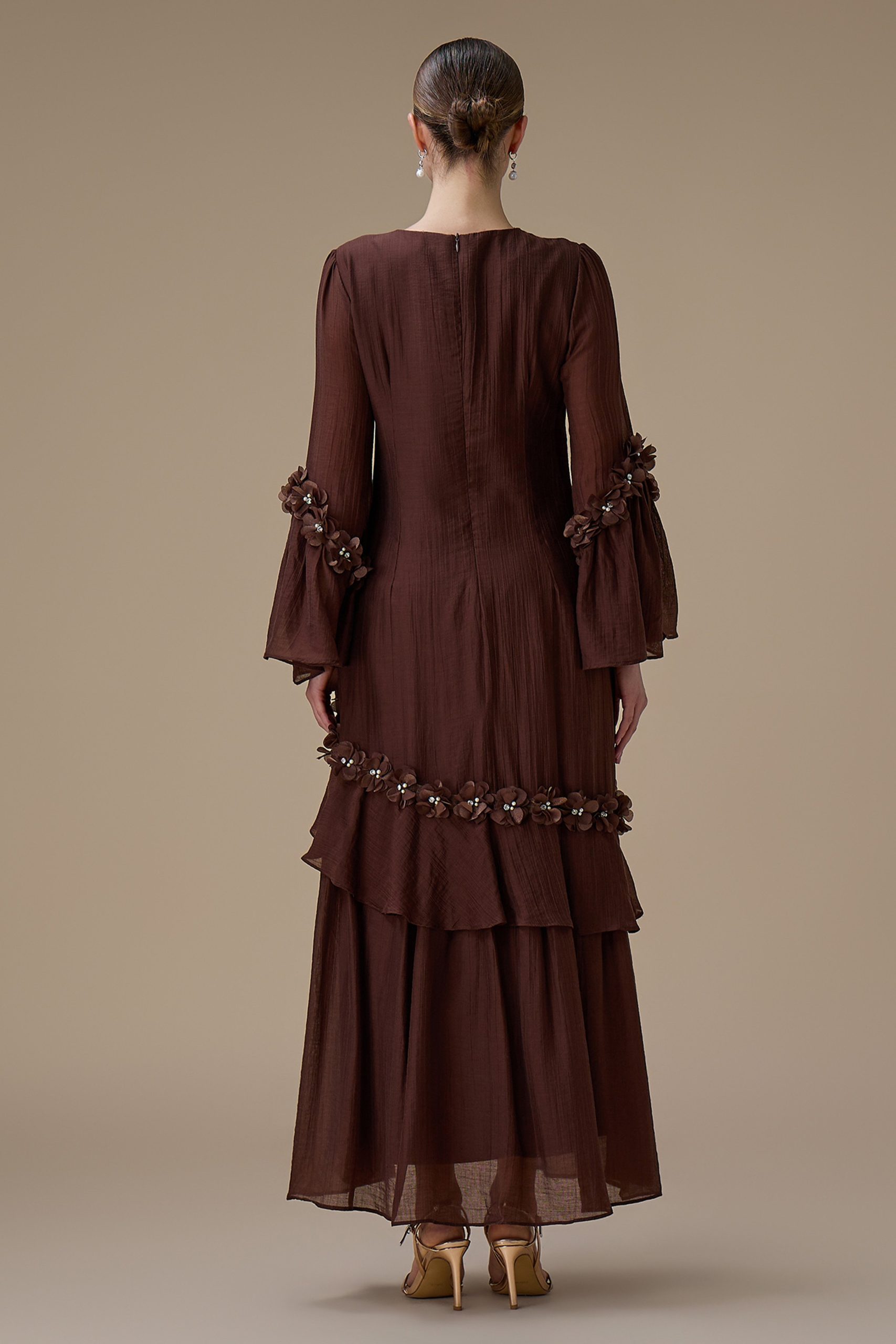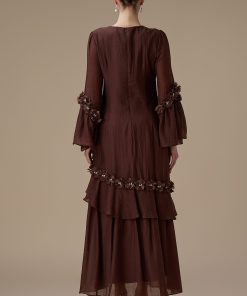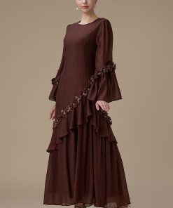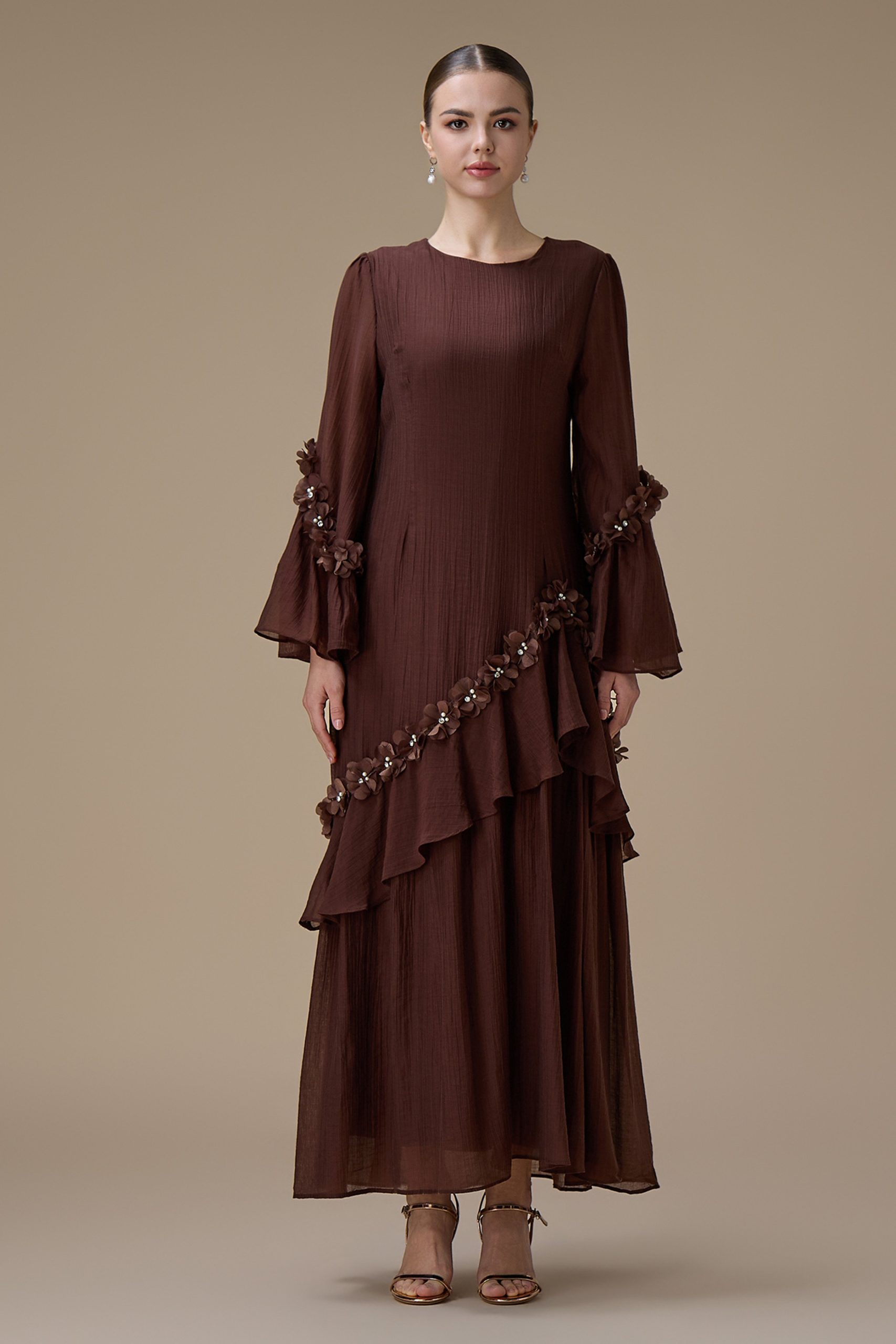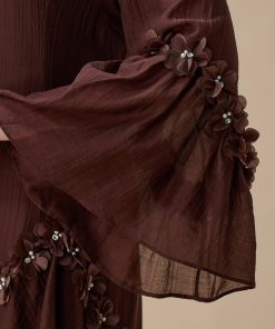 نوع القصة: جلابية طويلة بني أنيقة بتفاصيل كشكش وزهور ثلاثية الأبعاد بأكمام طويلة وياقة دائرية –