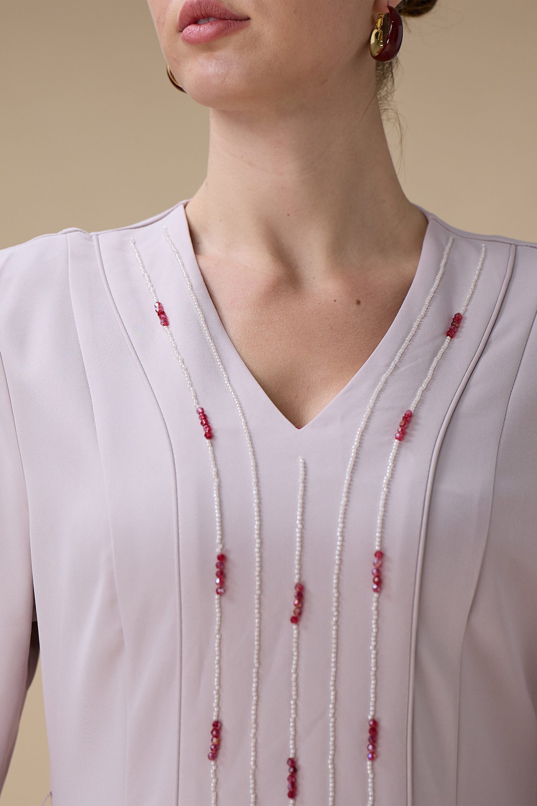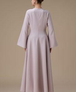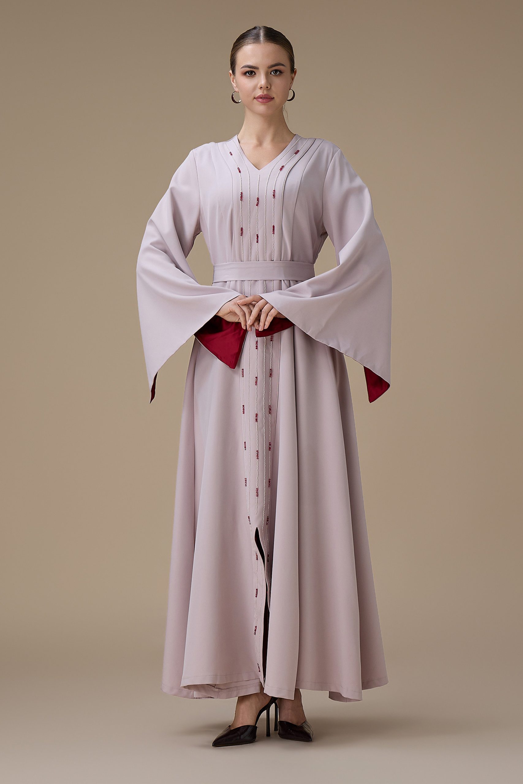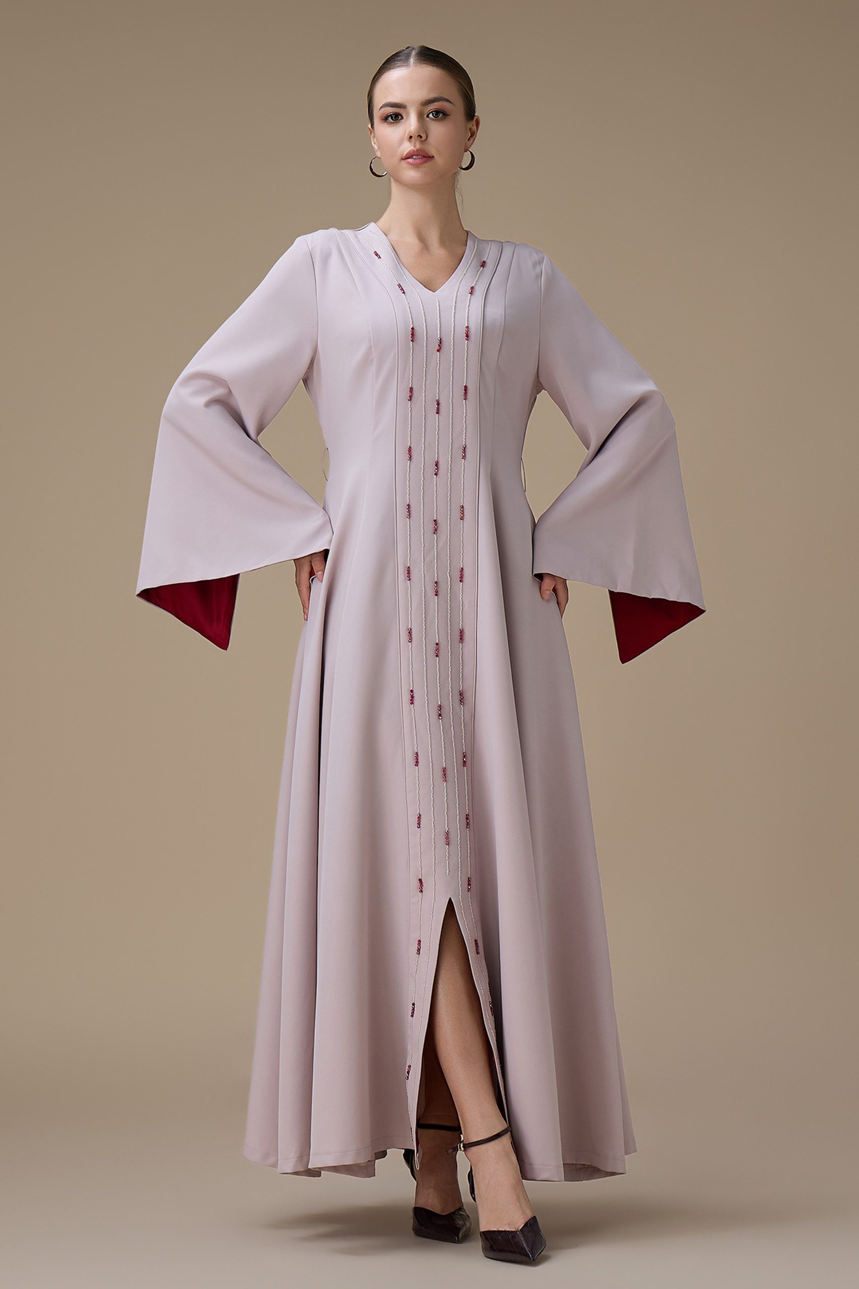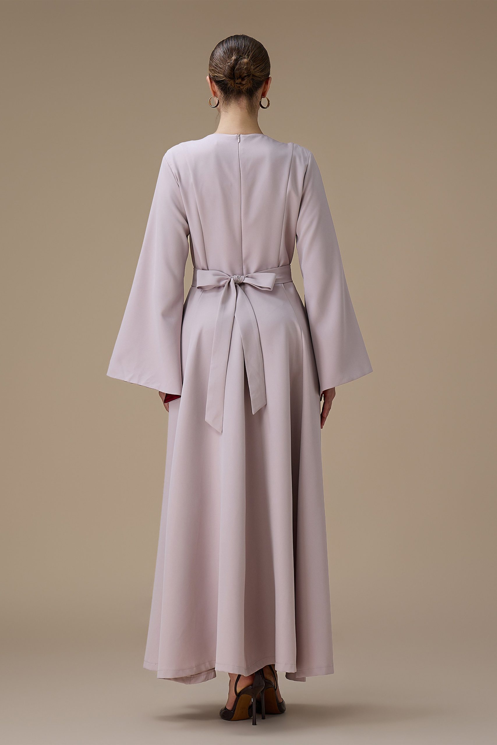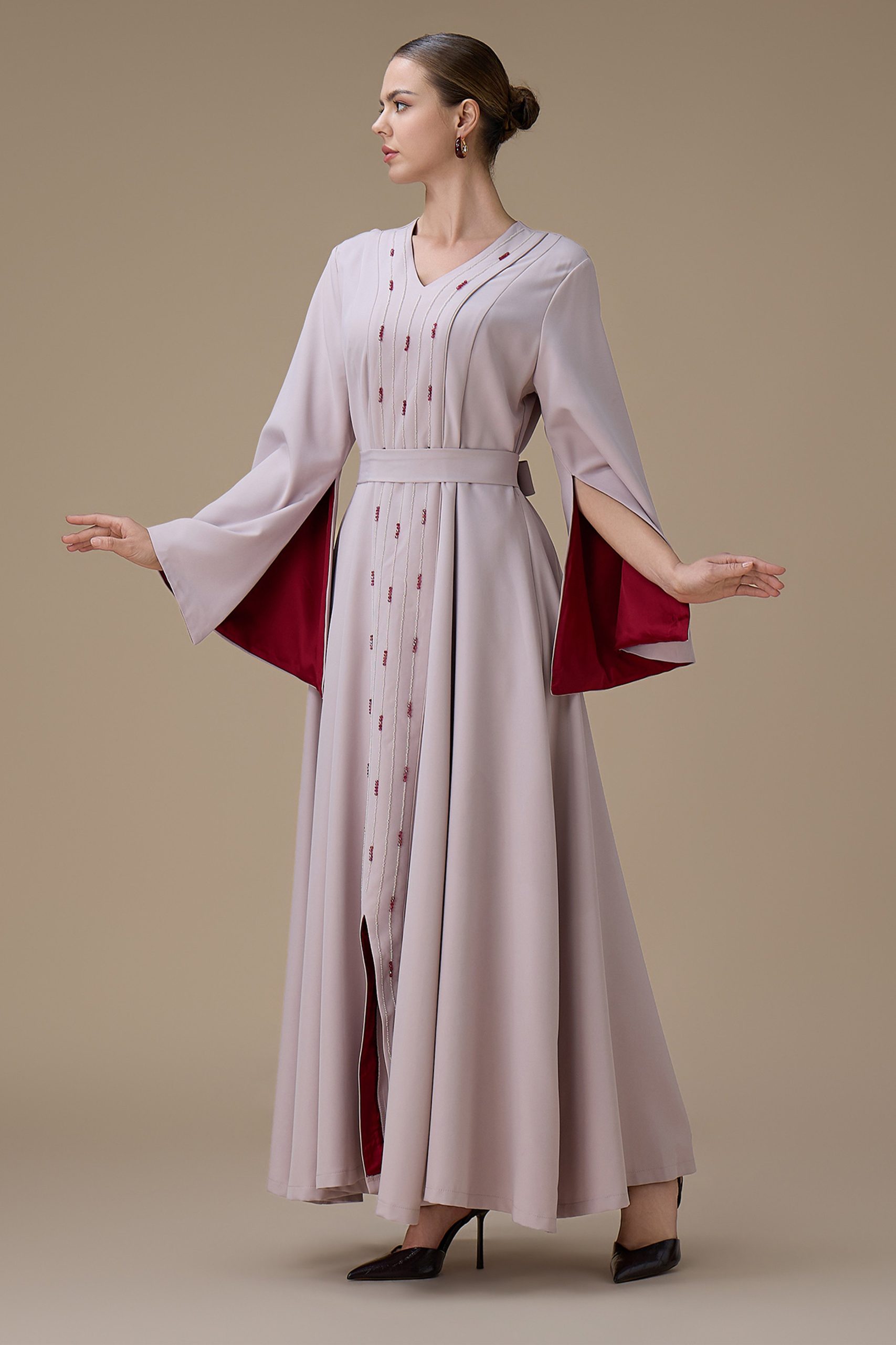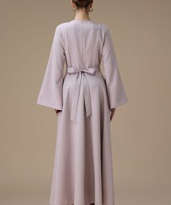 نوع القصة: فستان طويل وردي فاتح مع تطريز ناعم بأكمام طويلة واسعة وحزام عالخصر –