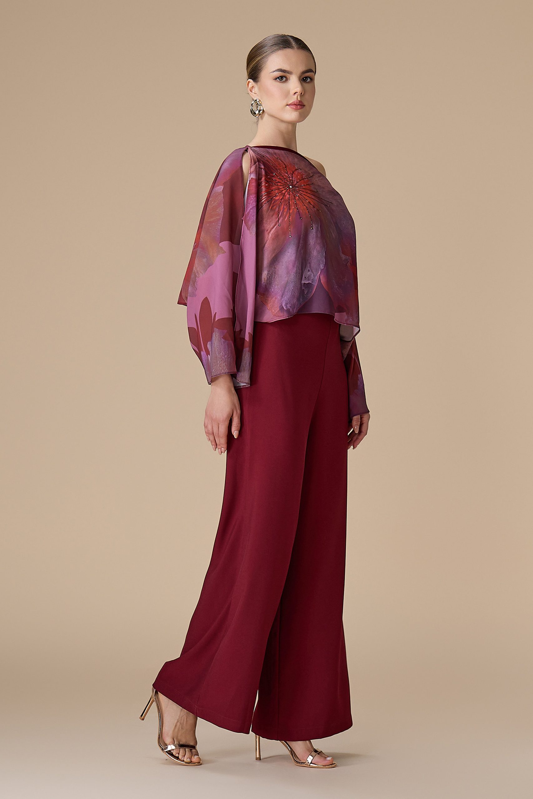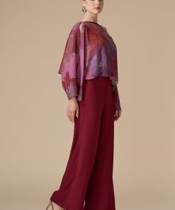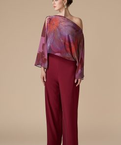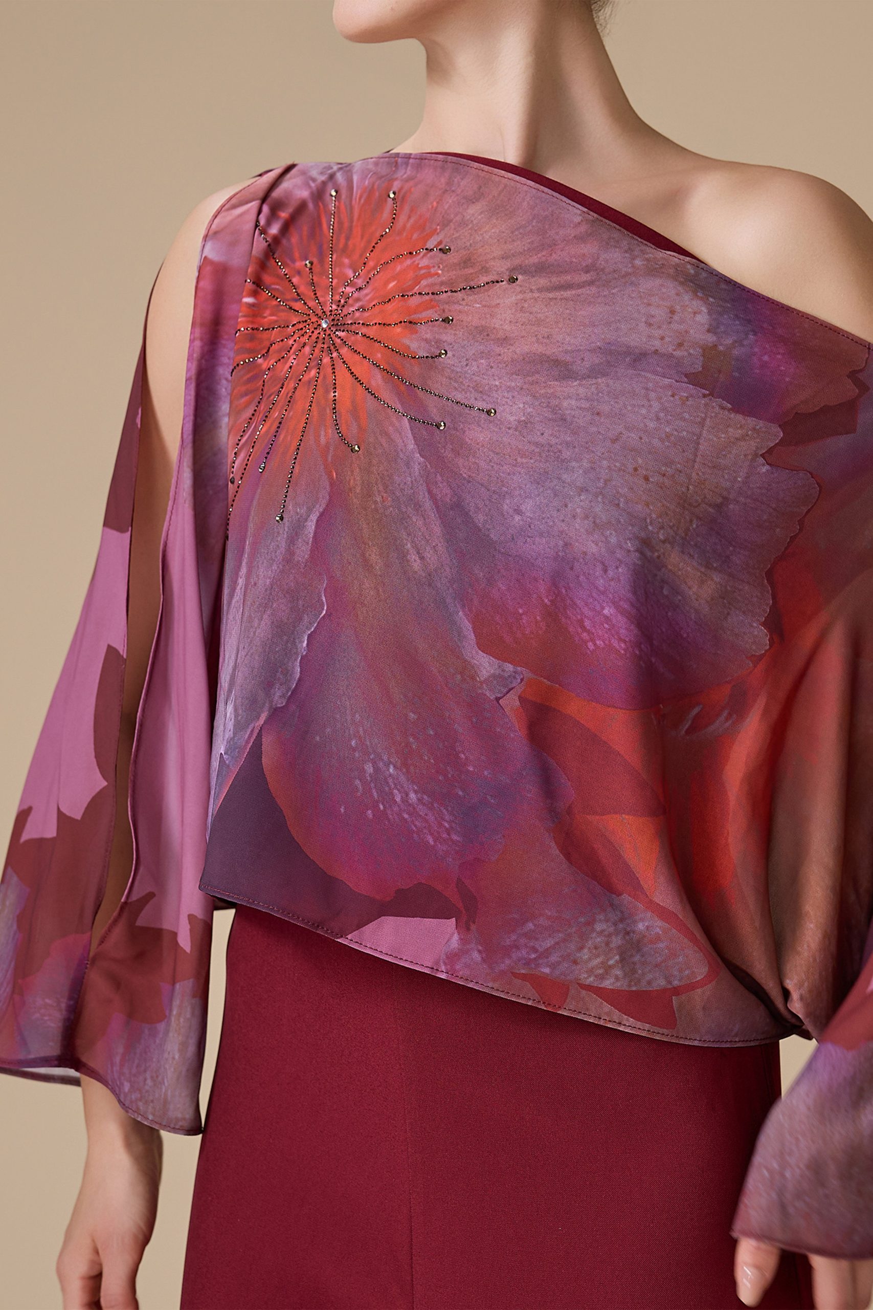 اكتان – جمبسوت عنابي مع طبقة شيفون مطبوعة
