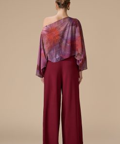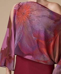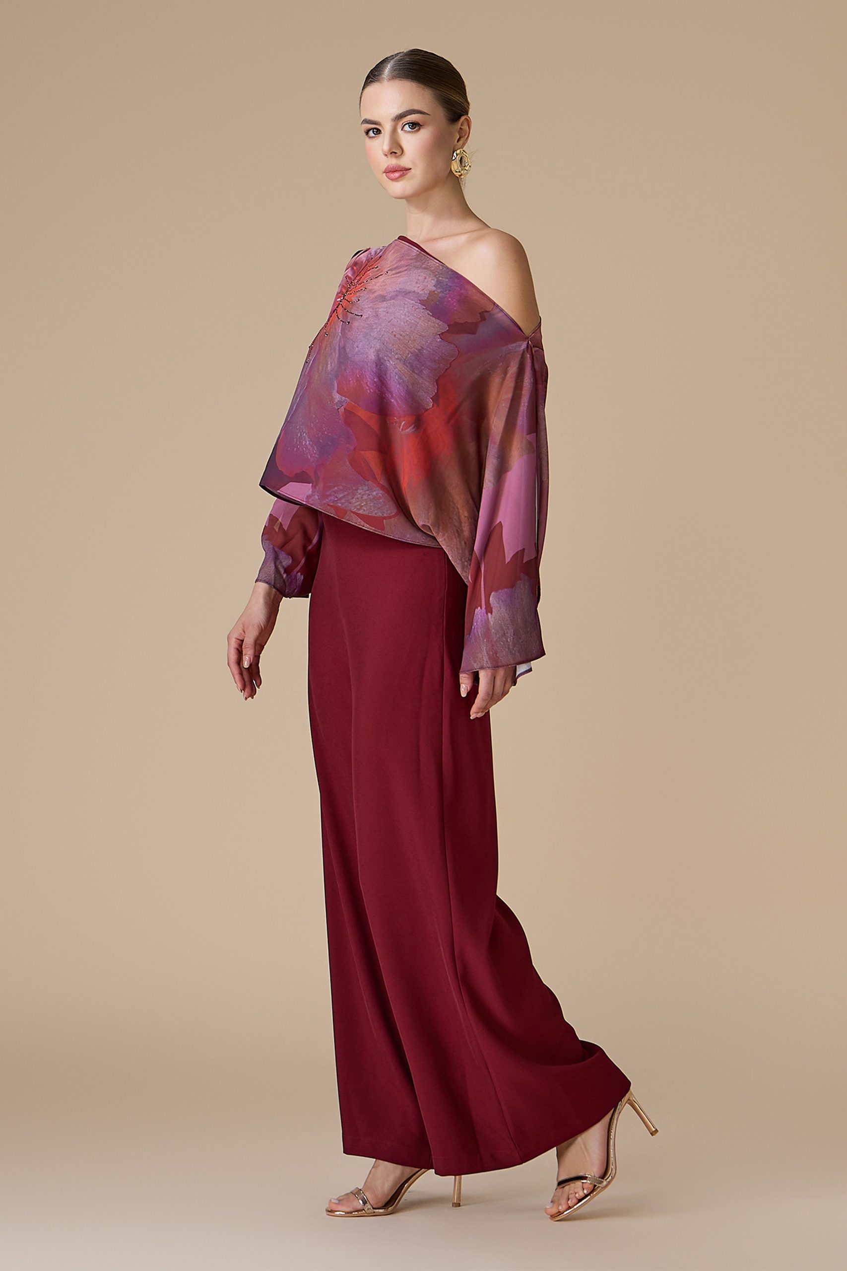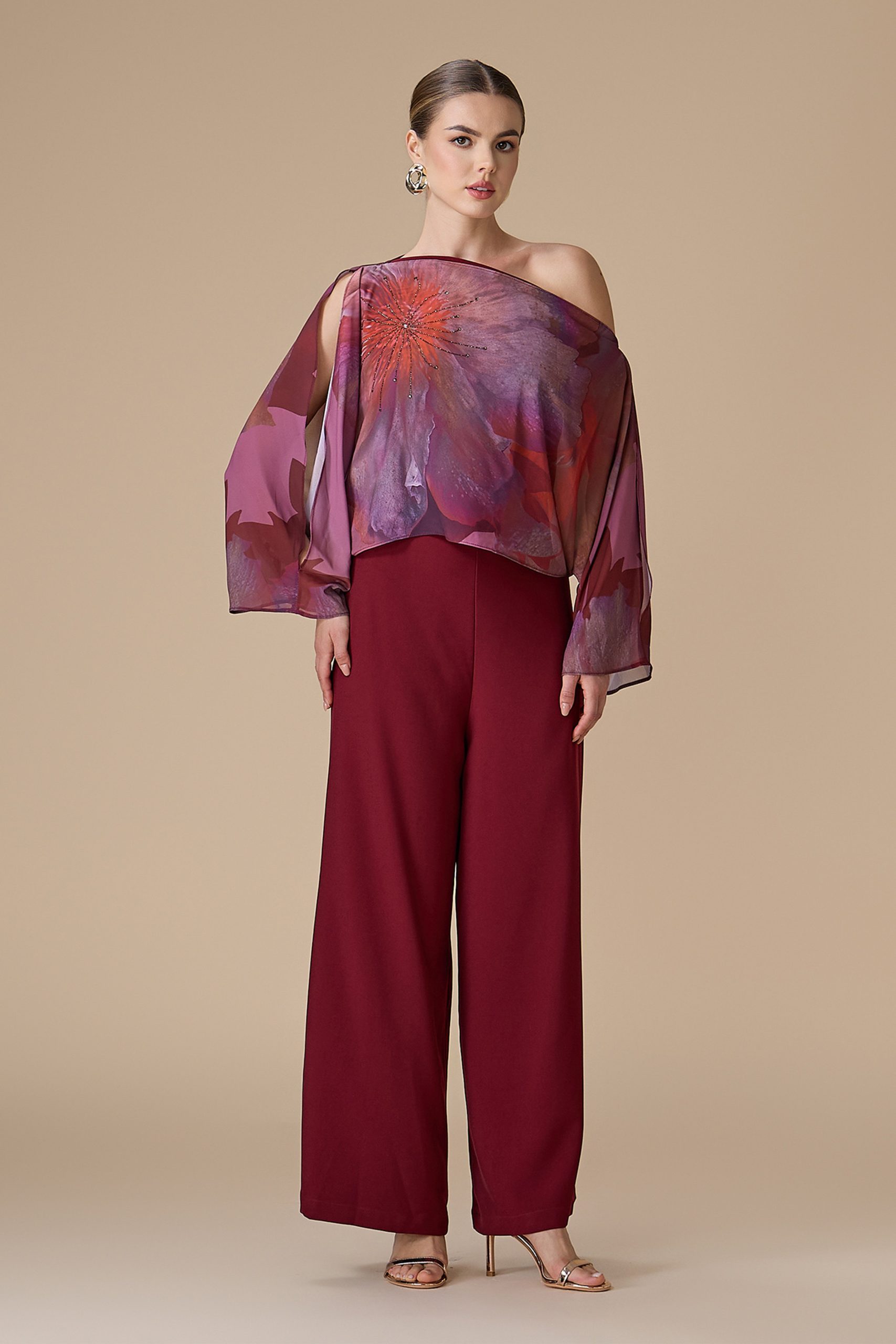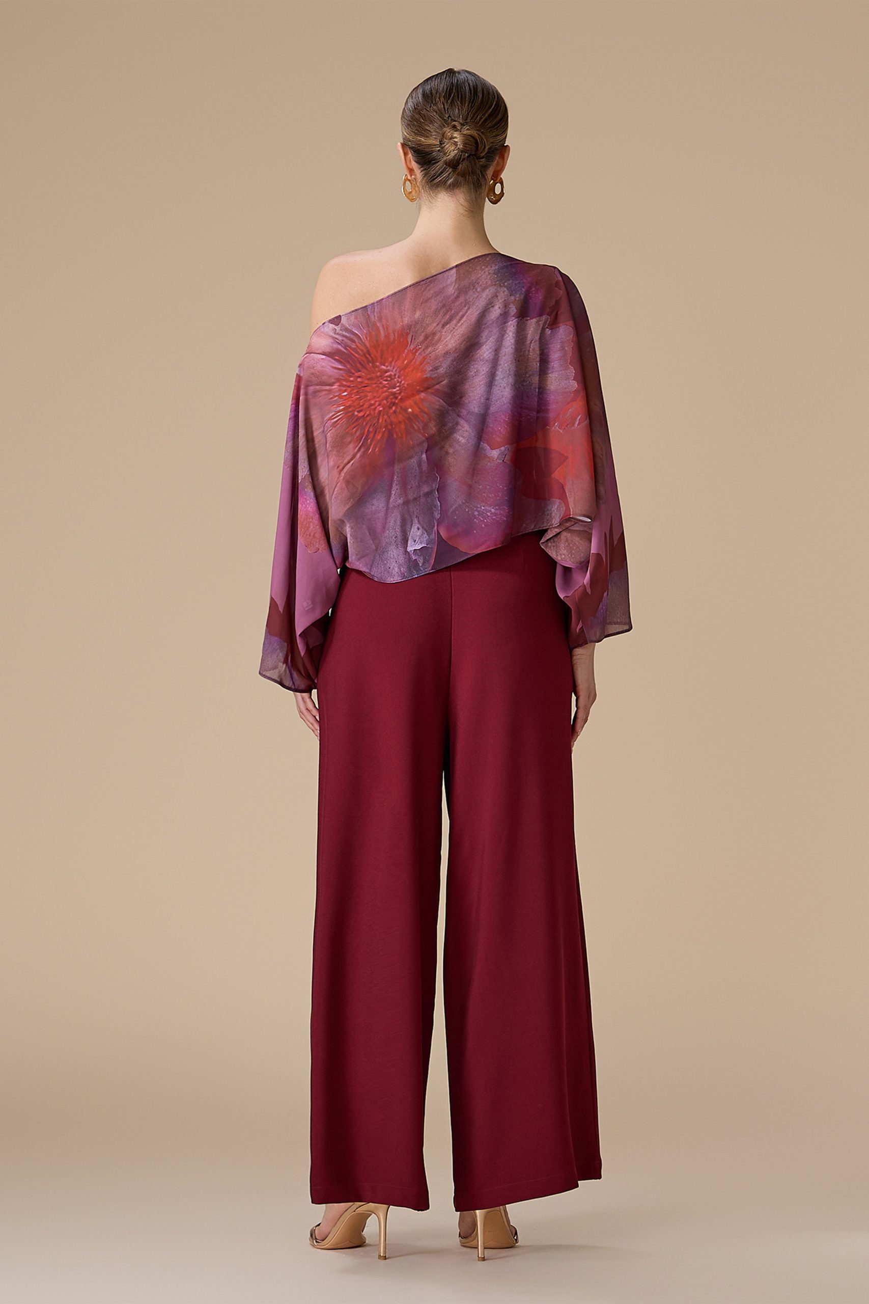 اكتان – جمبسوت عنابي مع طبقة شيفون مطبوعة