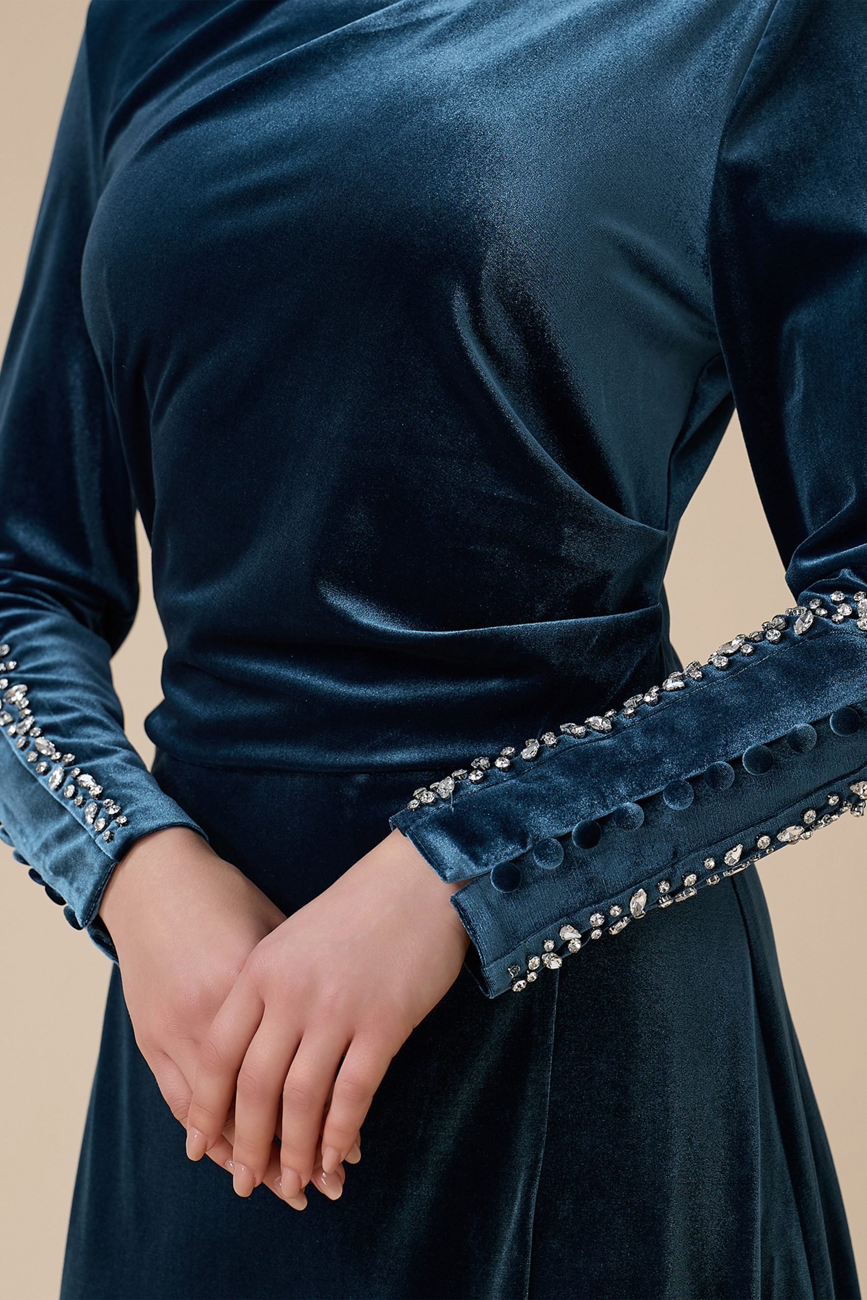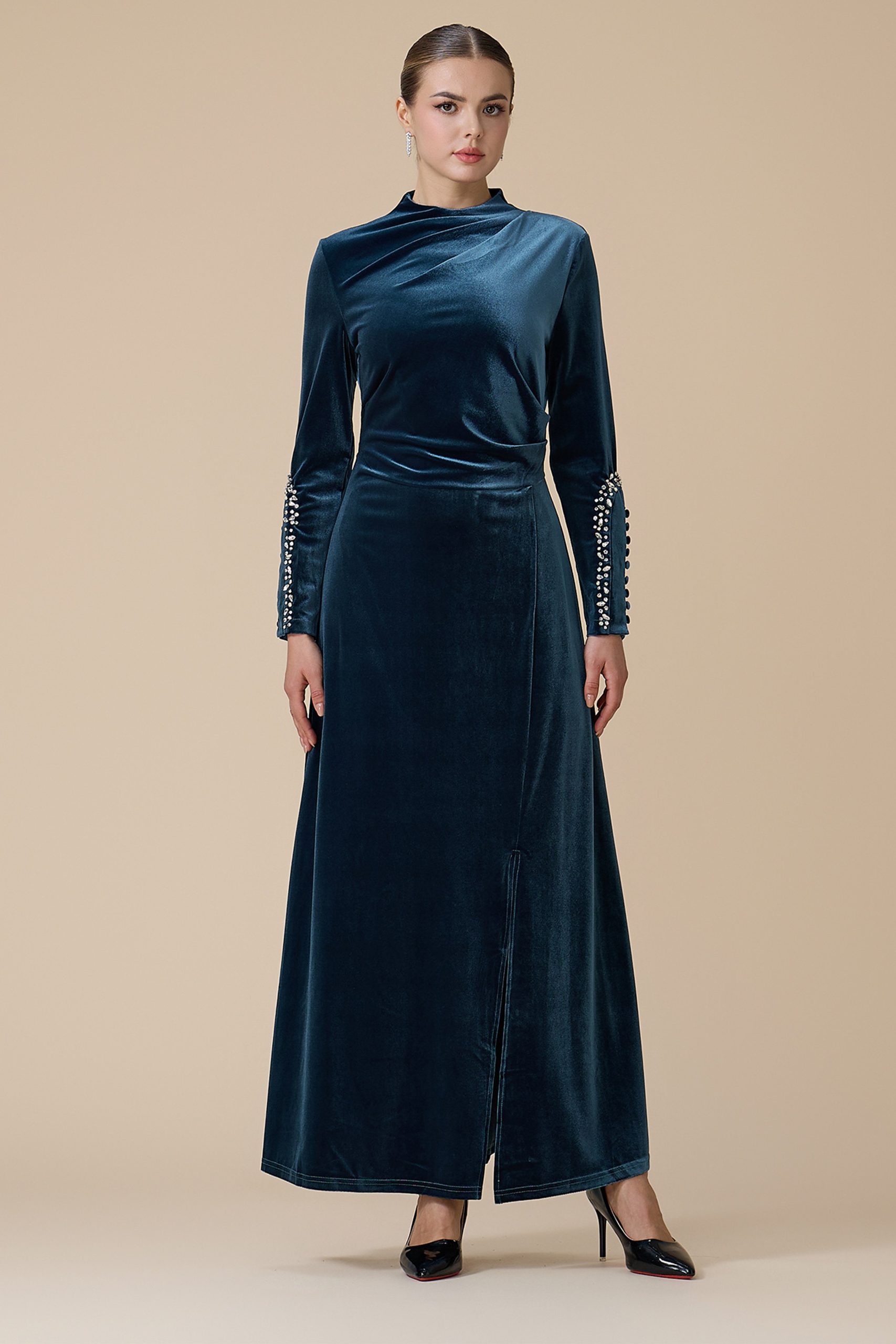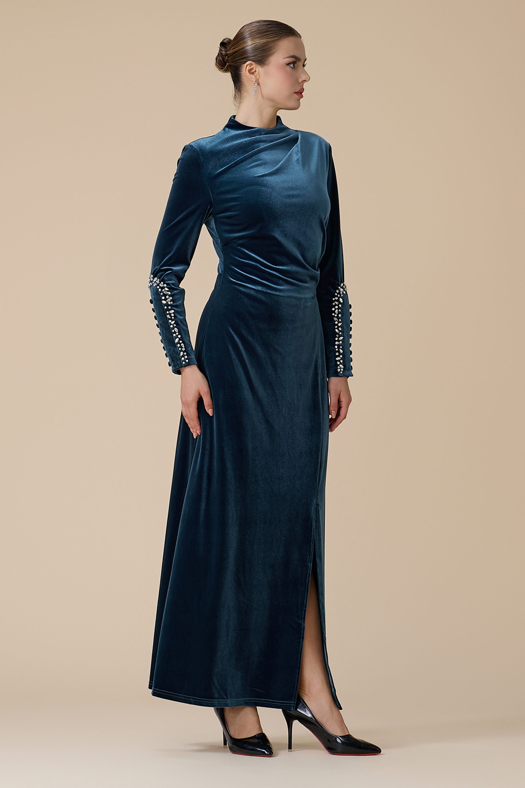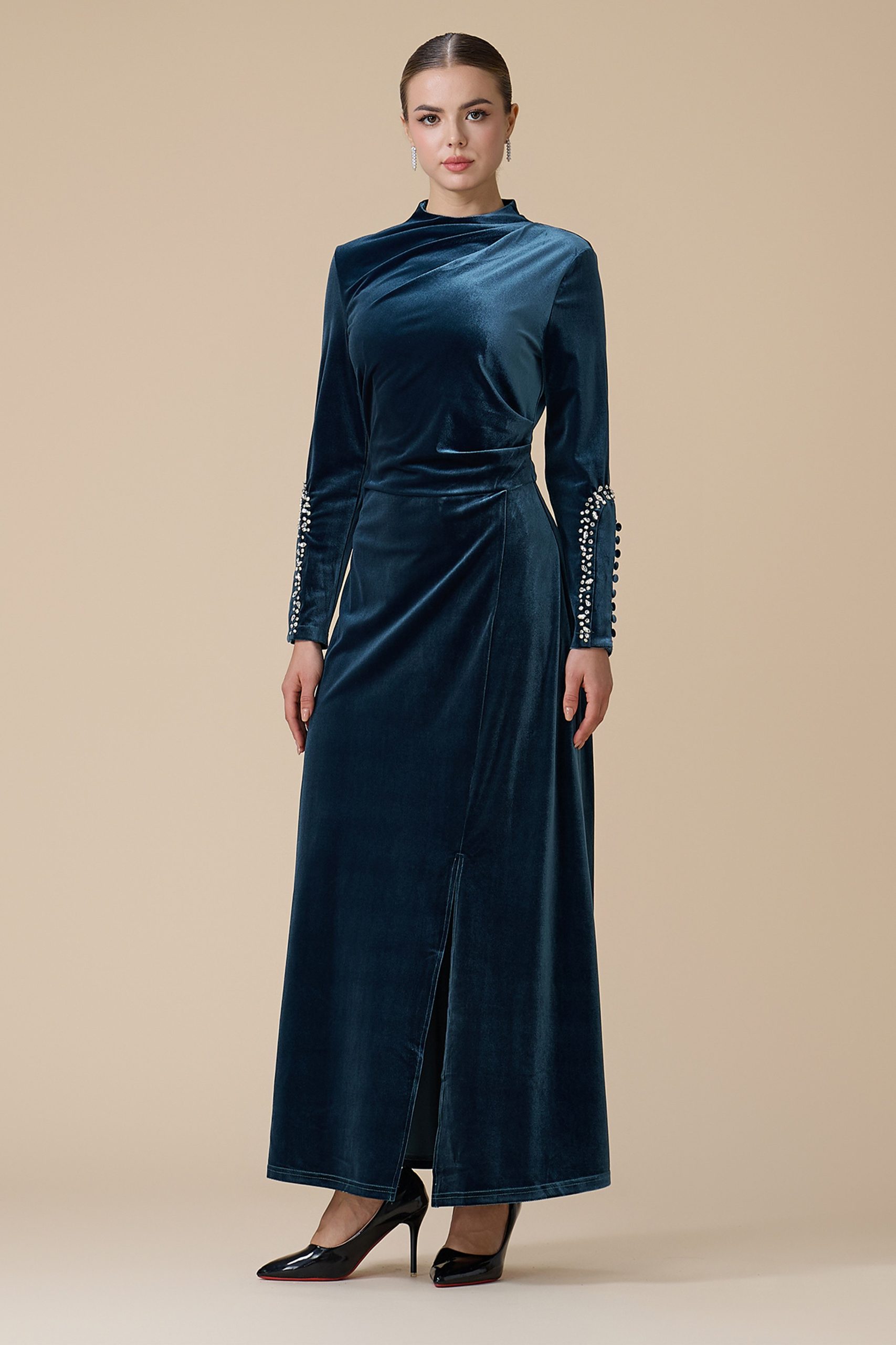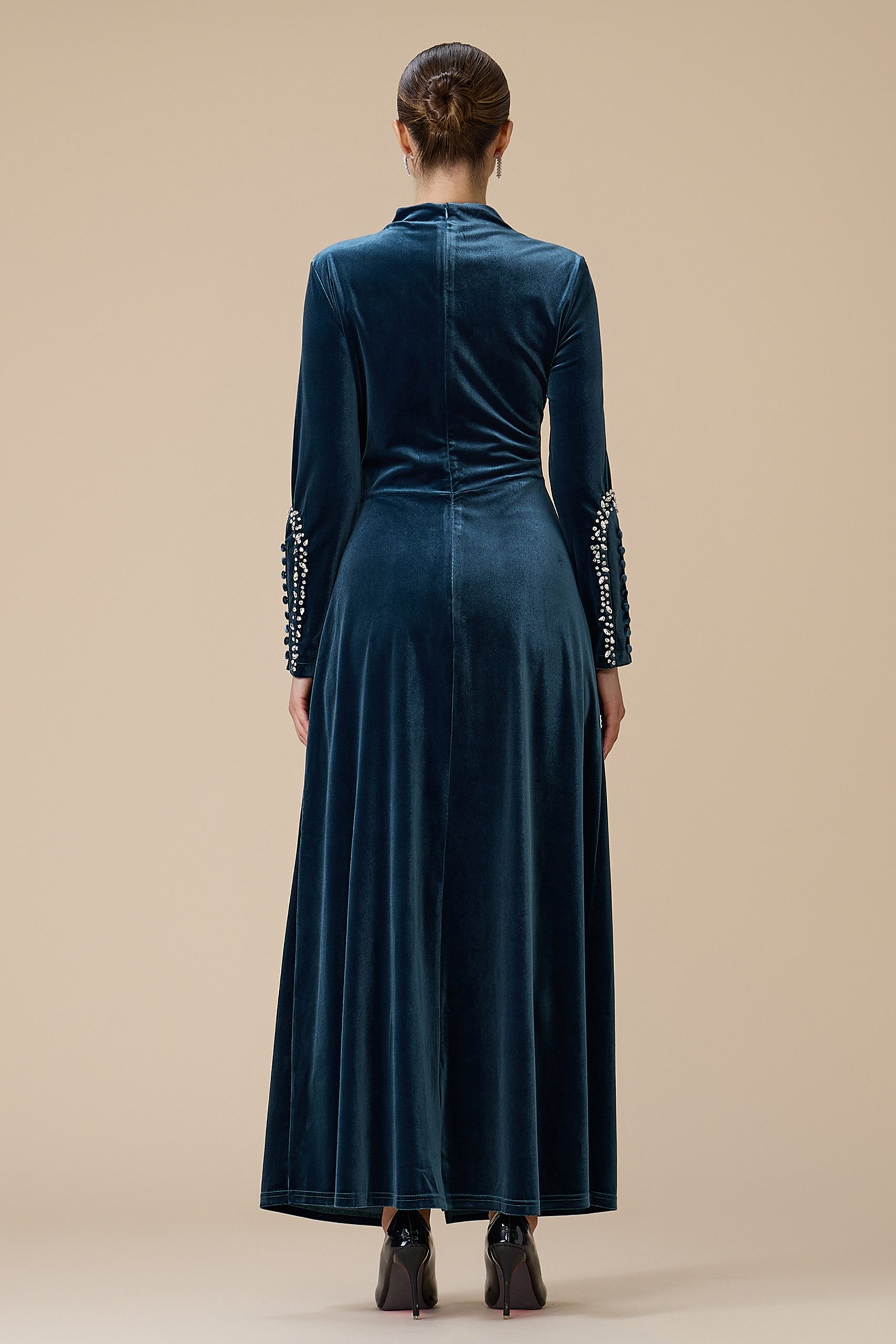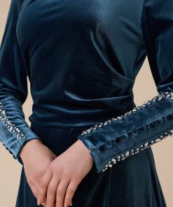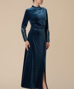 اكتان – فستان أزرق طويل مخمل بأكمام طويلة