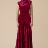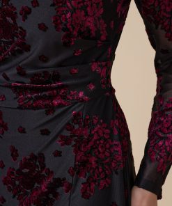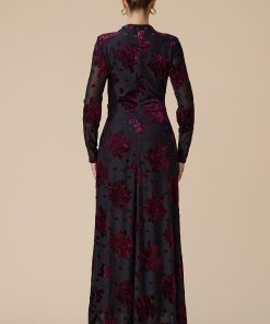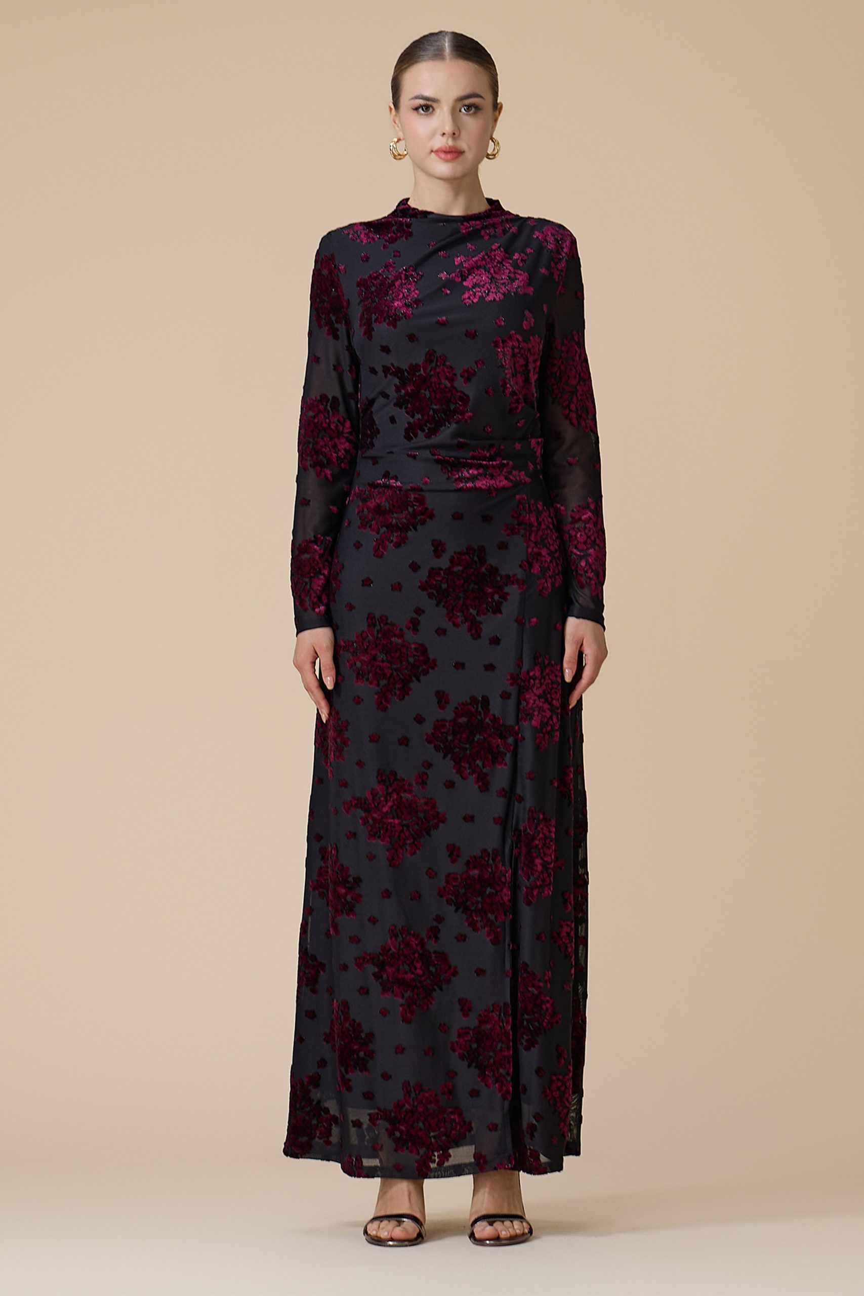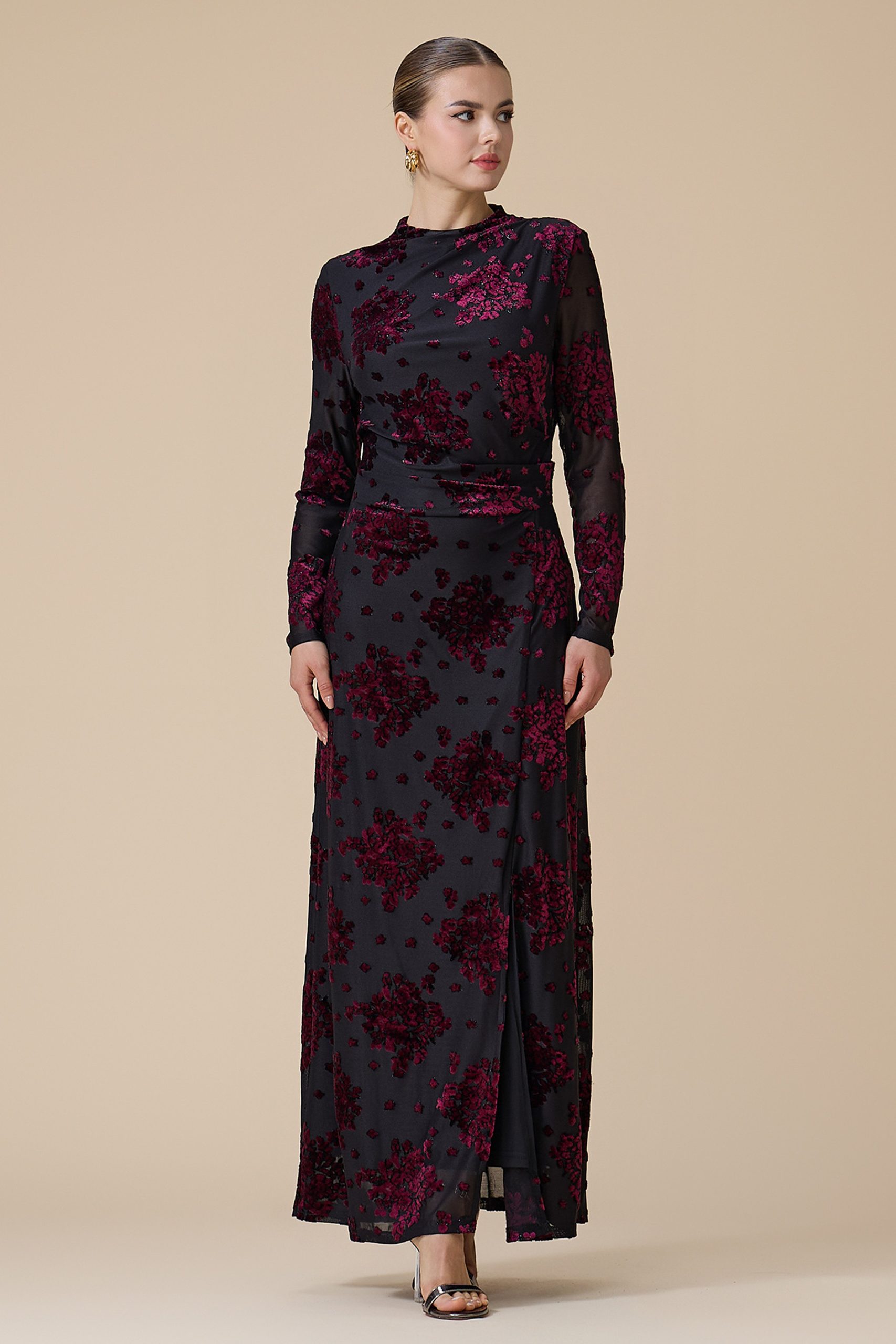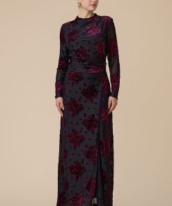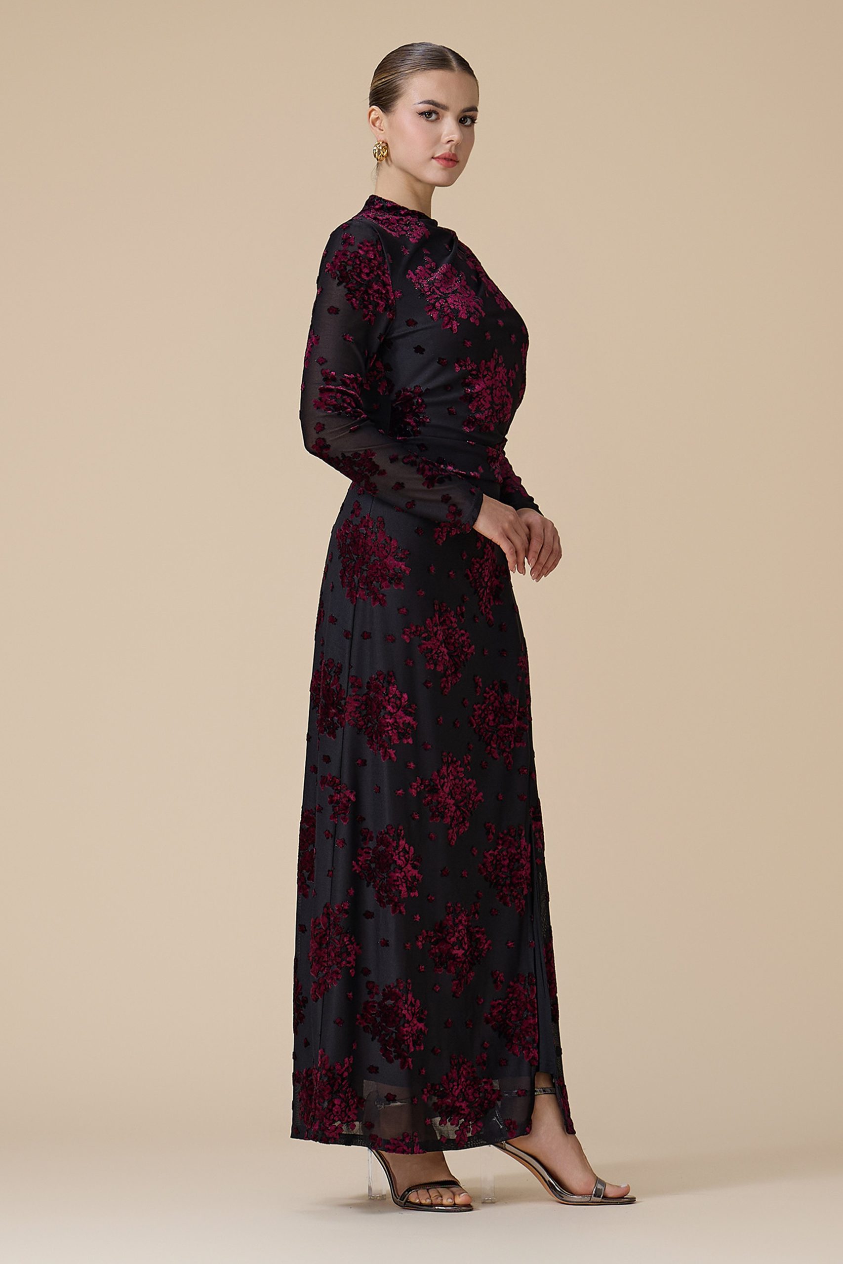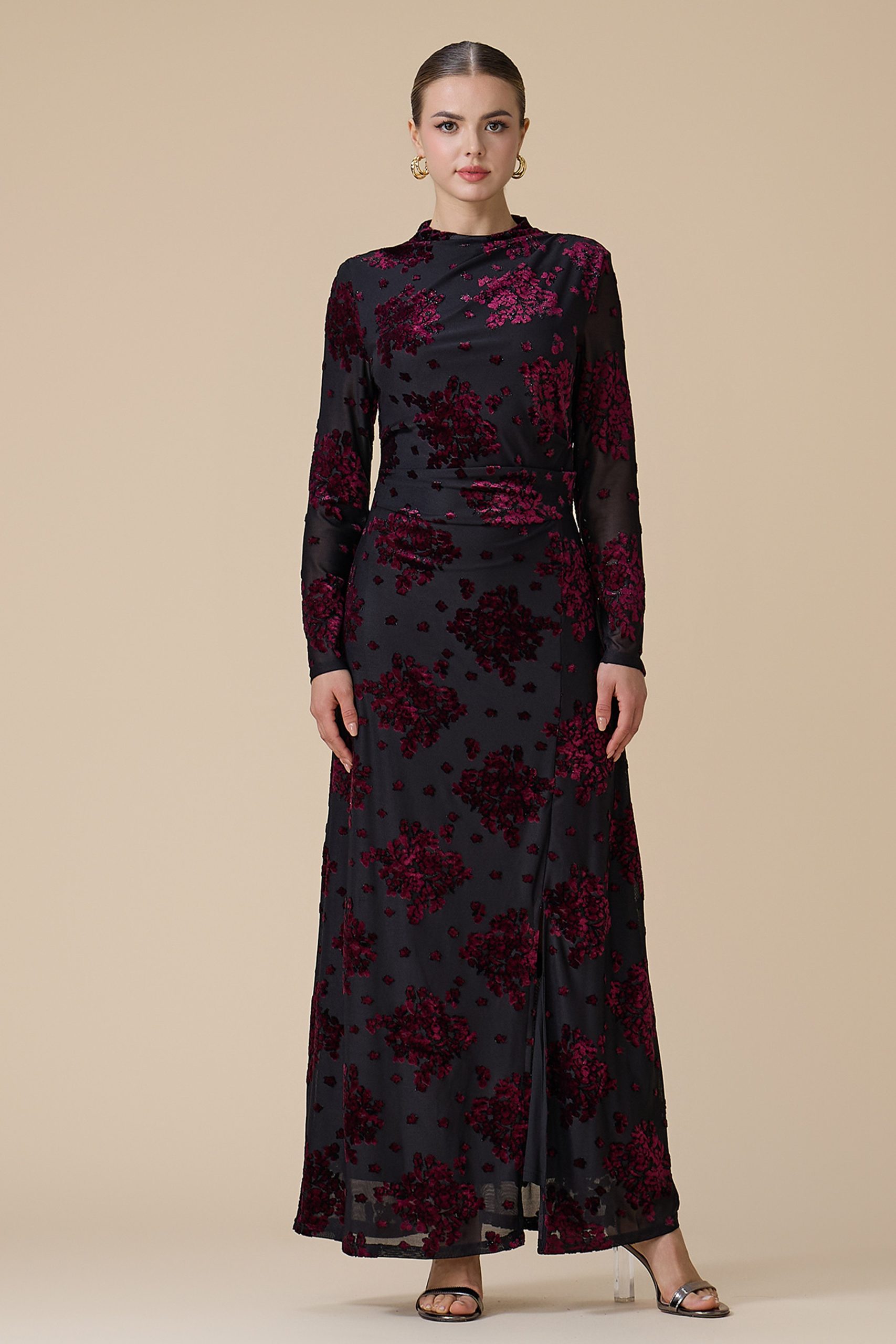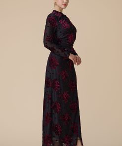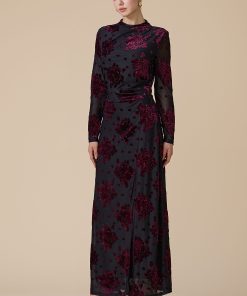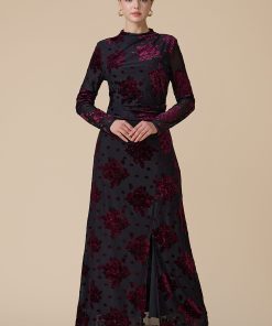 اكتان – فستان احمر طويل بنقش ورود مخملية