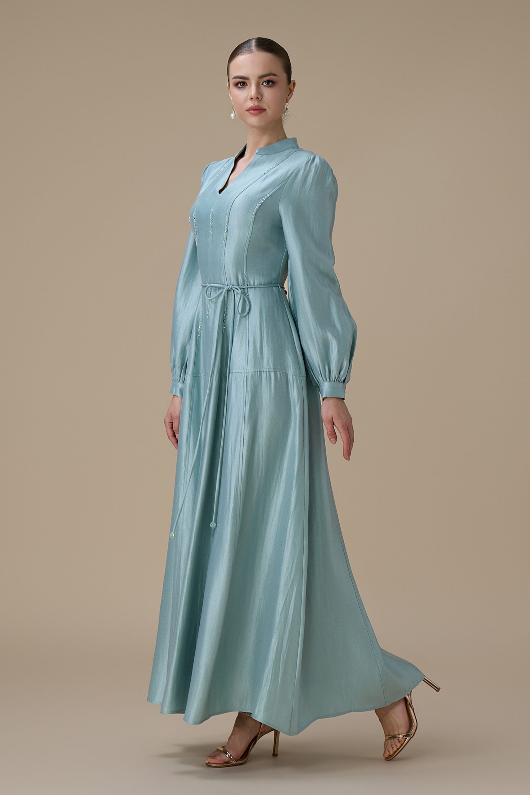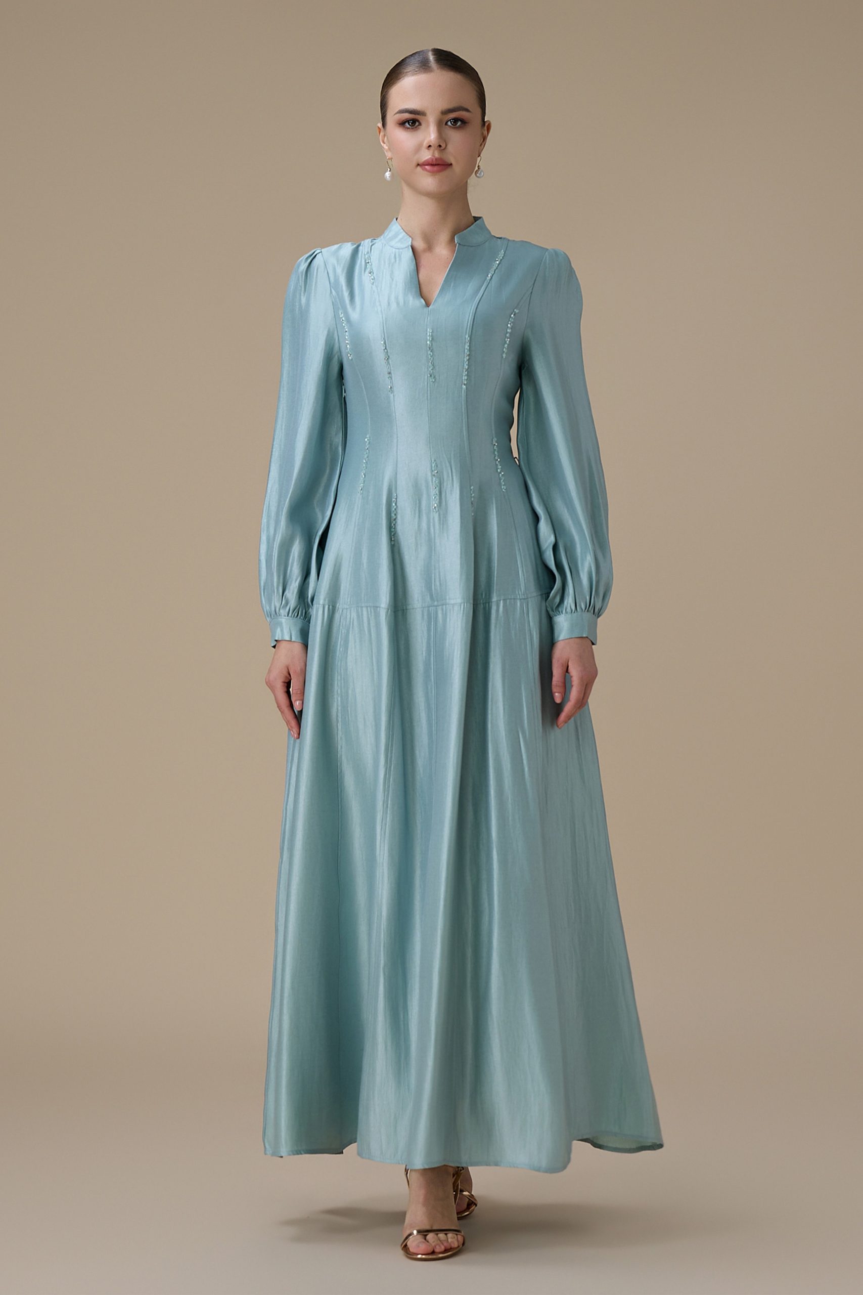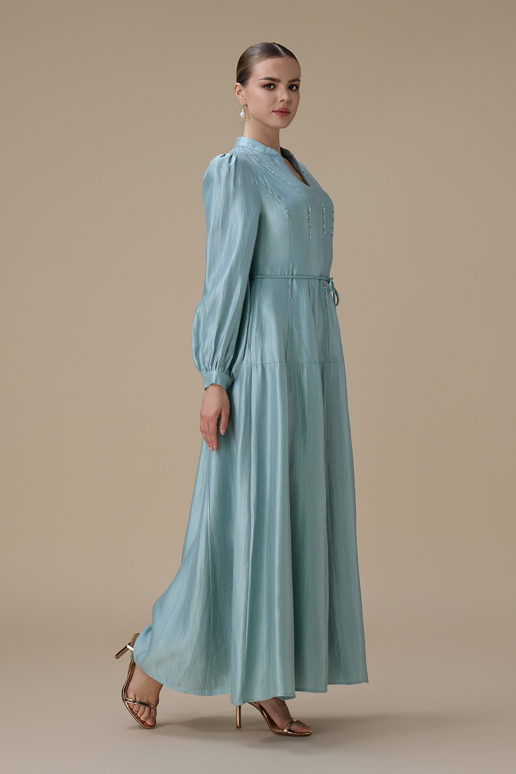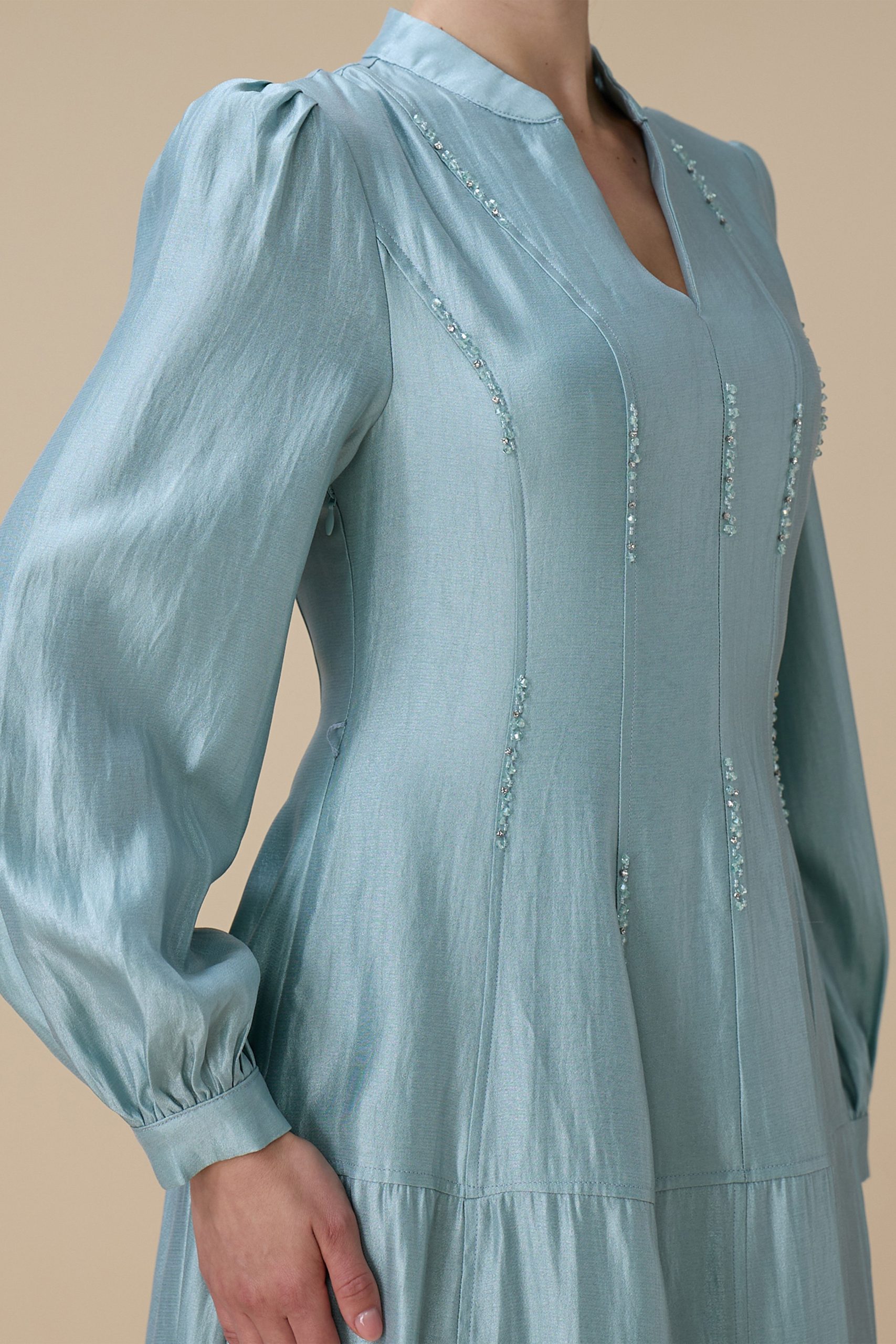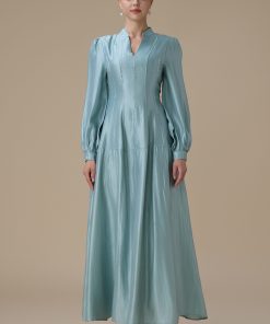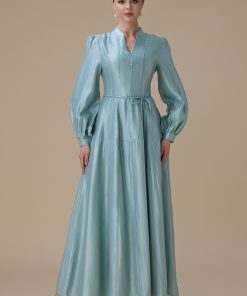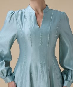 اكتان – فستان ازرق طويل بتطريز ناعم
