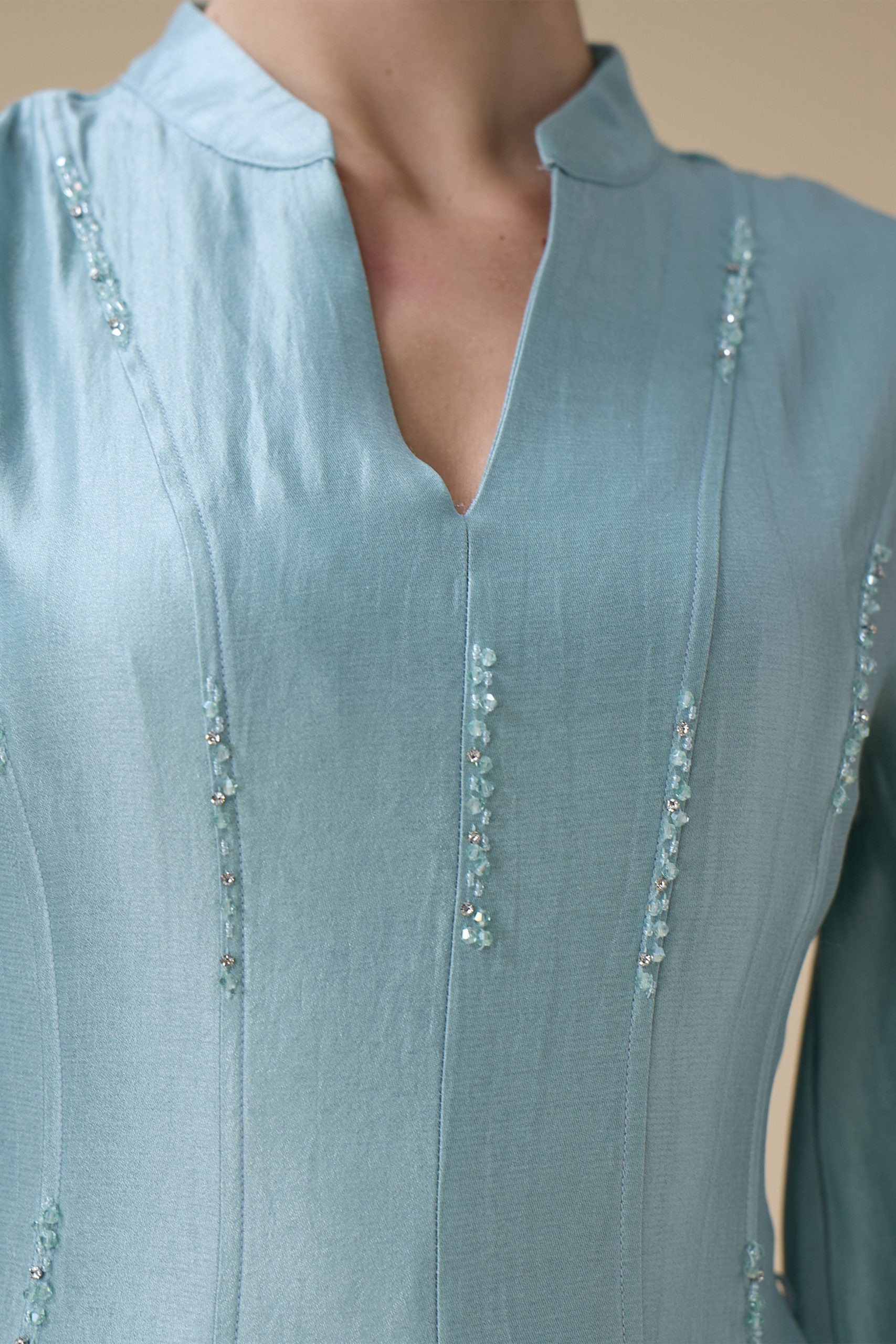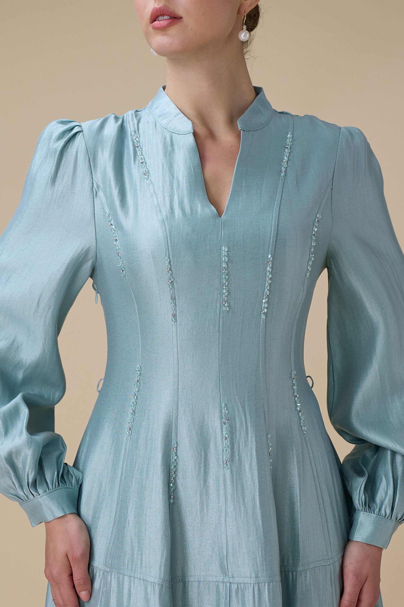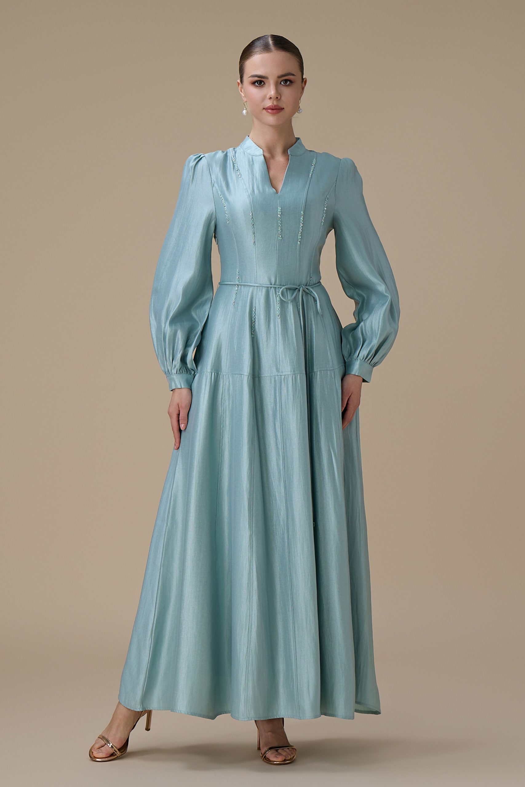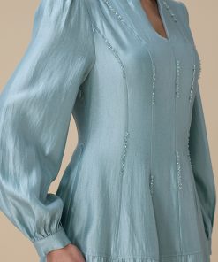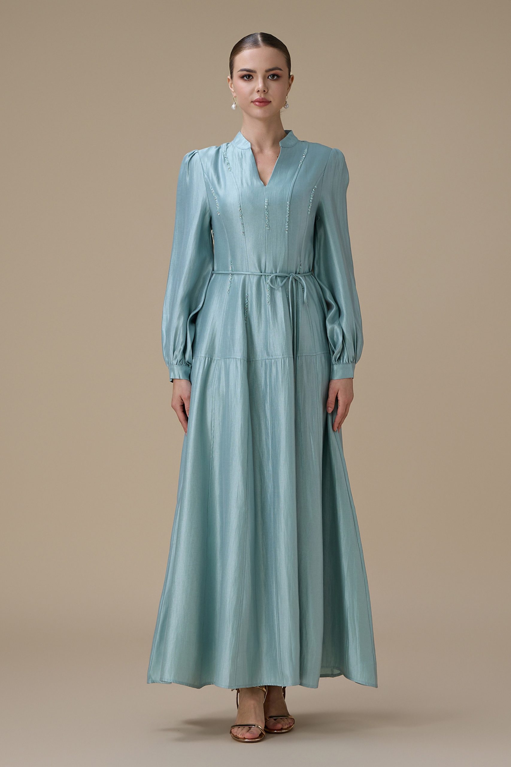 اكتان – فستان ازرق طويل بتطريز ناعم