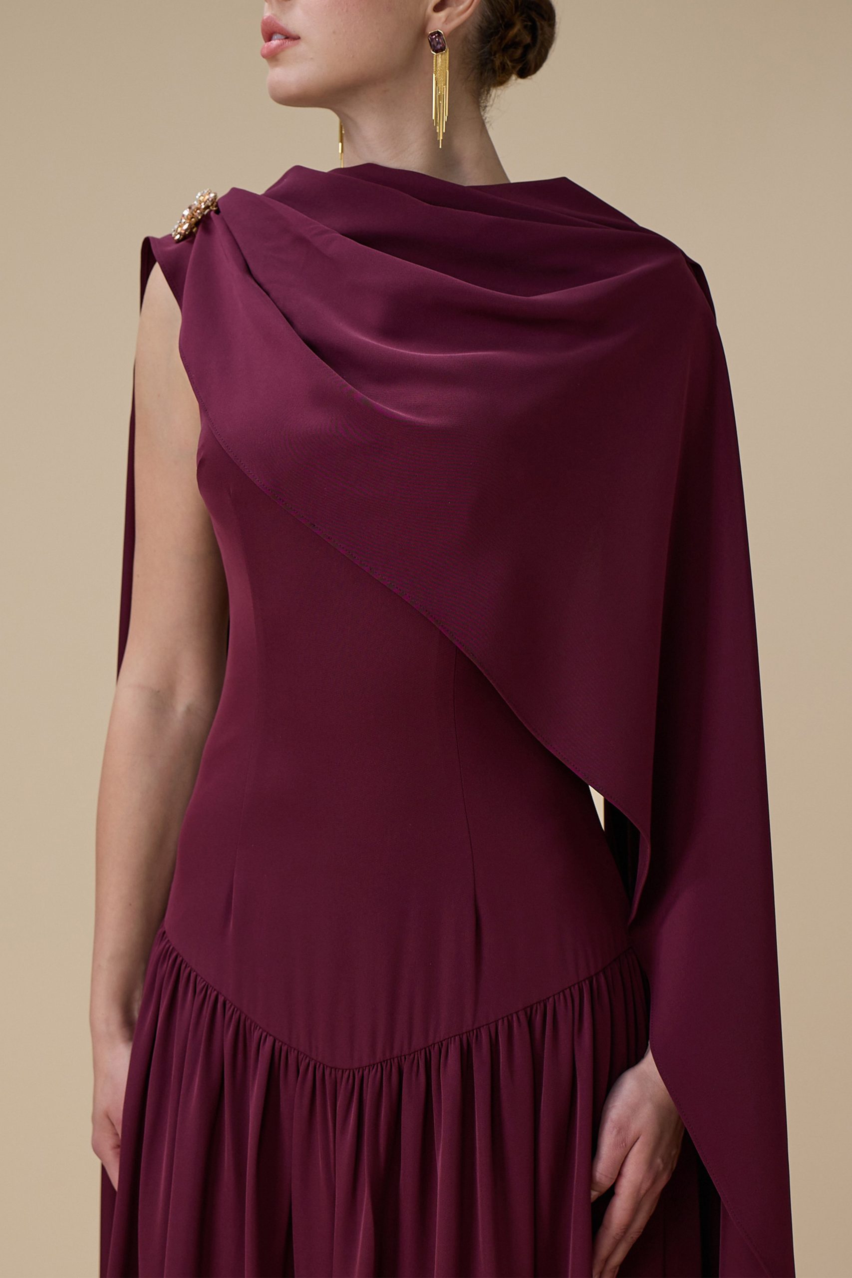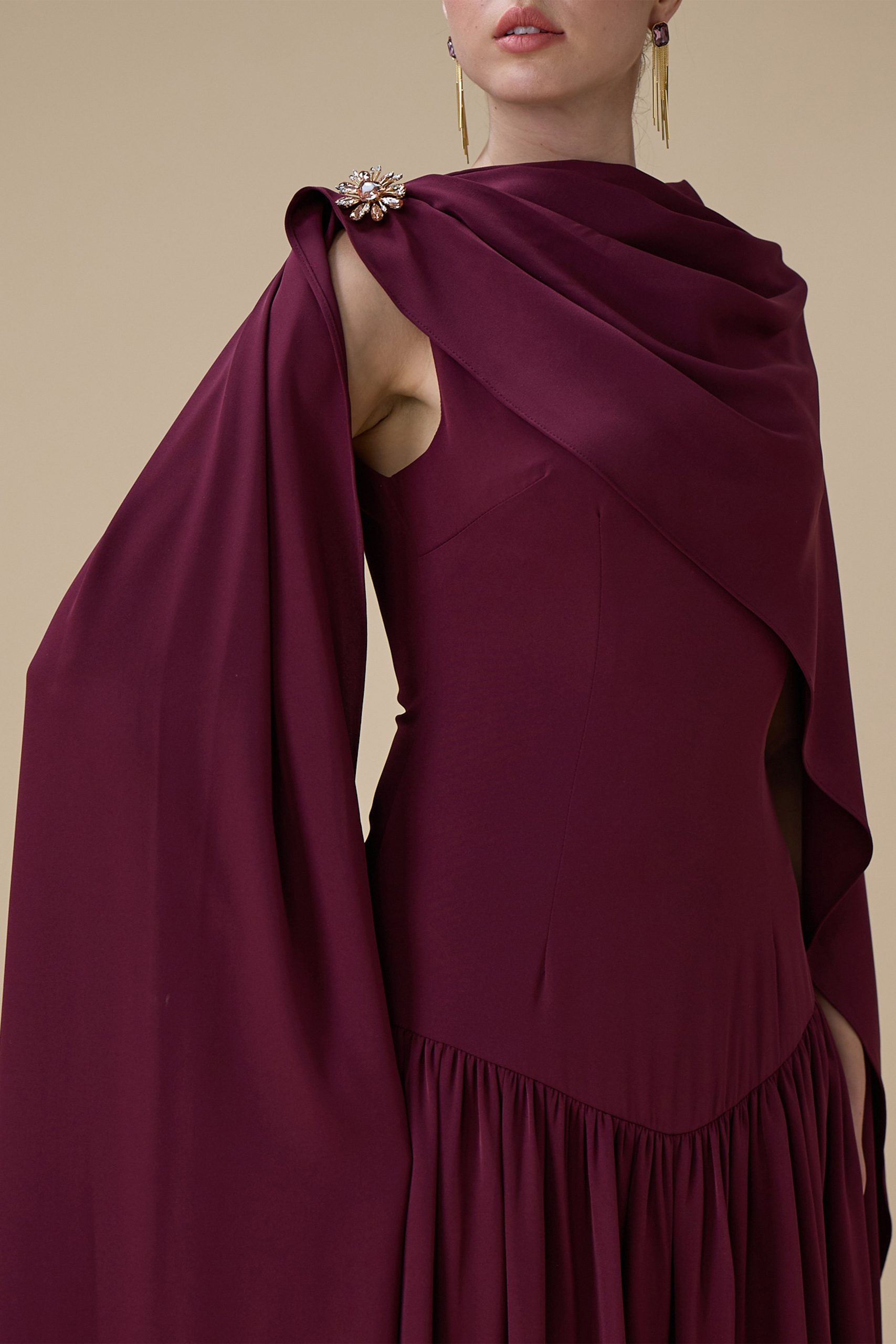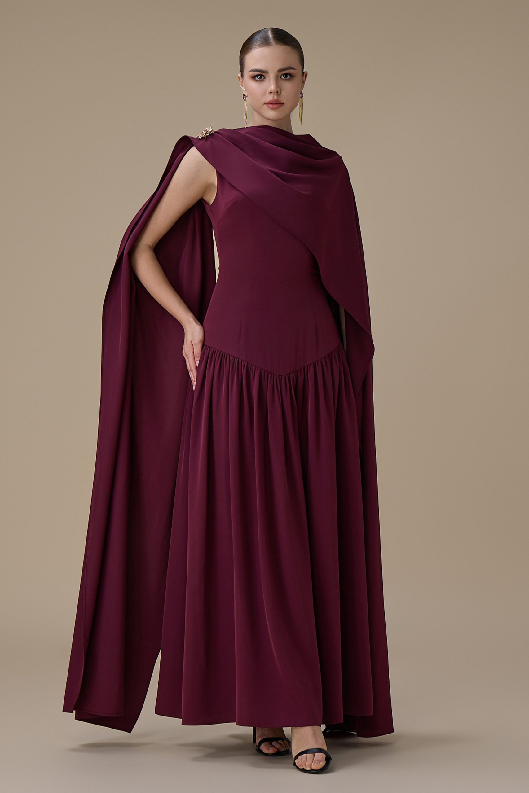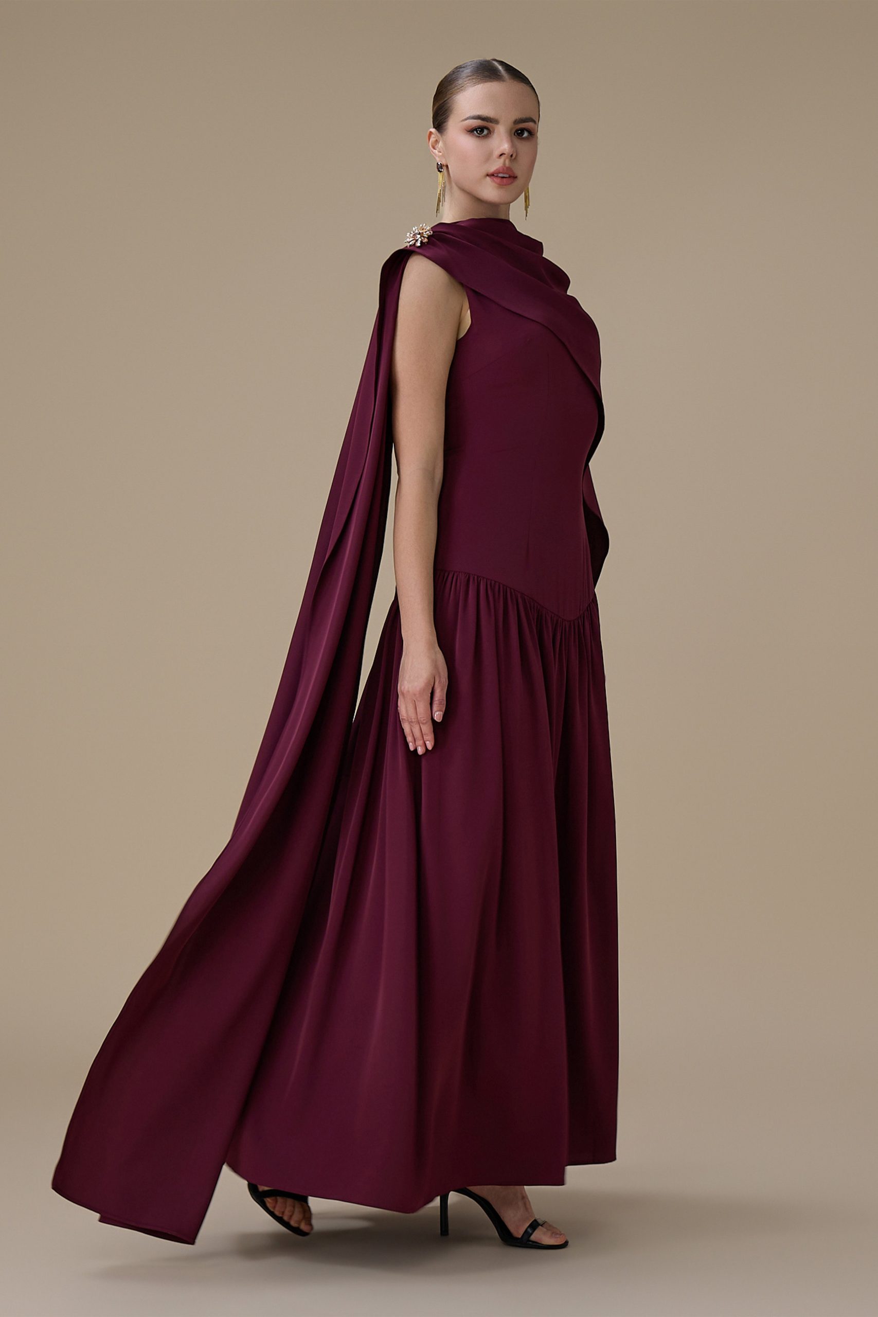 اكتان – فستان برغندي طويل مع كاب جانبي