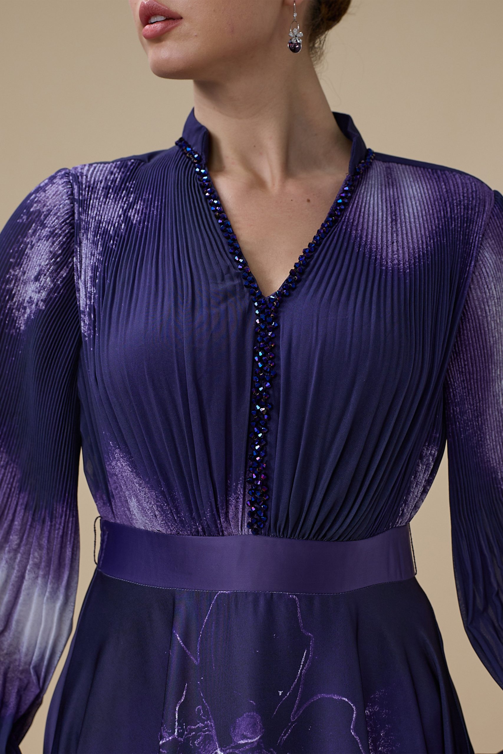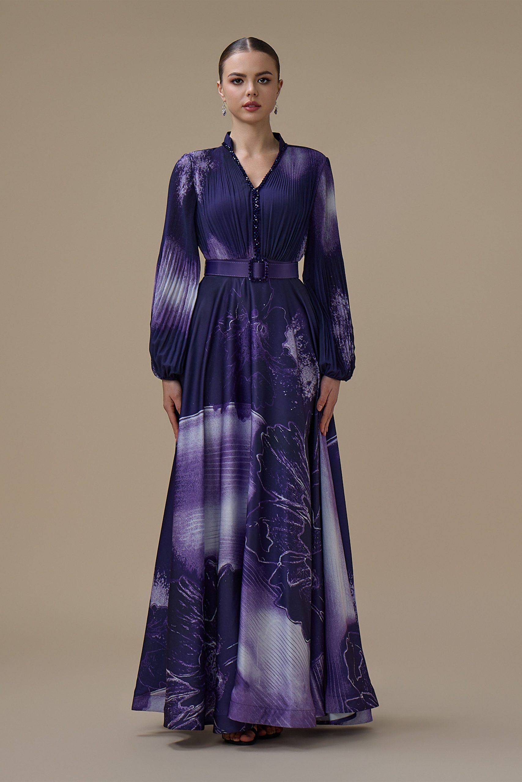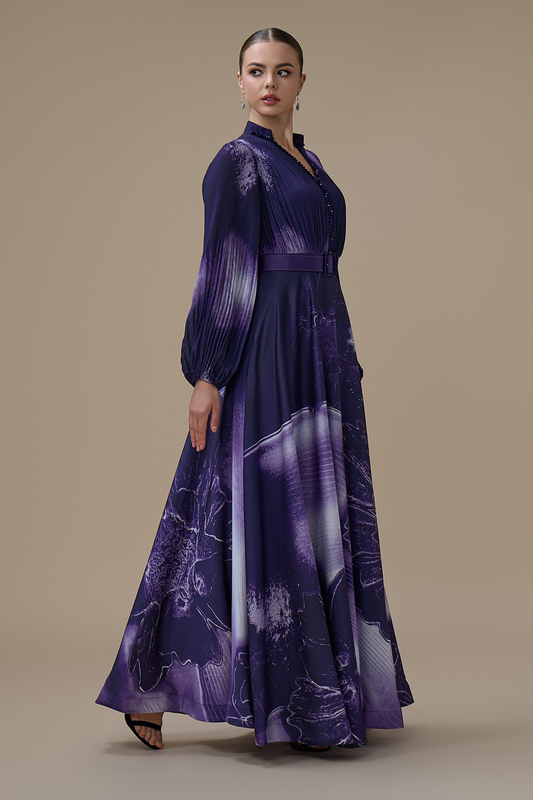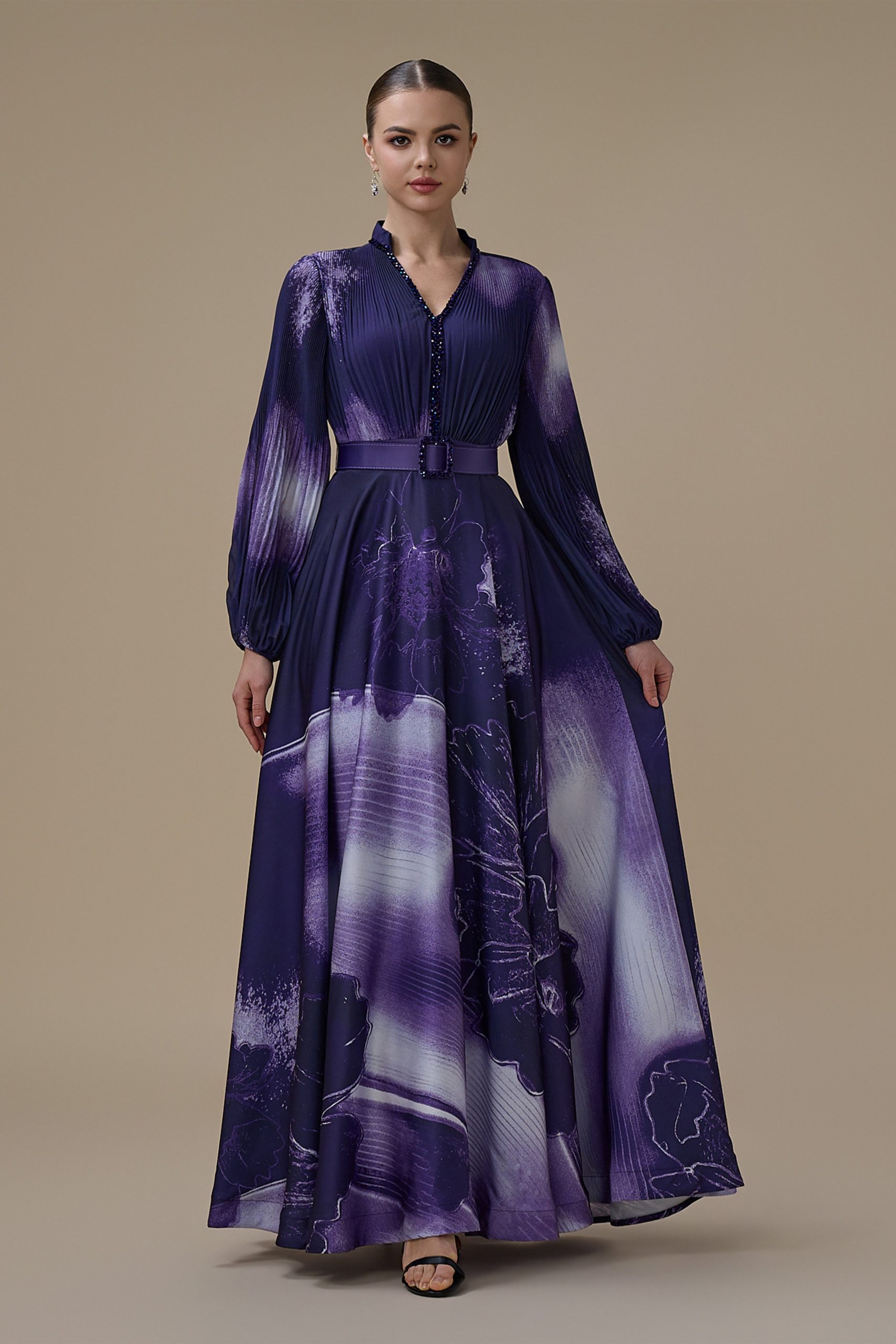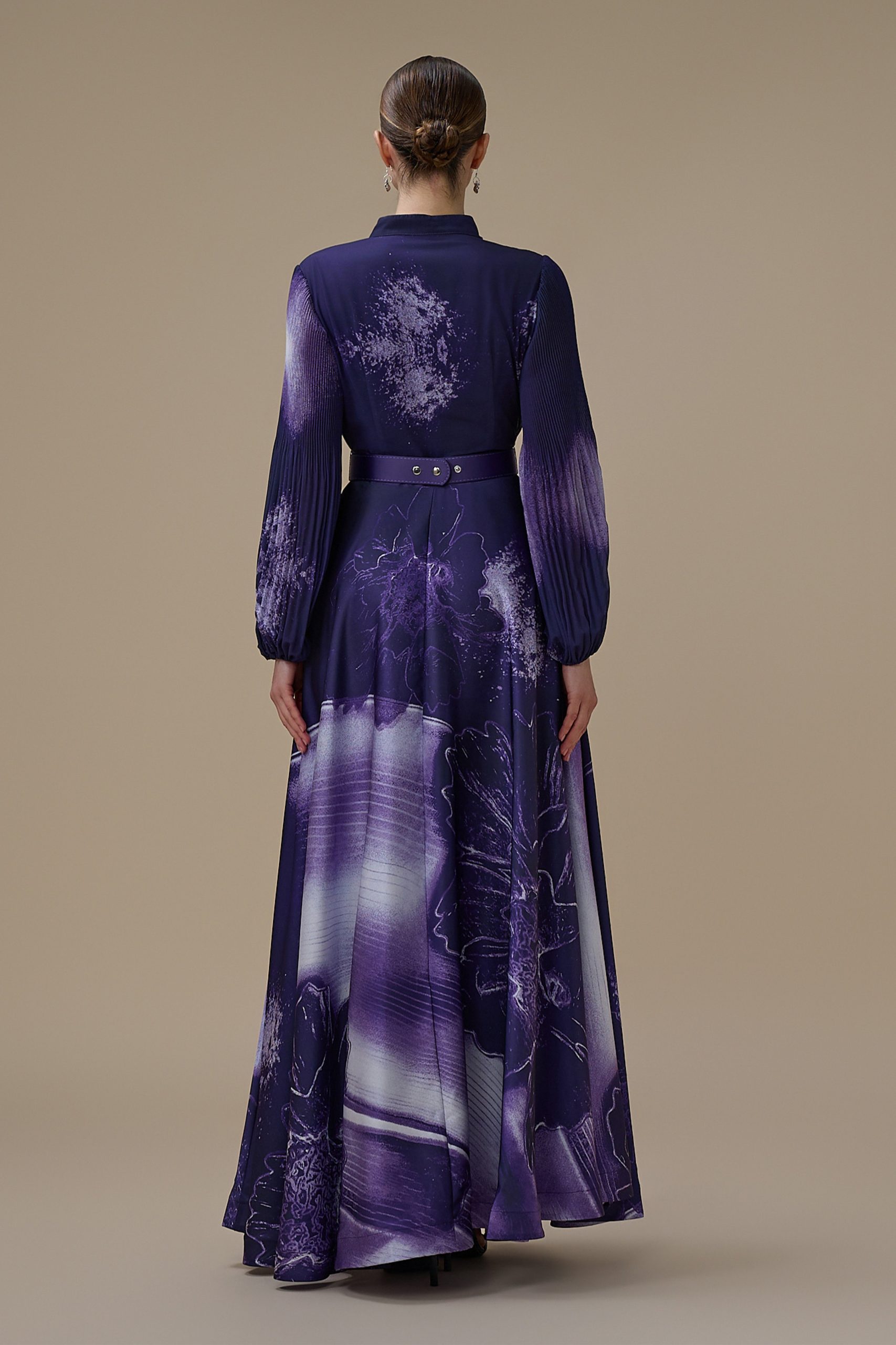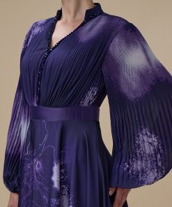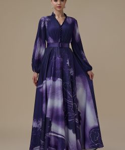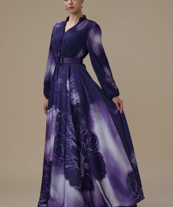 اكتان – فستان بنفسجي طويل بأكمام طويلة مع حزام محدد للخصر