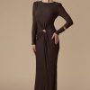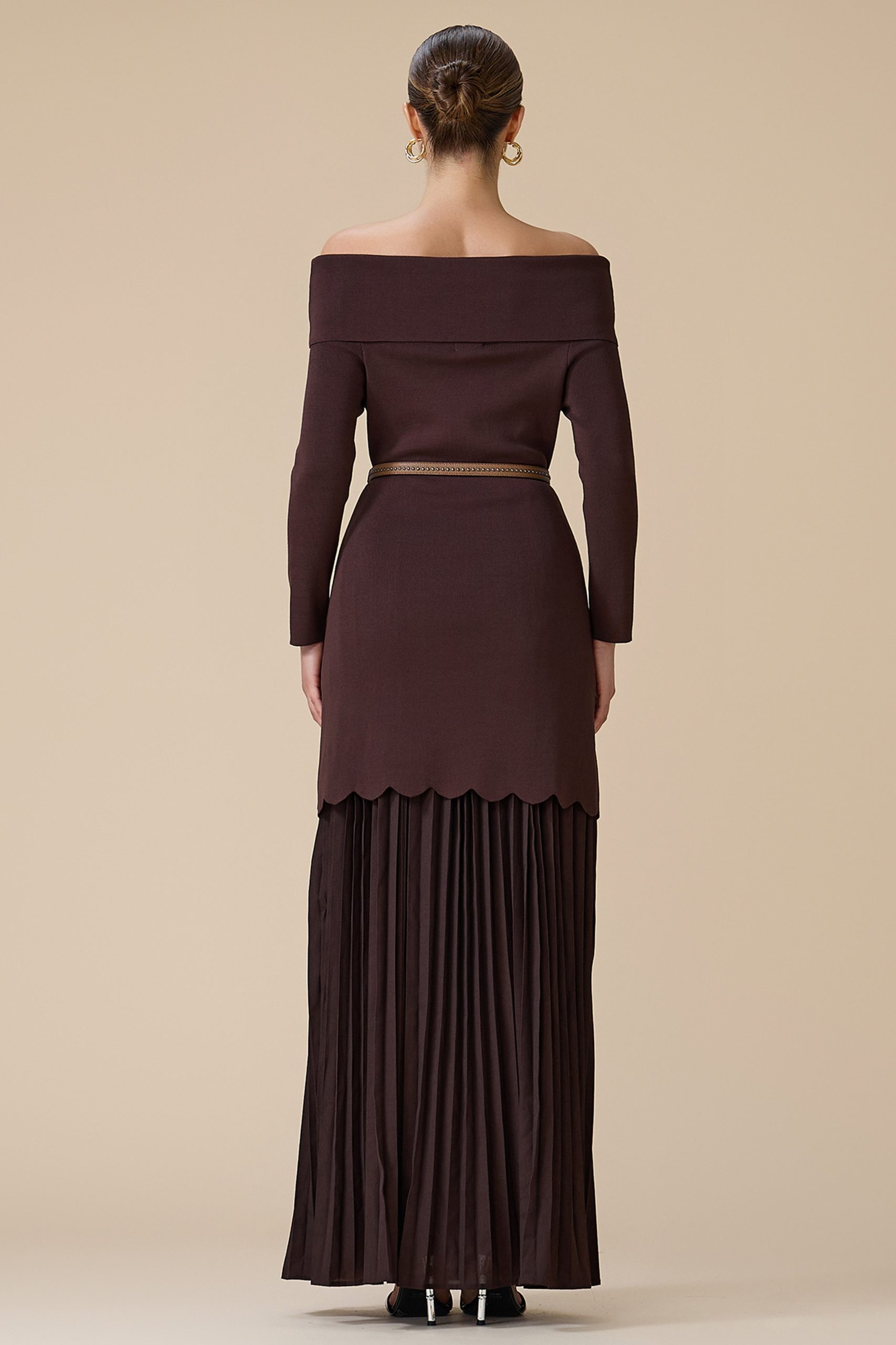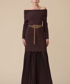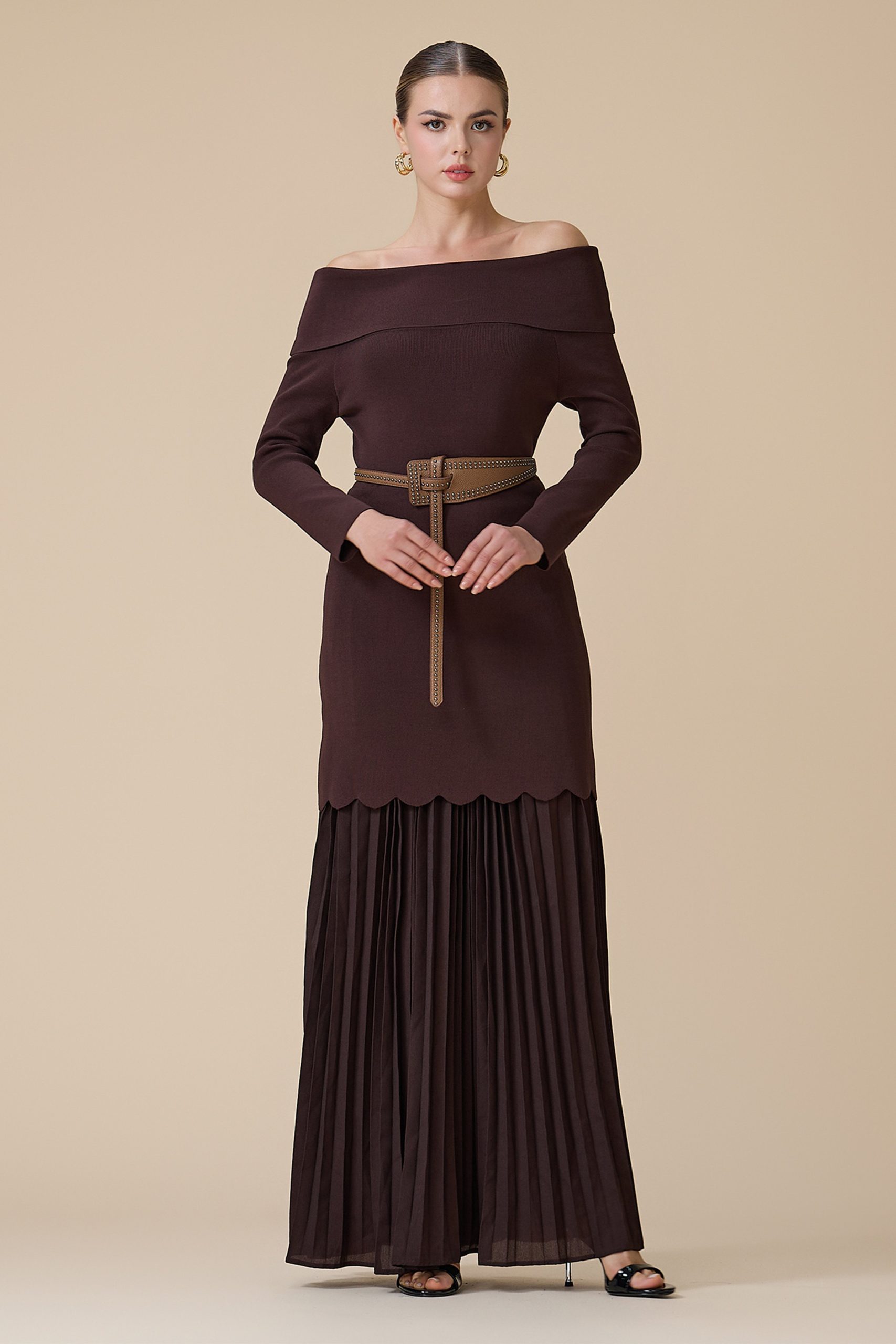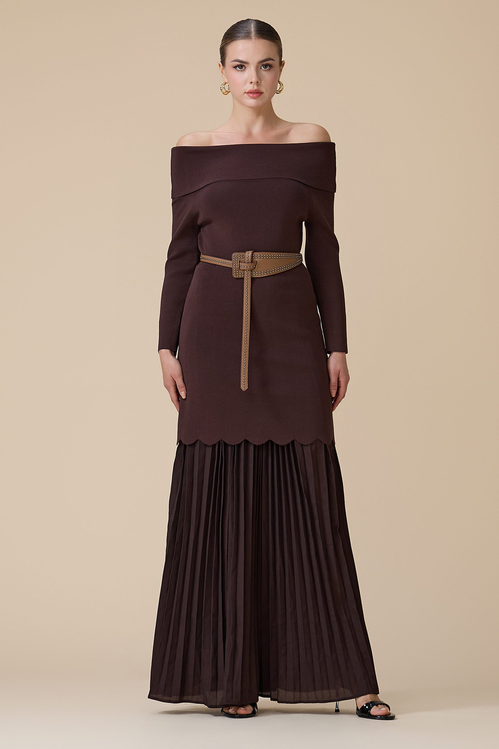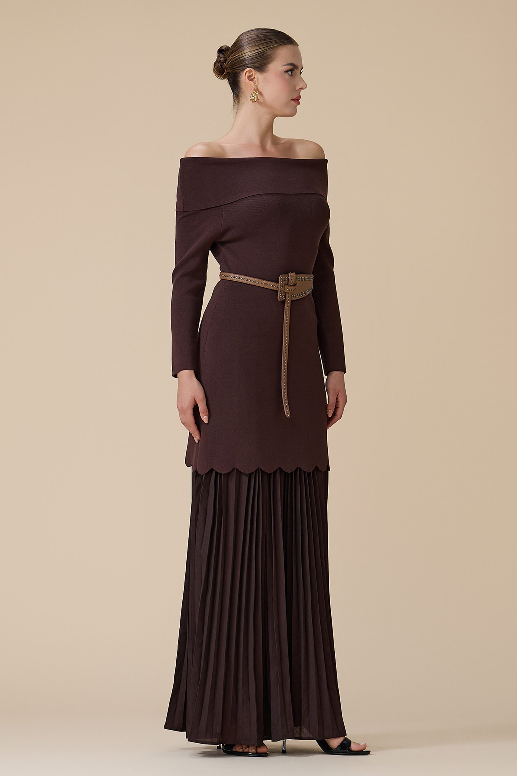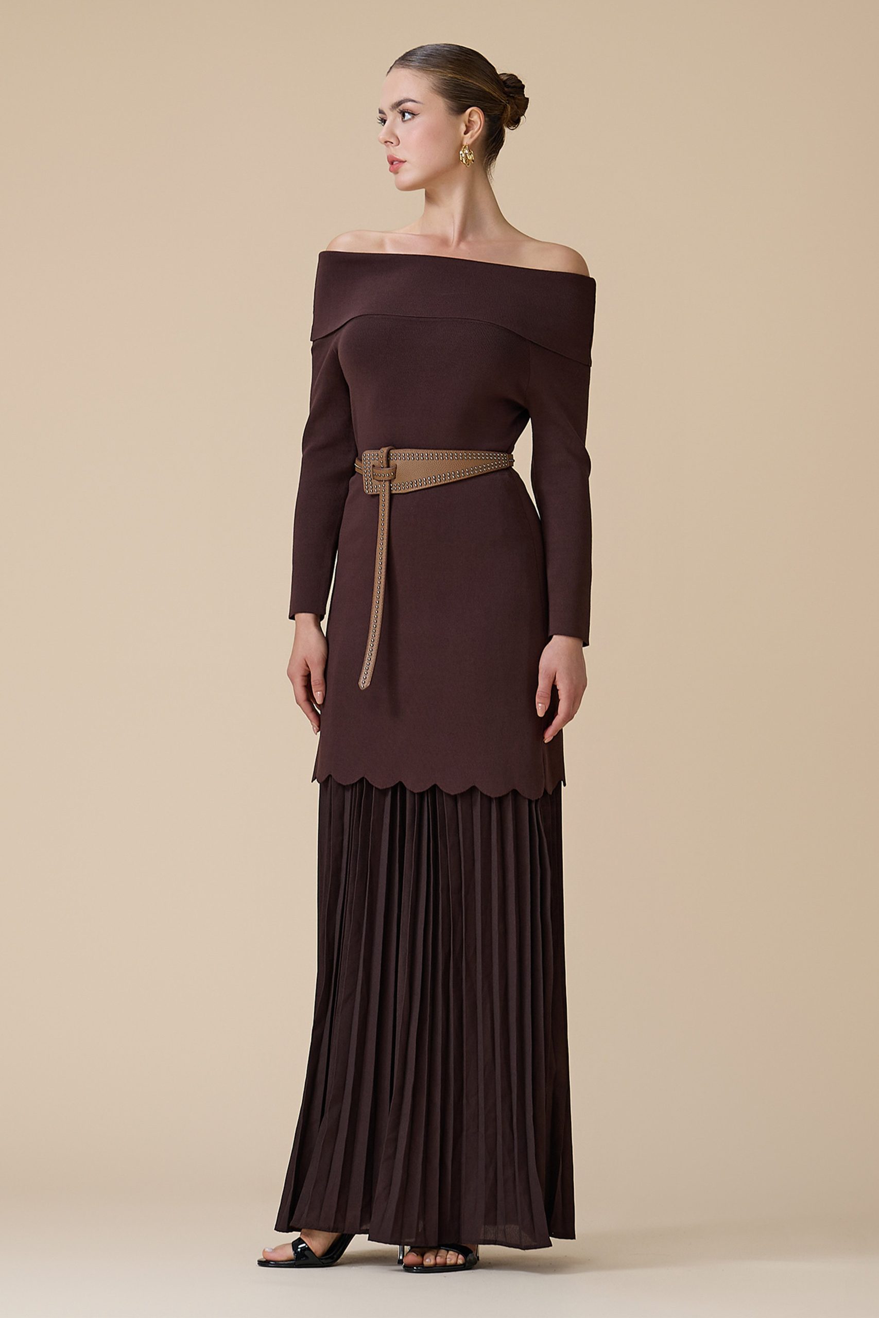 اكتان – فستان بني طويل أوف شولدر بحزام