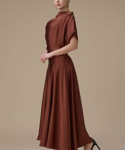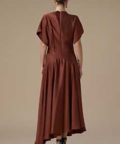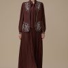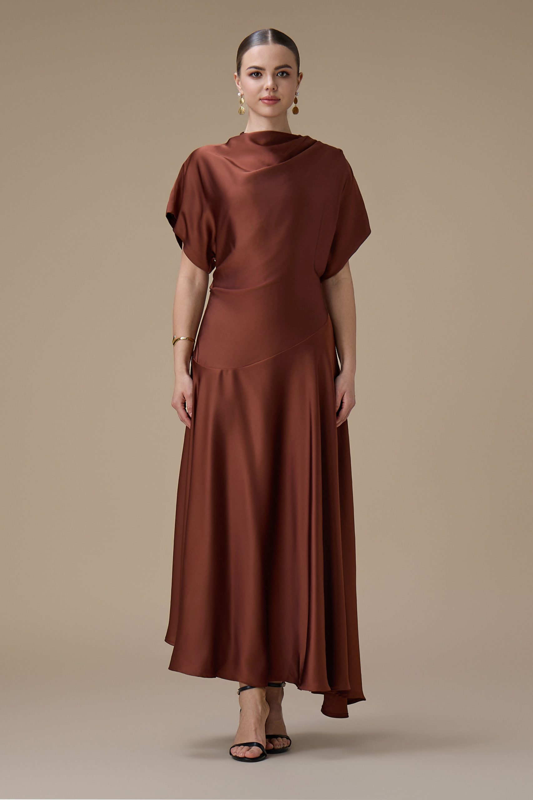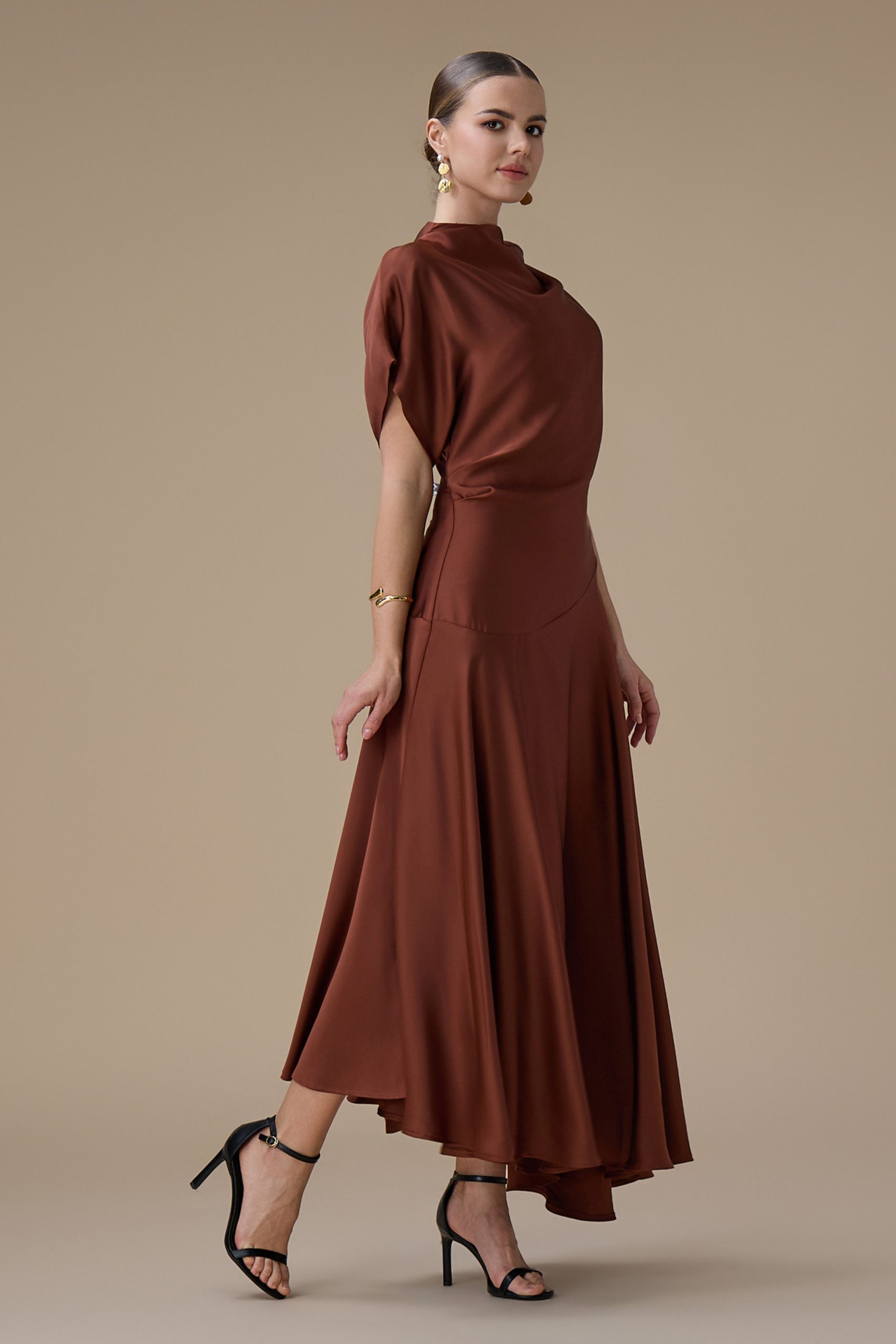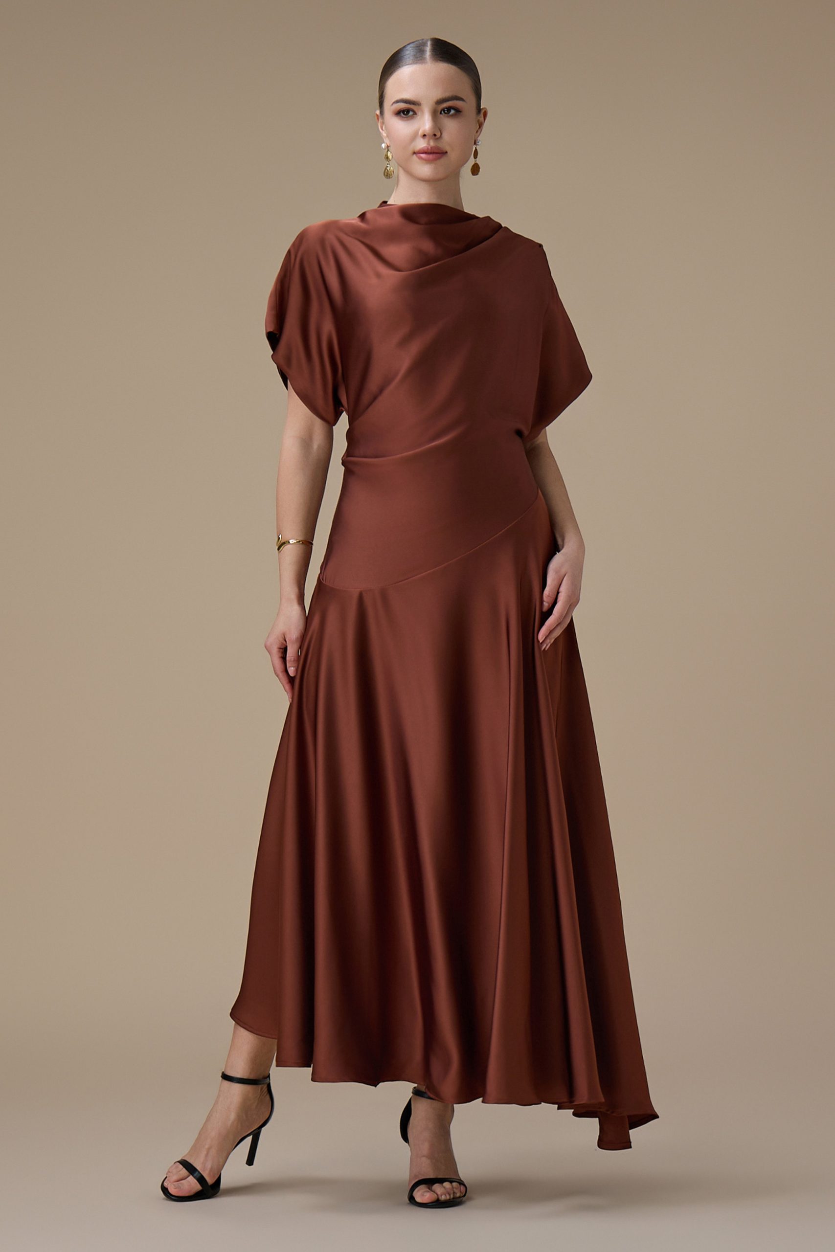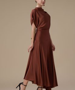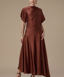 اكتان – فستان بني ميدي بقصة انسيابية وأكمام واسعة