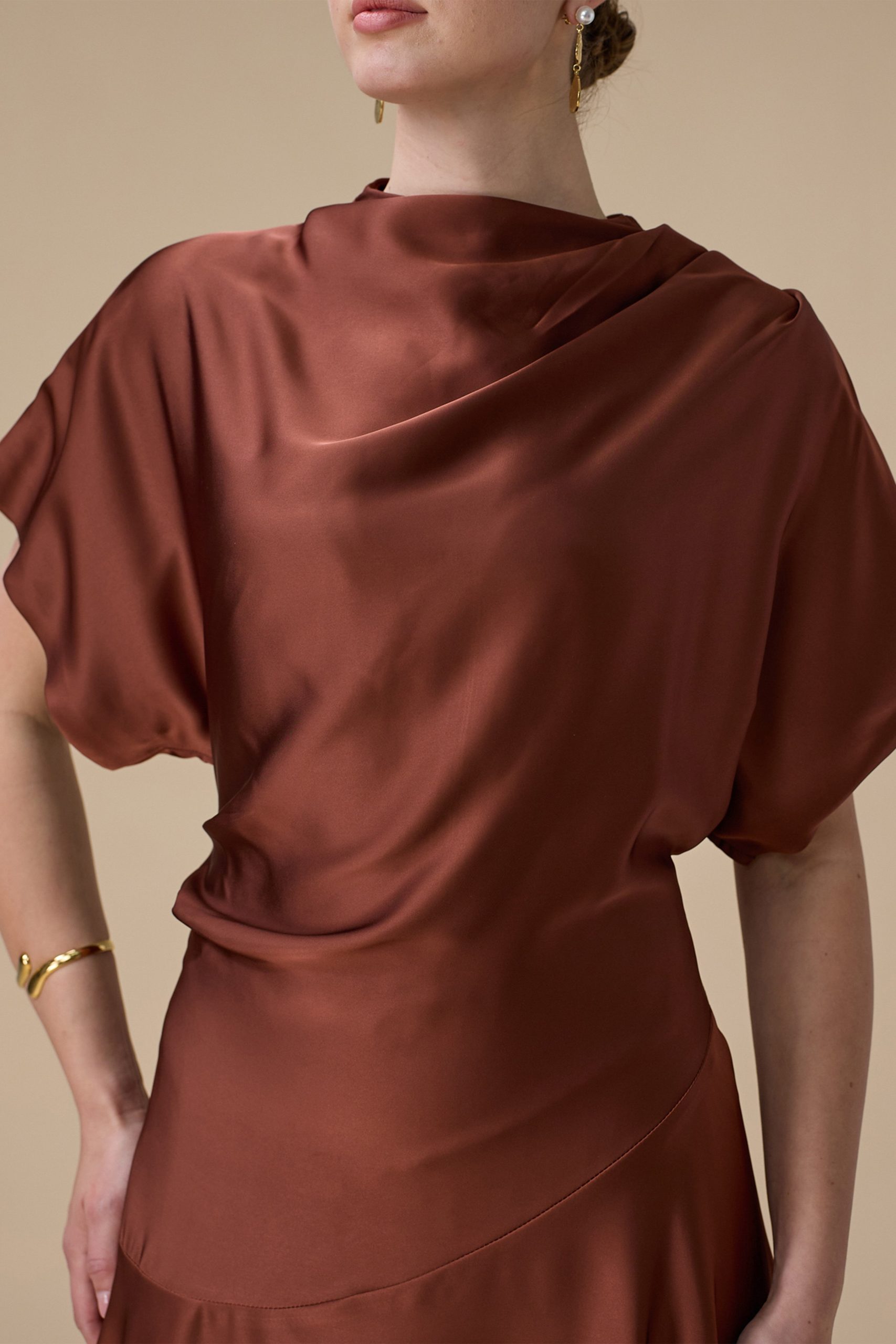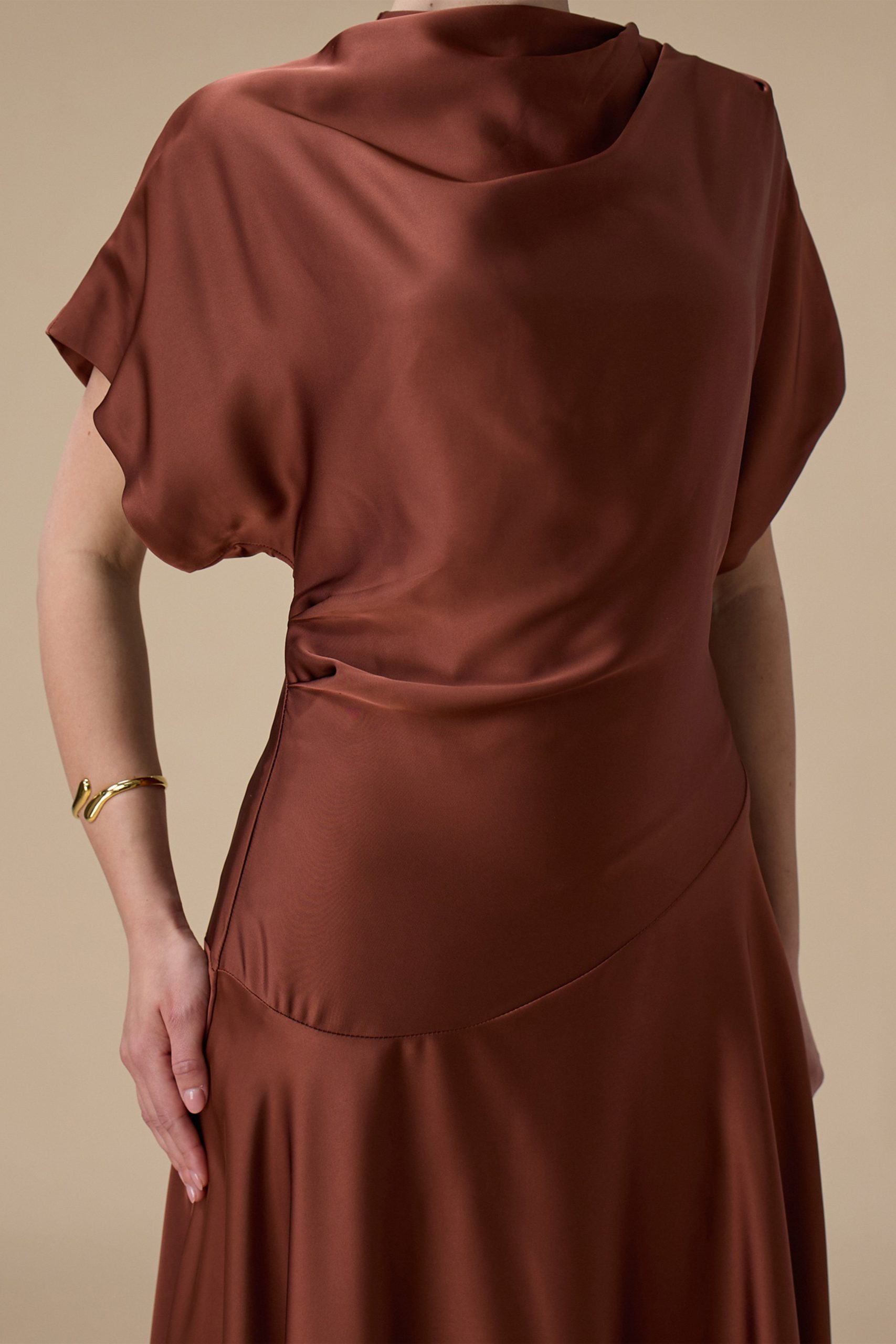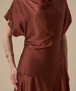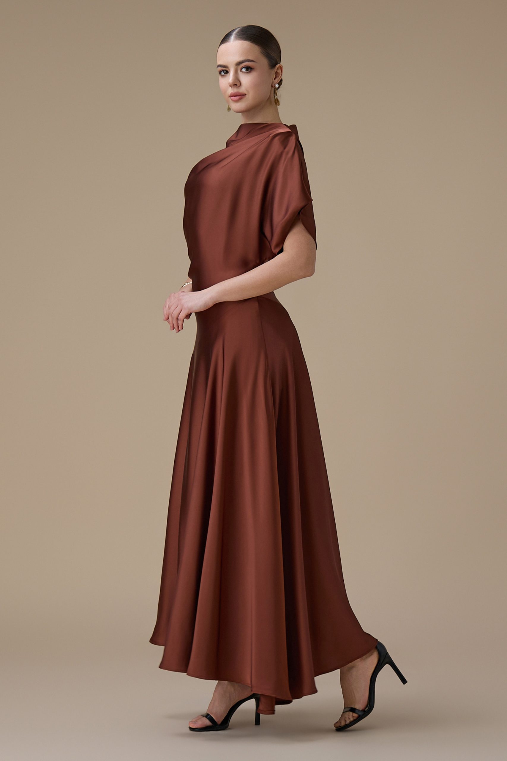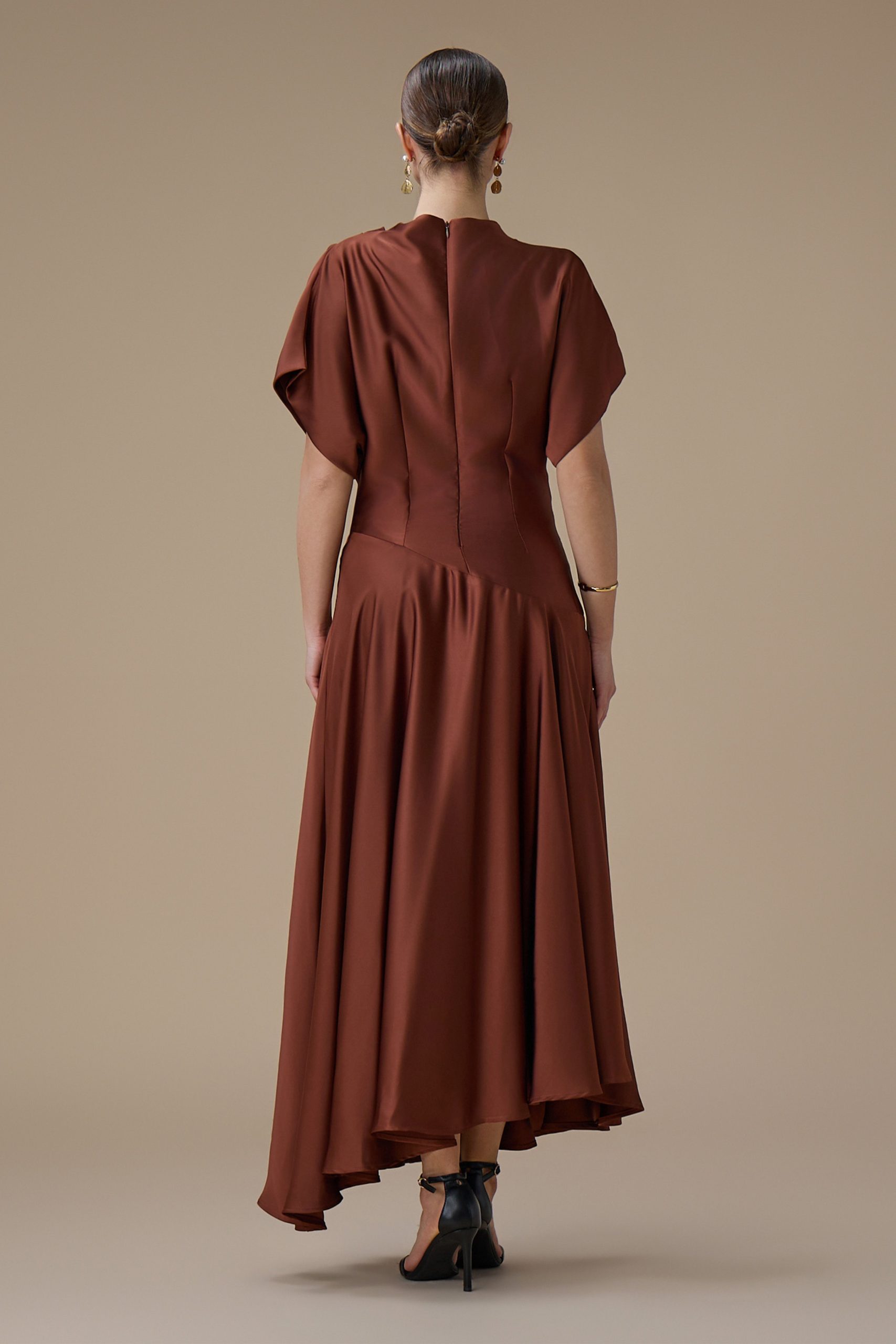 اكتان – فستان بني ميدي بقصة انسيابية وأكمام واسعة