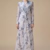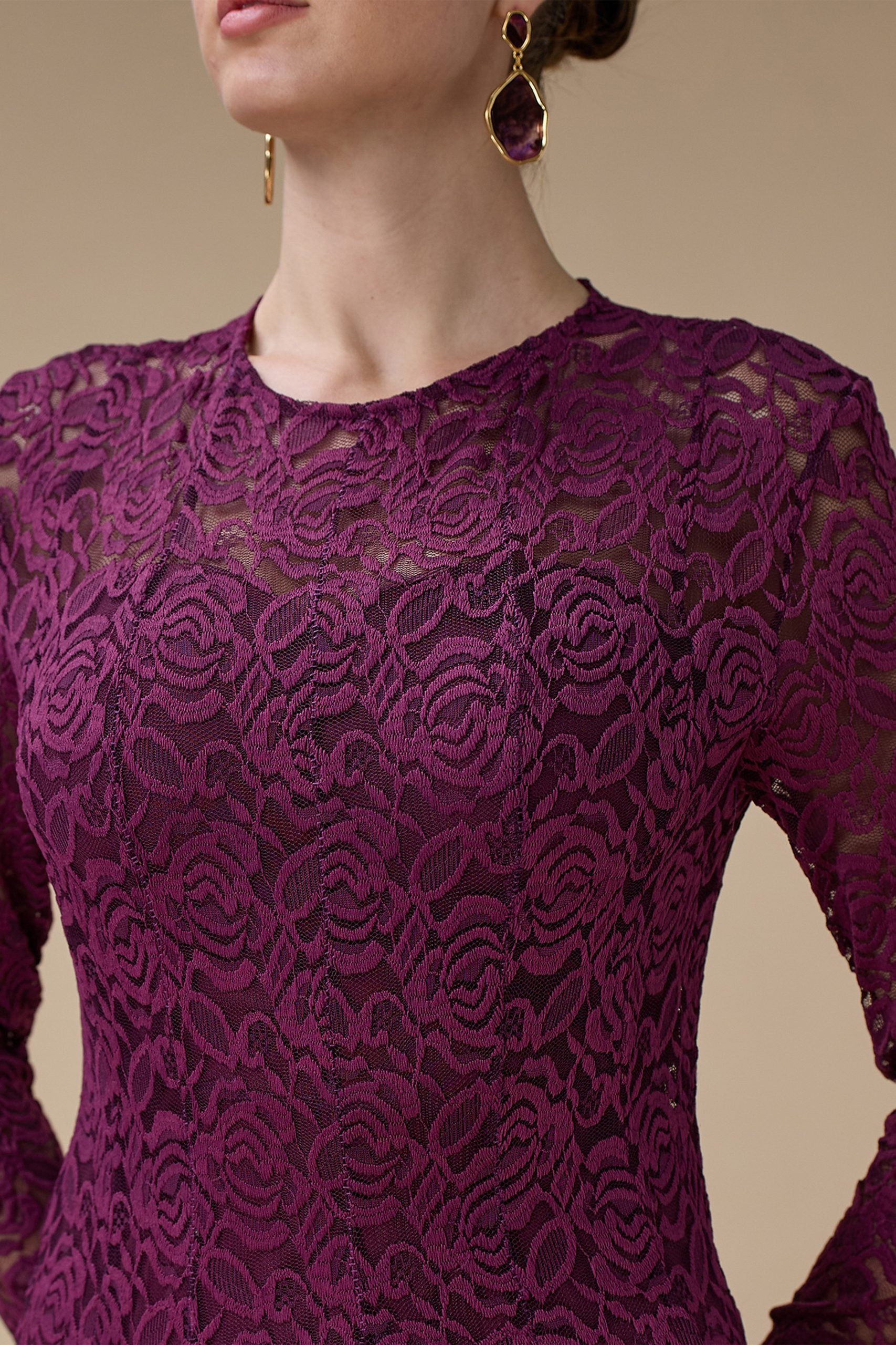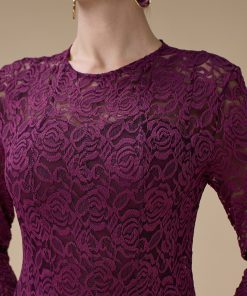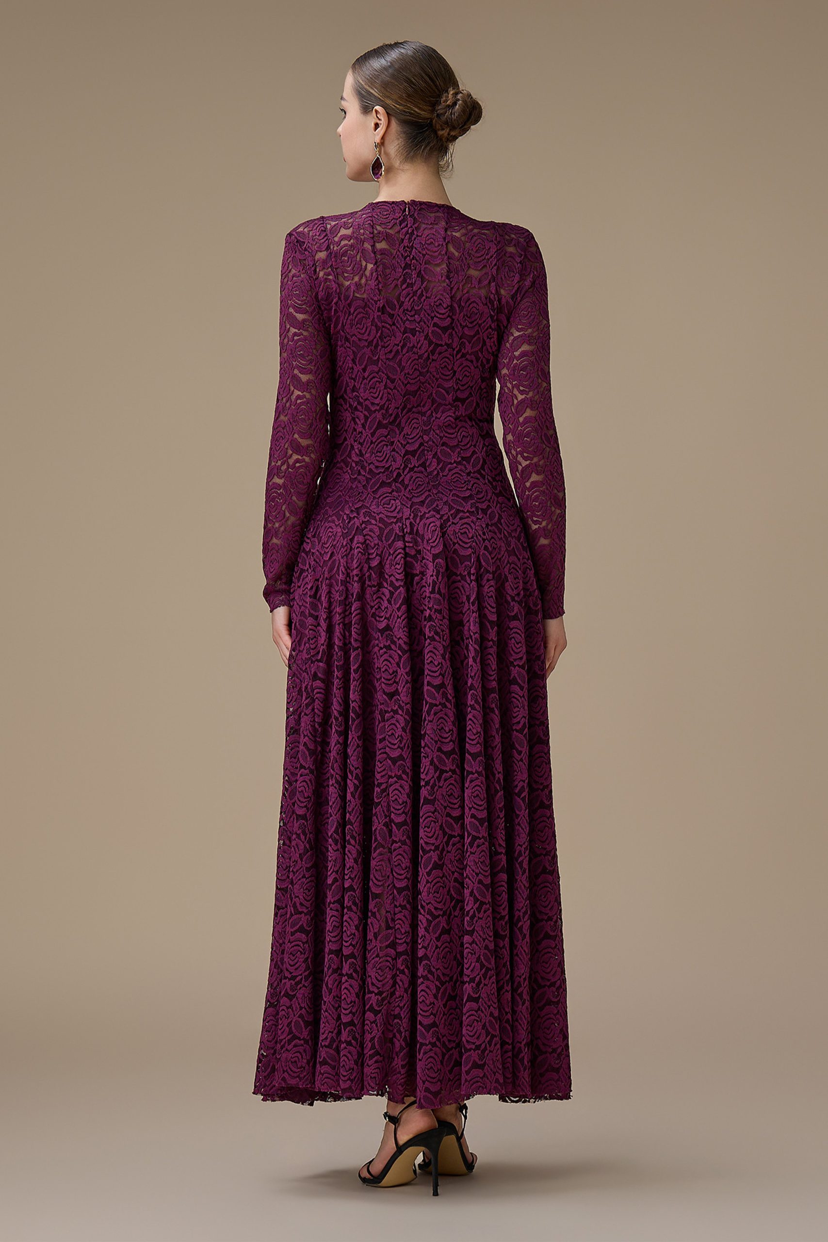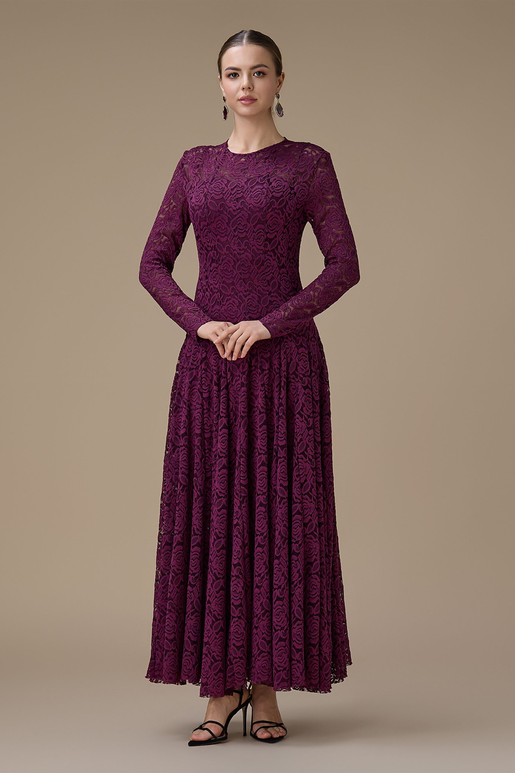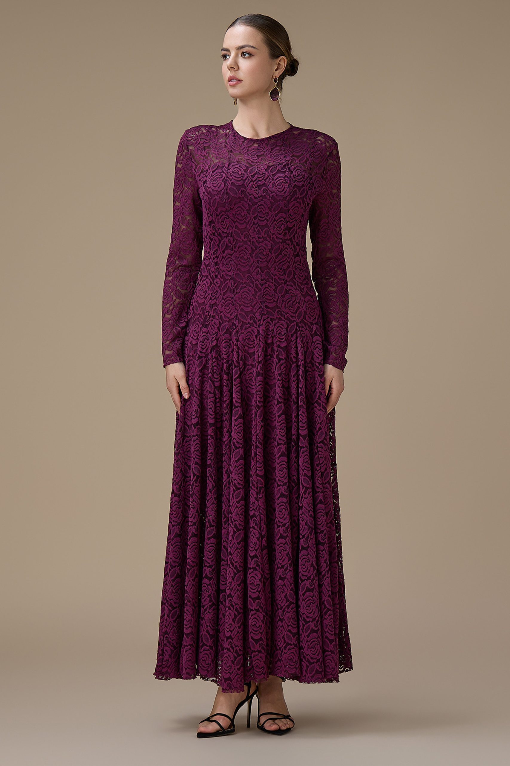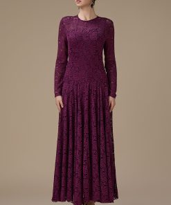 اكتان – فستان دانتيل عنابي طويل بأكمام كاملة
