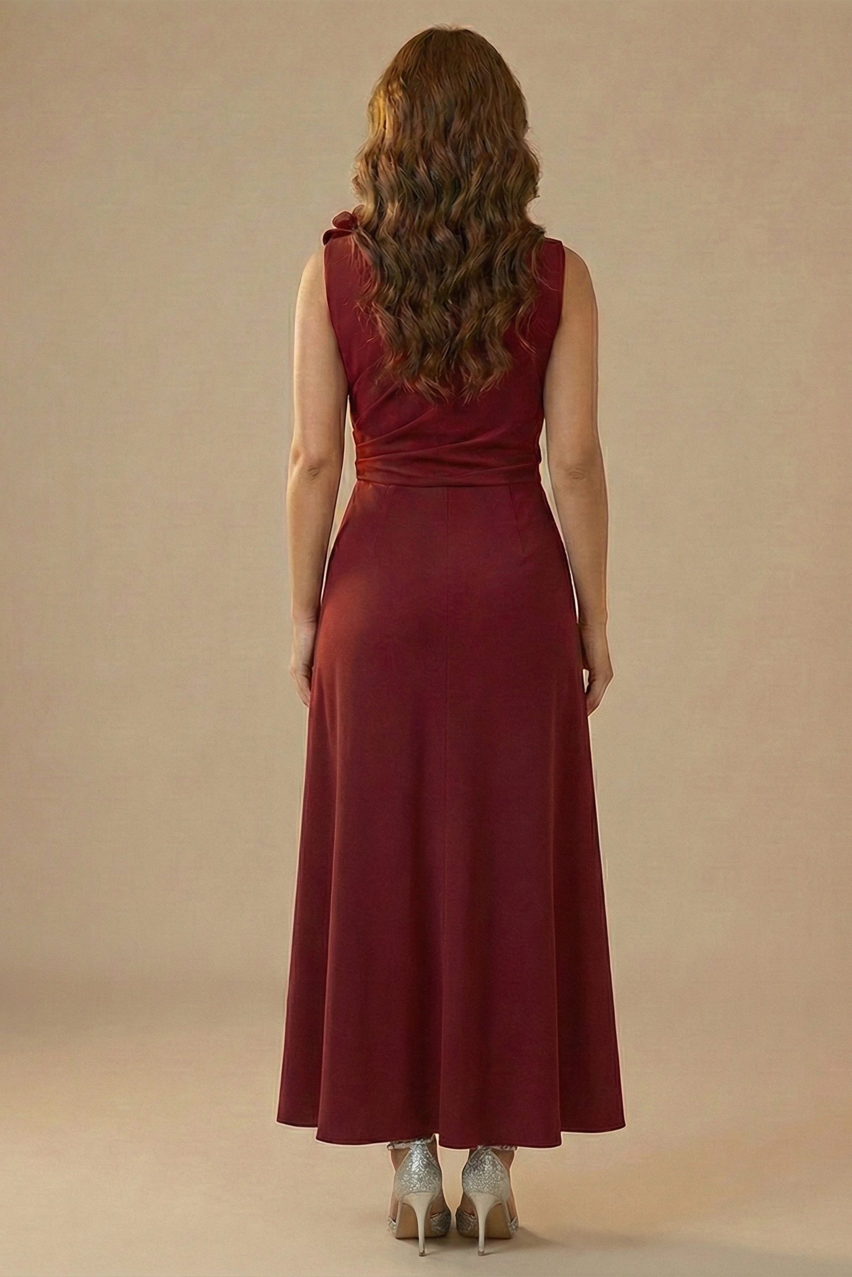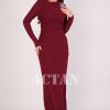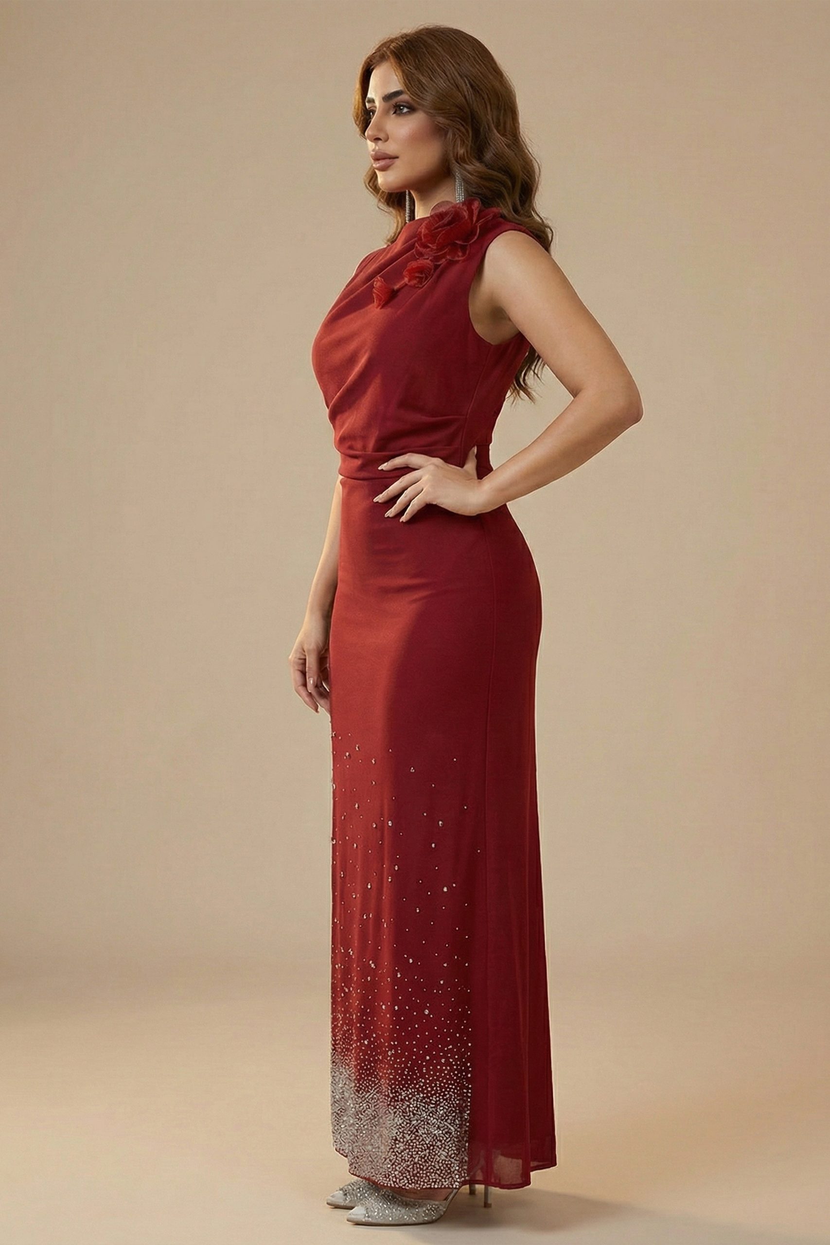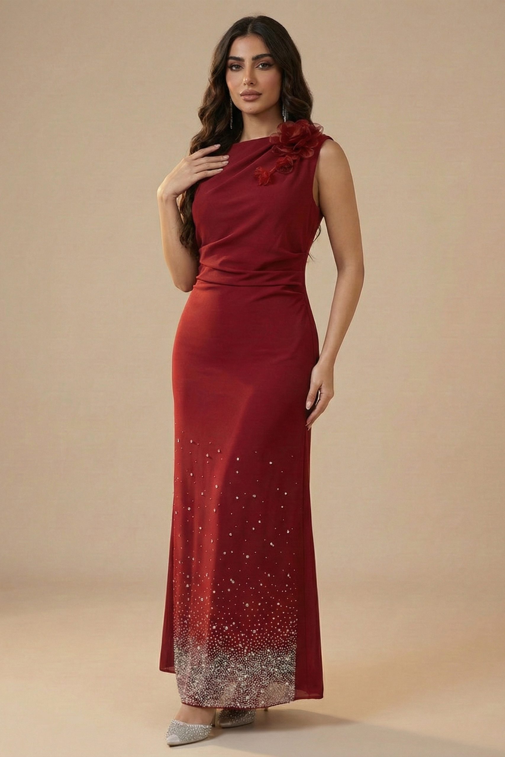 اكتان – فستان درابيه مزين ببرروش ورد لون أحمر