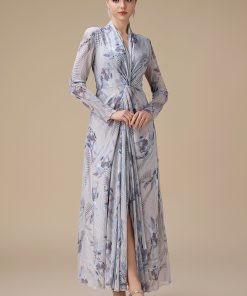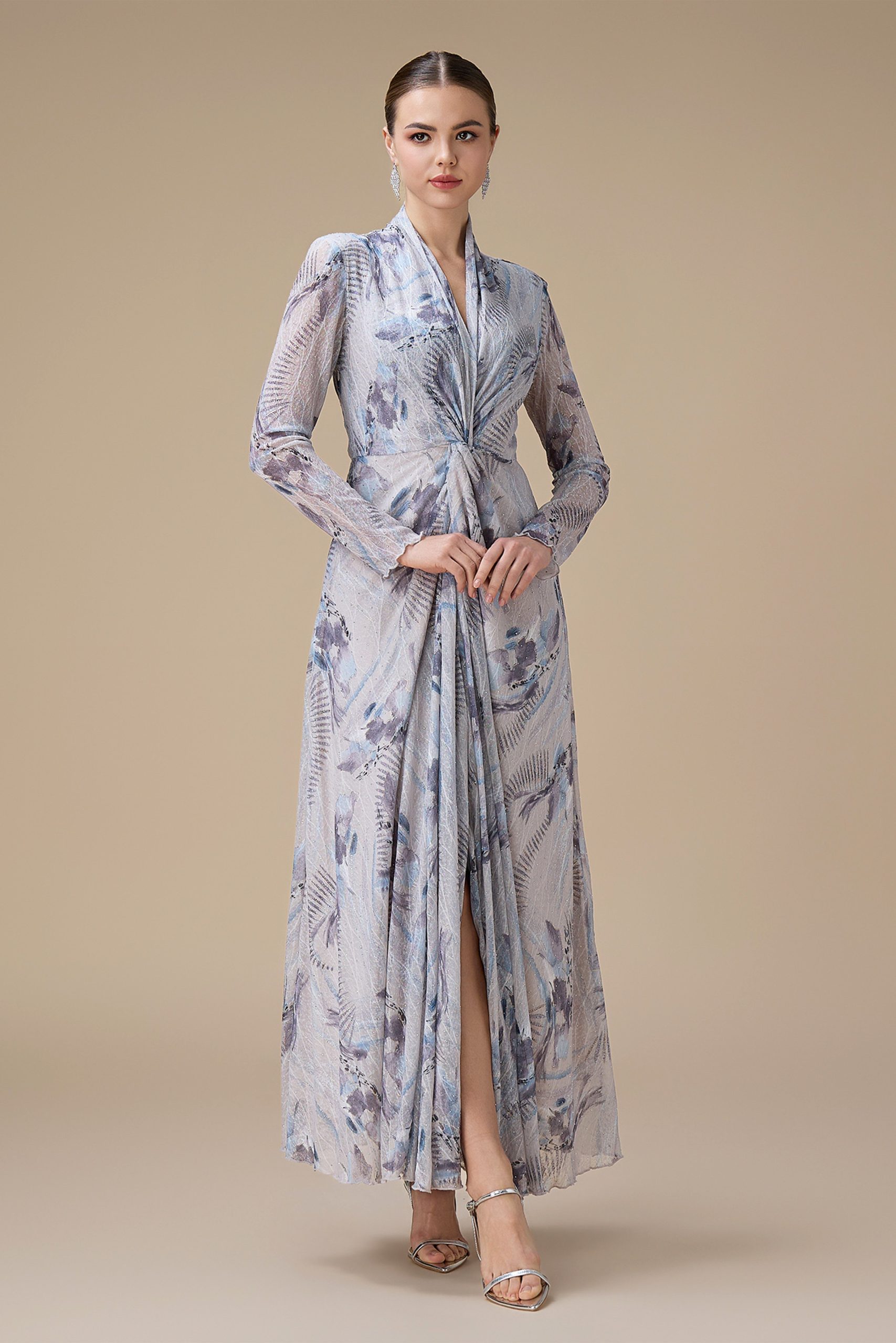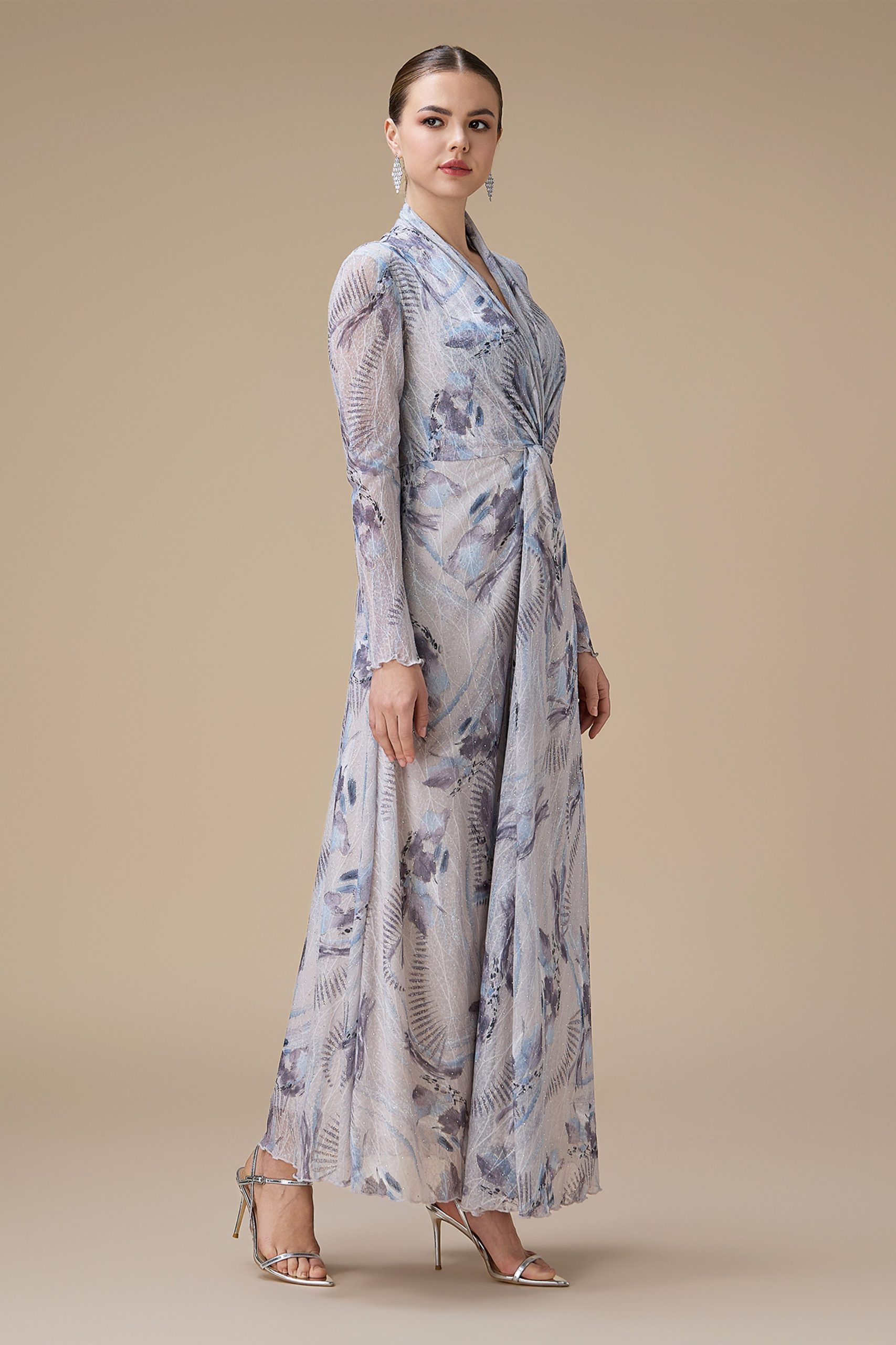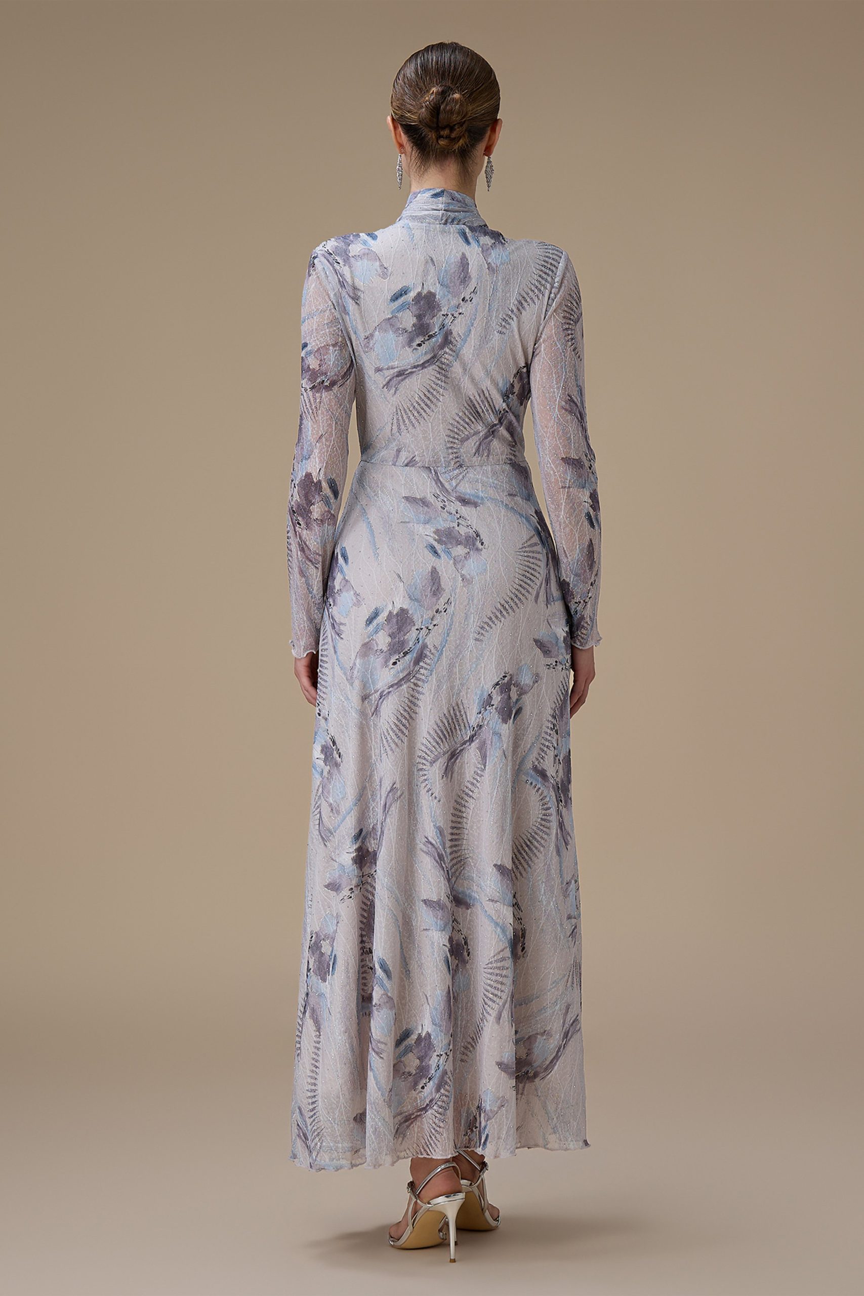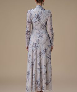 اكتان – فستان رصاصي طويل بأكمام طويلة بطبعة زهور