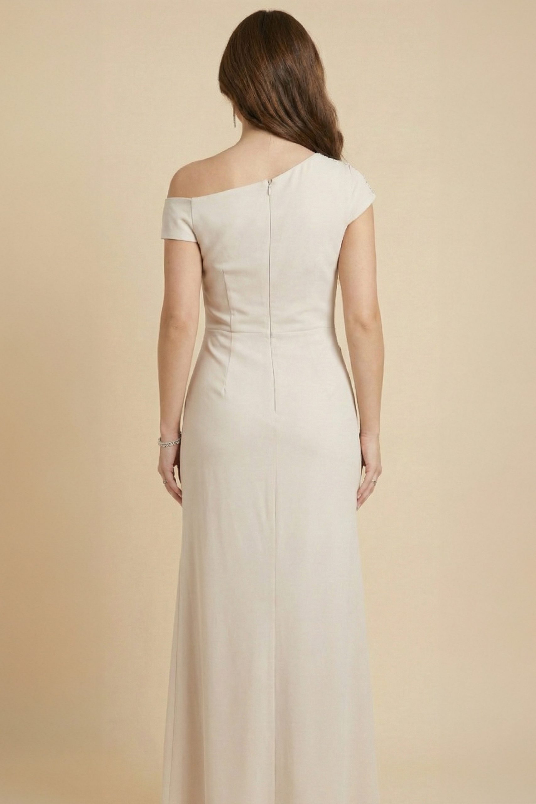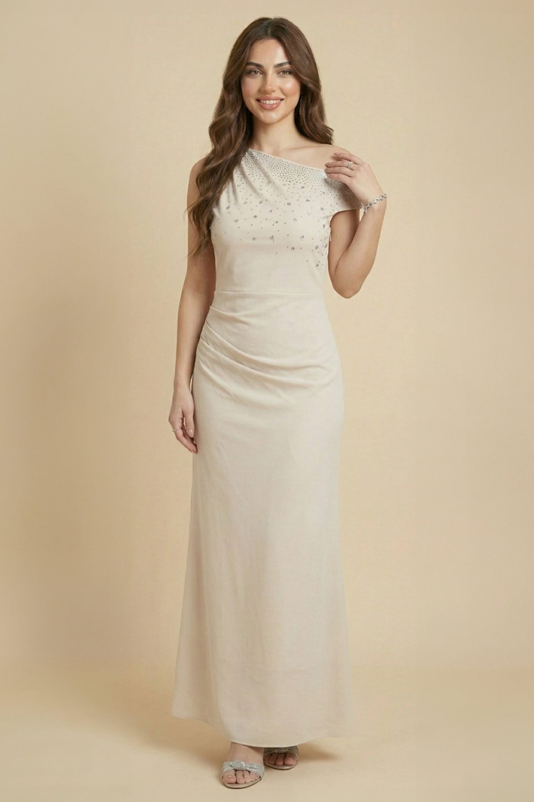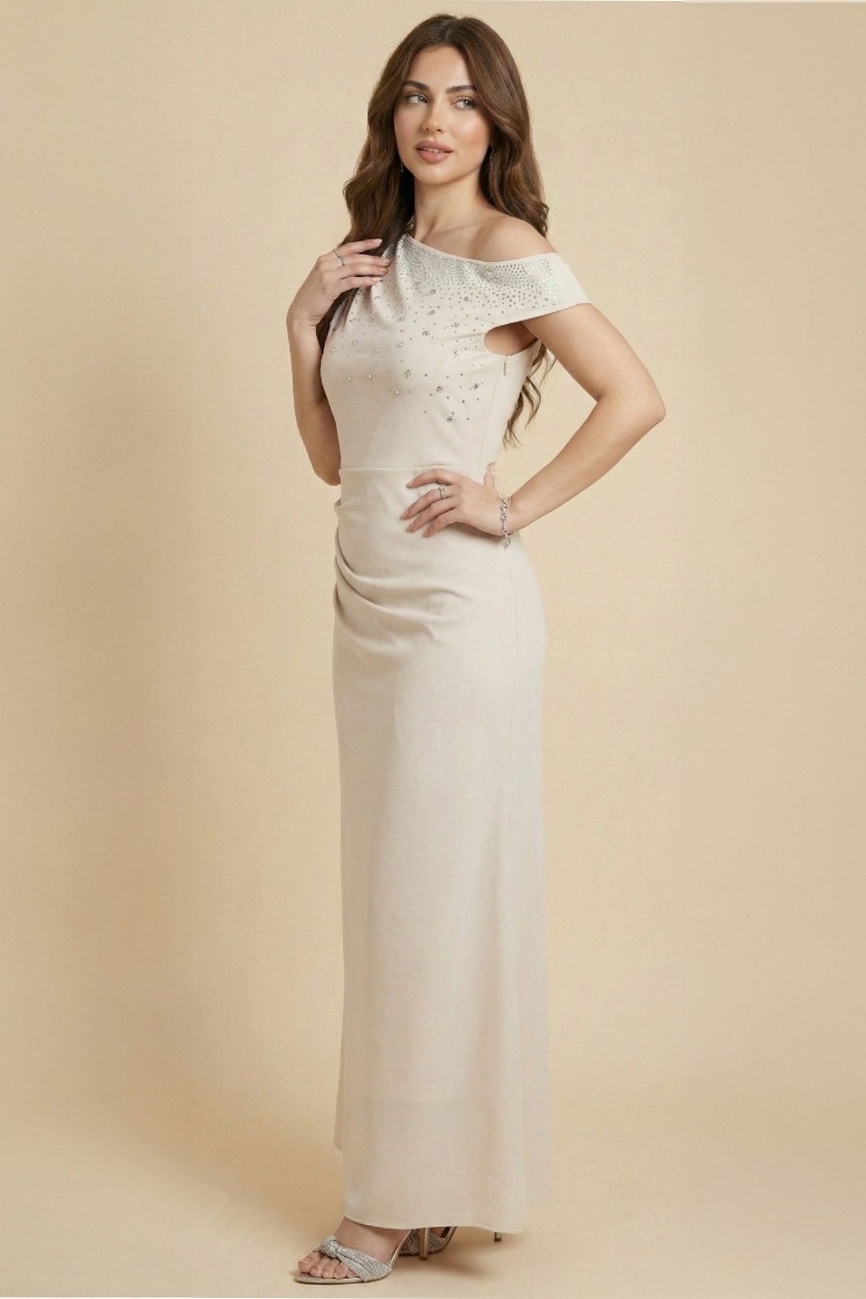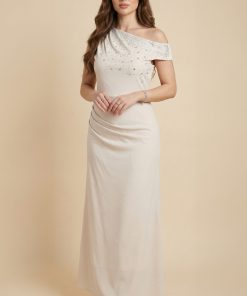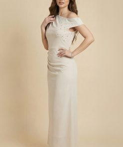 اكتان – فستان ضيق درابية مزين بفصوص لون بيج