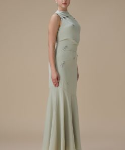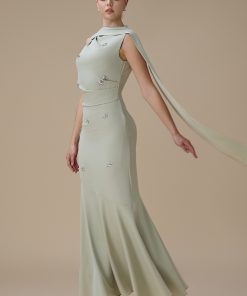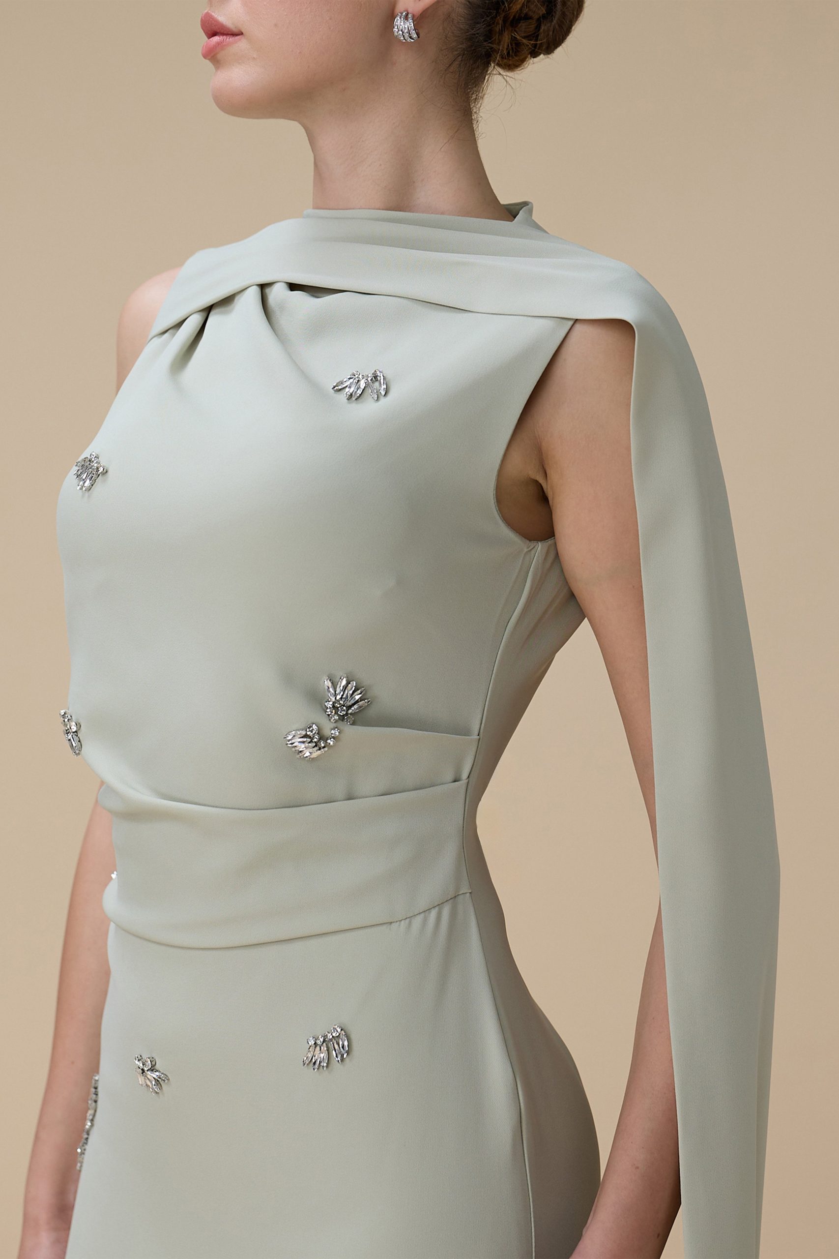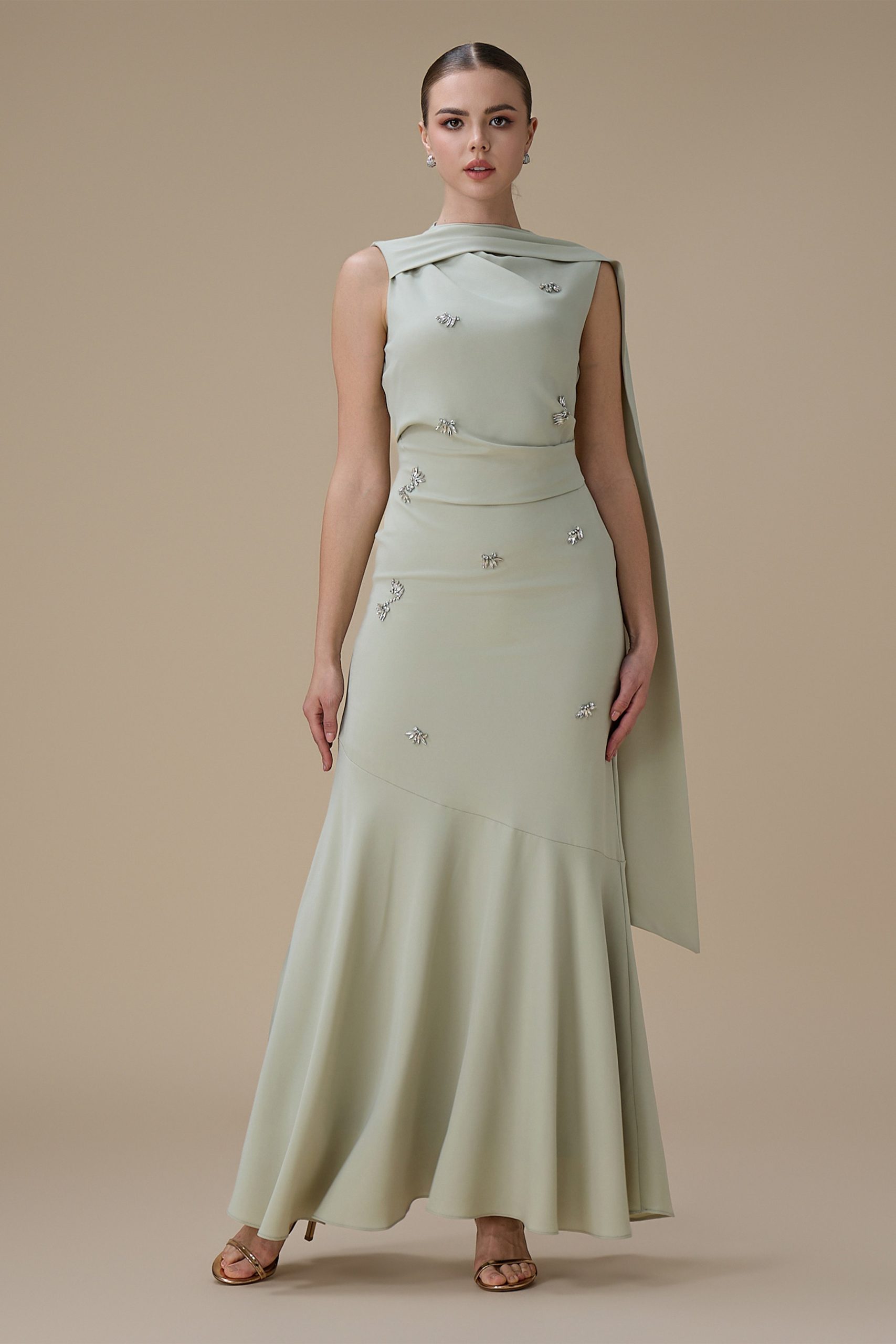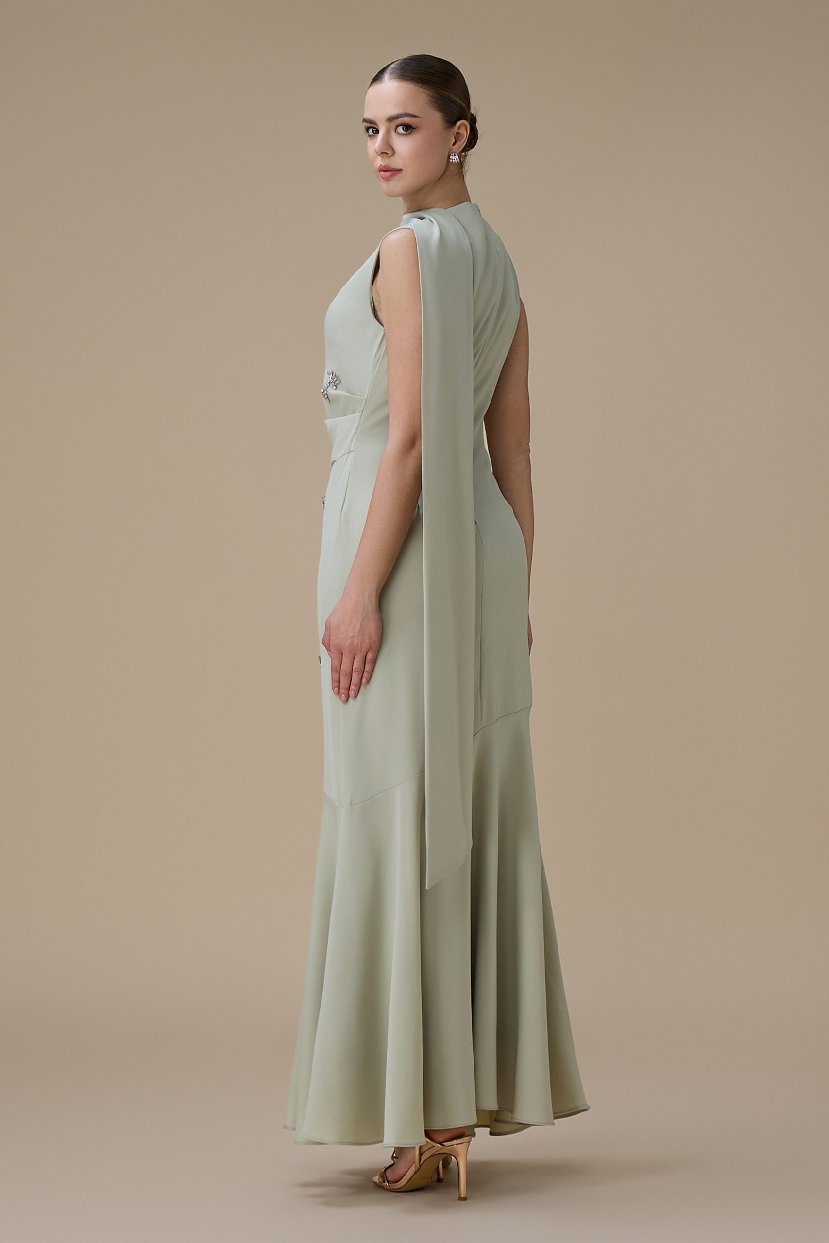اكتان – فستان طويل أخضر فاتح بتطريز ووشاح جانبي