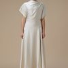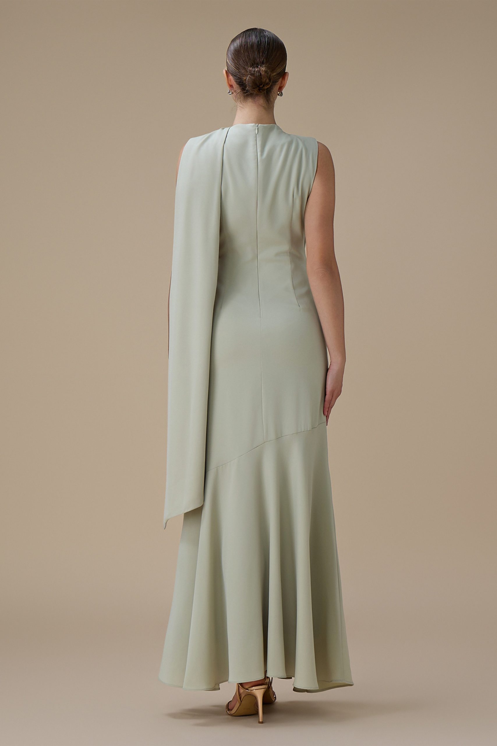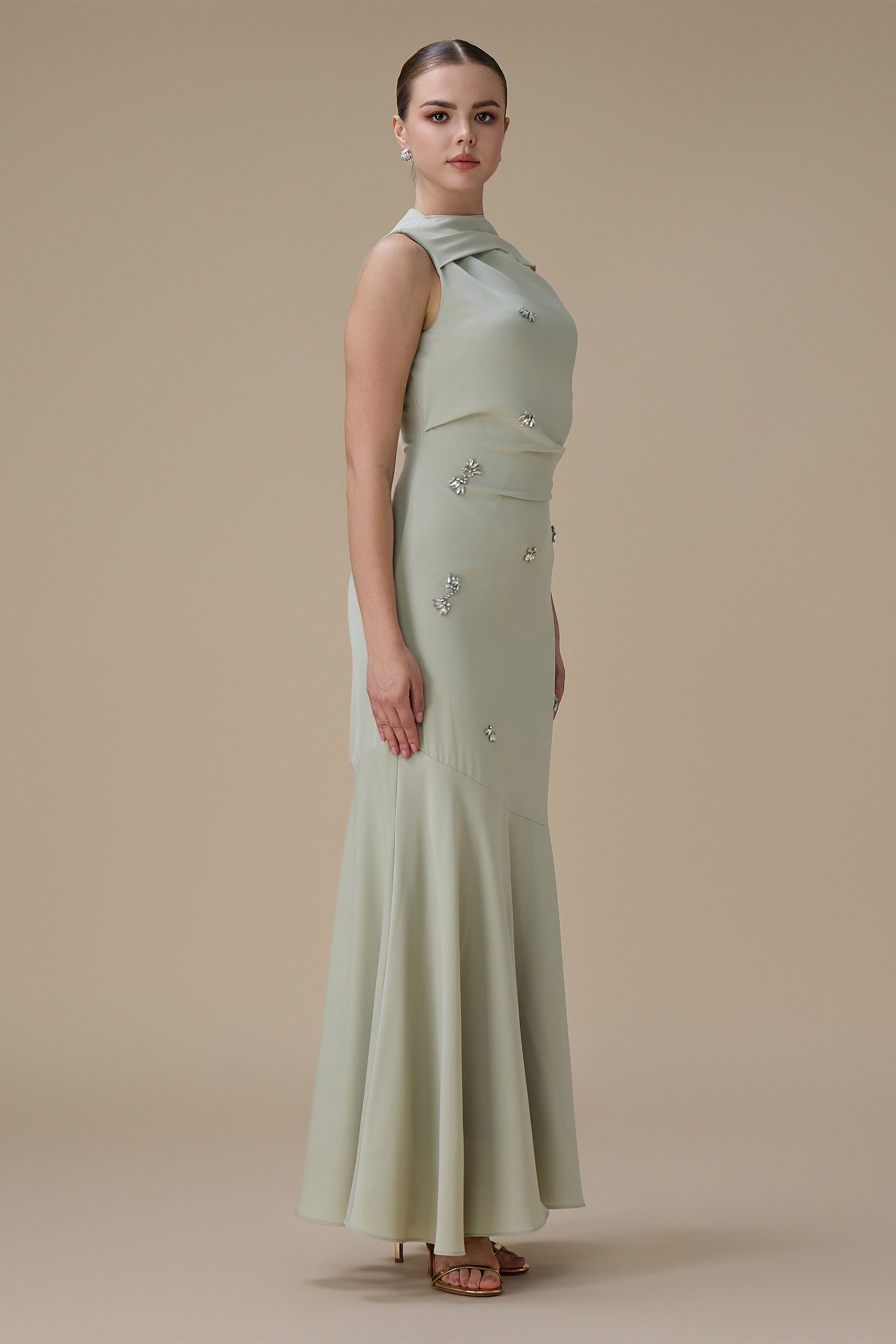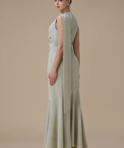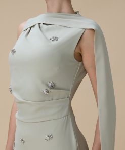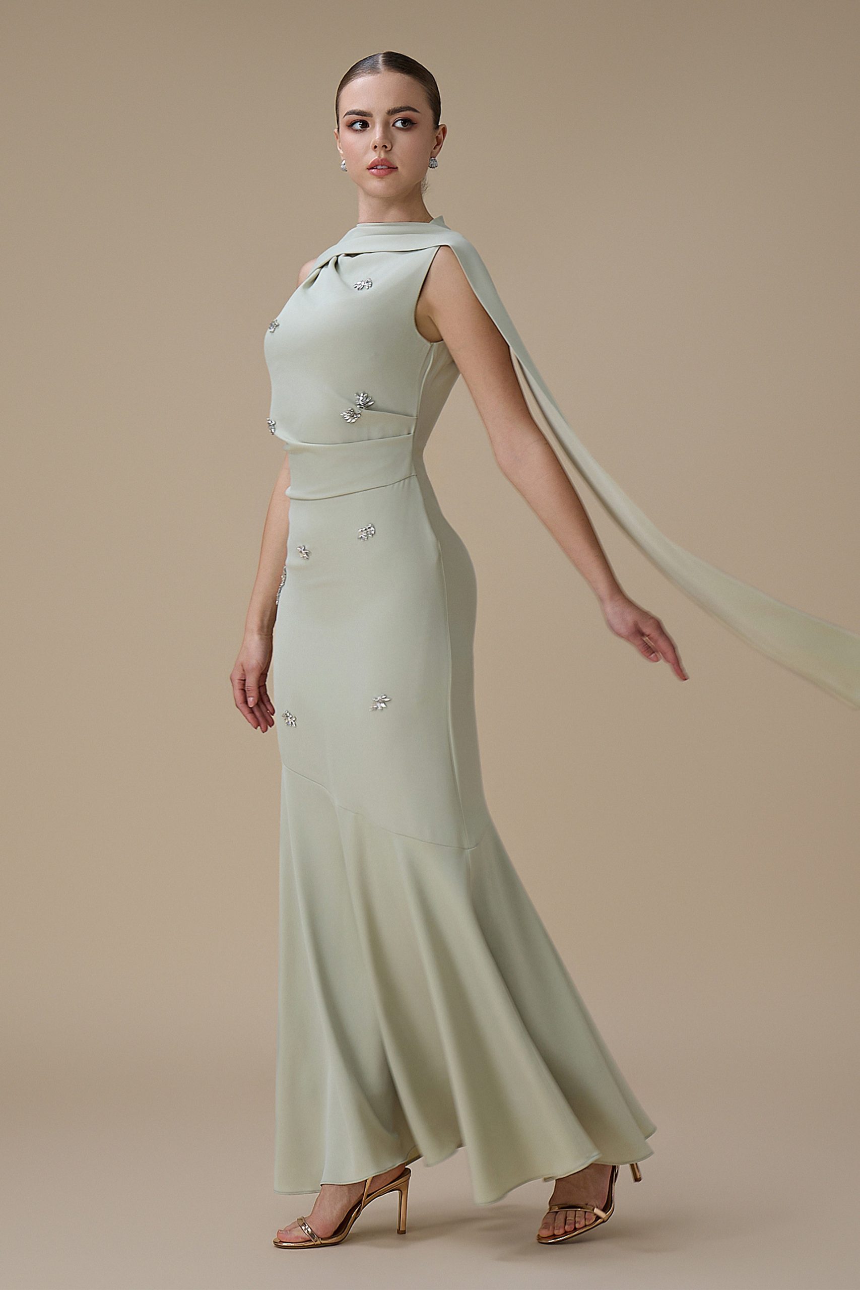 اكتان – فستان طويل أخضر فاتح بتطريز ووشاح جانبي