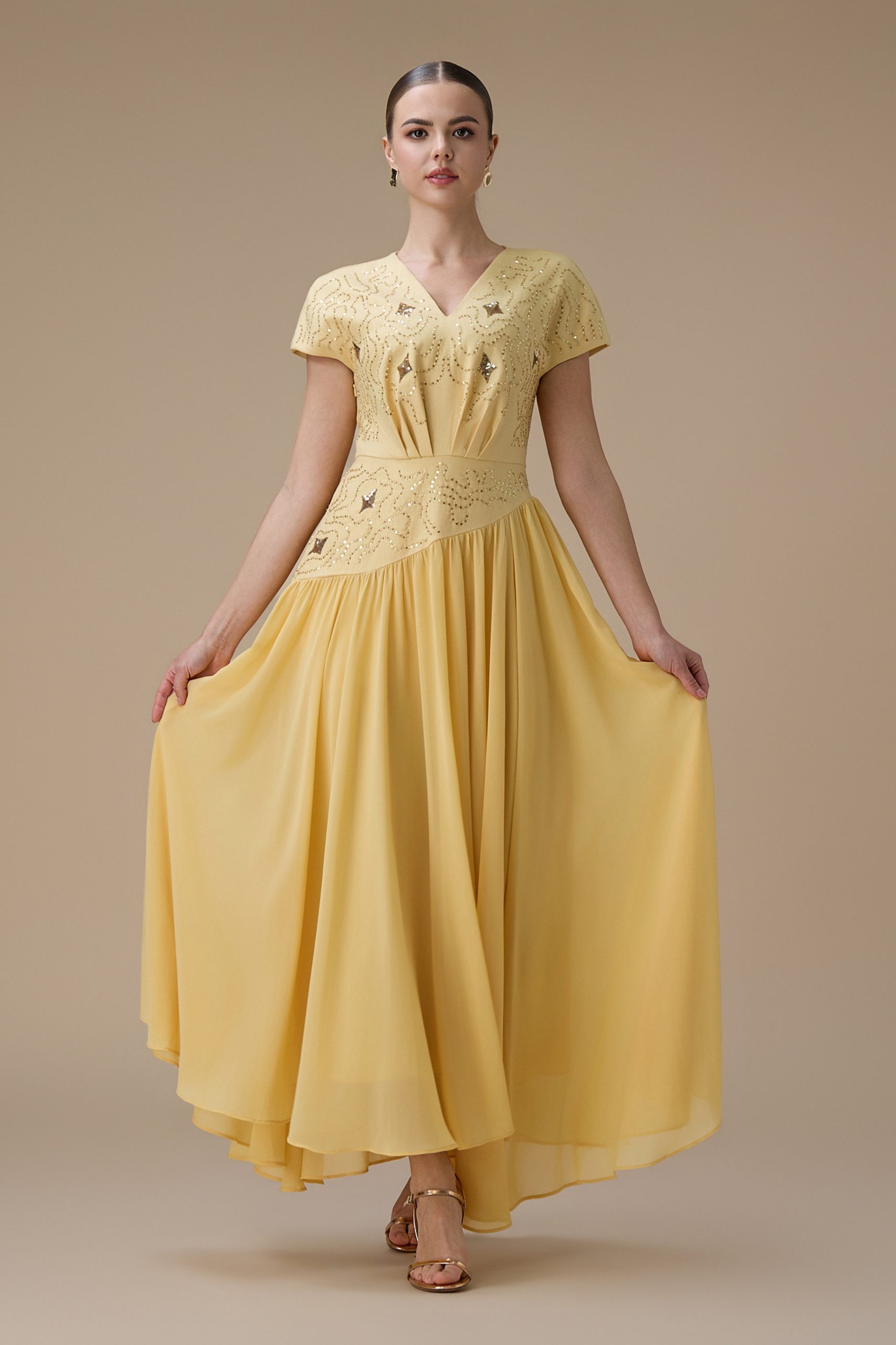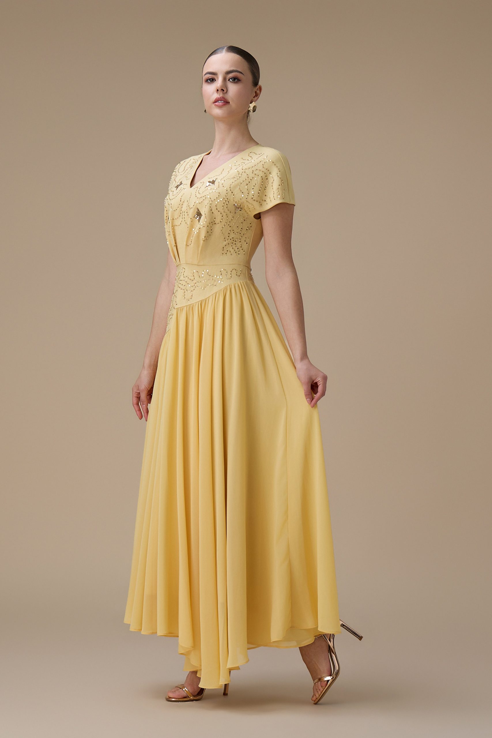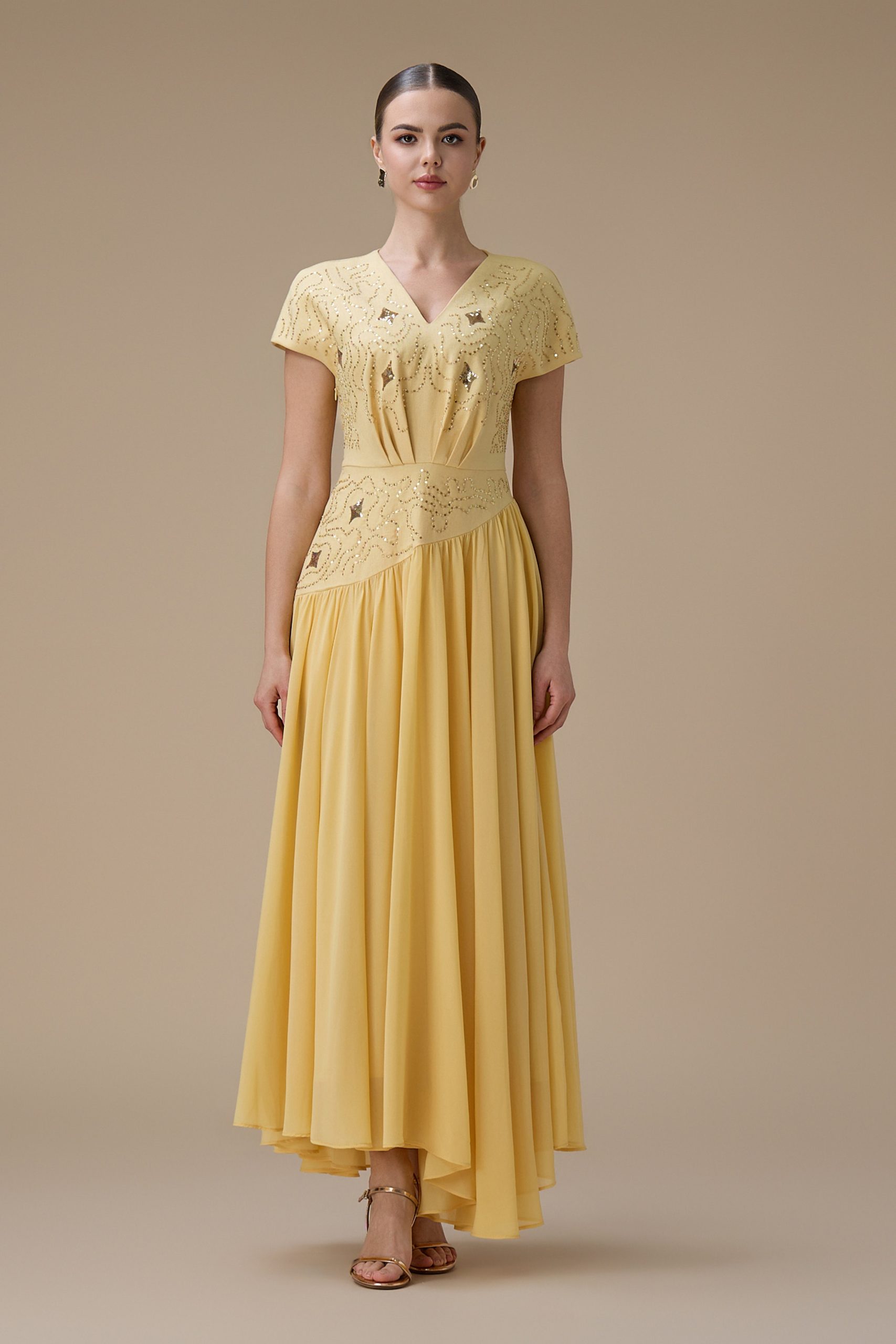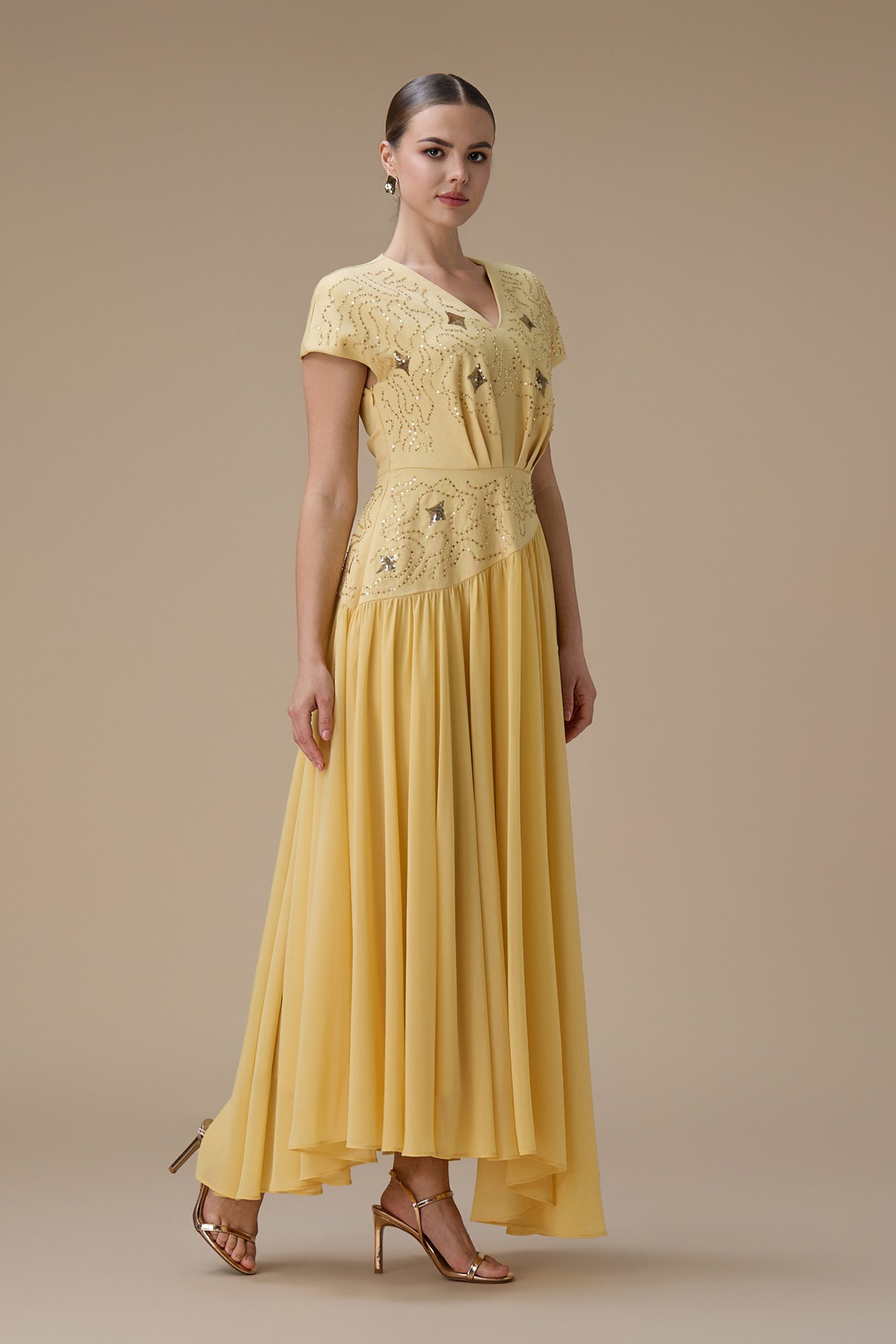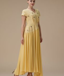 اكتان – فستان طويل أصفر بتطريز ناعم