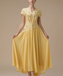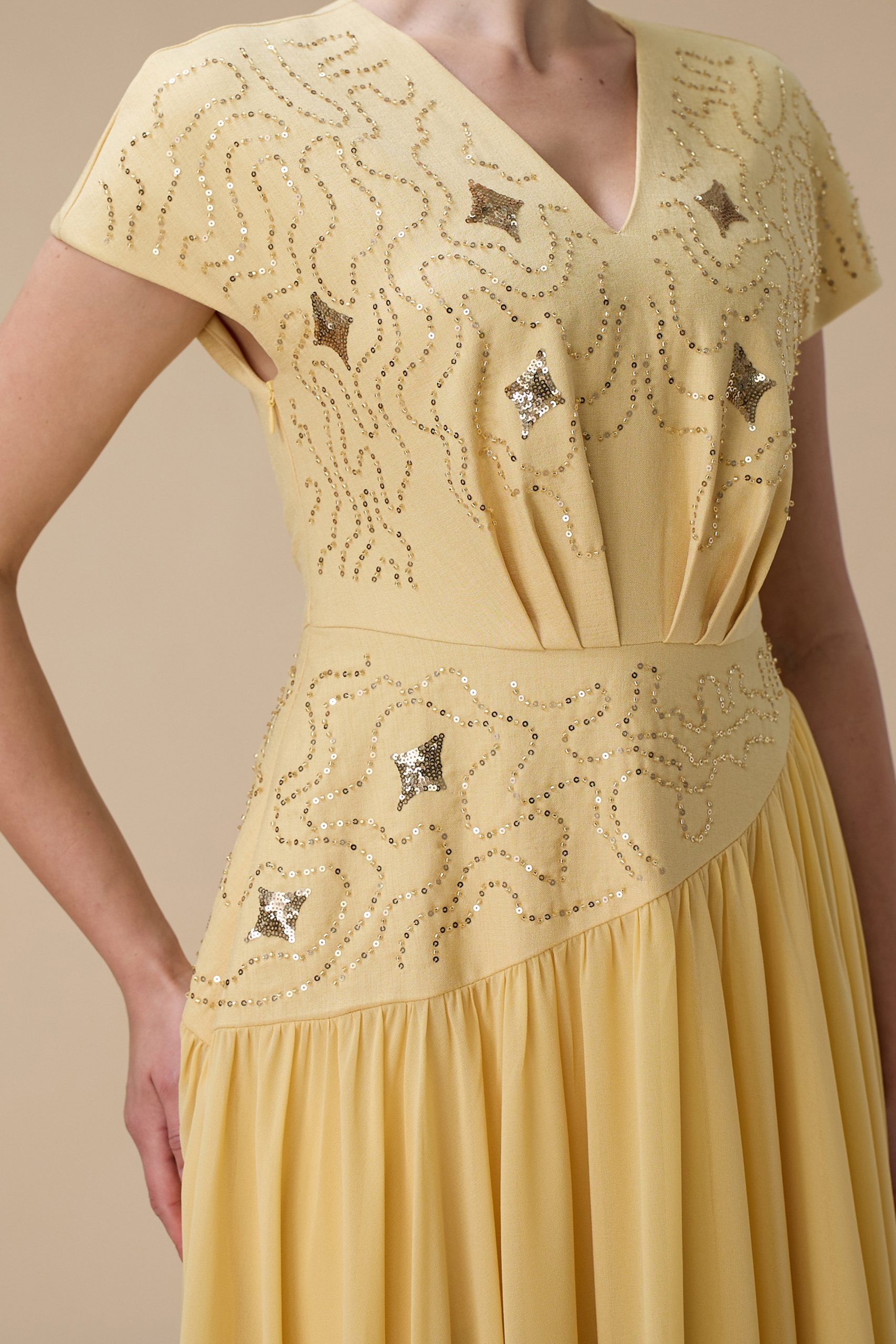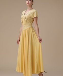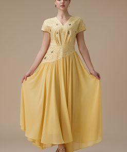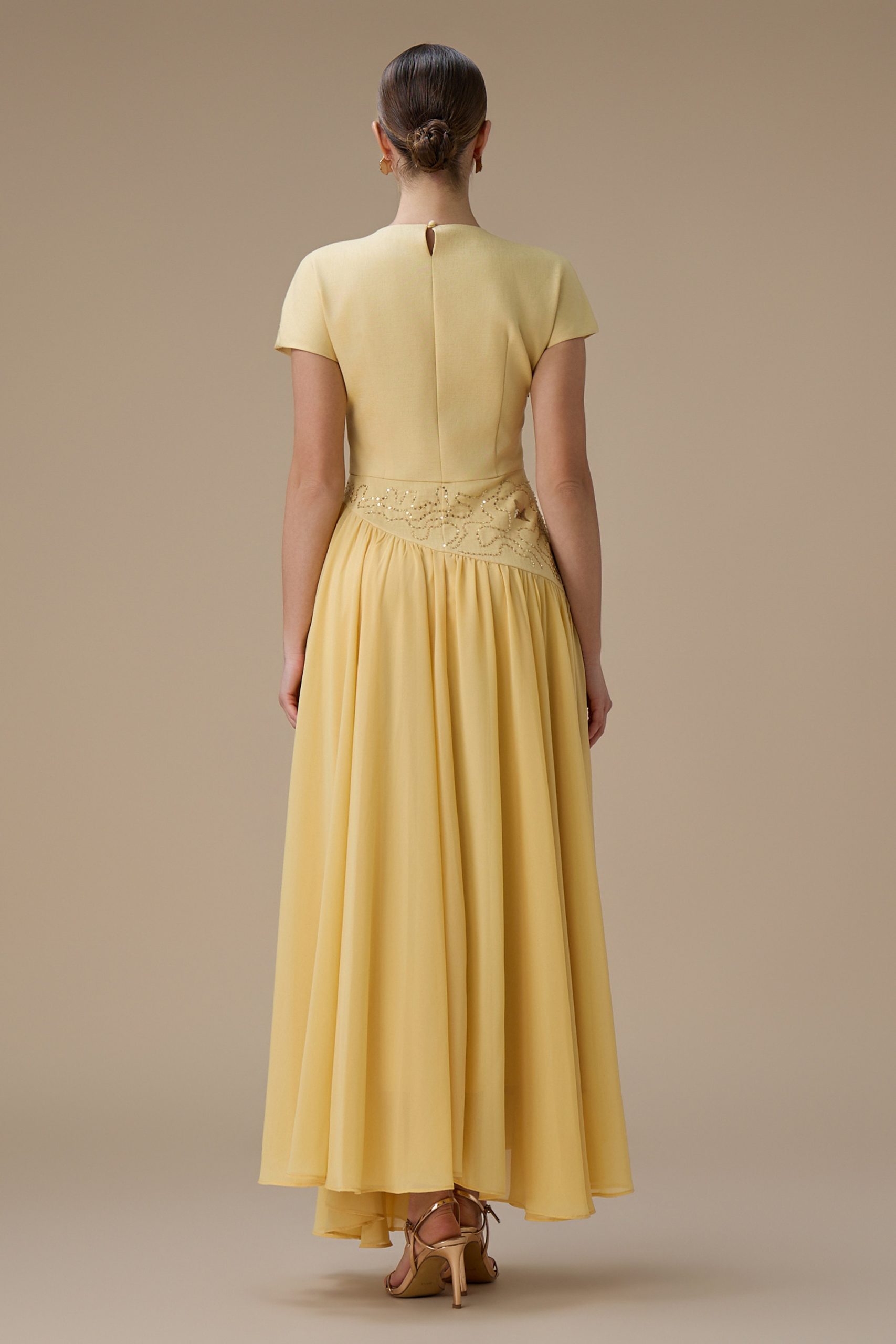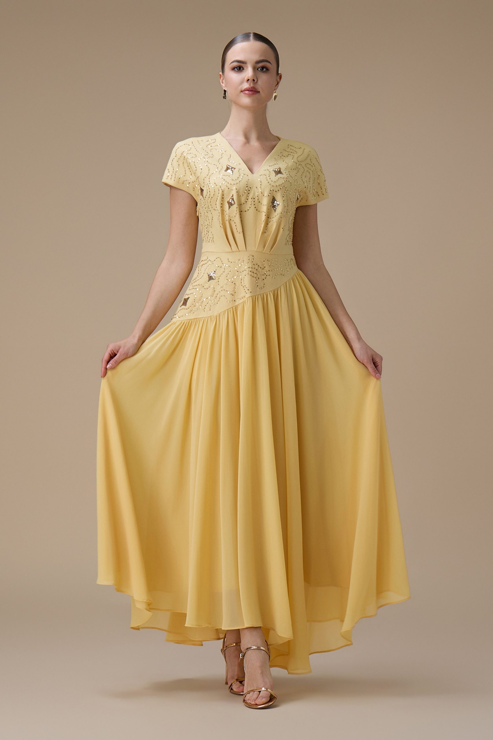 اكتان – فستان طويل أصفر بتطريز ناعم