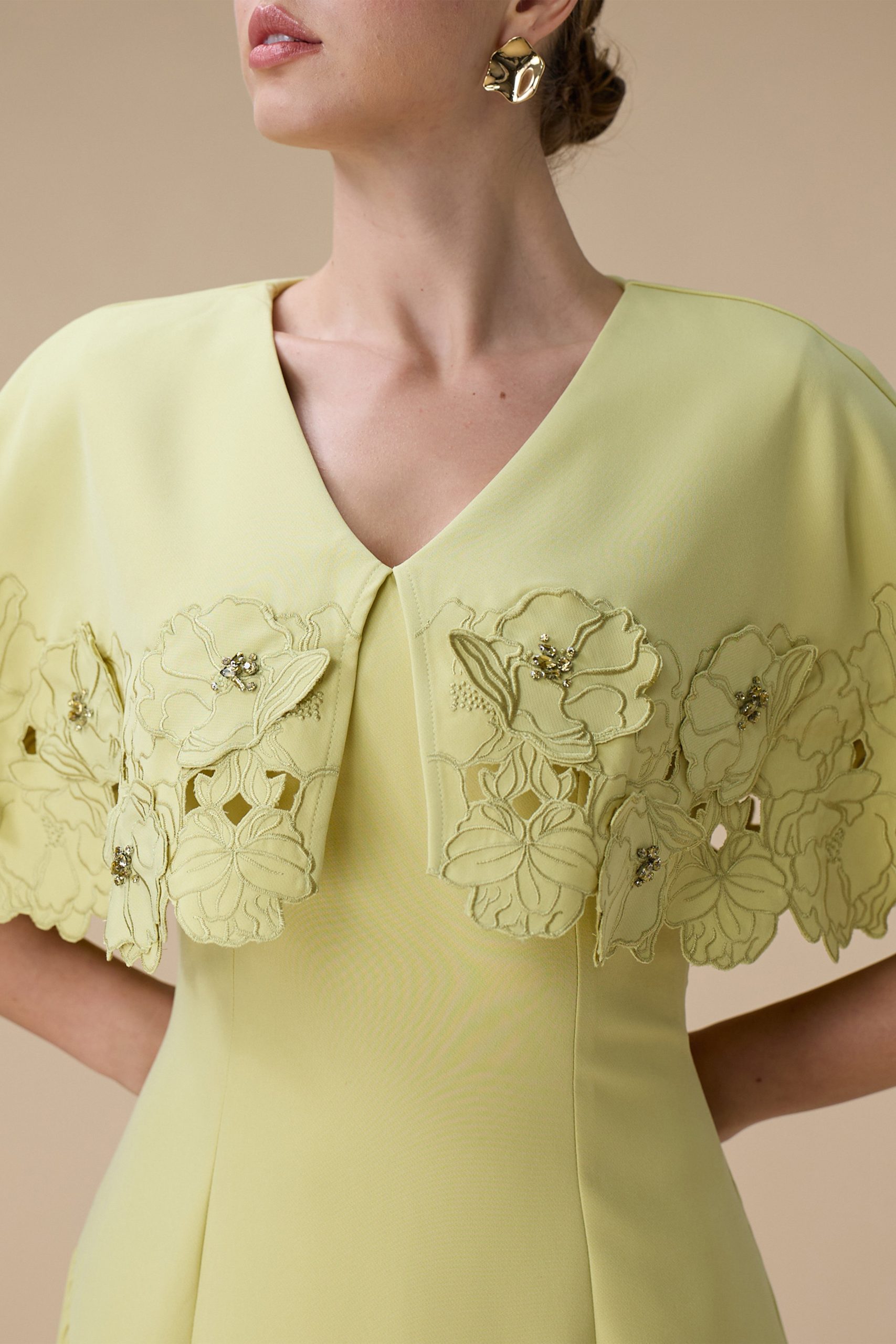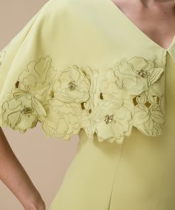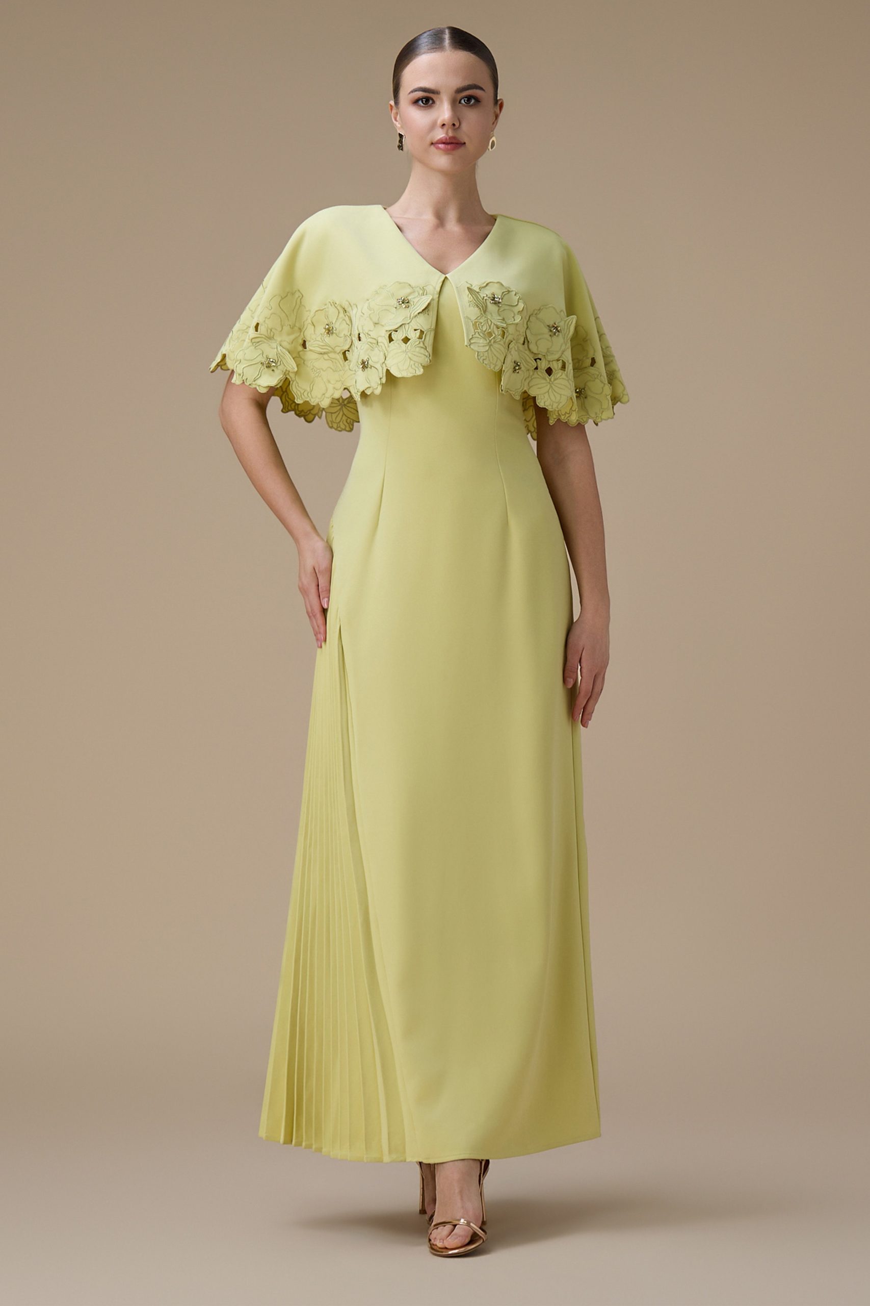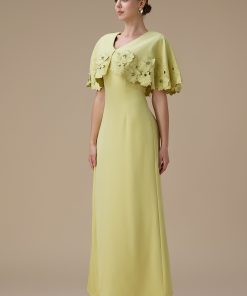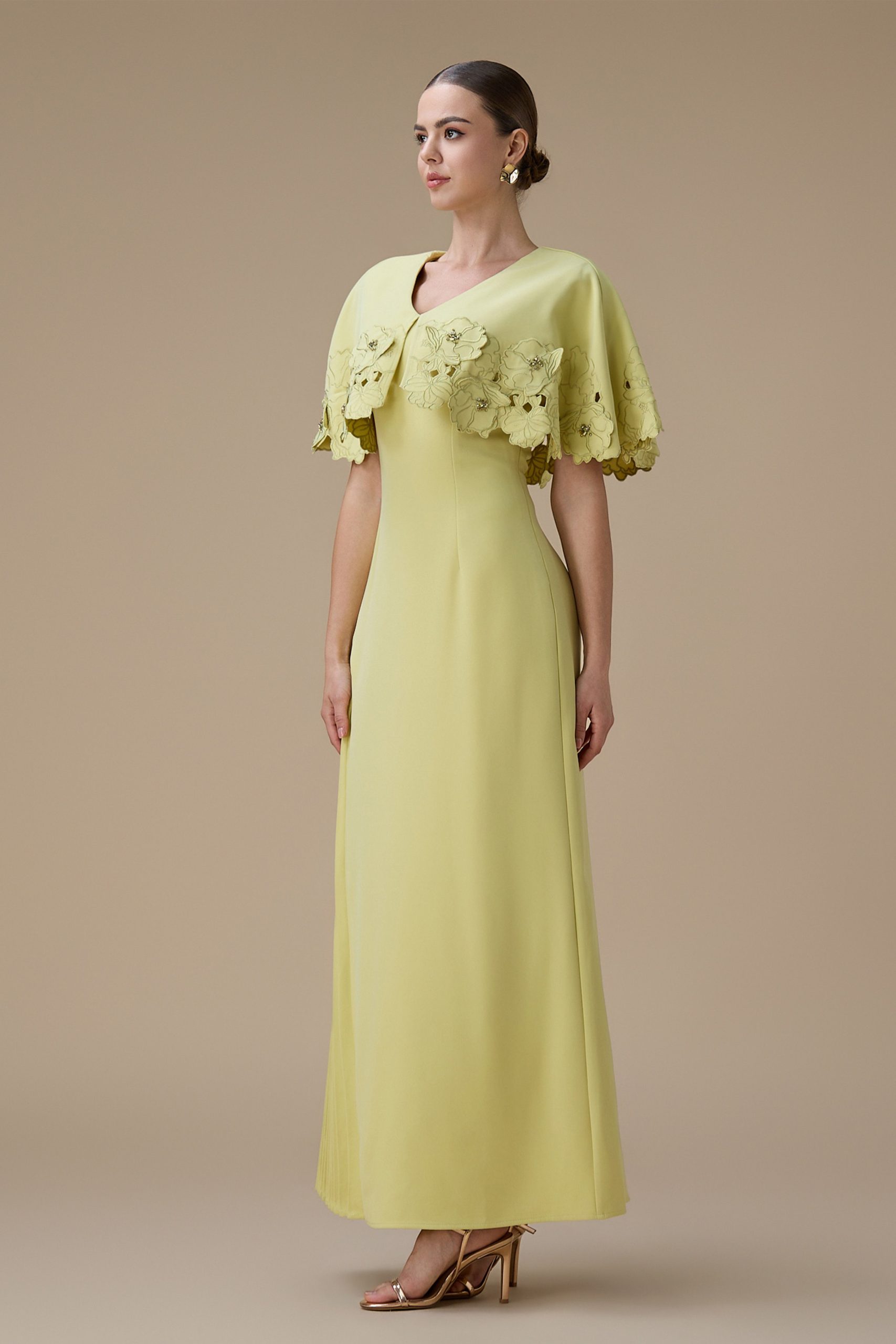 اكتان – فستان طويل اخضر ليموني بتطريزات زهرية