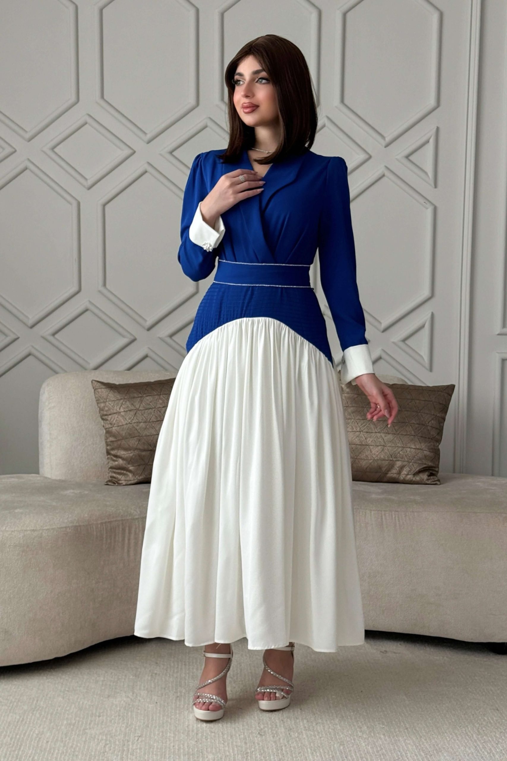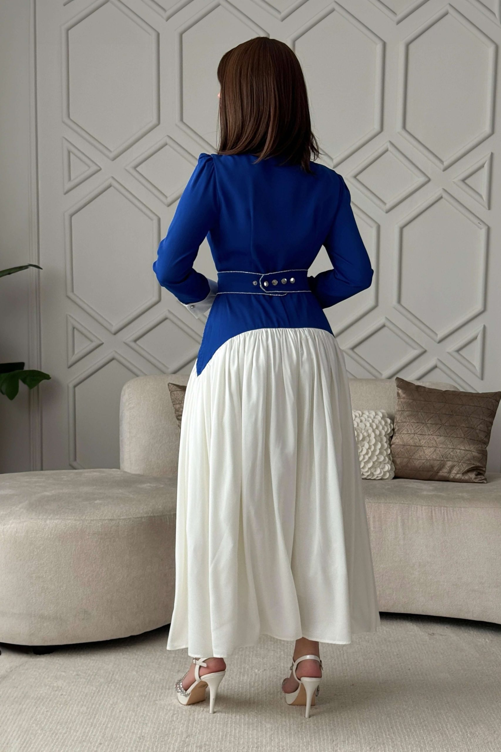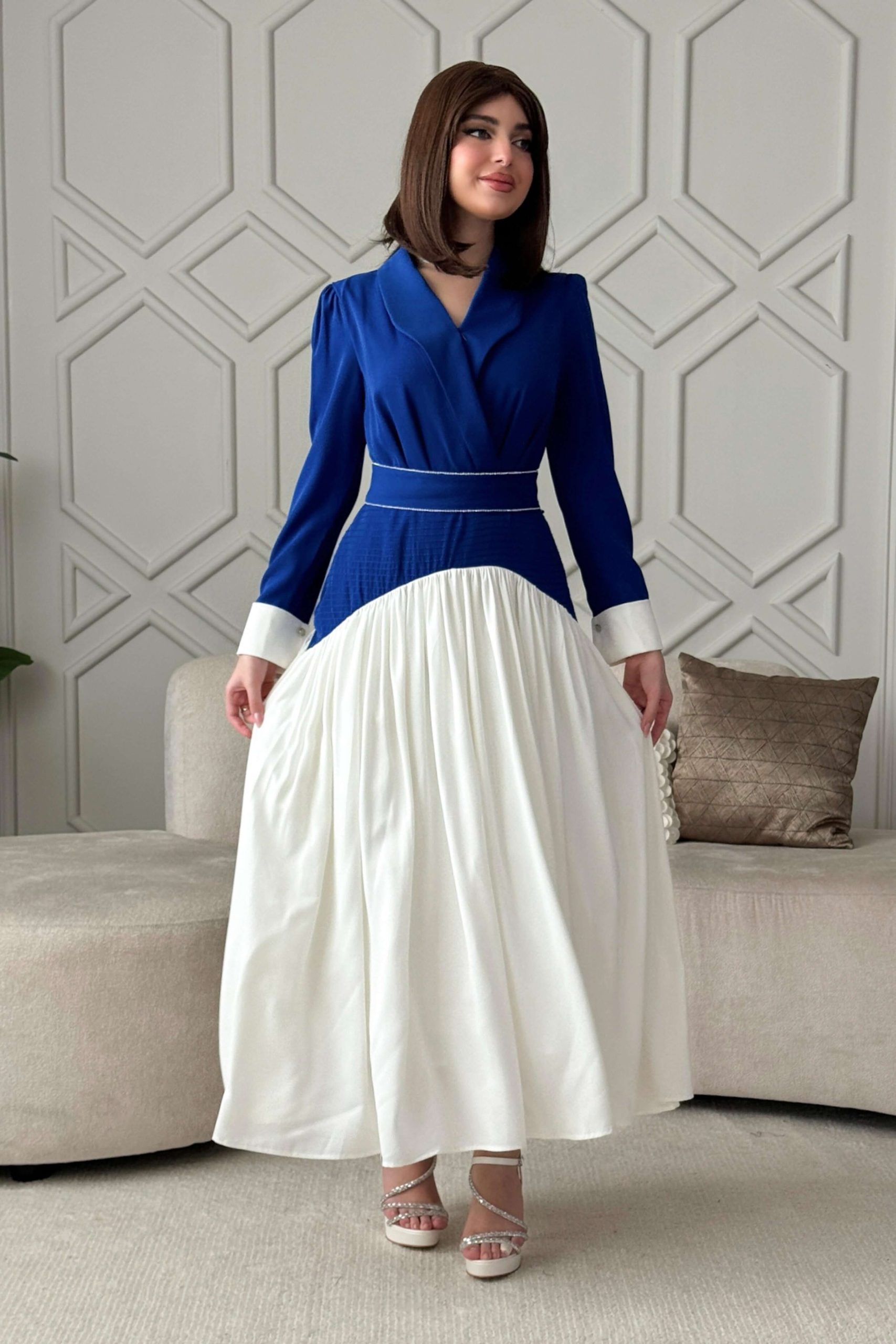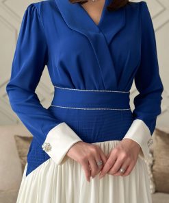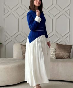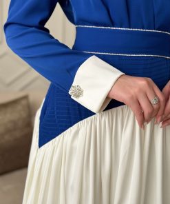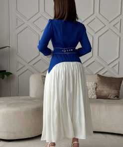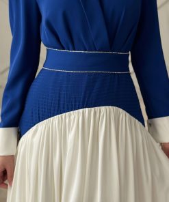 اكتان – فستان طويل بكسرات مع حزام لون ازرق