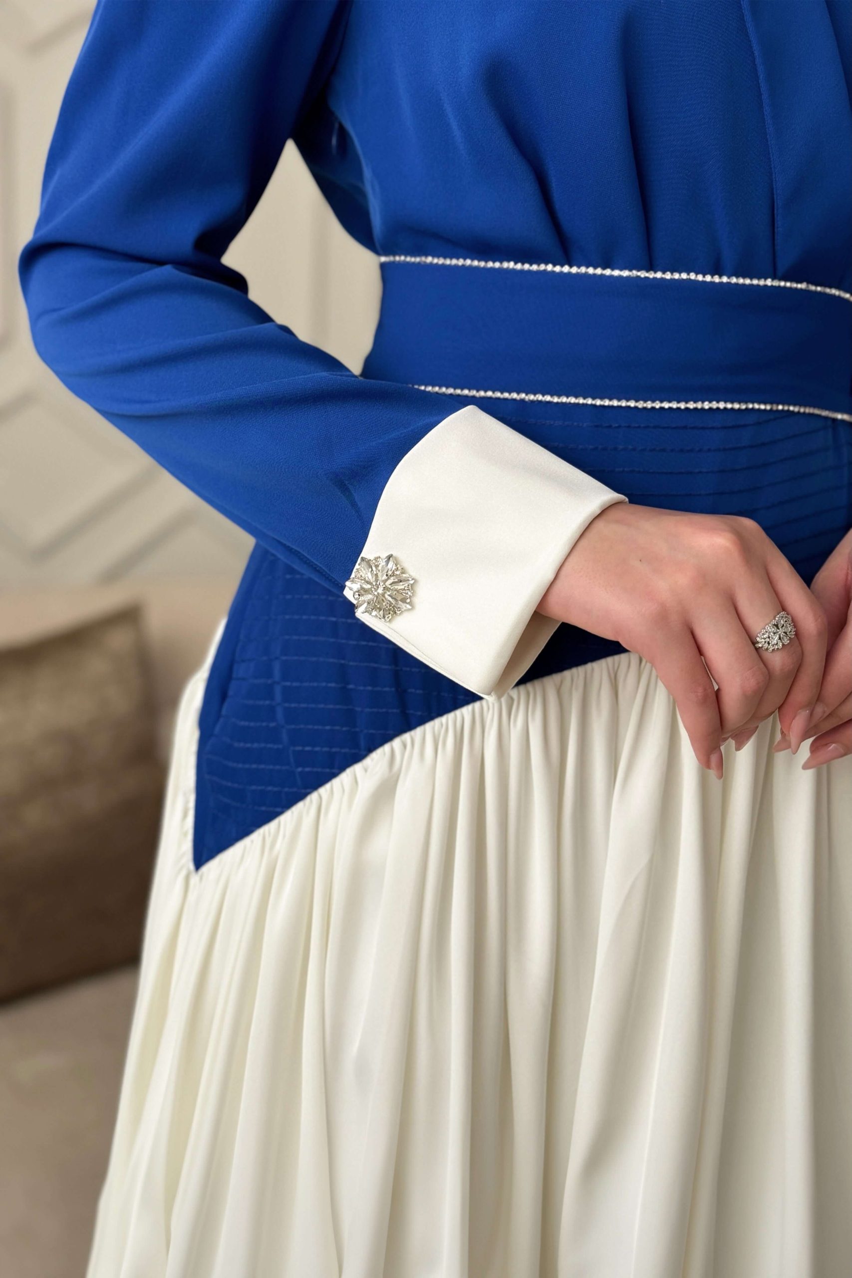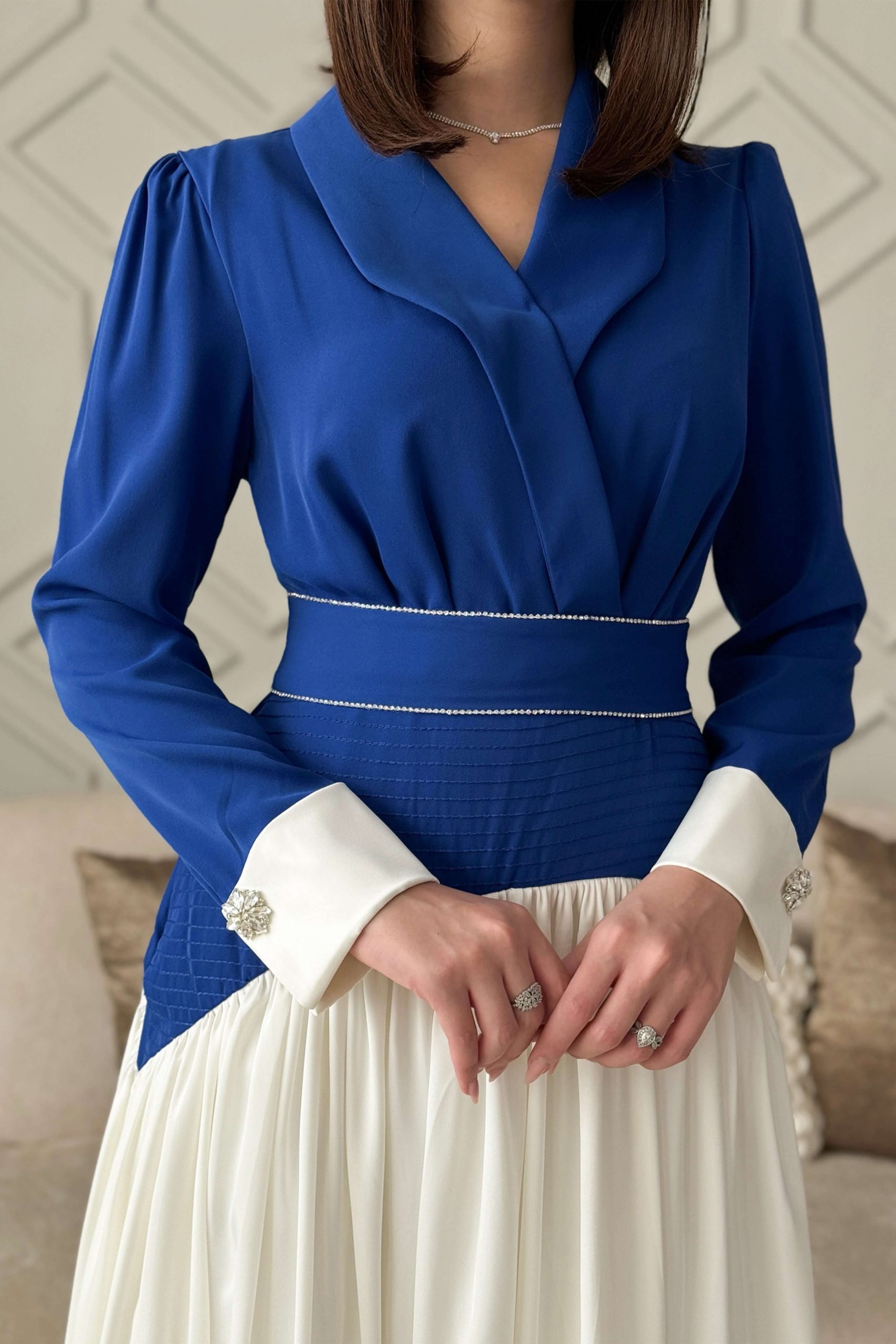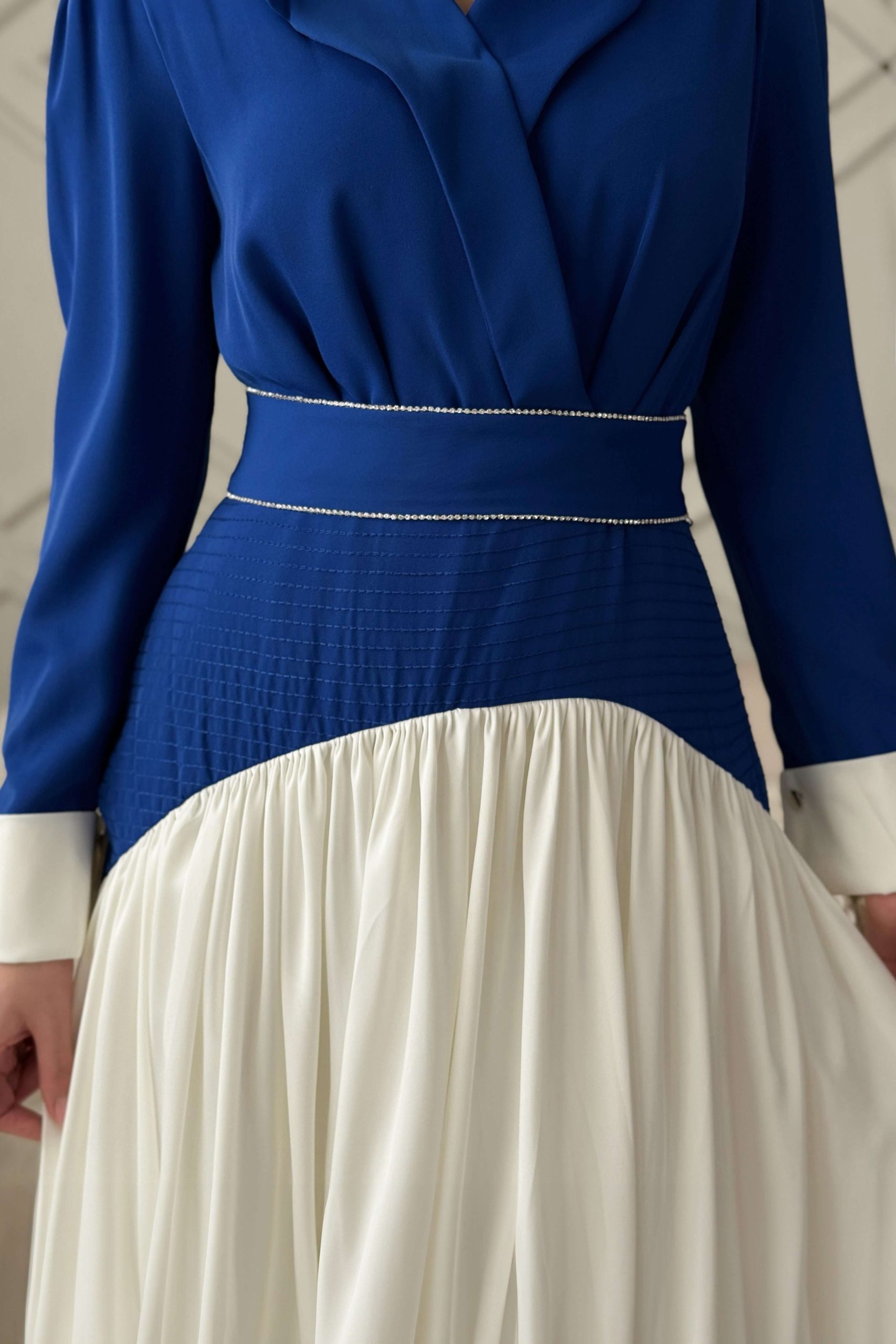 اكتان – فستان طويل بكسرات مع حزام لون ازرق