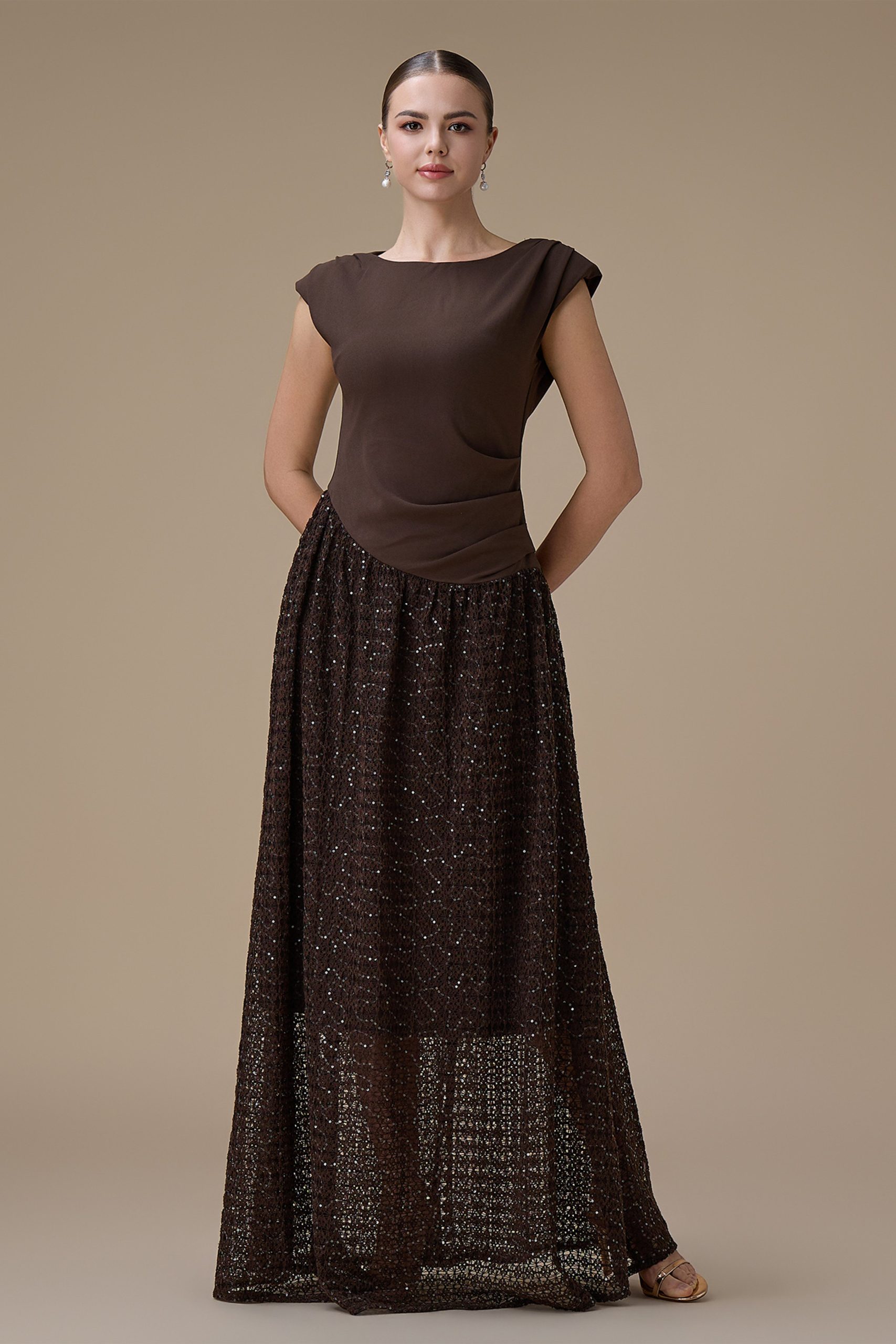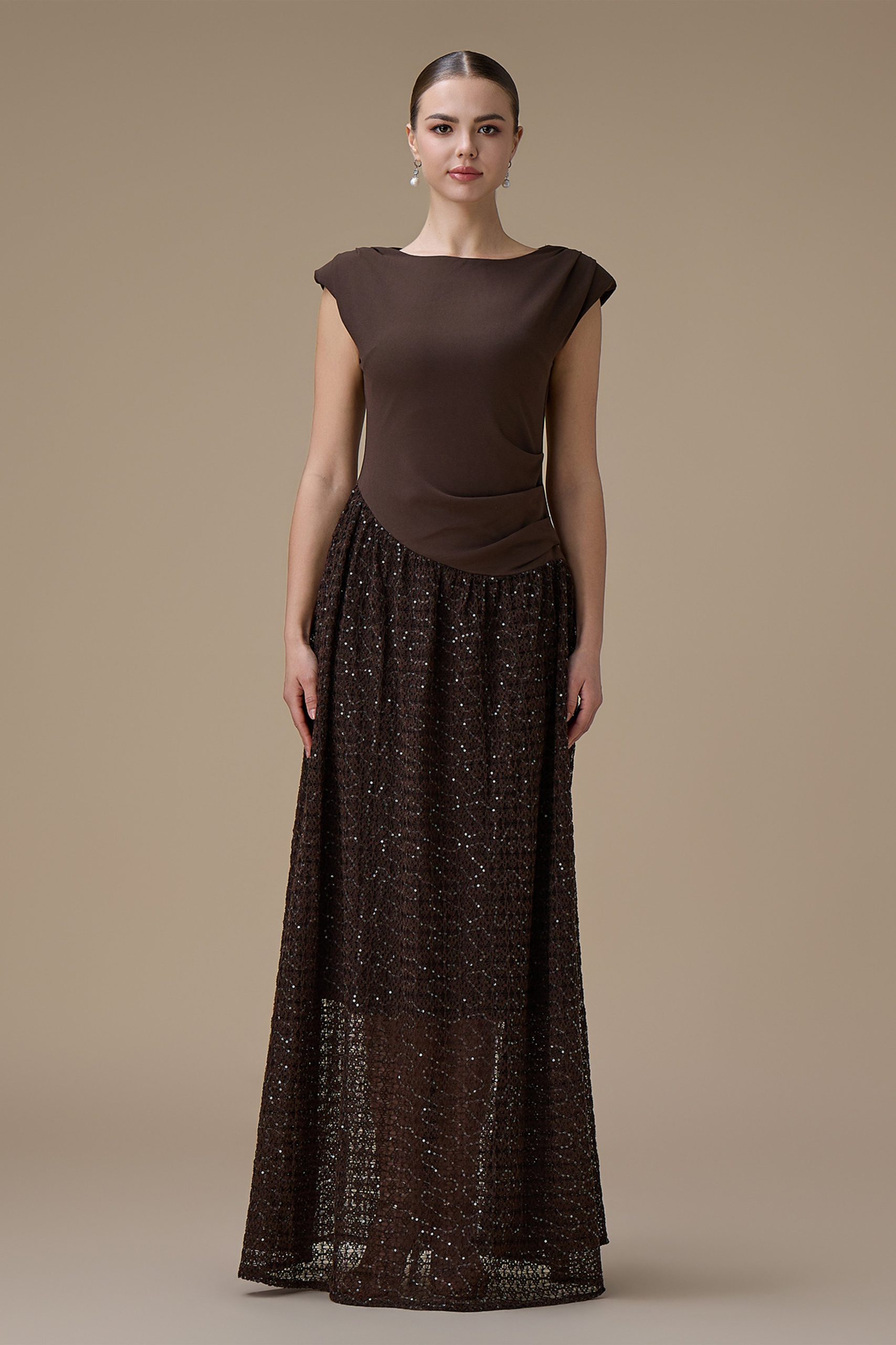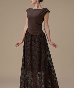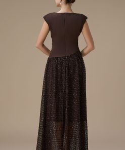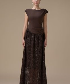 اكتان – فستان طويل بني بدانتيل مطرز