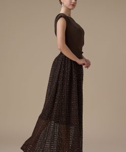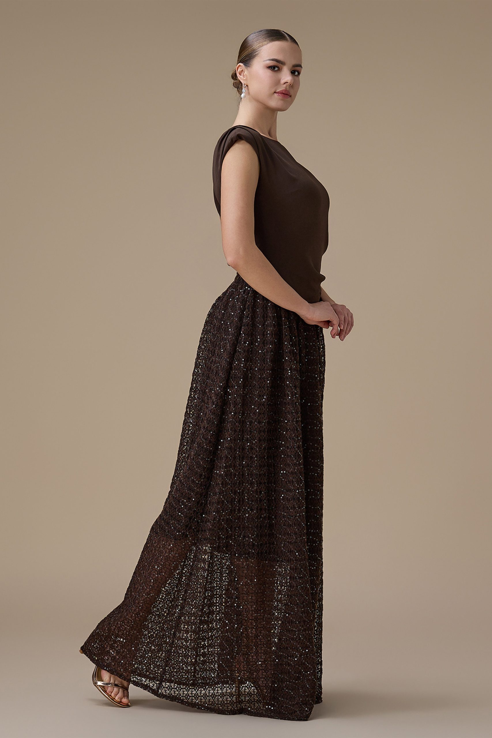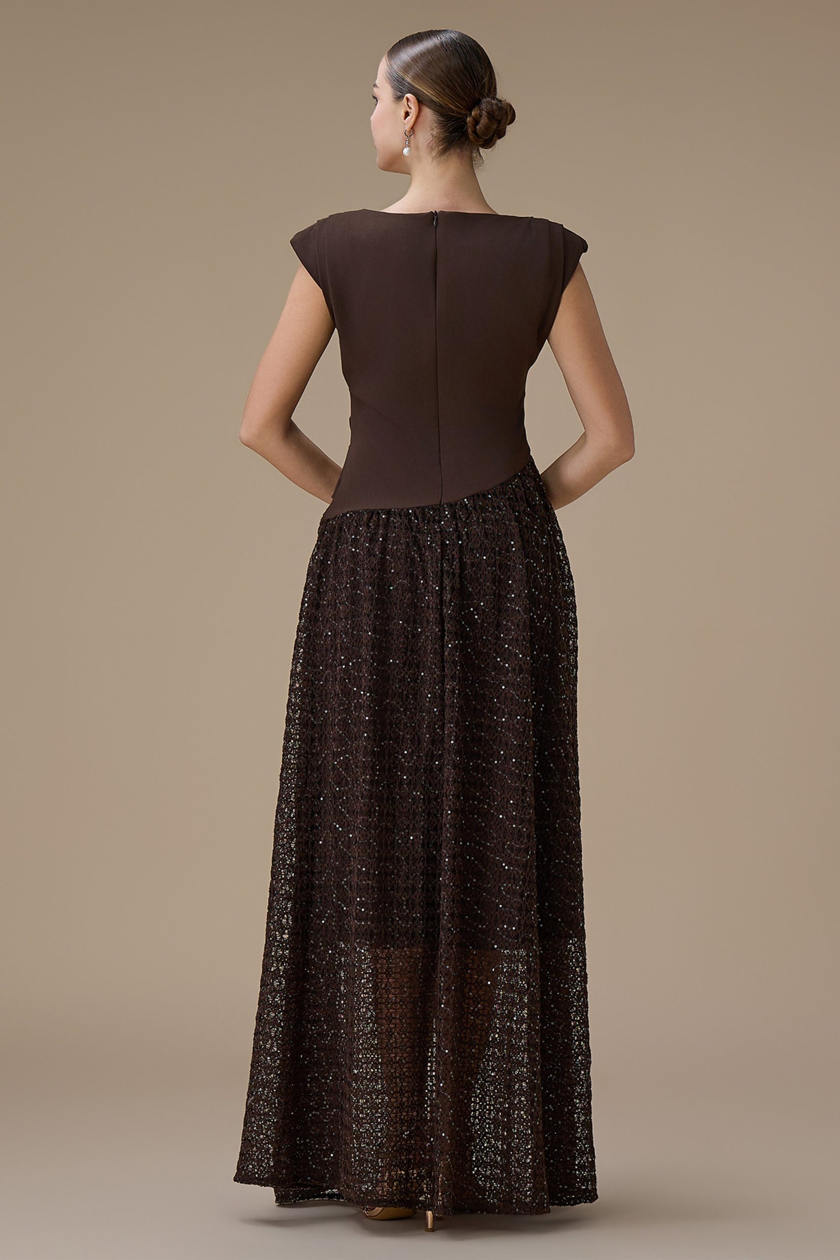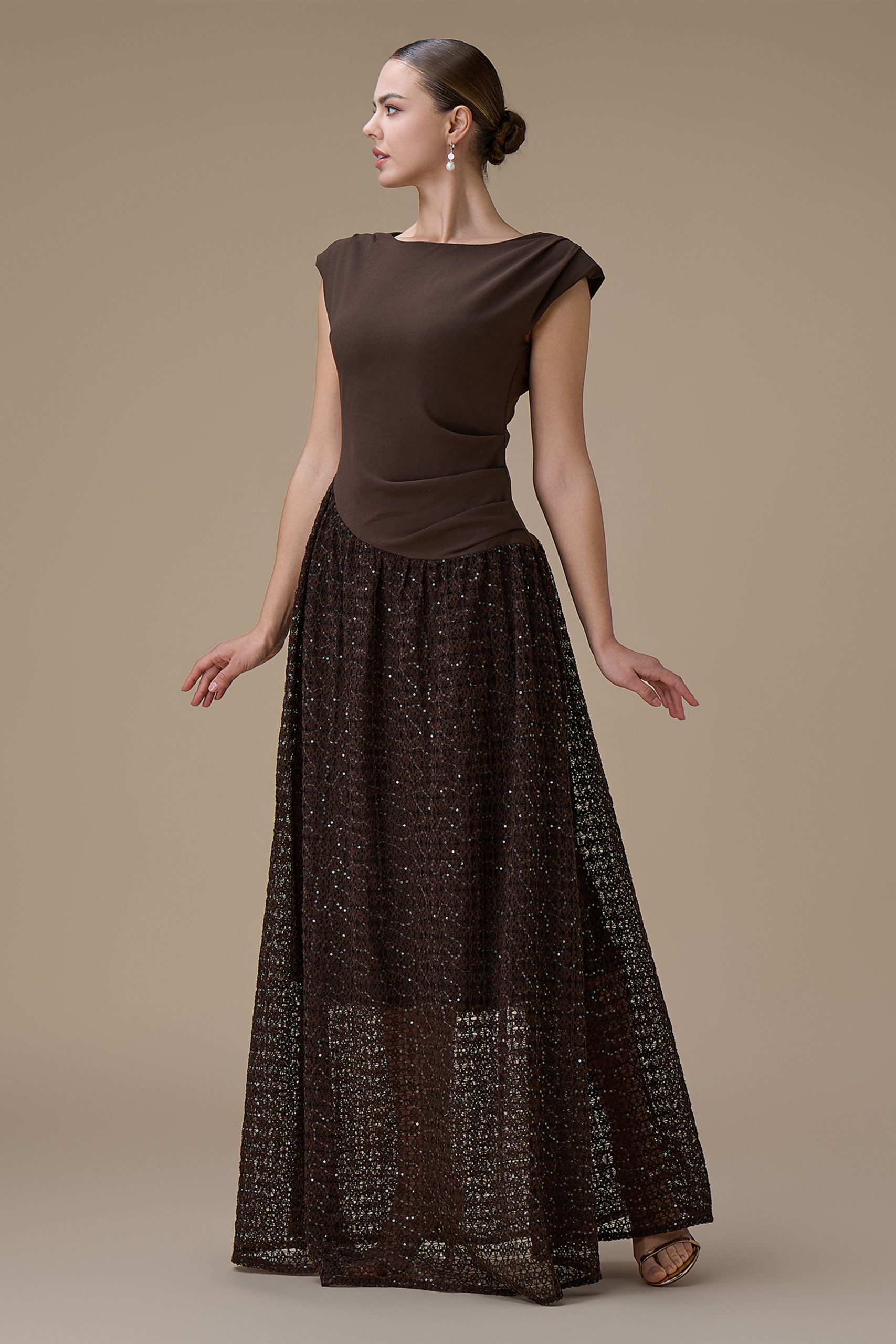 اكتان – فستان طويل بني بدانتيل مطرز