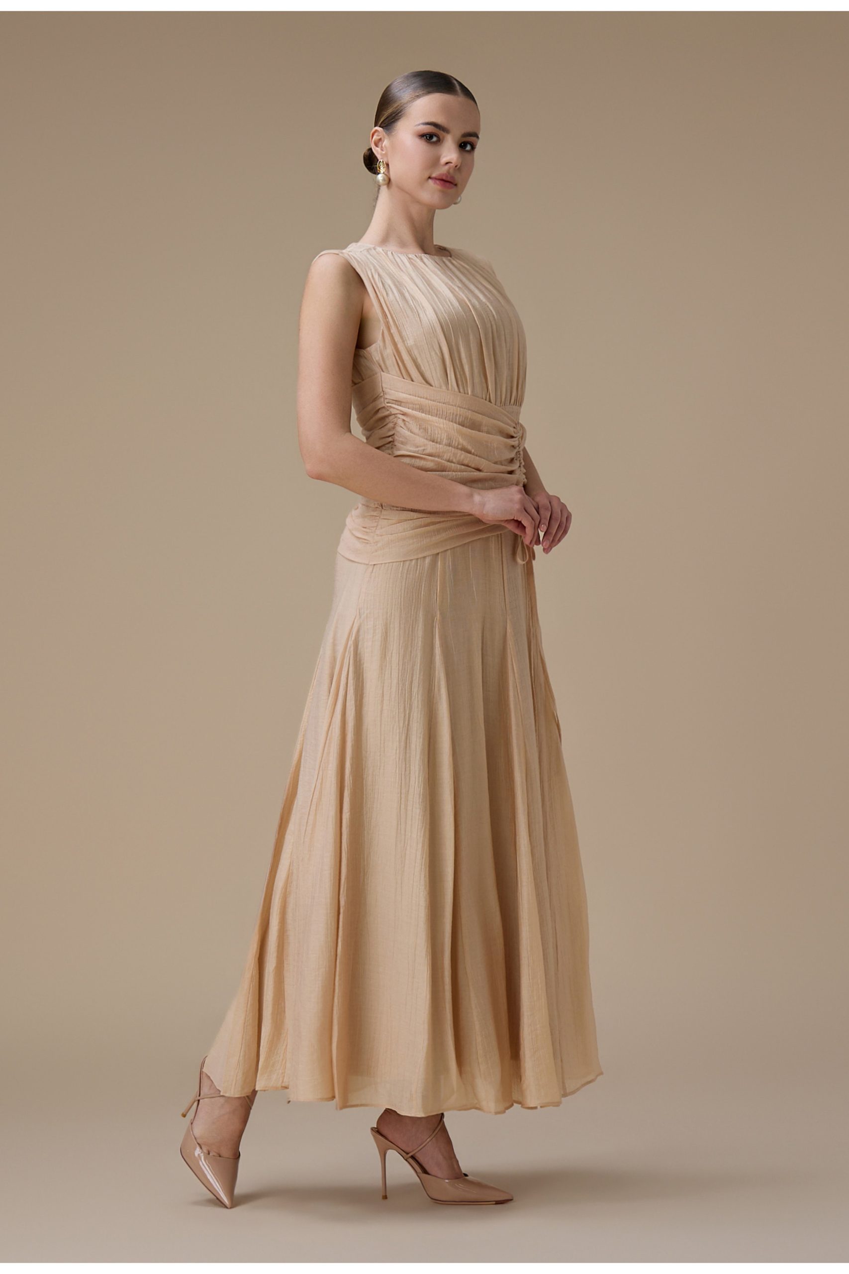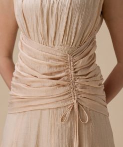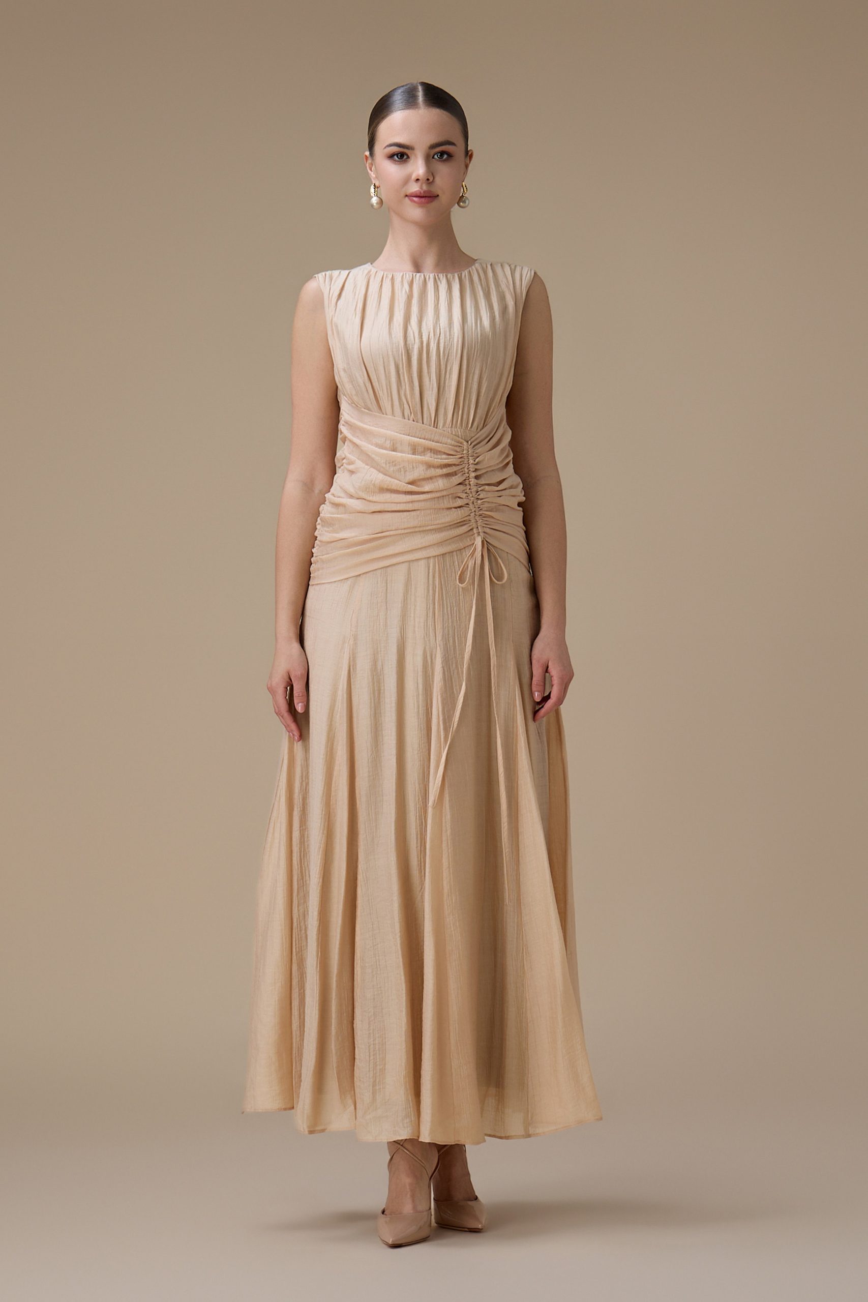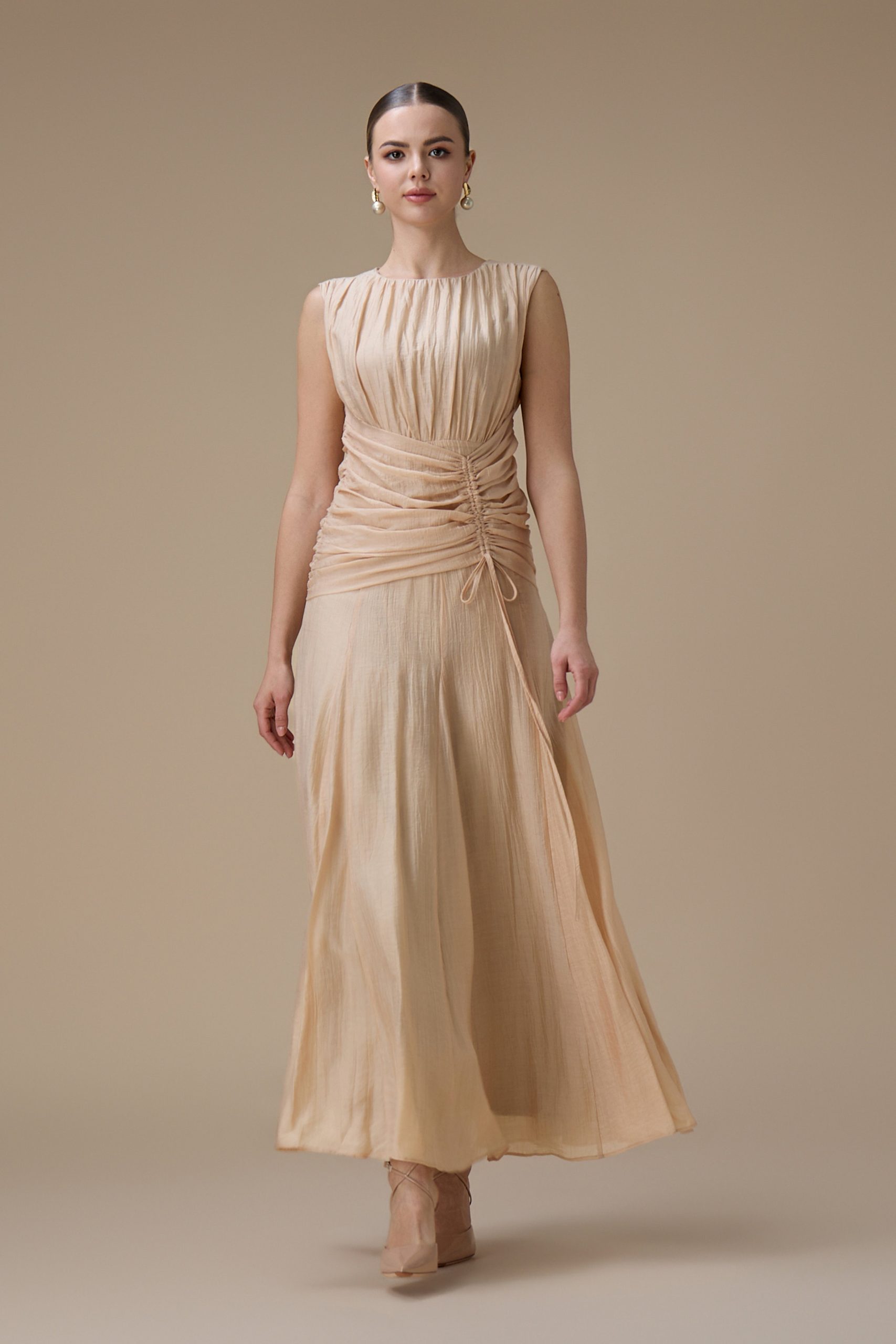 اكتان – فستان طويل بيج مع كسرات جانبية