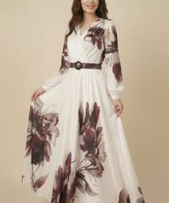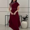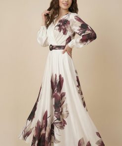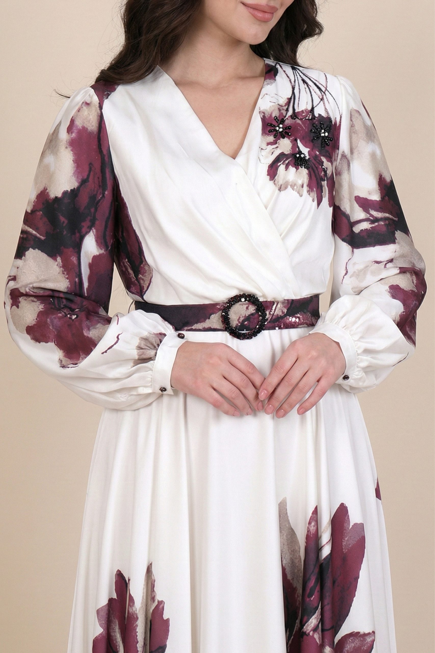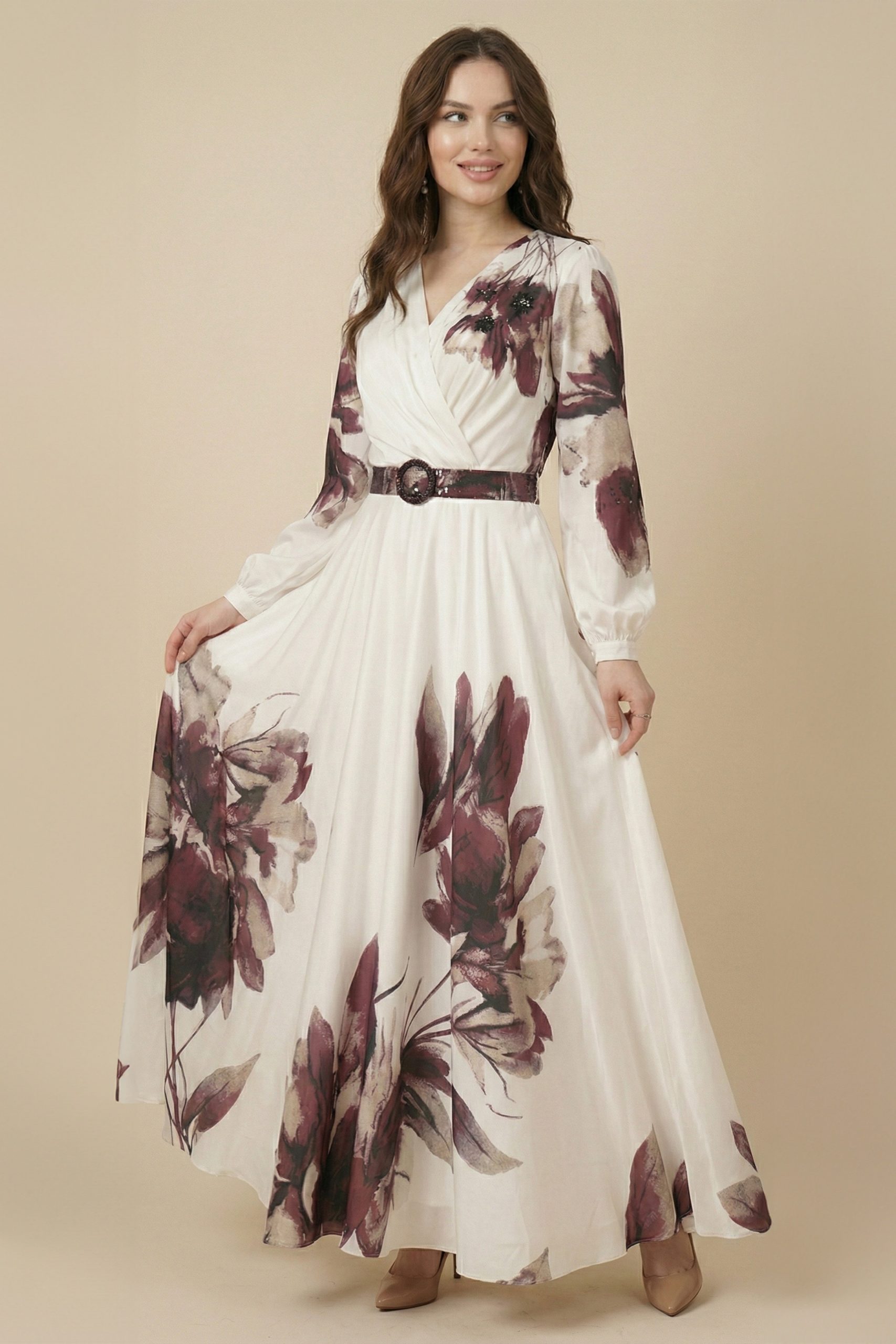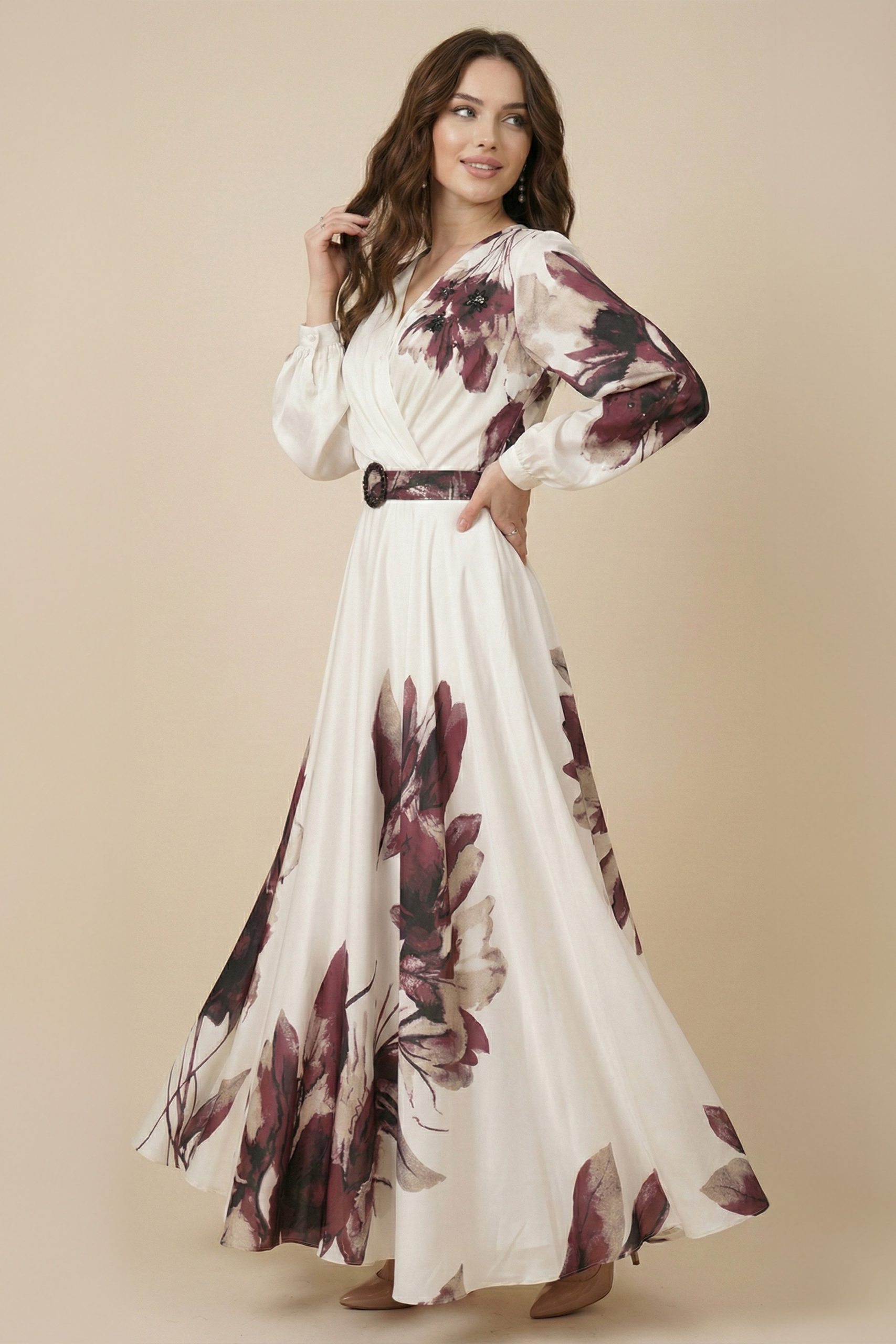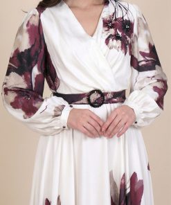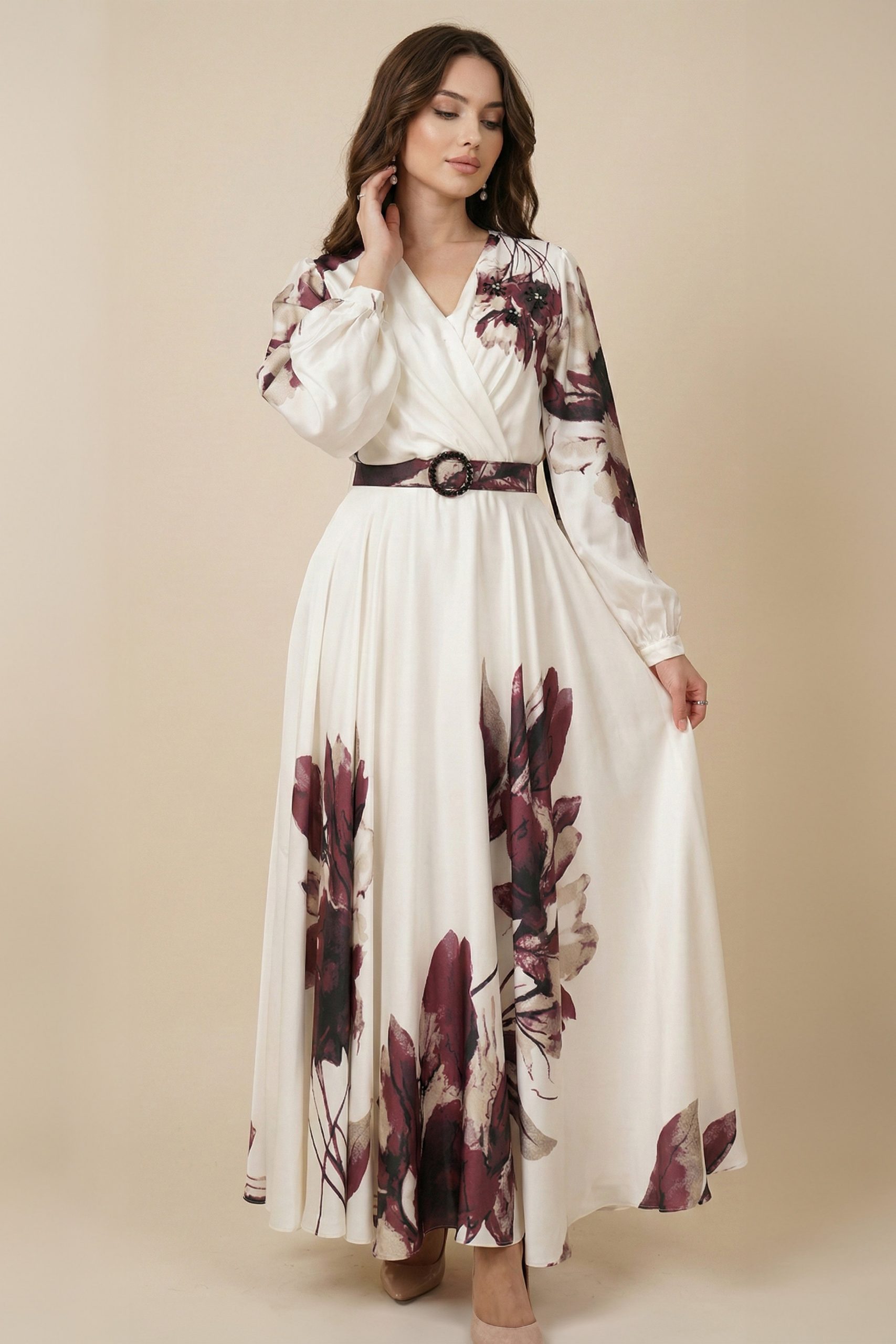 اكتان – فستان عنابي ساتان باكمام طويلة