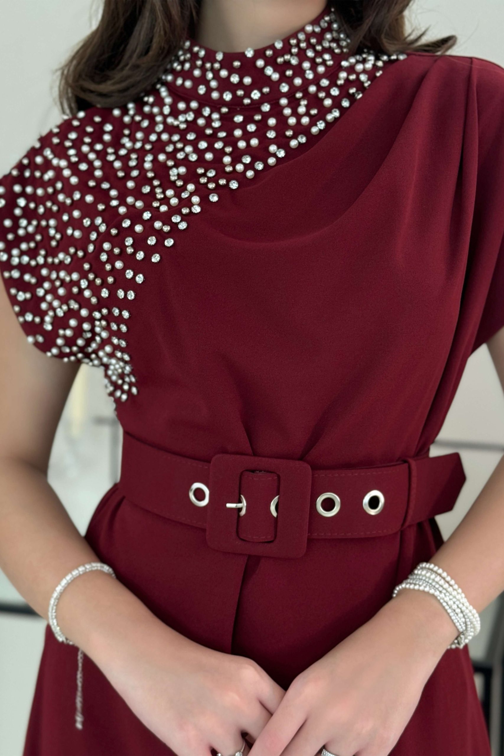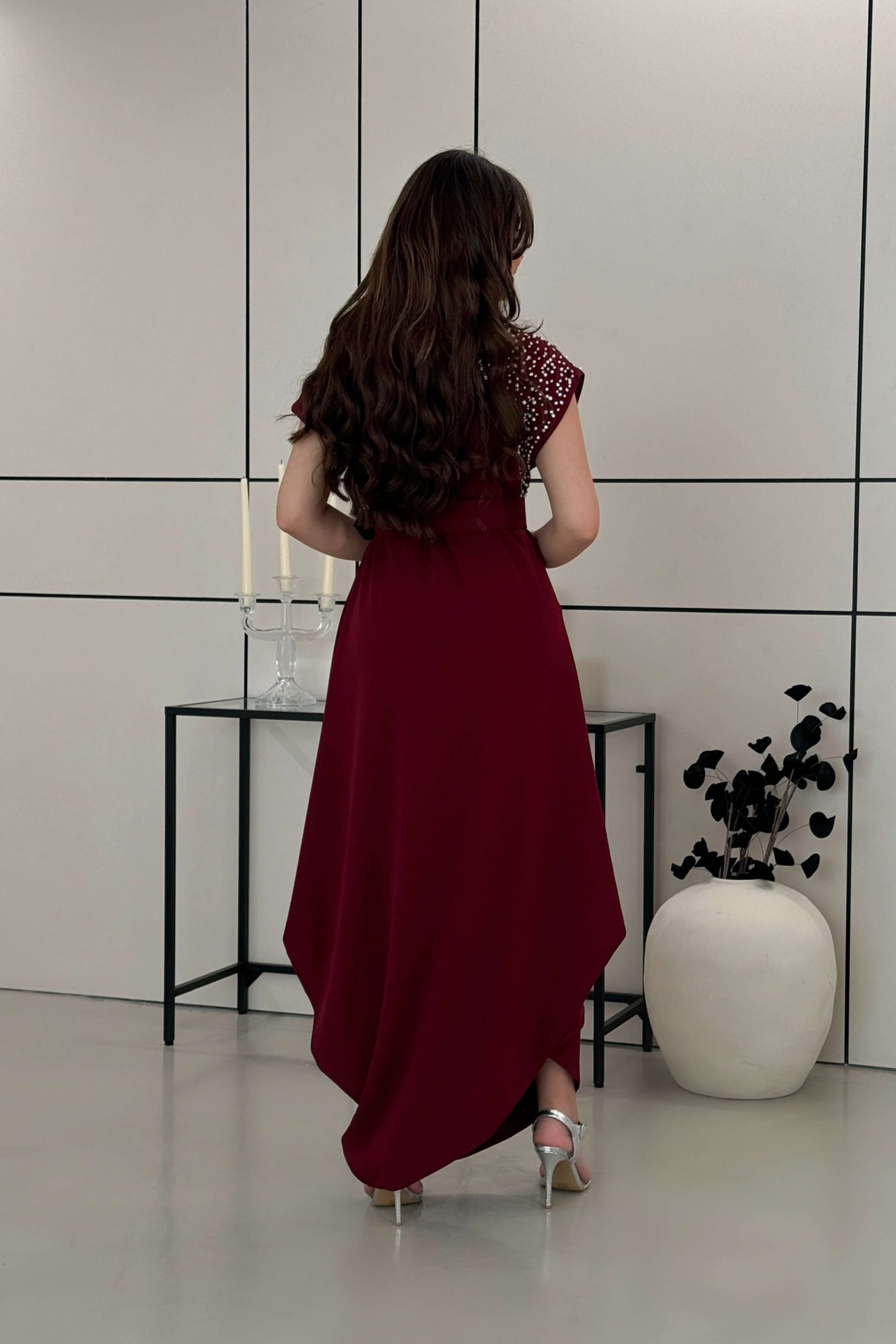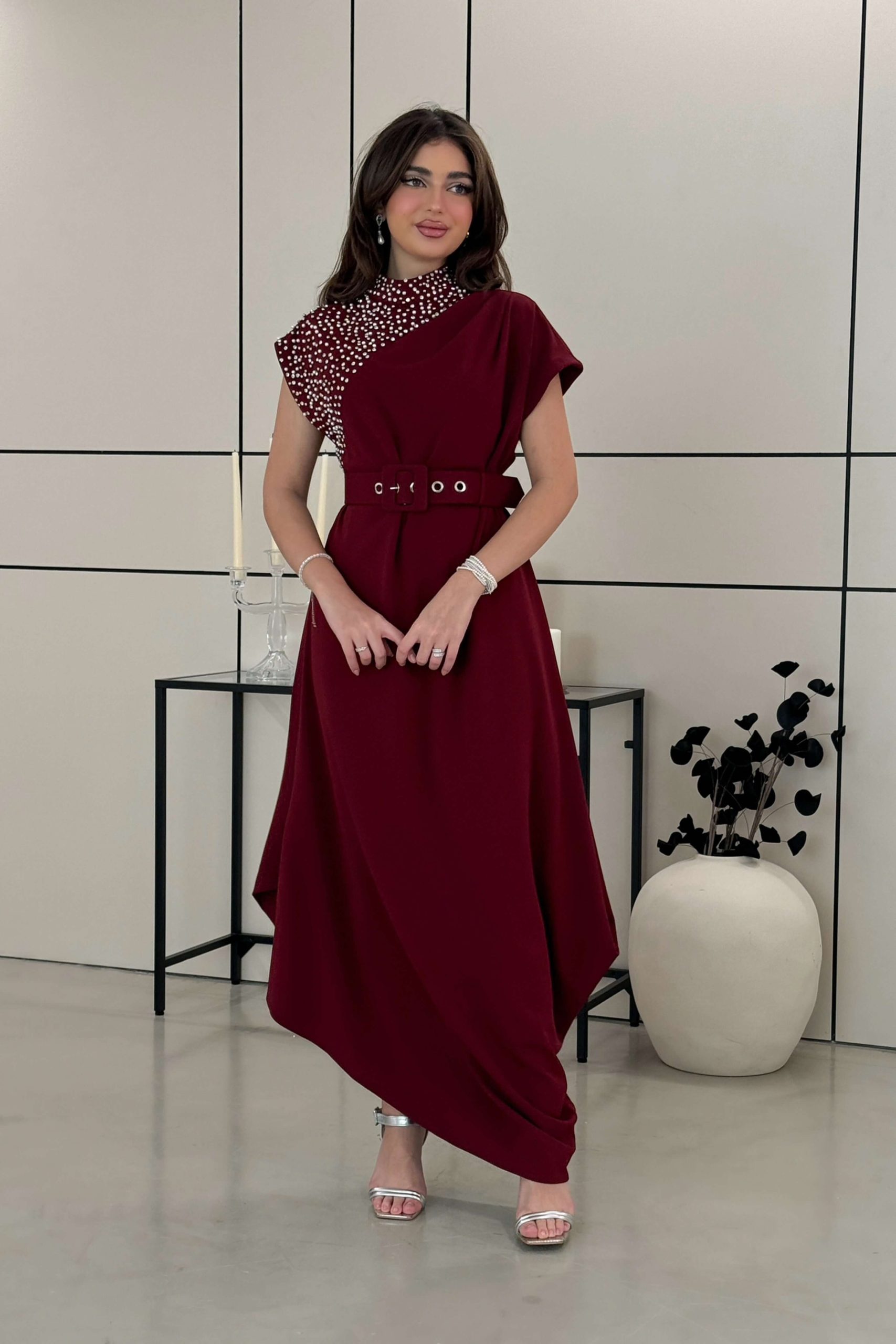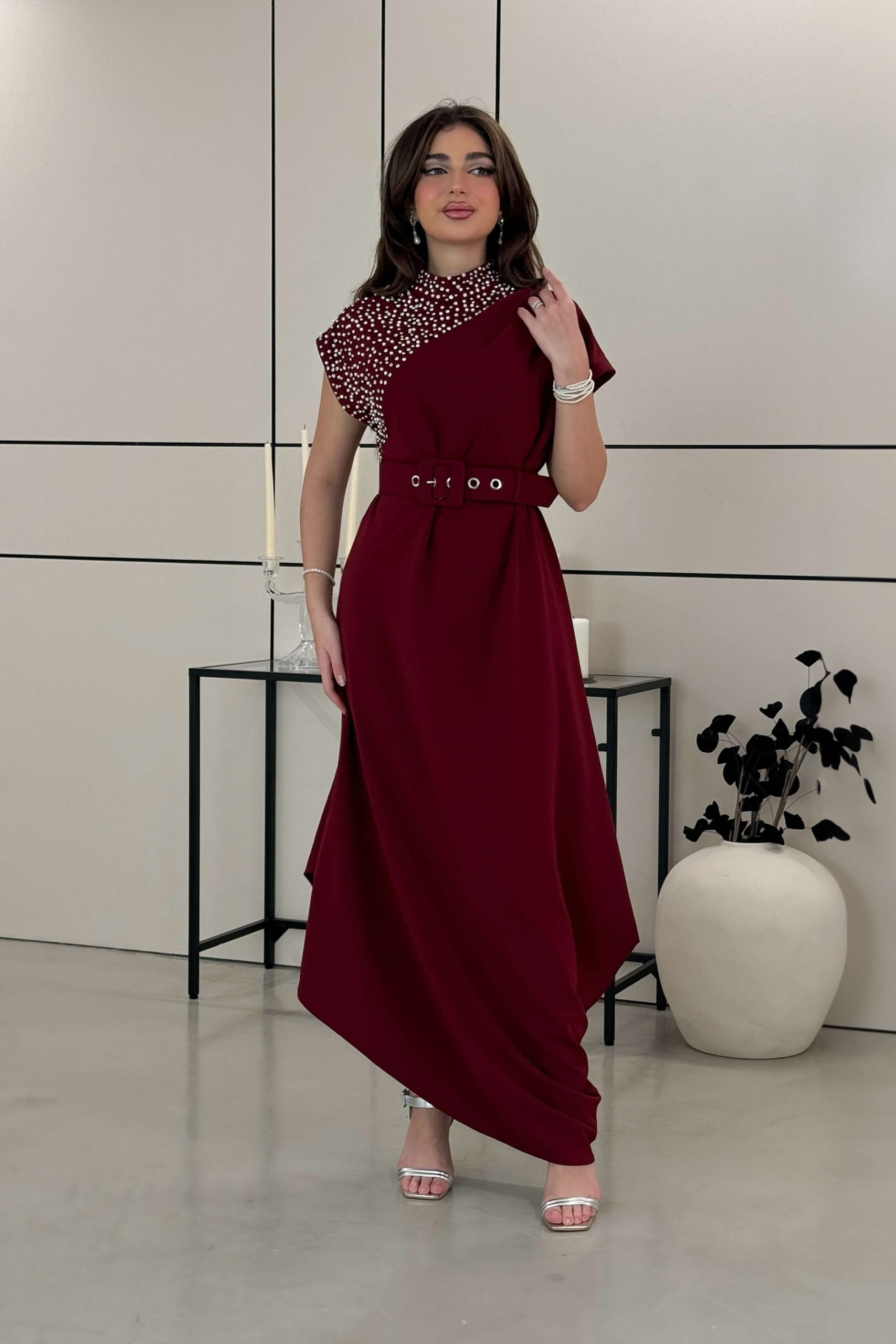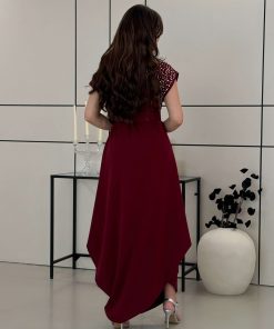اكتان – فستان عنابي سهرة غير متماثل الطول