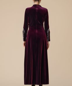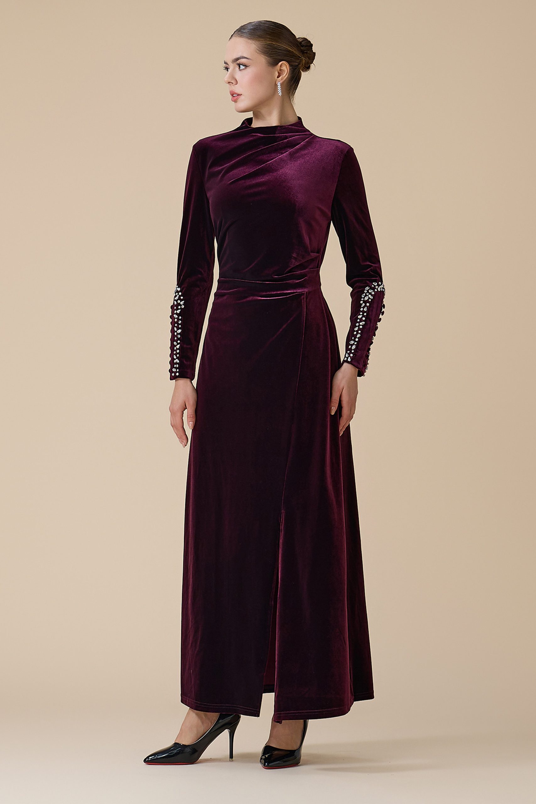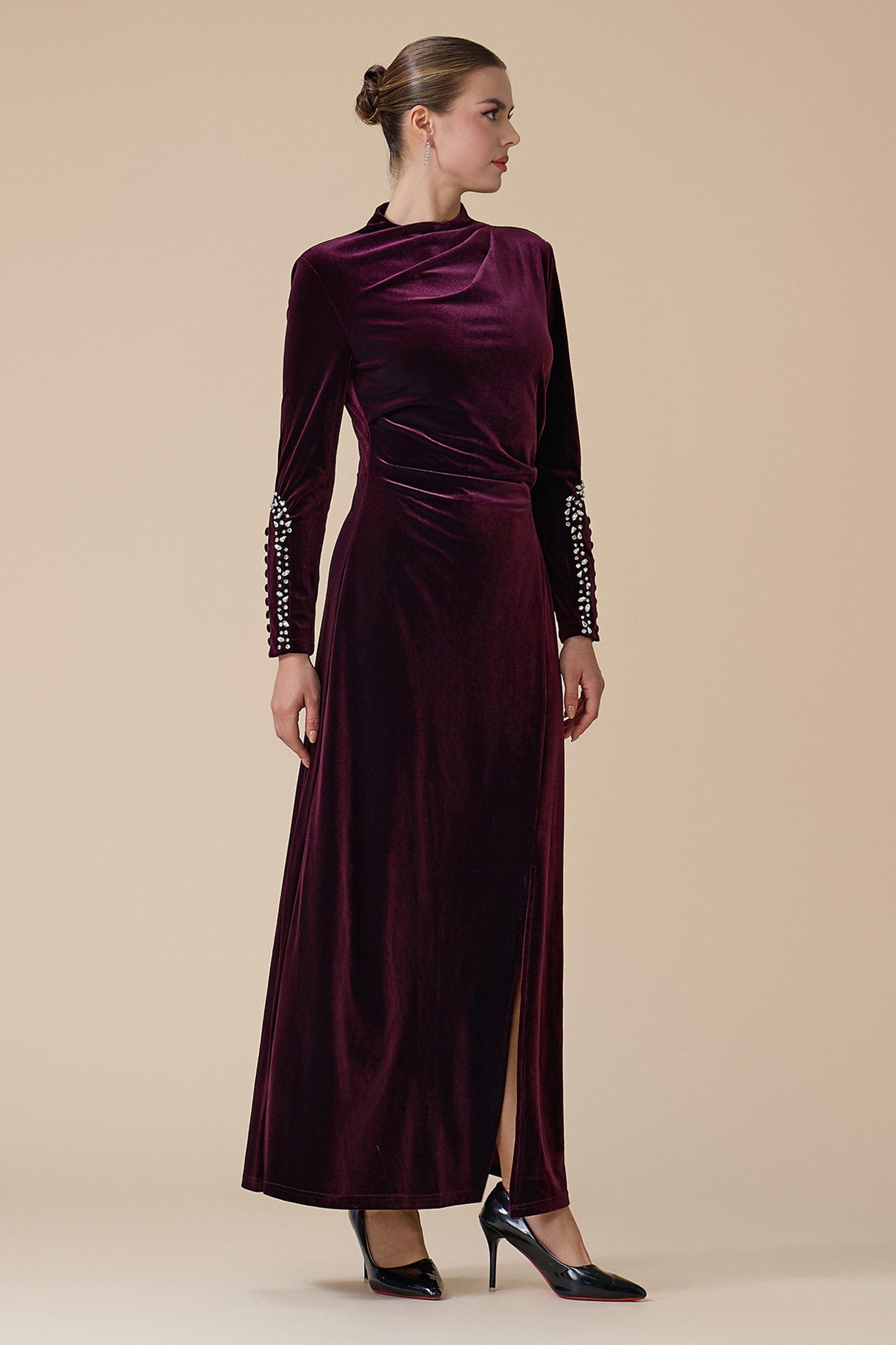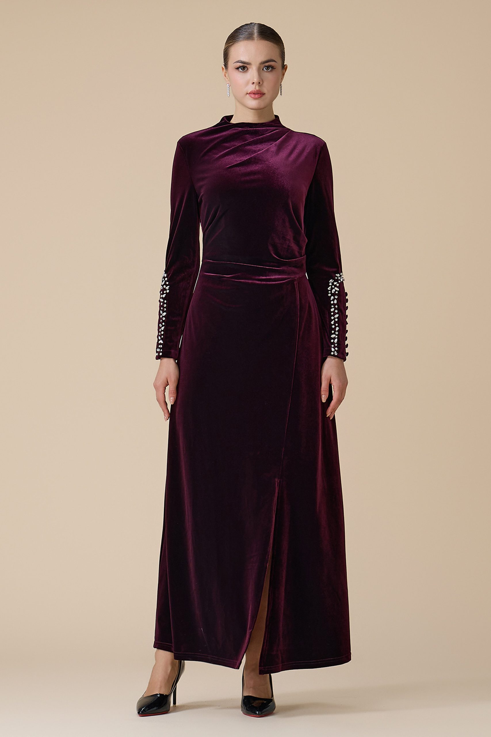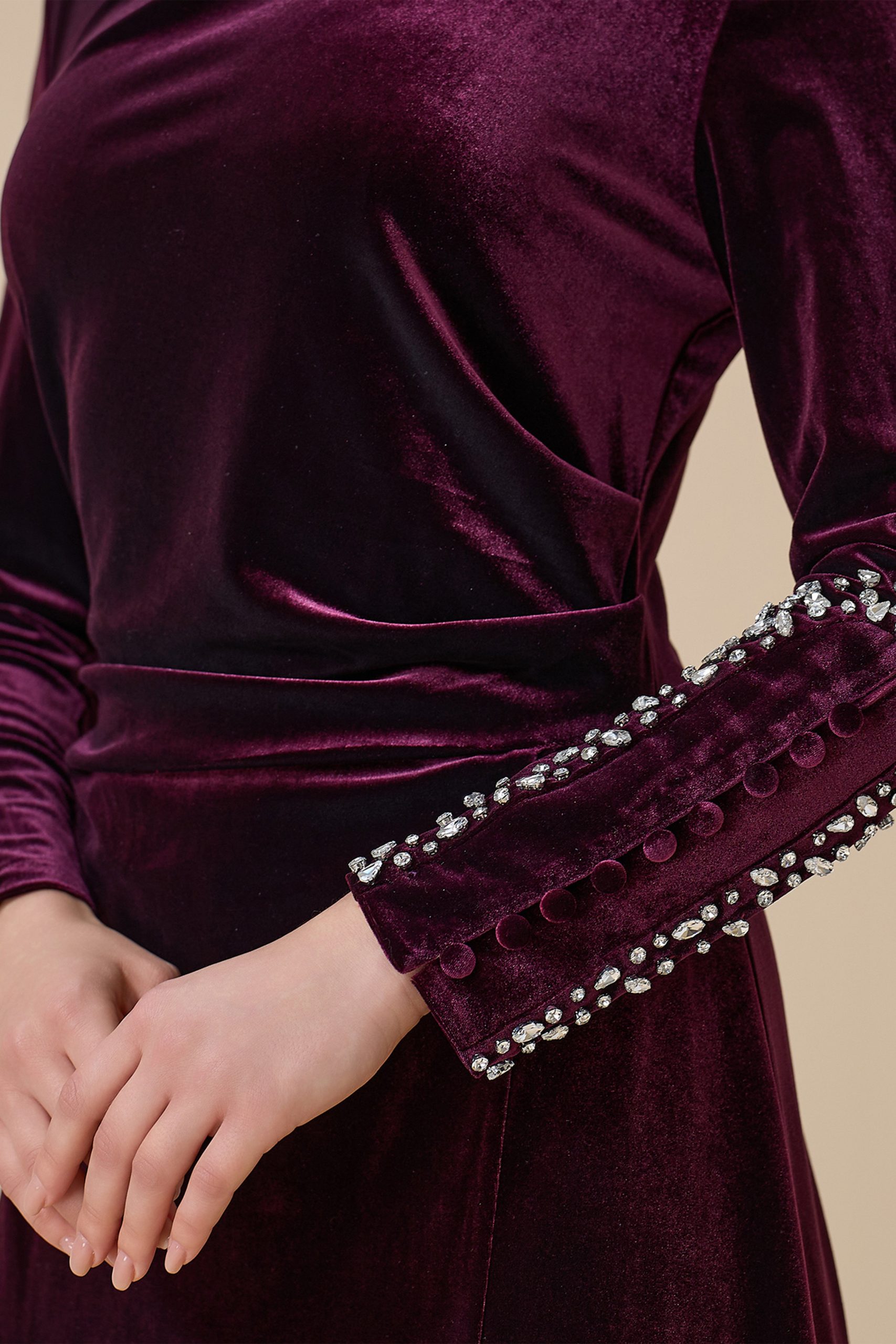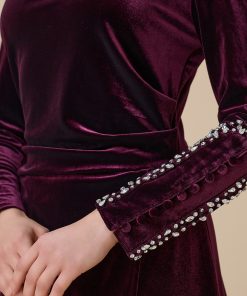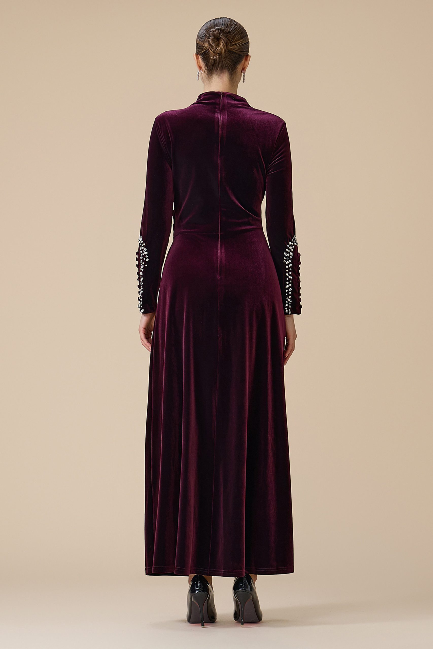 اكتان – فستان عنابي طويل مخمل بأكمام طويلة
