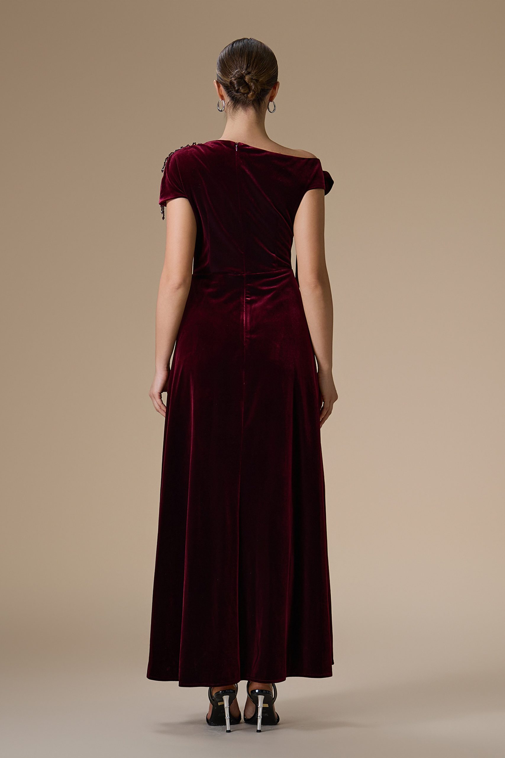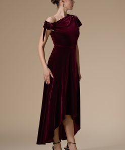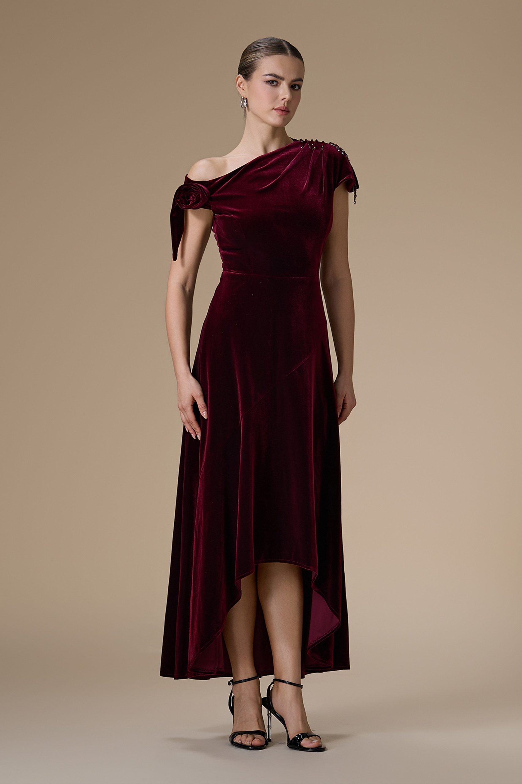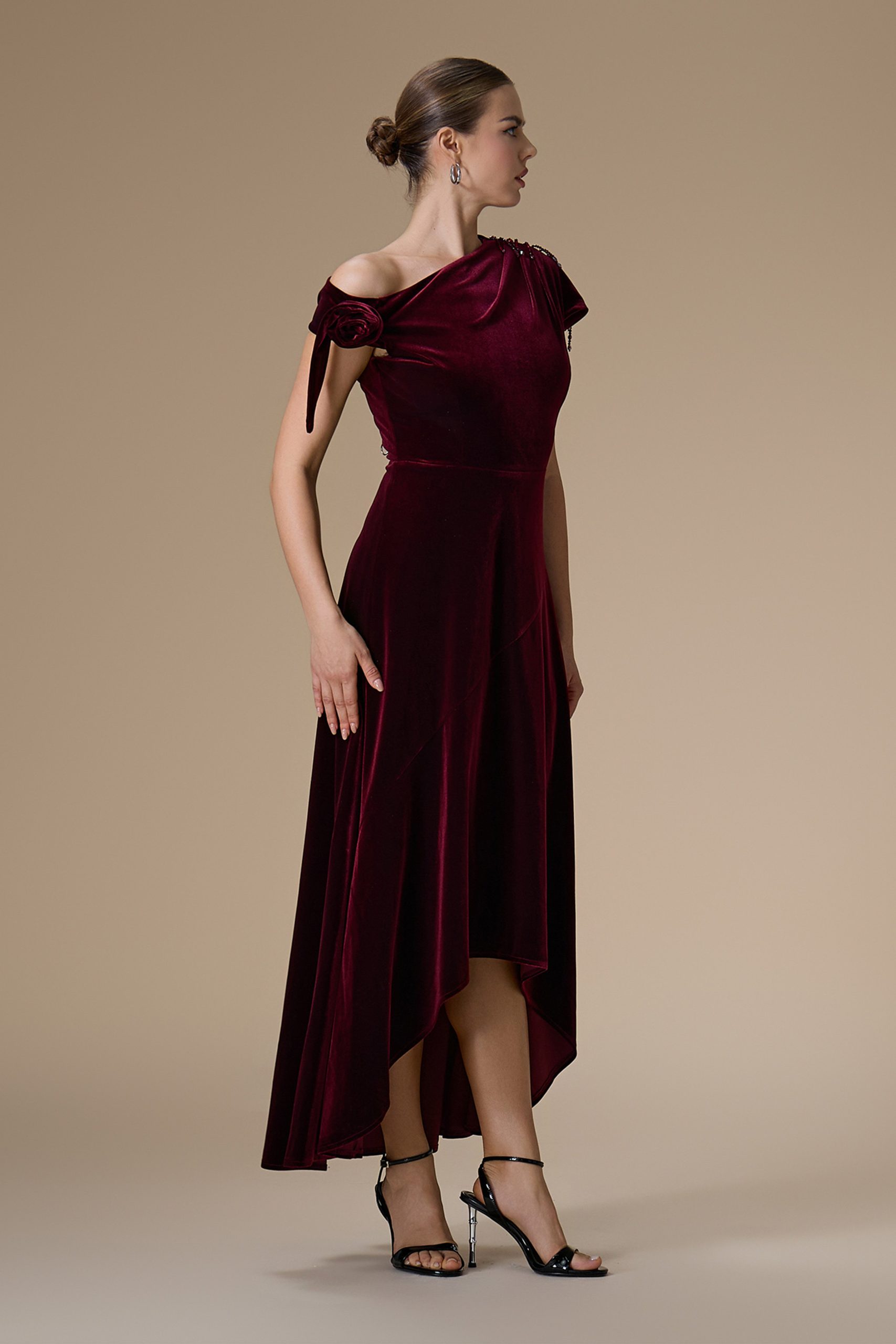 اكتان – فستان عودي ميدي مخمل بكتف واحد