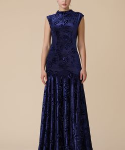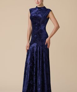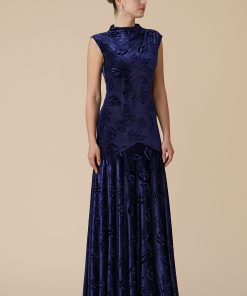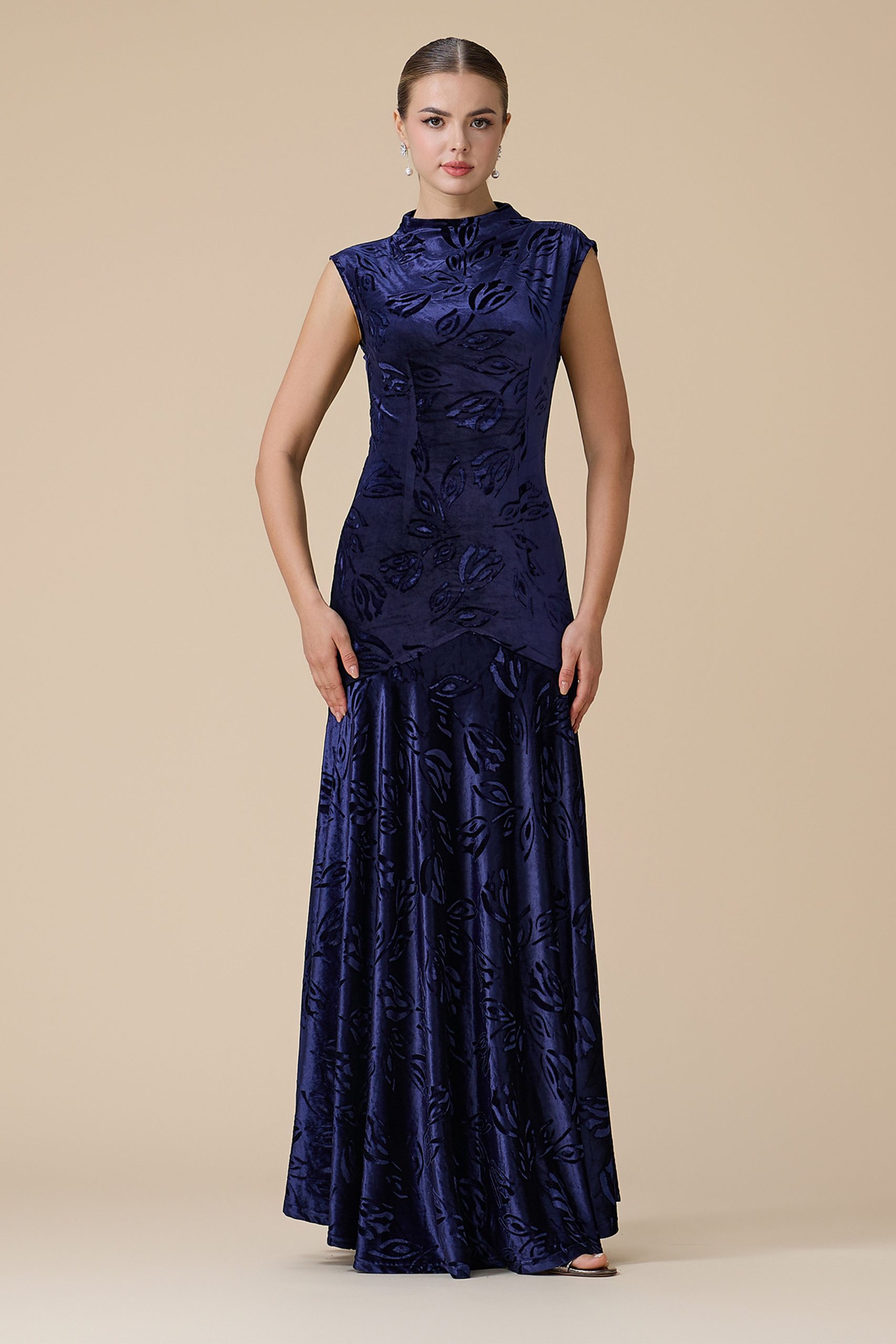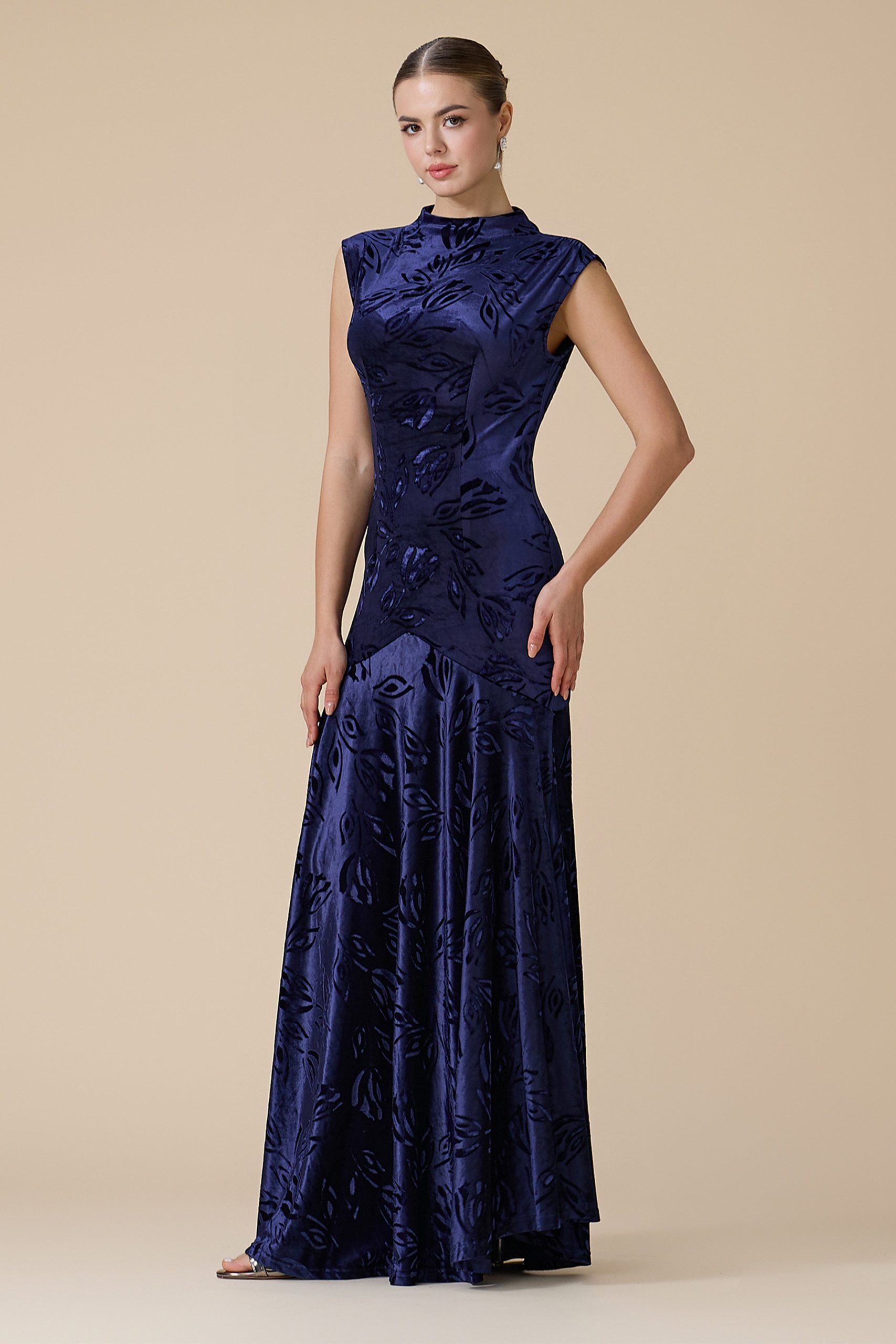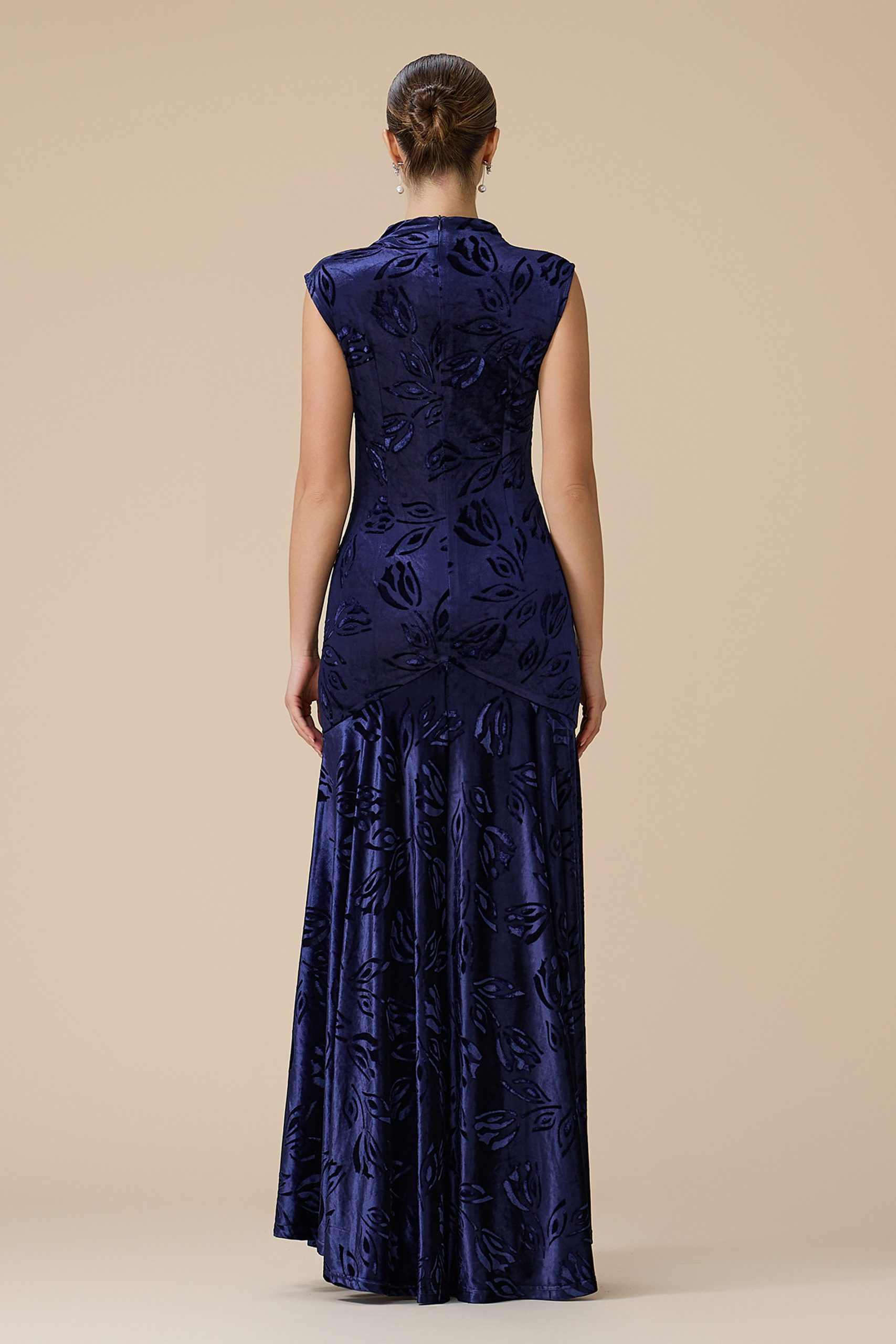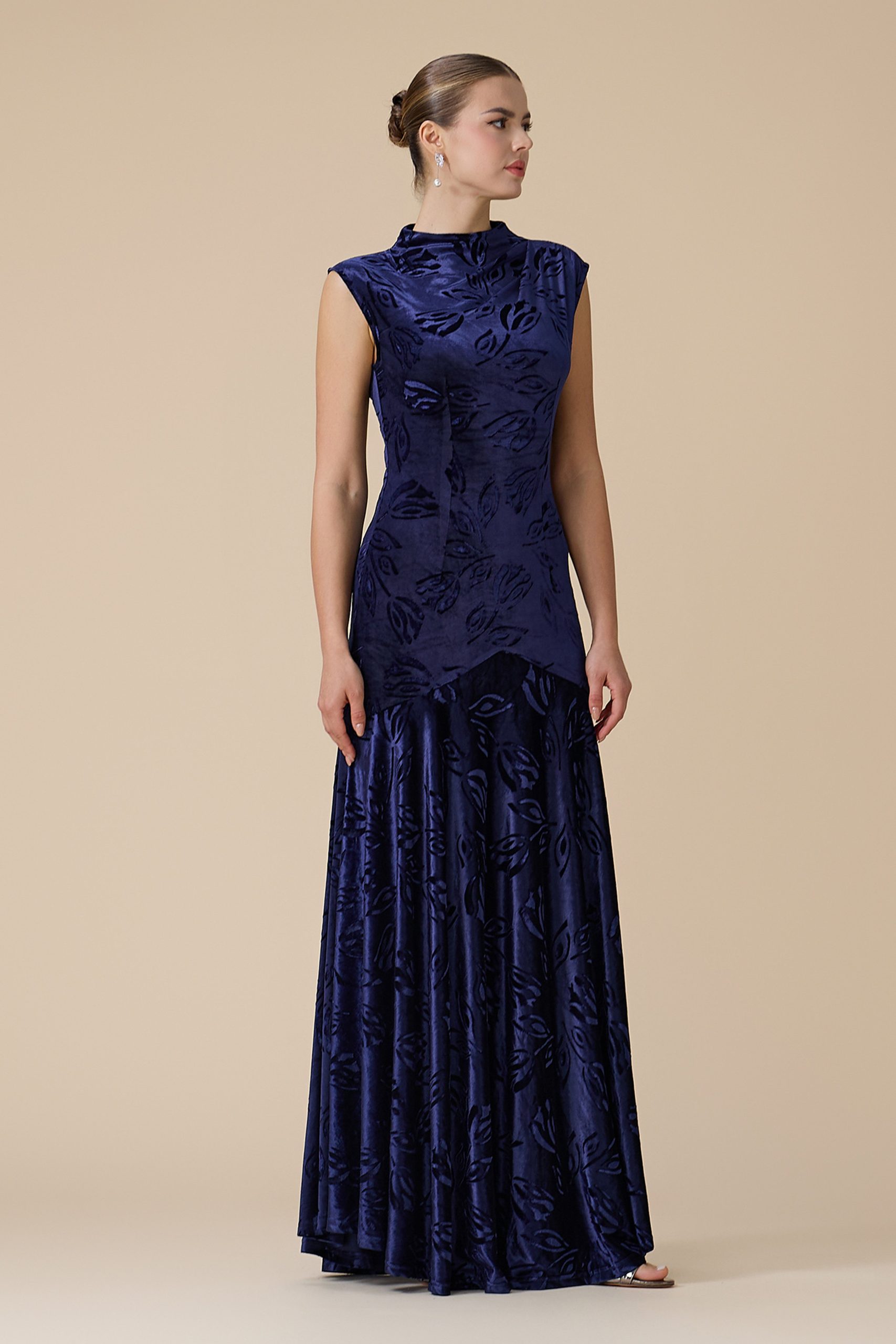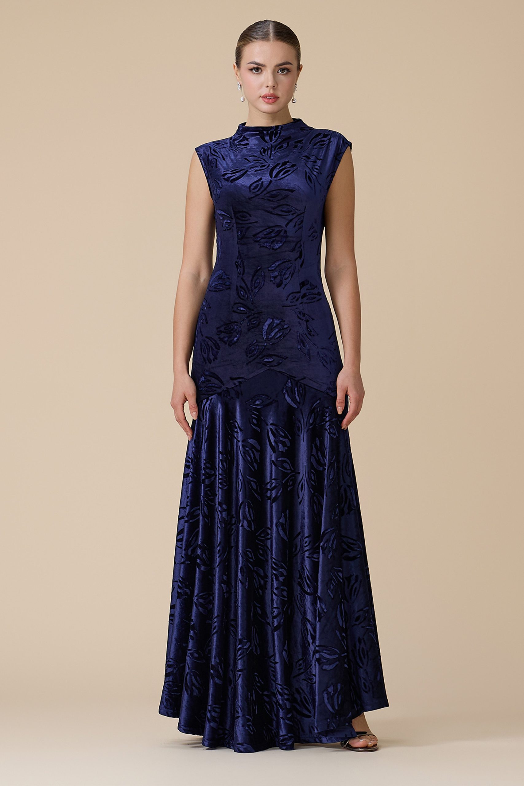 اكتان – فستان كحلي طويل مخملي بنقوش