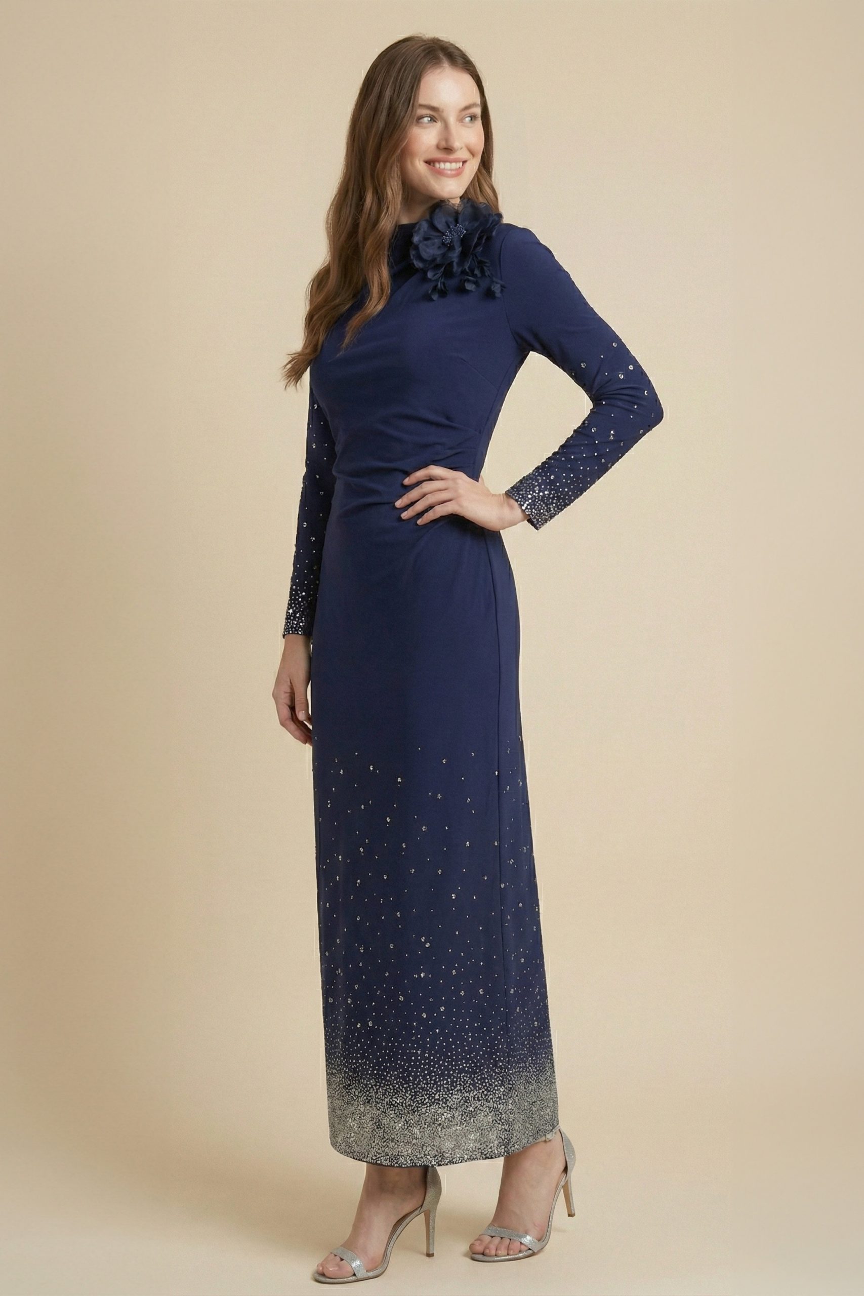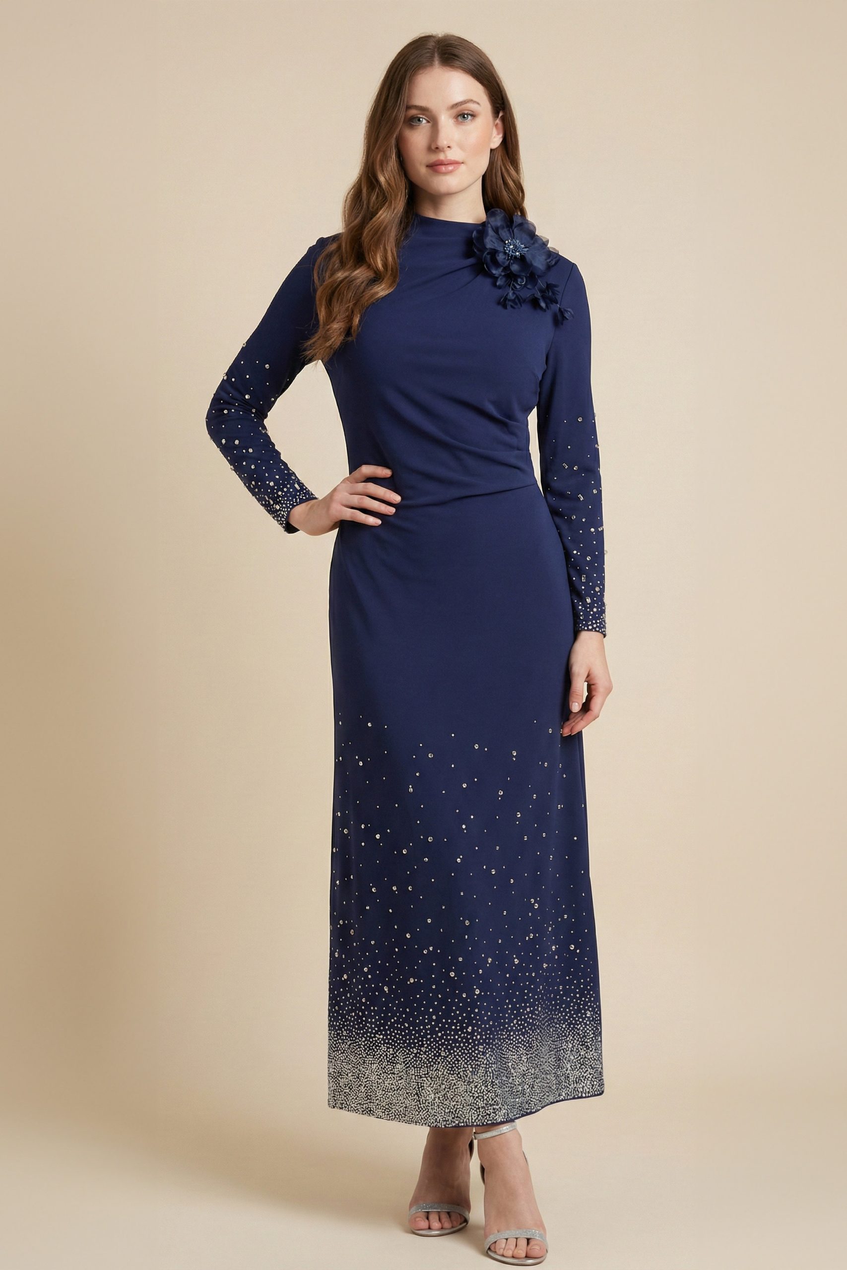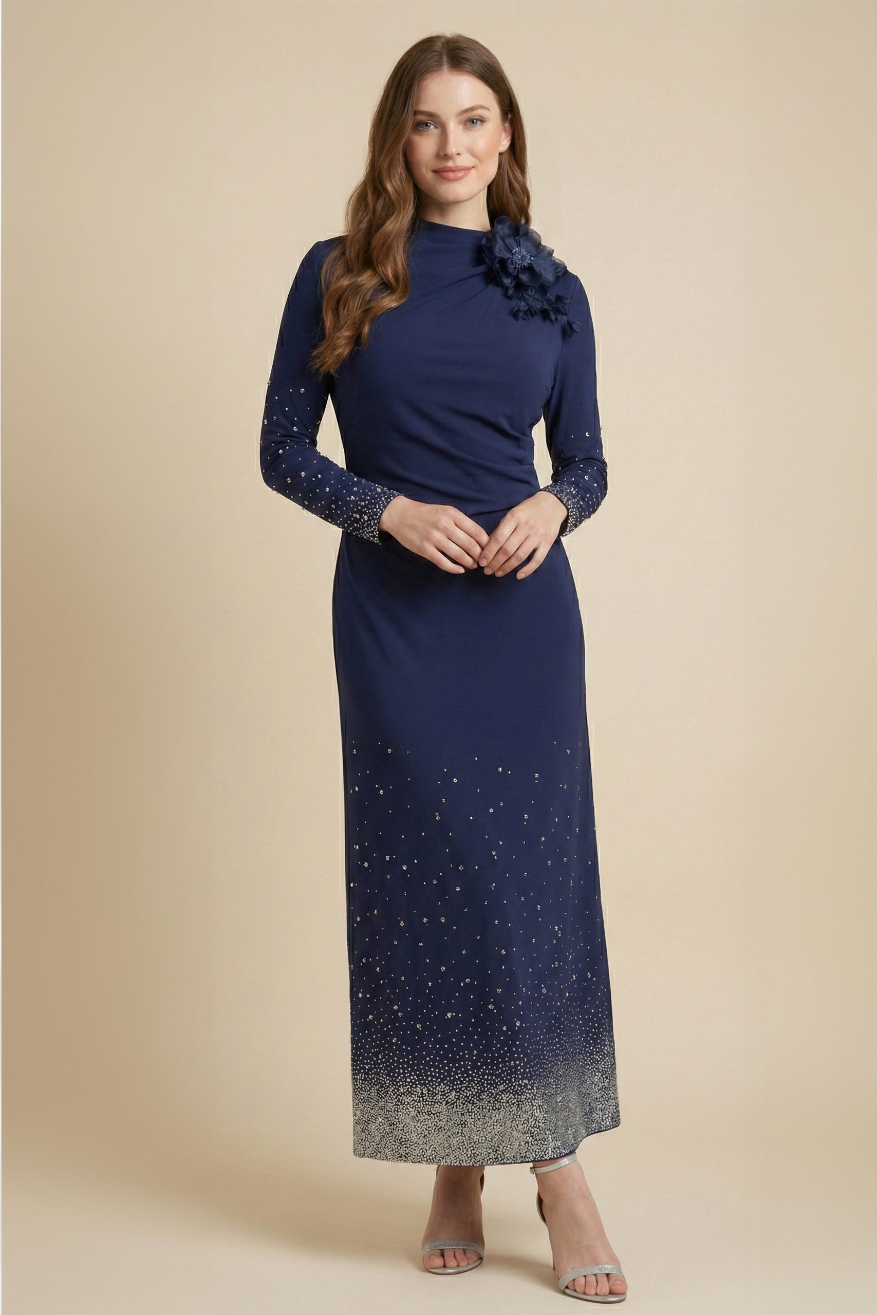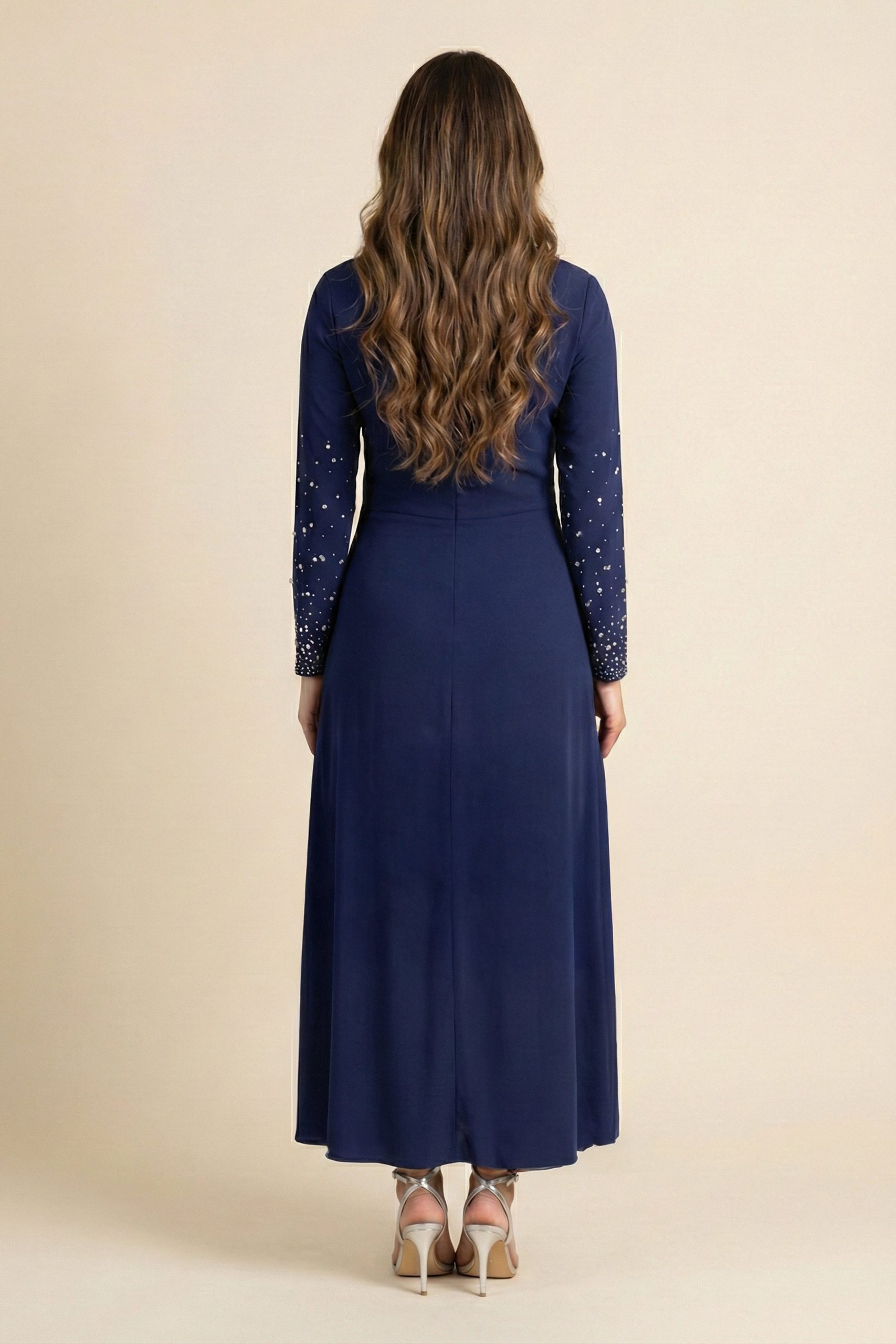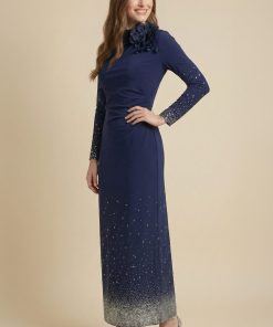 اكتان – فستان ماكسي بأطراف مزينة بفصوص لون كحلي