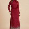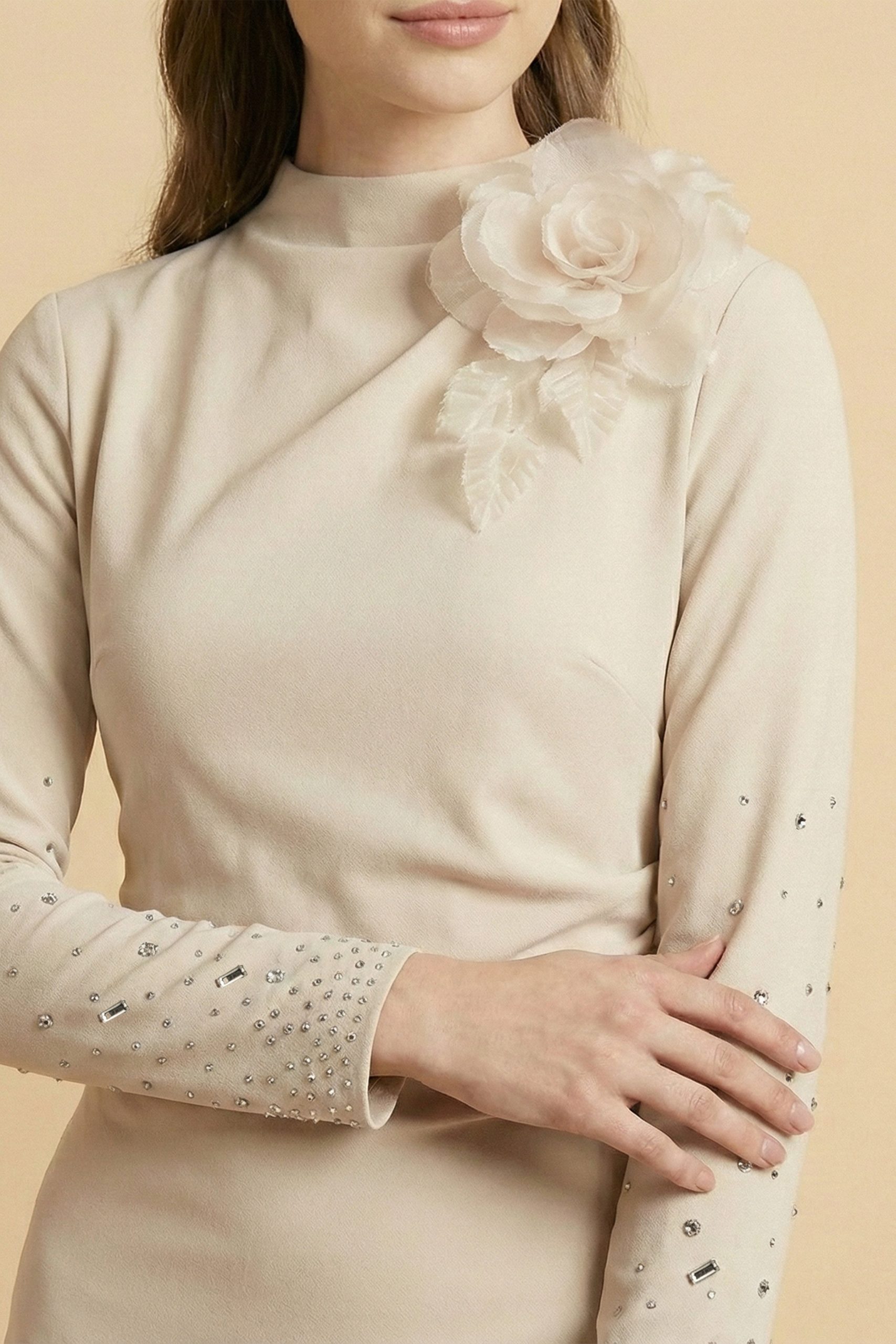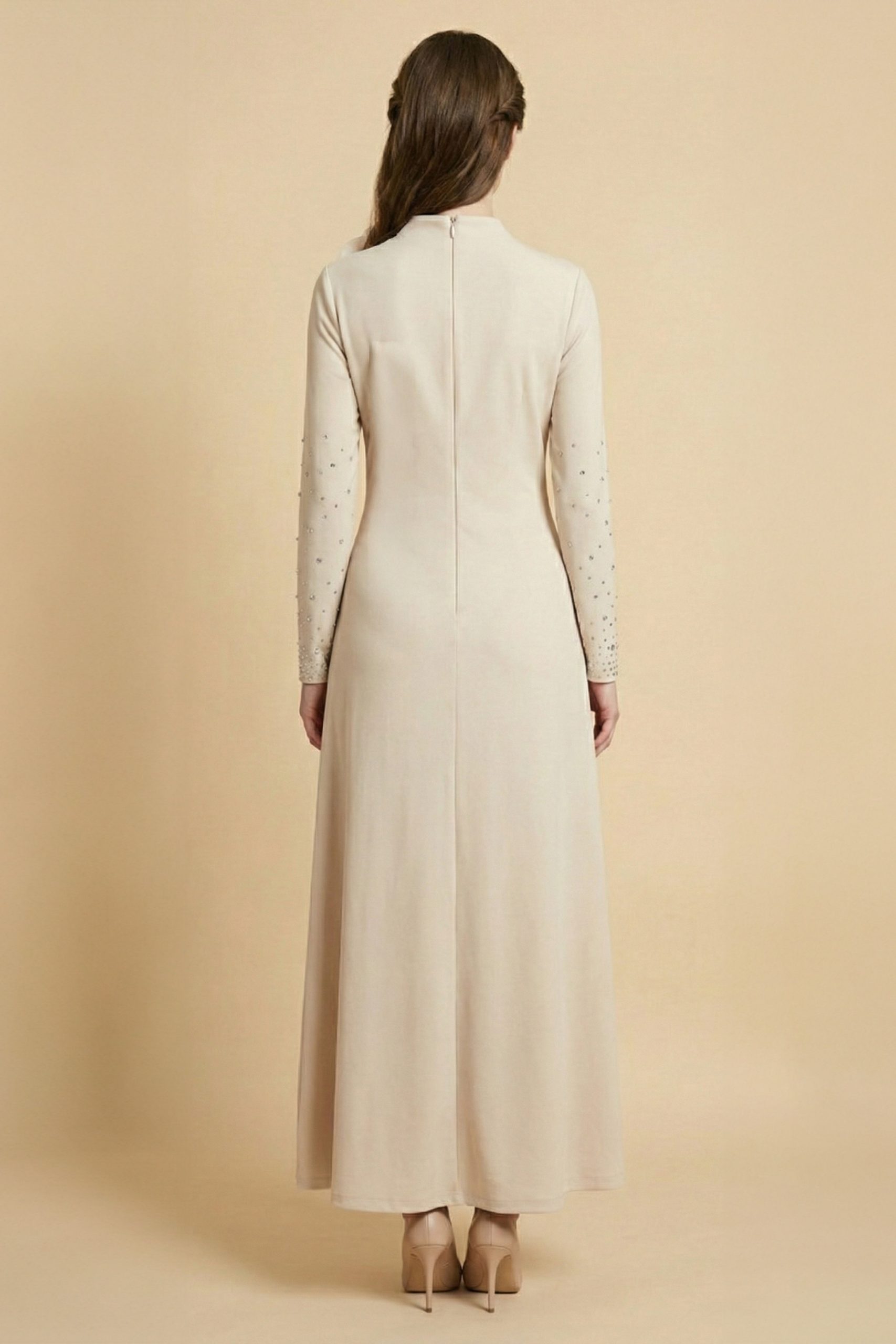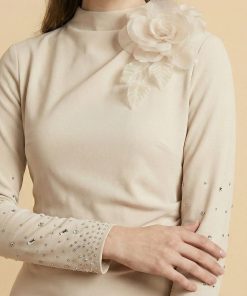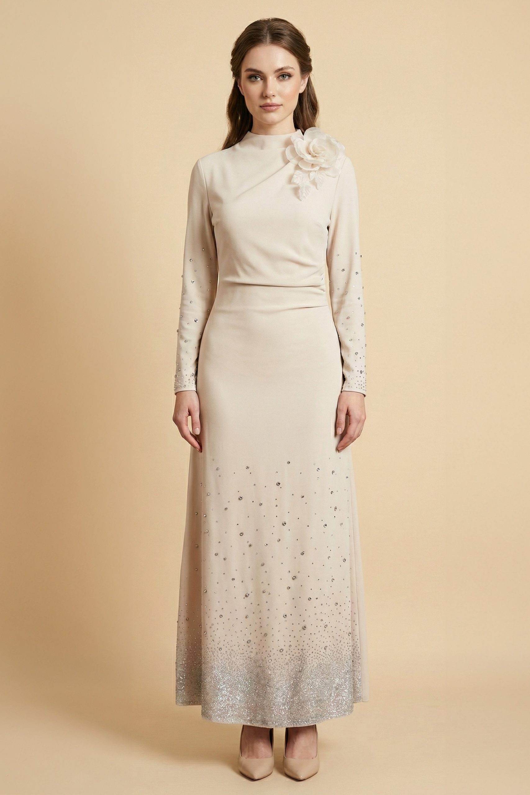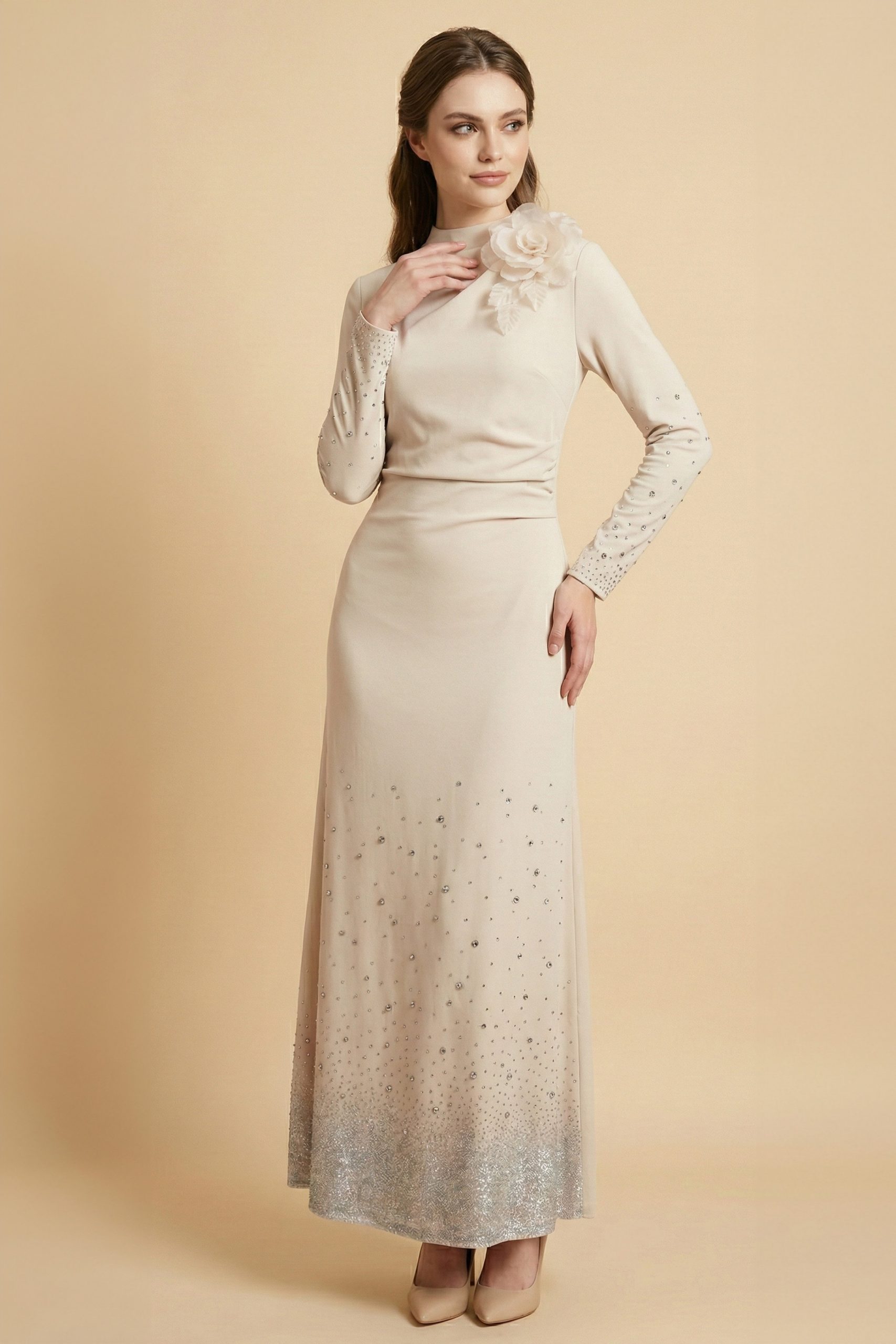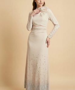 اكتان – فستان ماكسي بأطراف مزينة بفصوص لون بيج