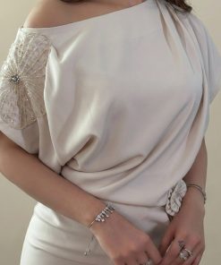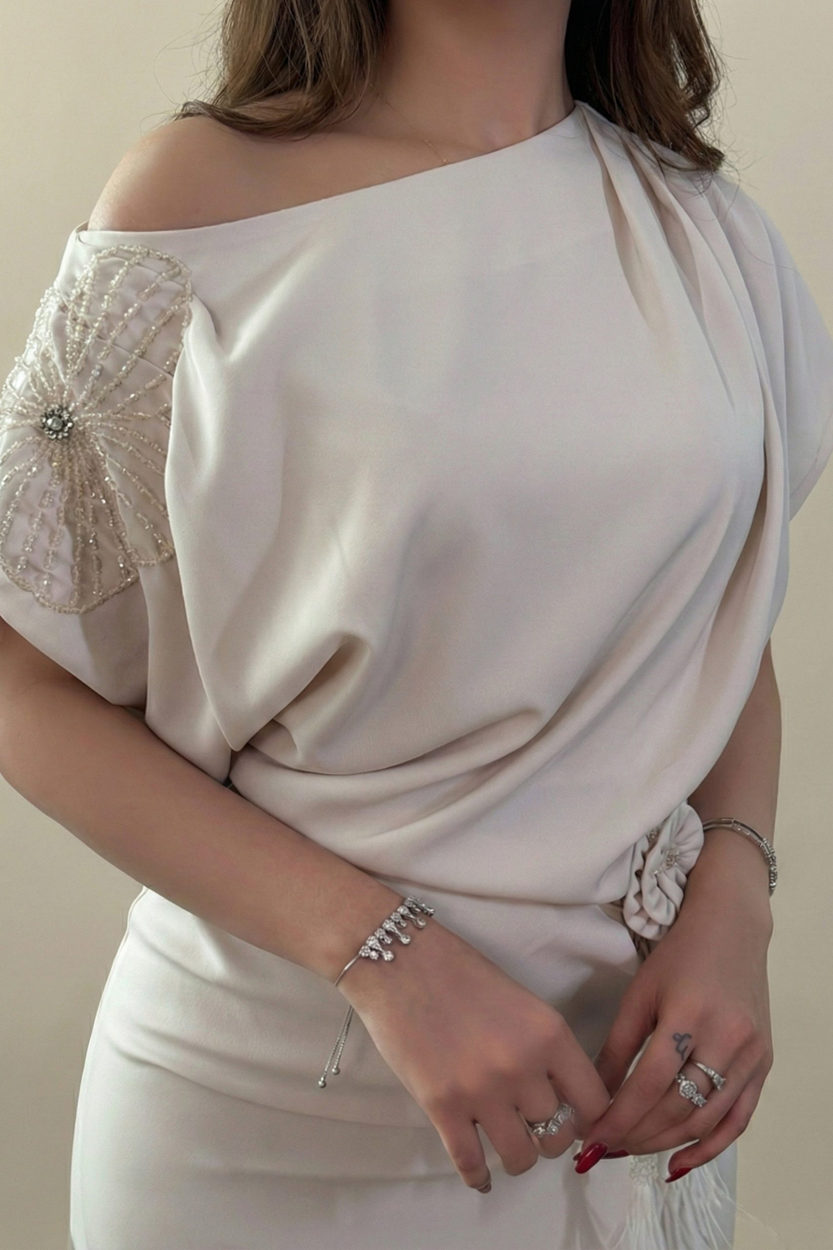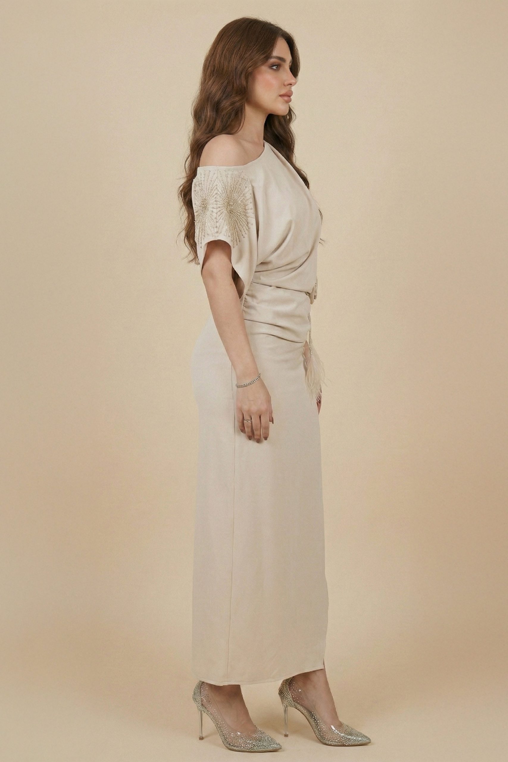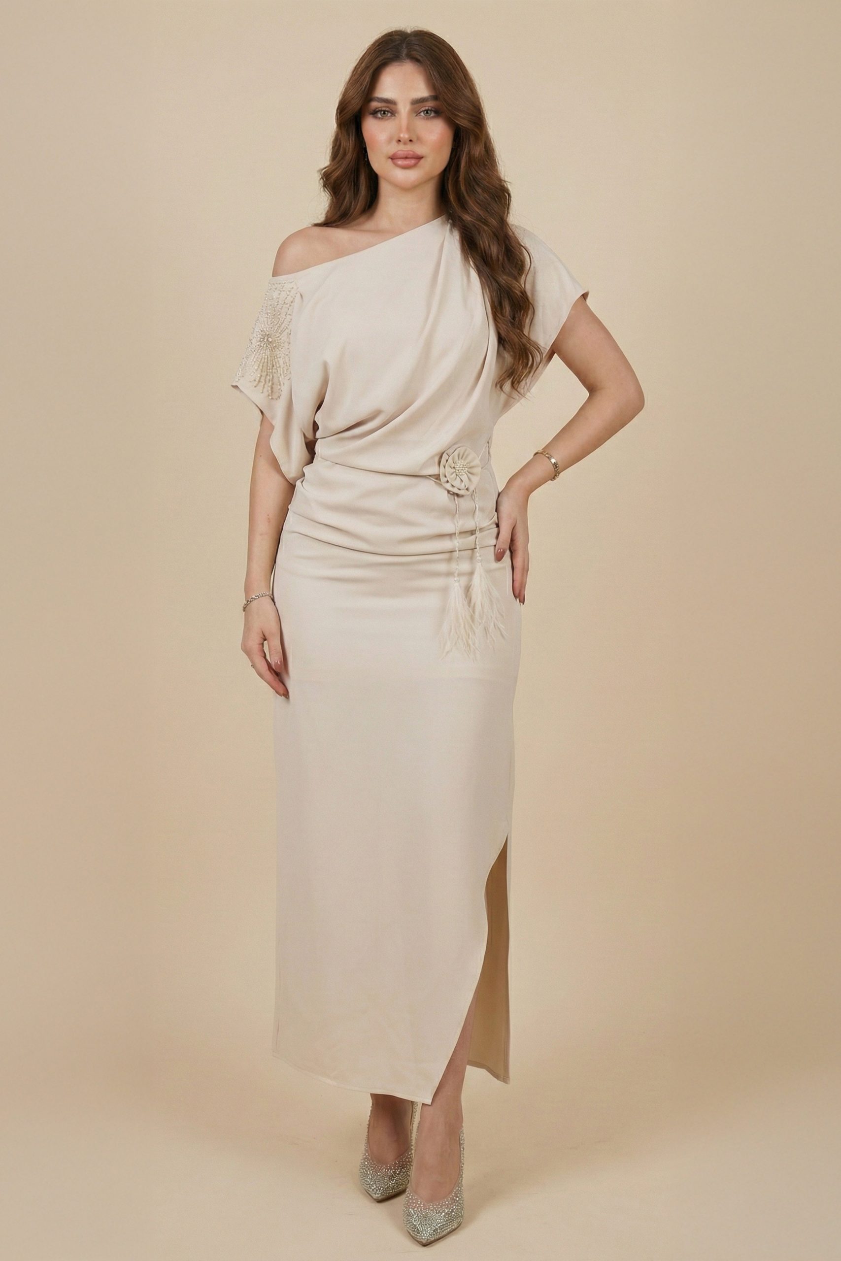 اكتان – فستان ماكسي بكتف مزين بورد لون بيج