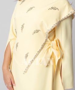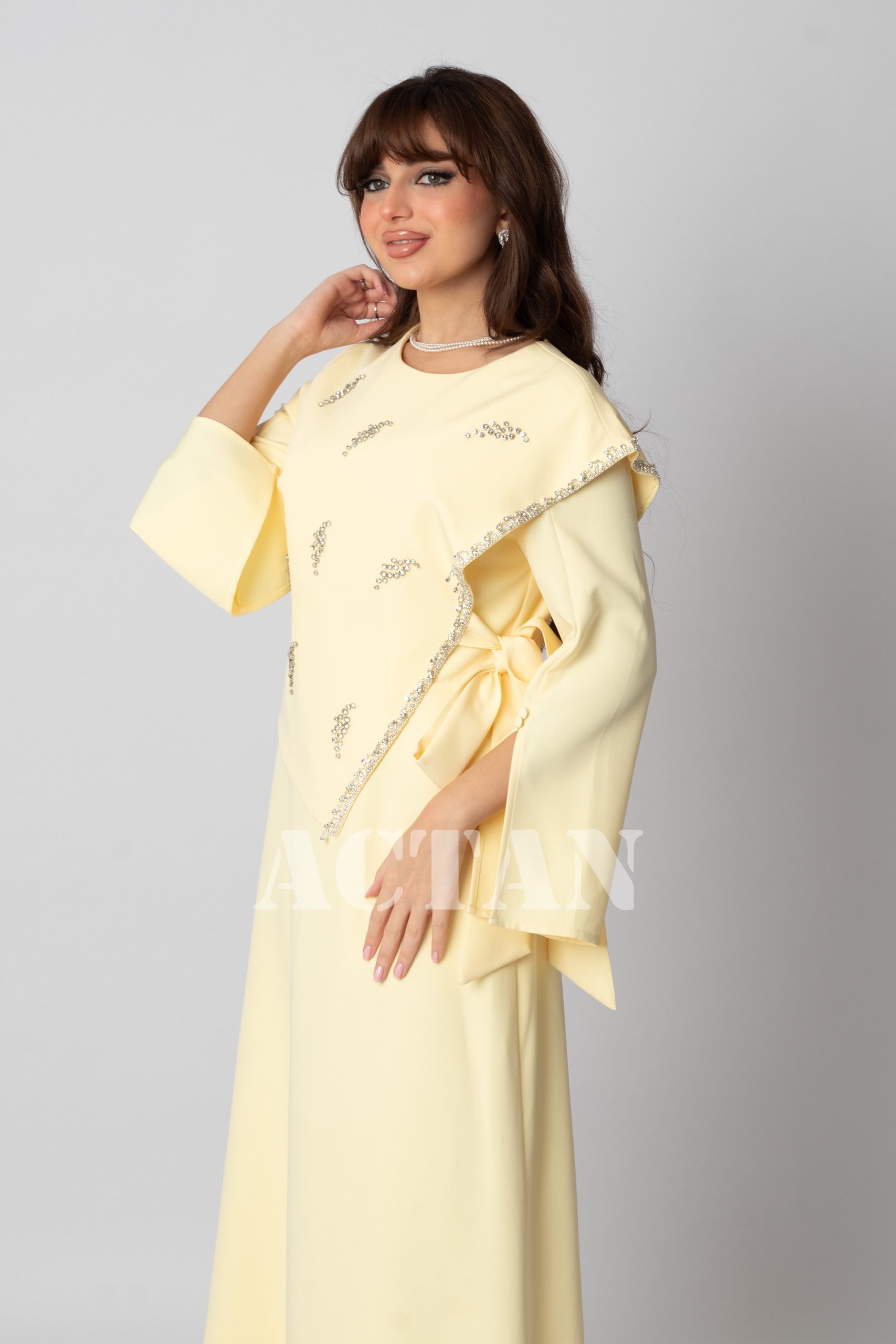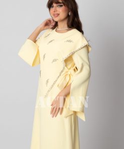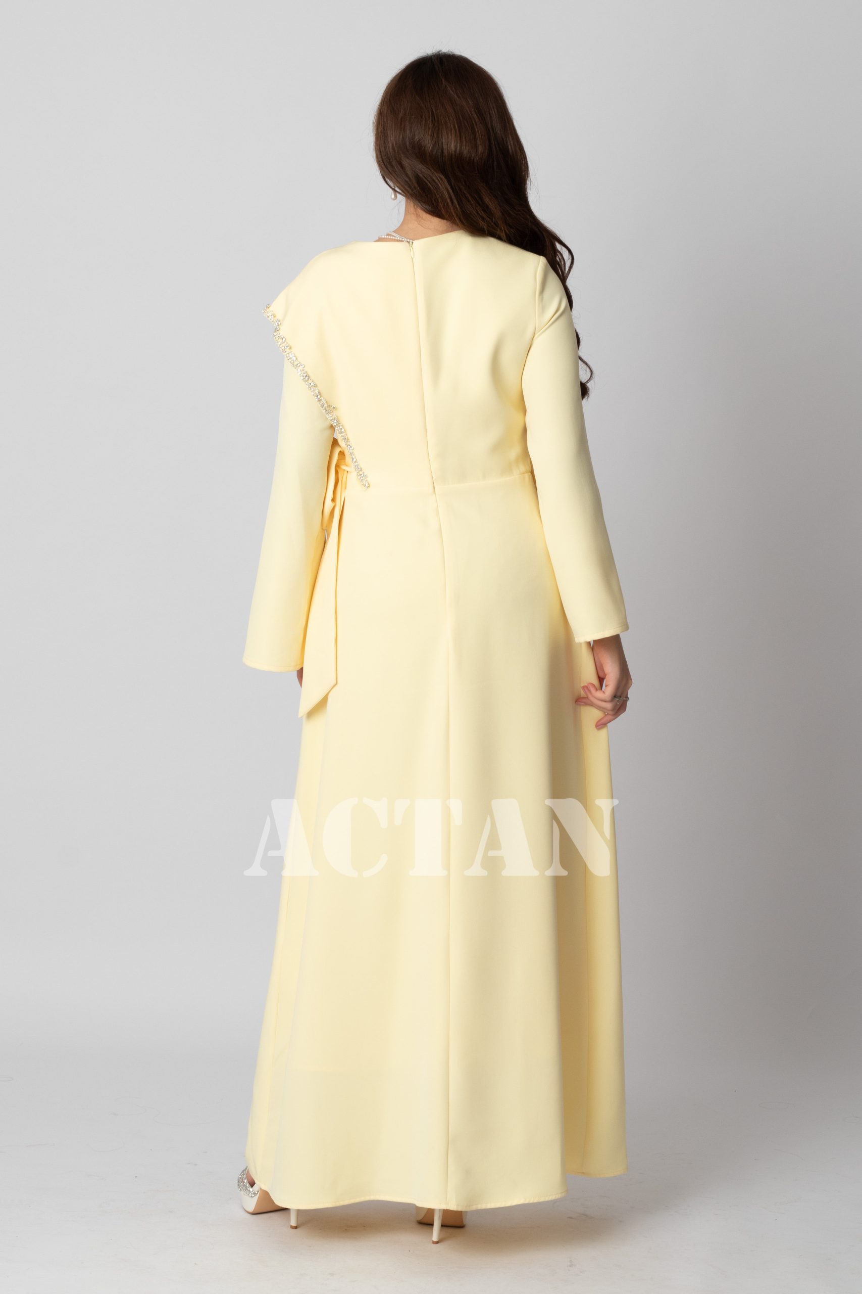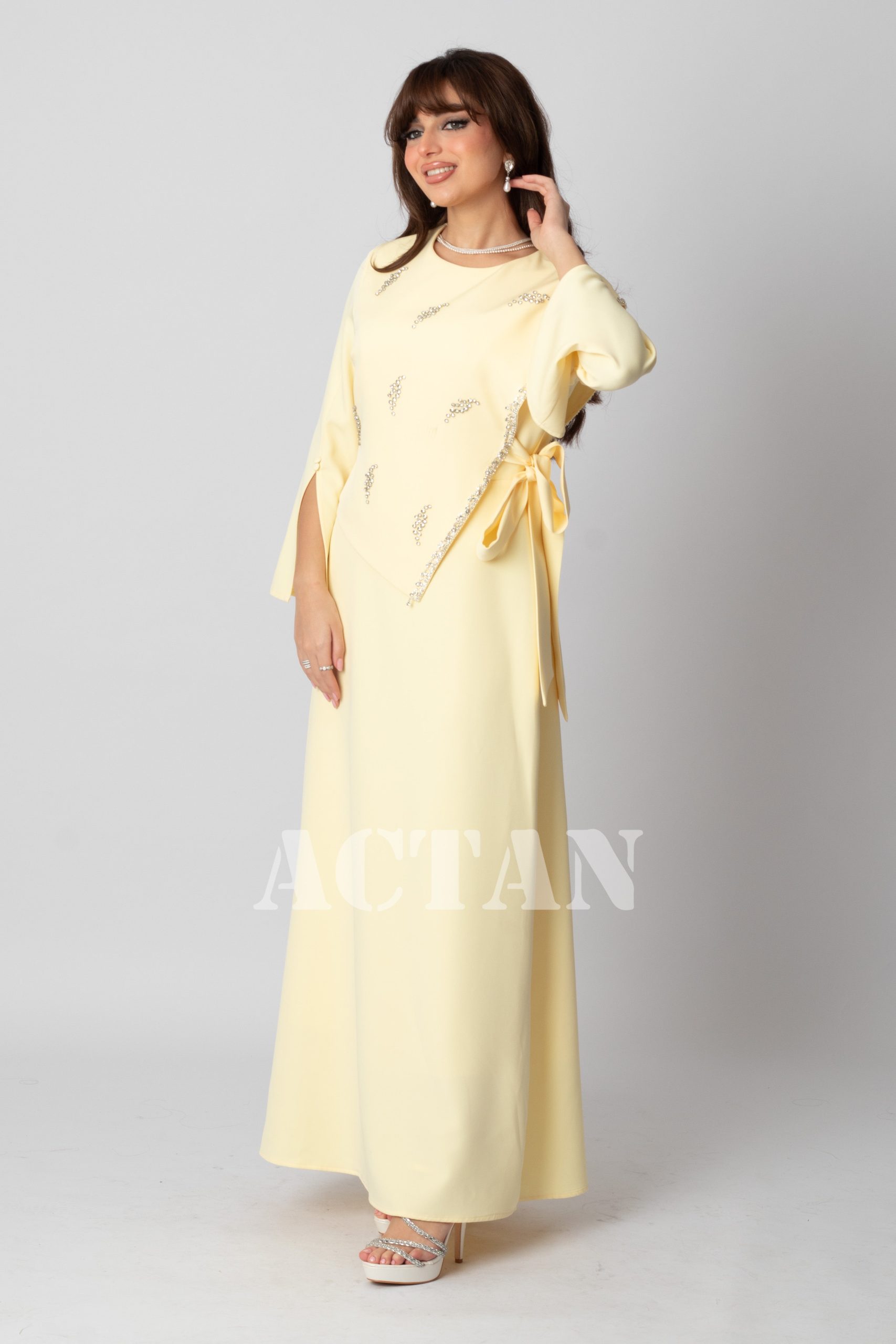 اكتان – فستان ماكسي مزين بكريستال ورباط من الخصر لون اصفر فاتح
