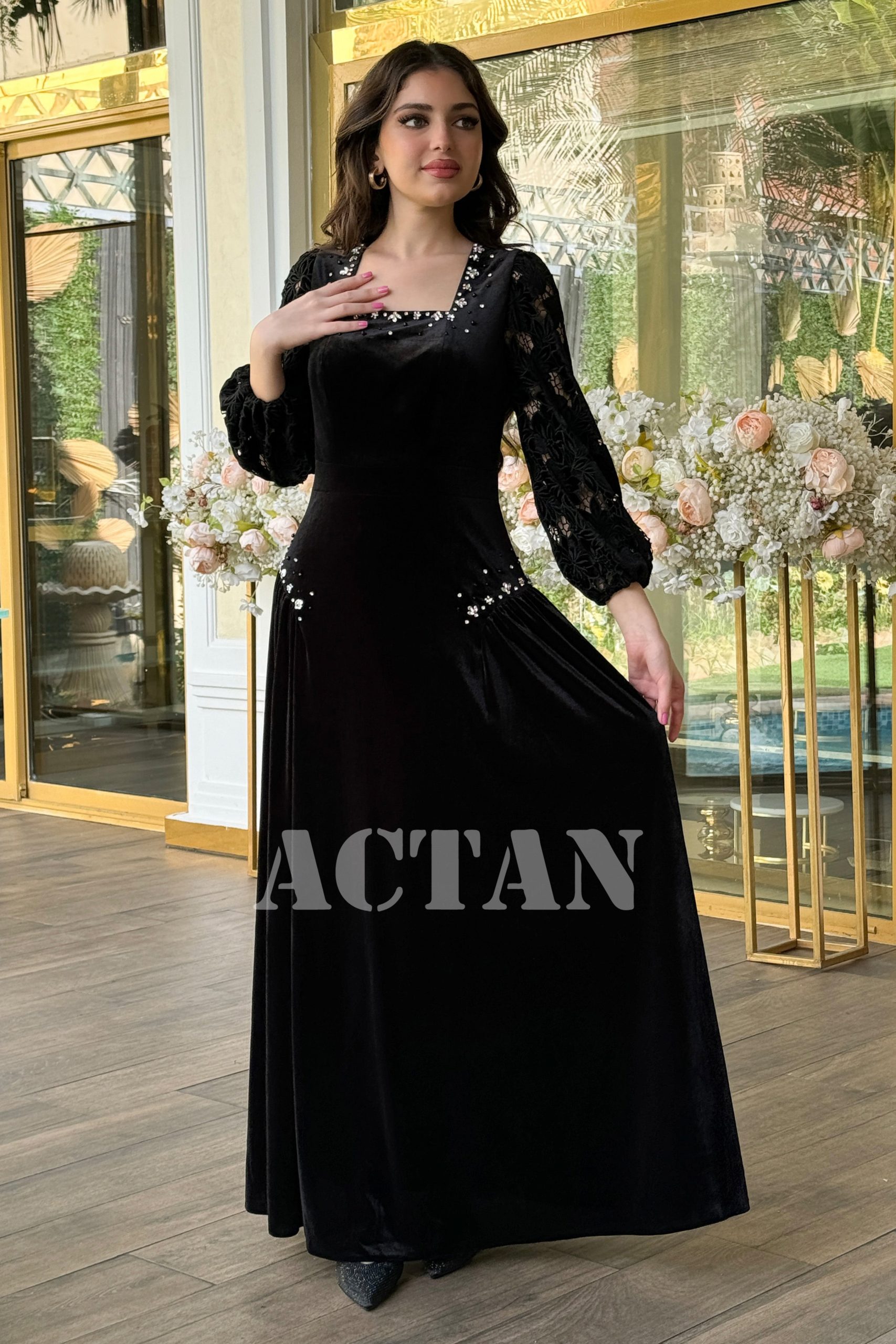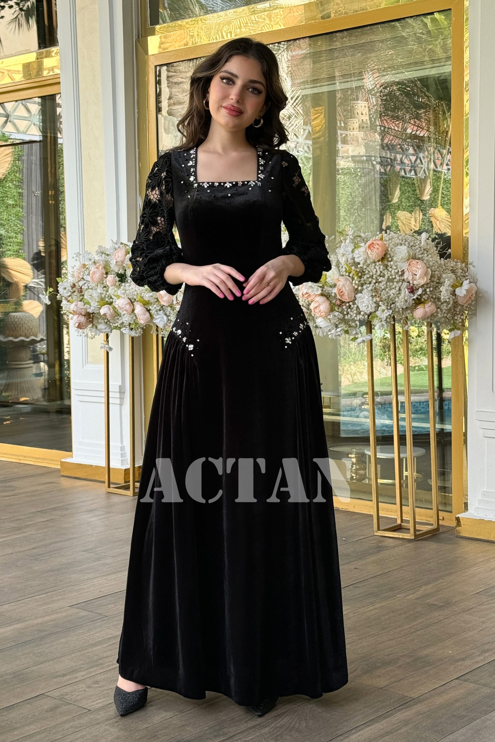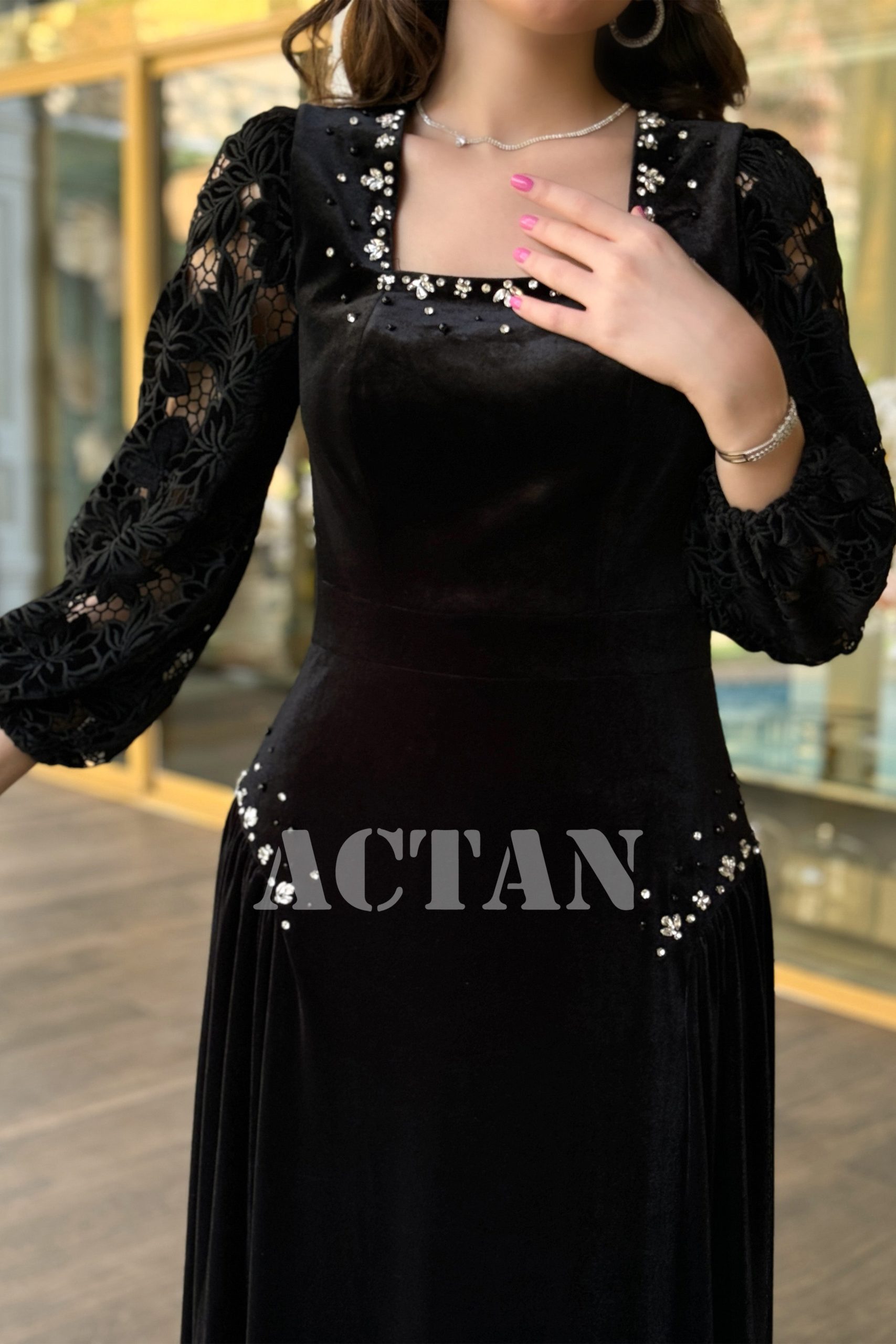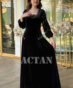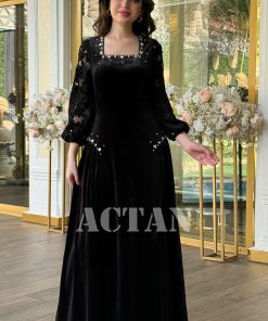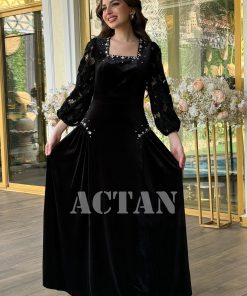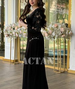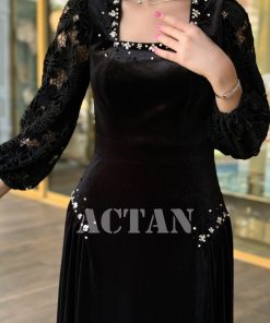 اكتان – فستان مخملي بأكمام جوبير مزين بالكريستال لون اسود