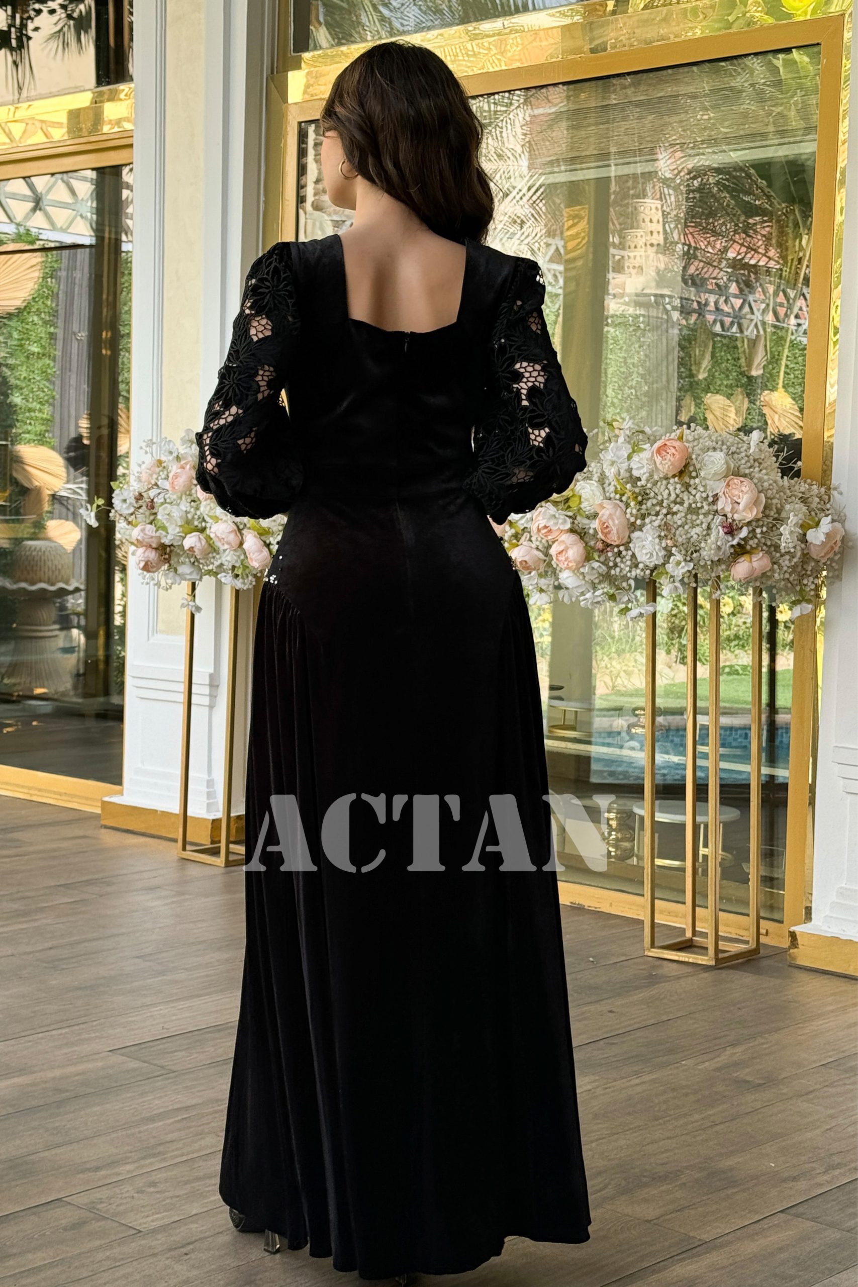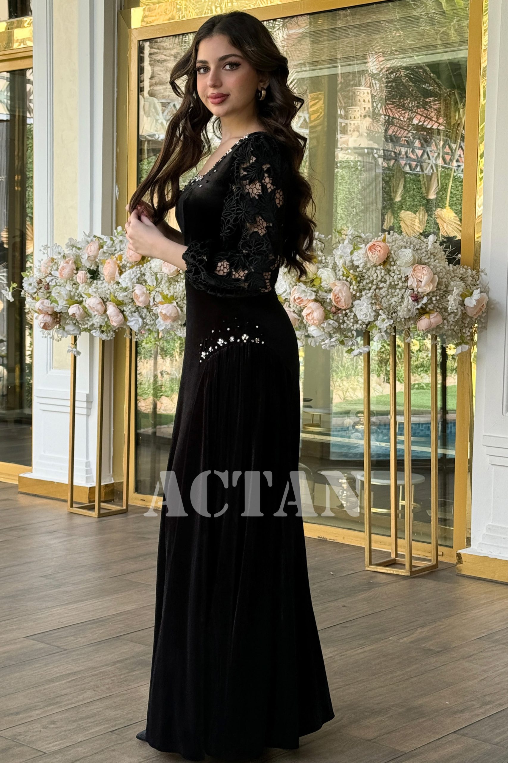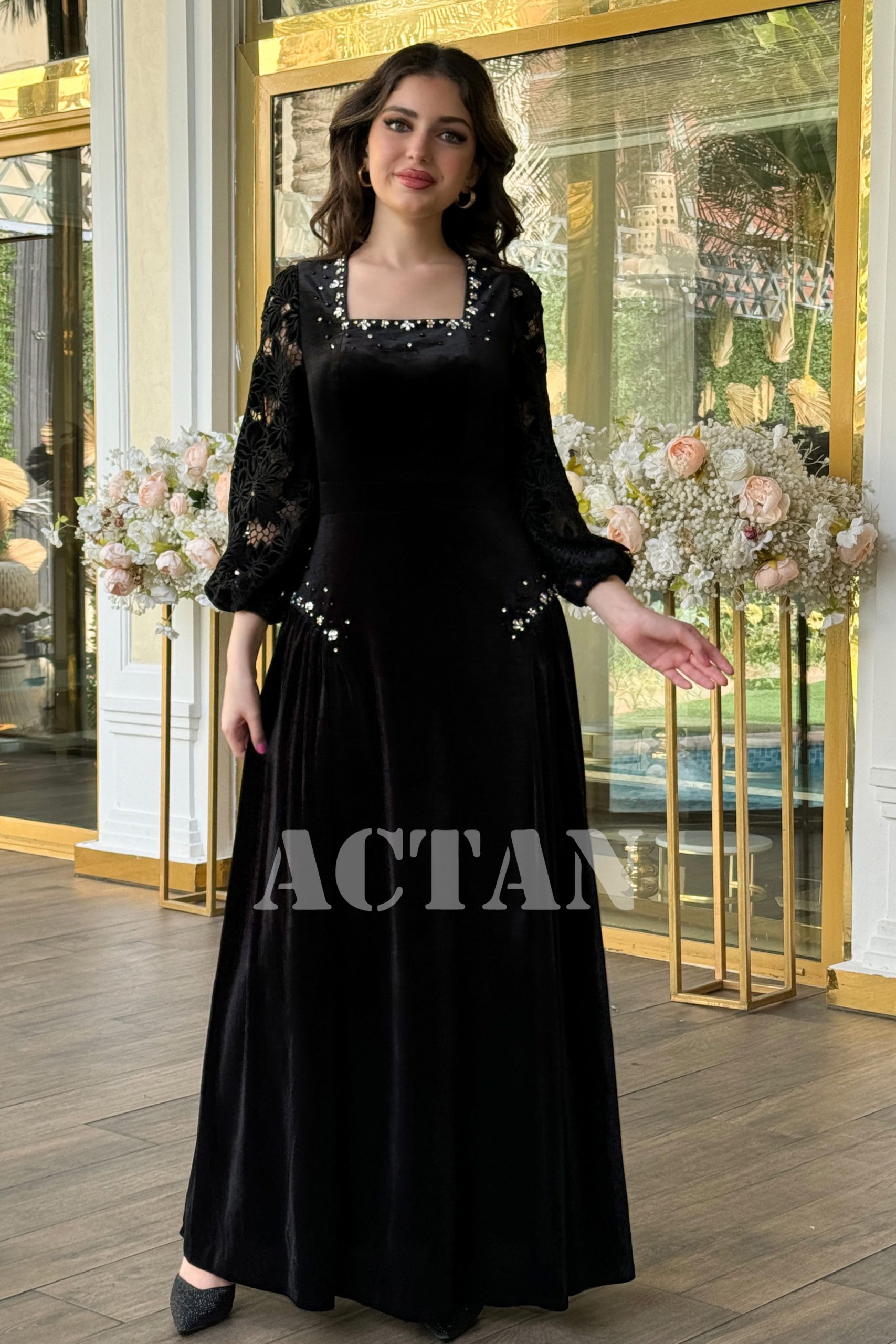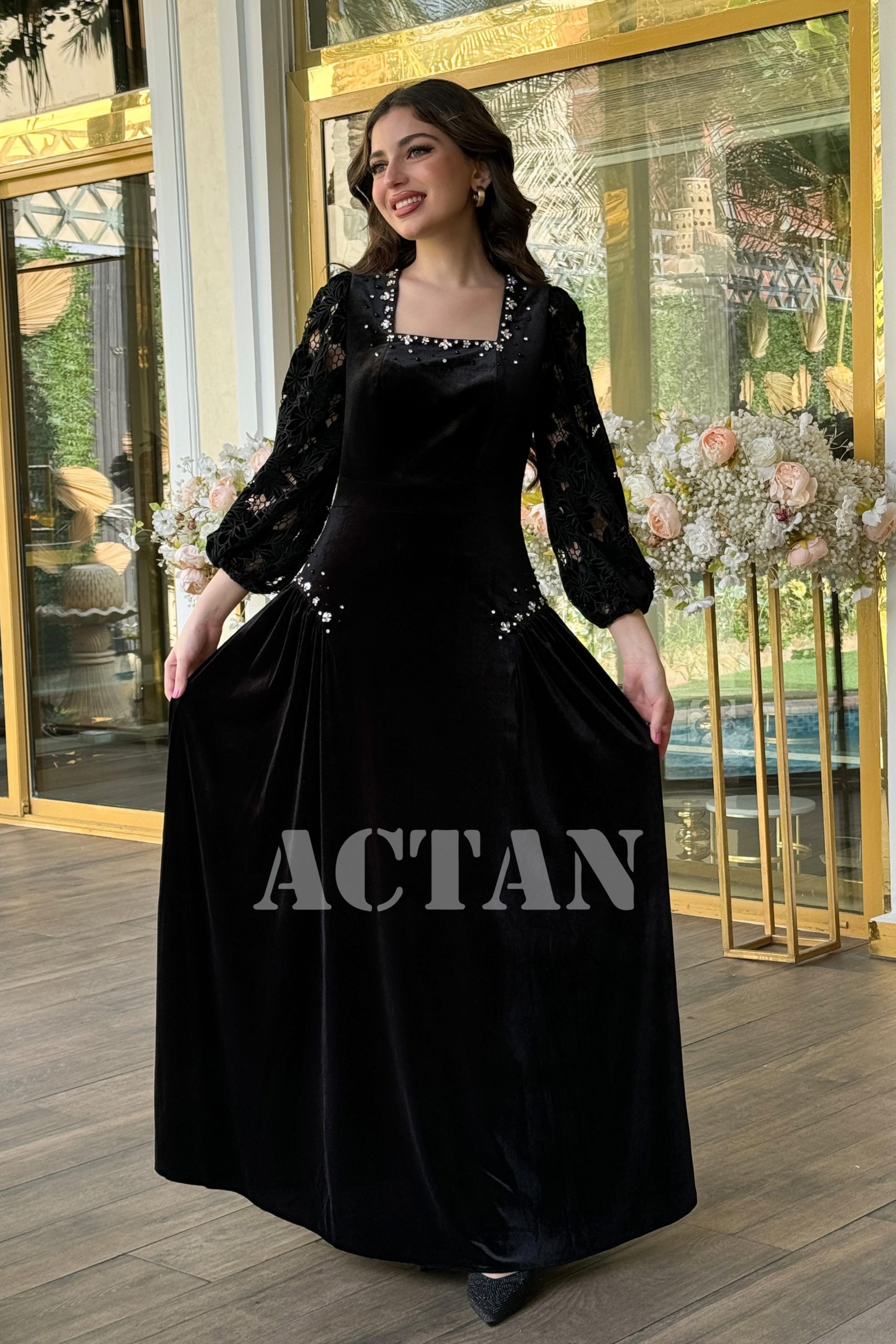 اكتان – فستان مخملي بأكمام جوبير مزين بالكريستال لون اسود