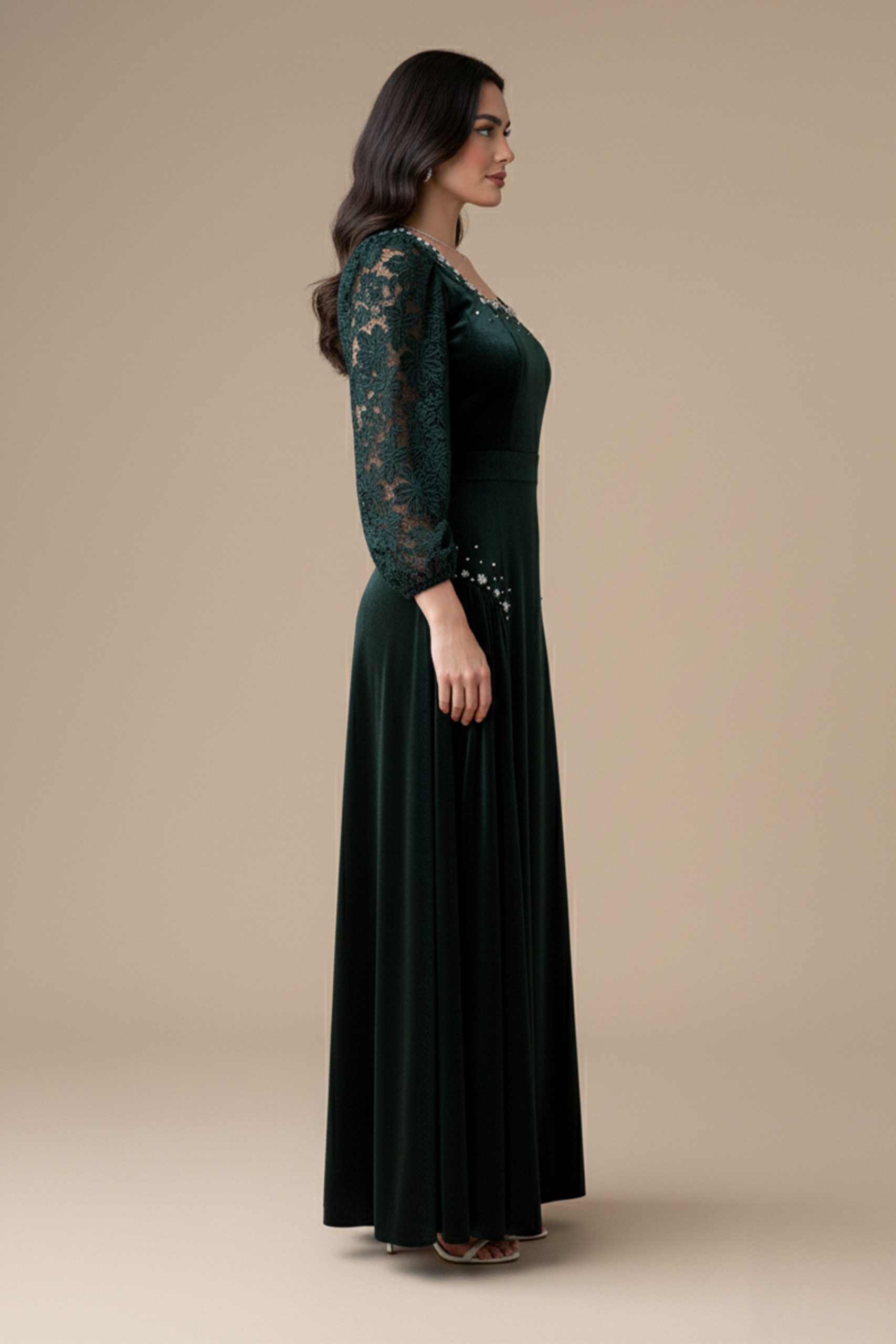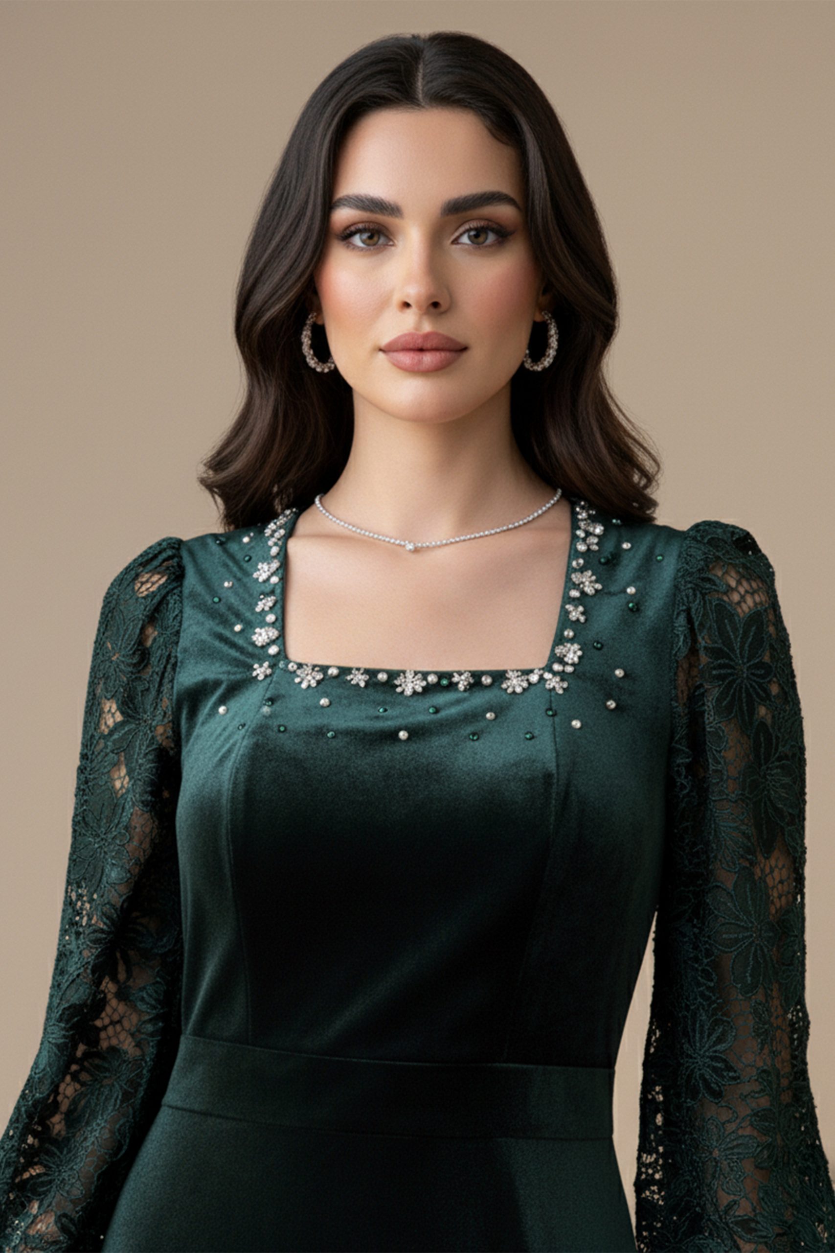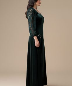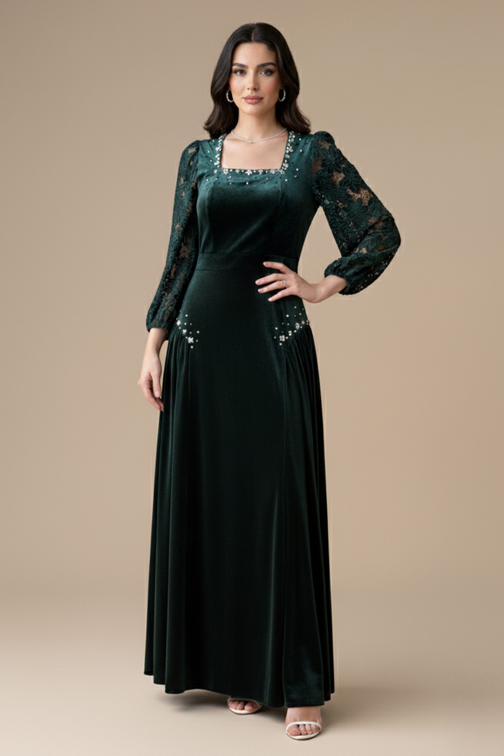 اكتان – فستان مخملي بأكمام جوبير مزين بالكريستال لون اخضر غامق