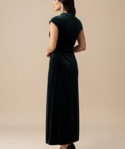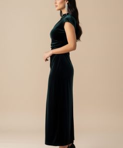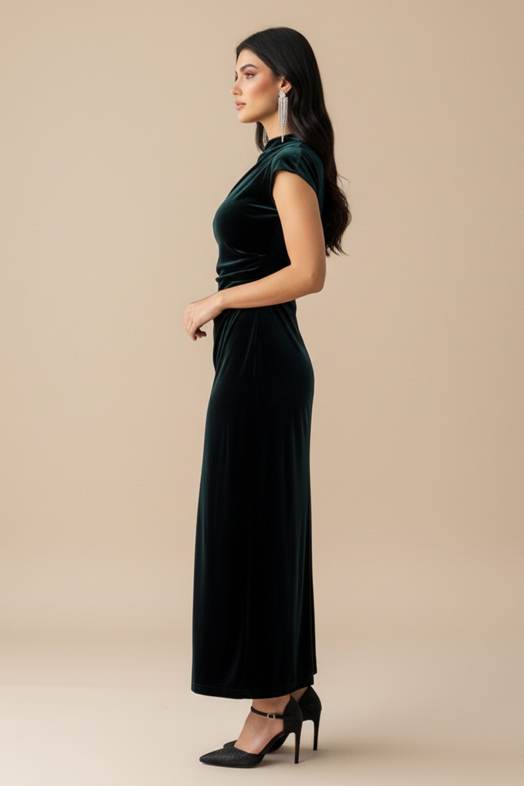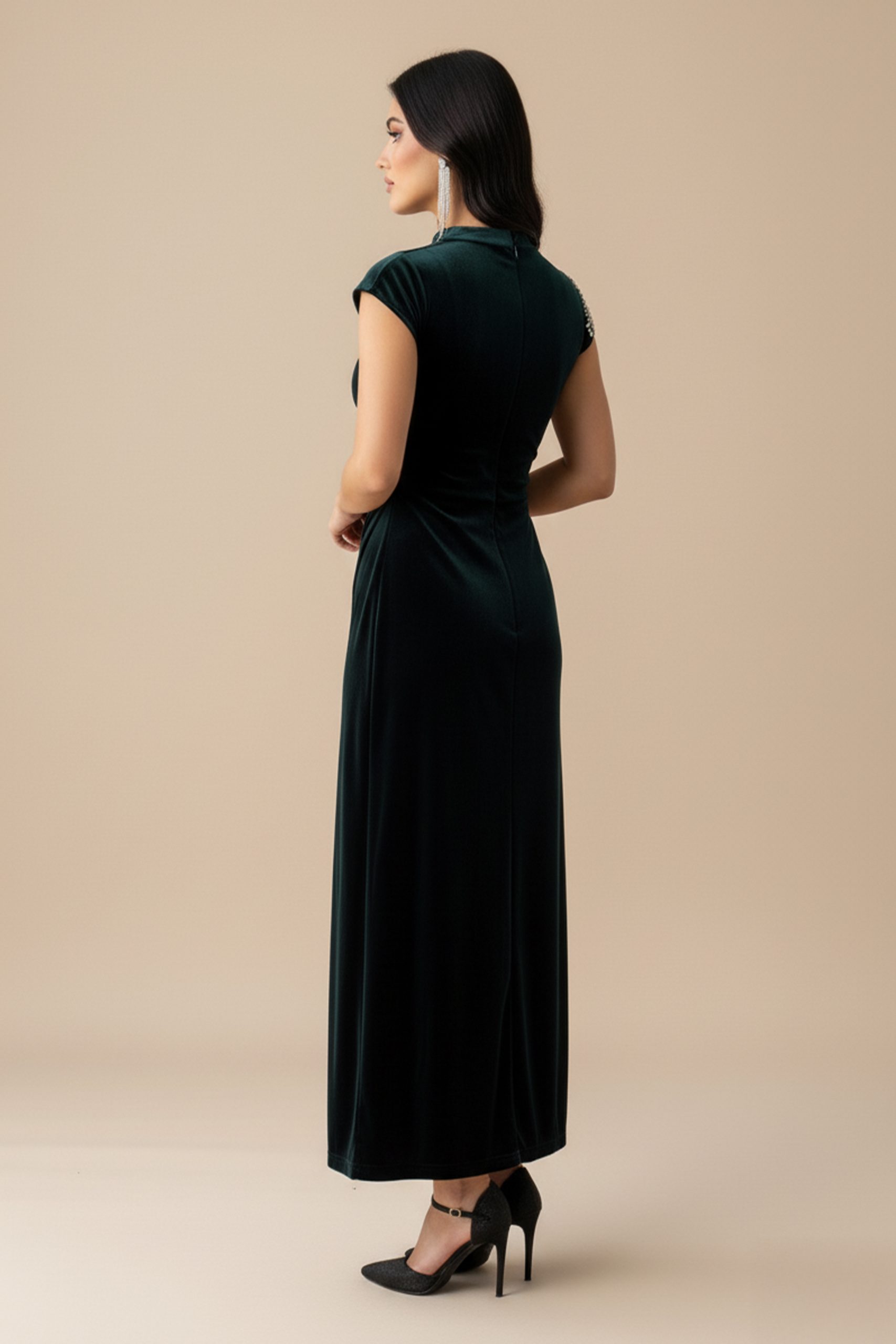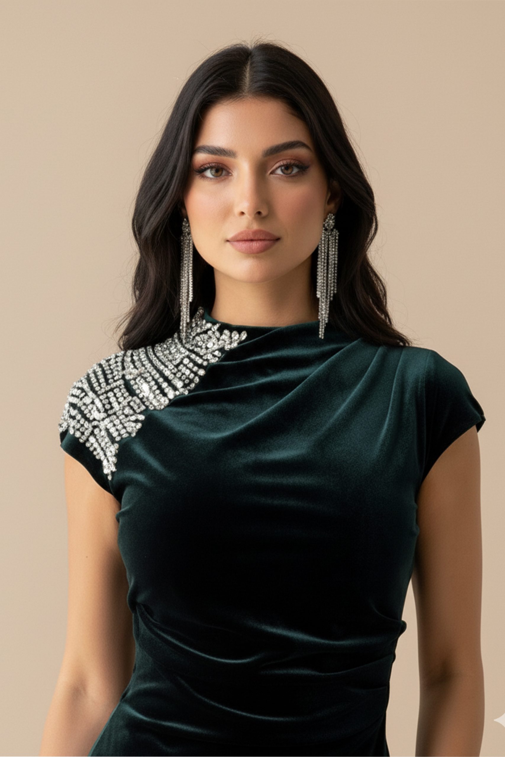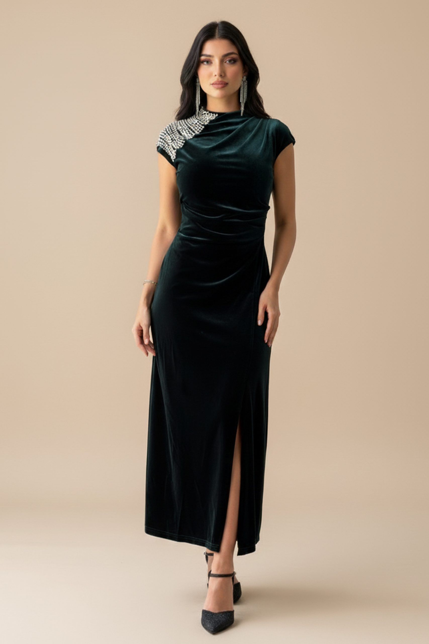 اكتان – فستان مخملي درابية مزين بكريستالات علي الكتف