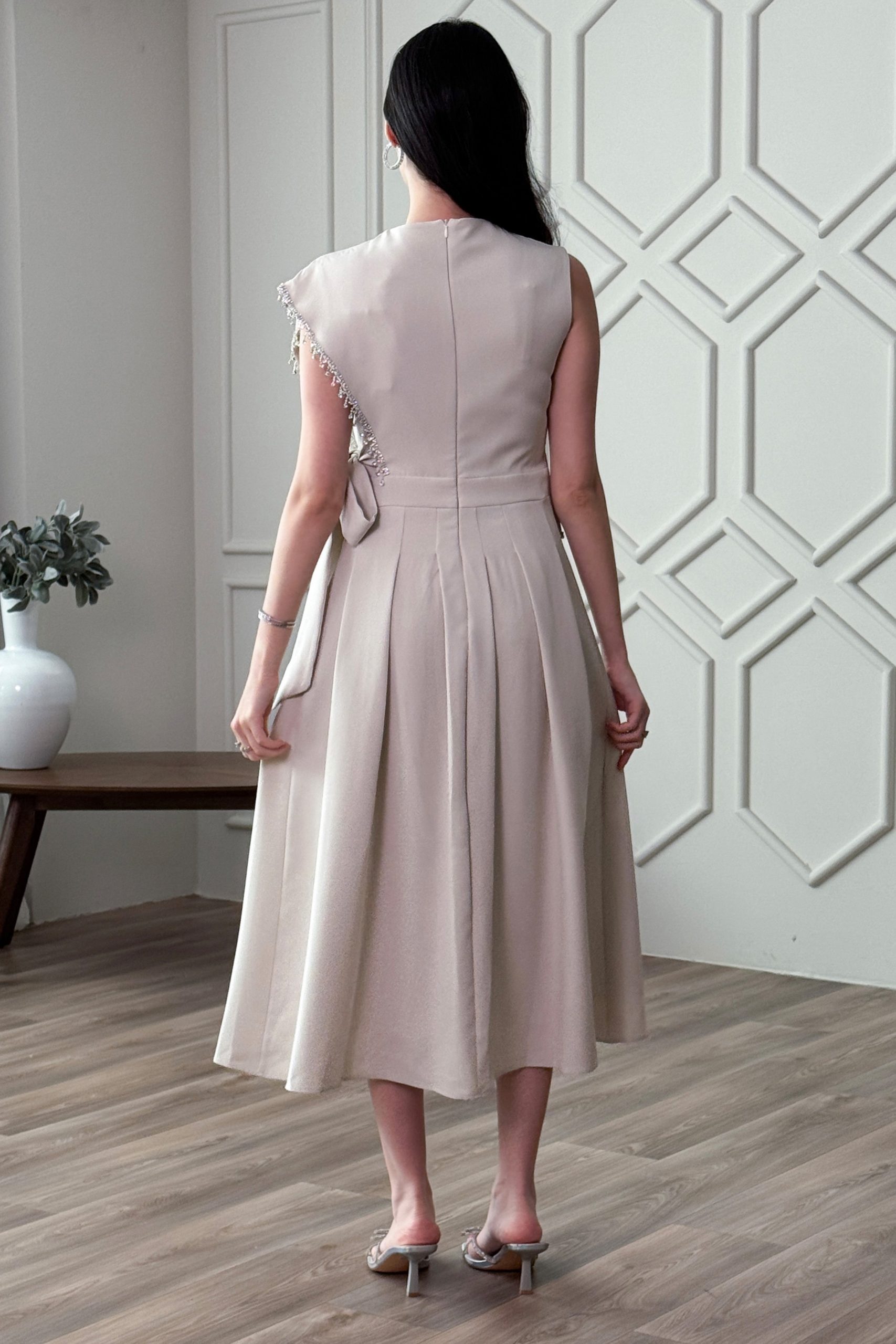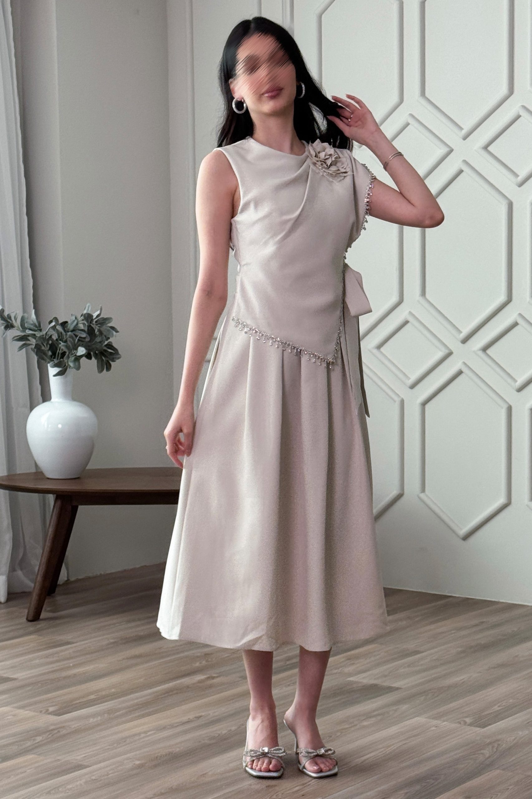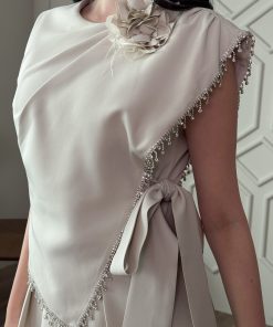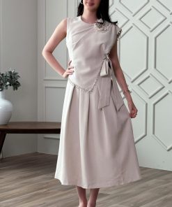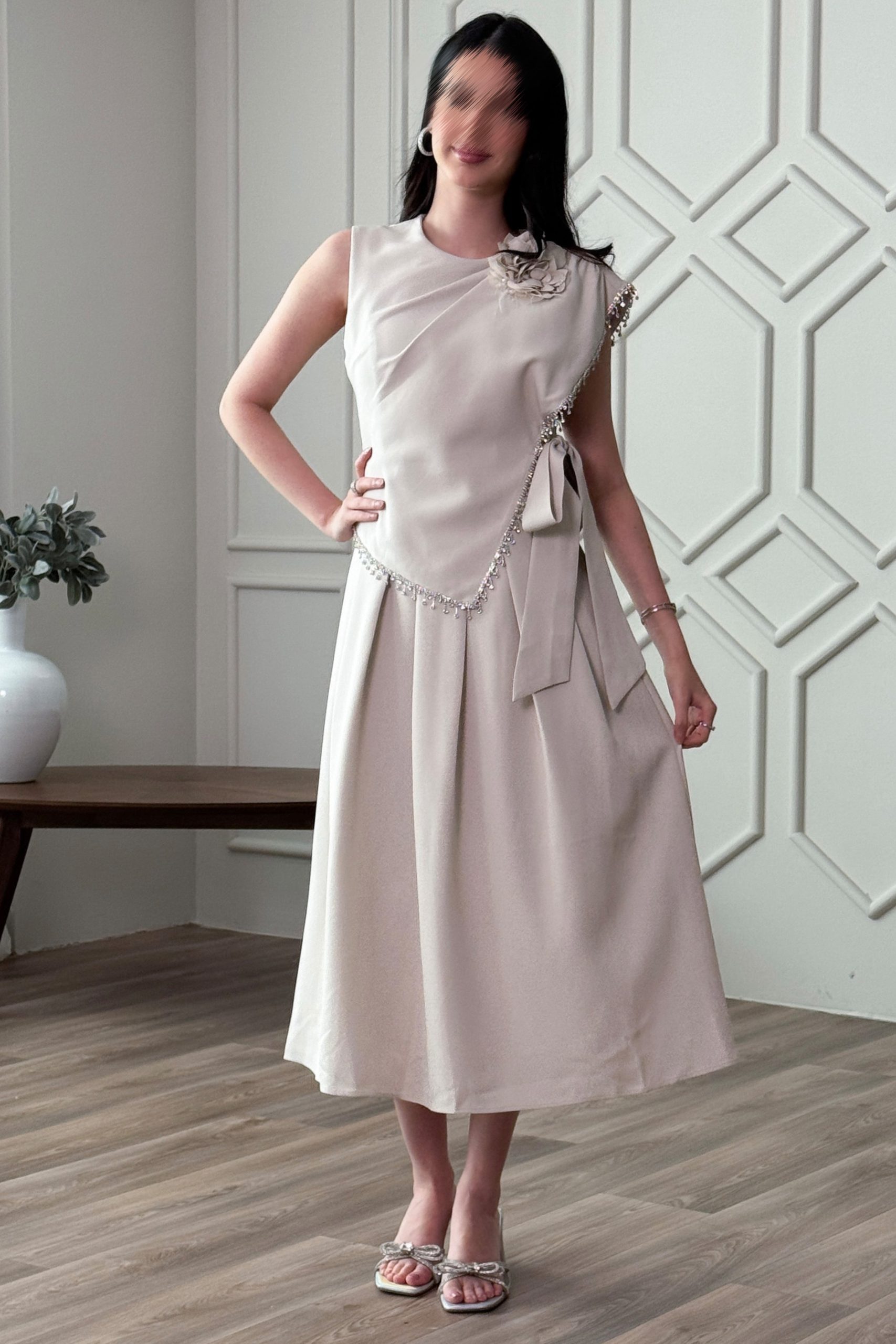 اكتان – فستان ميدي بربطة مزين ببروش ورد لون بيج