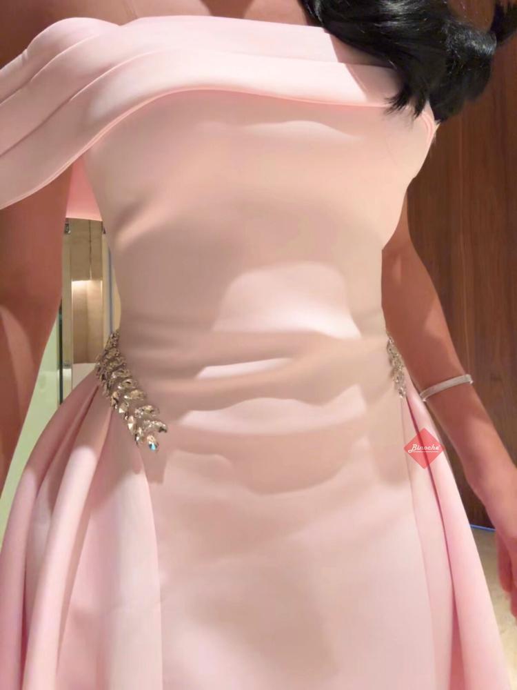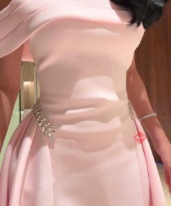 بينوش – فستان بنك ناعم ميد بقصه اوف شولدر مزينه بالإكسسوار
