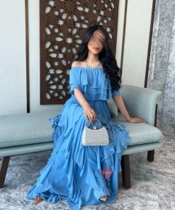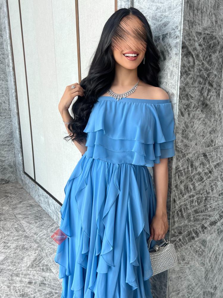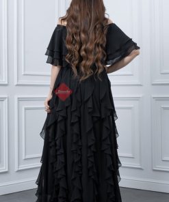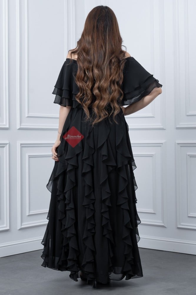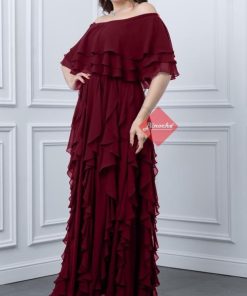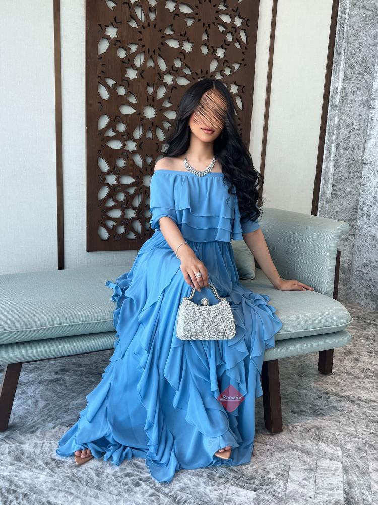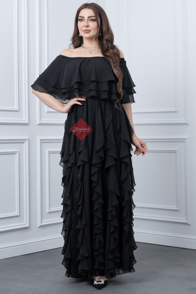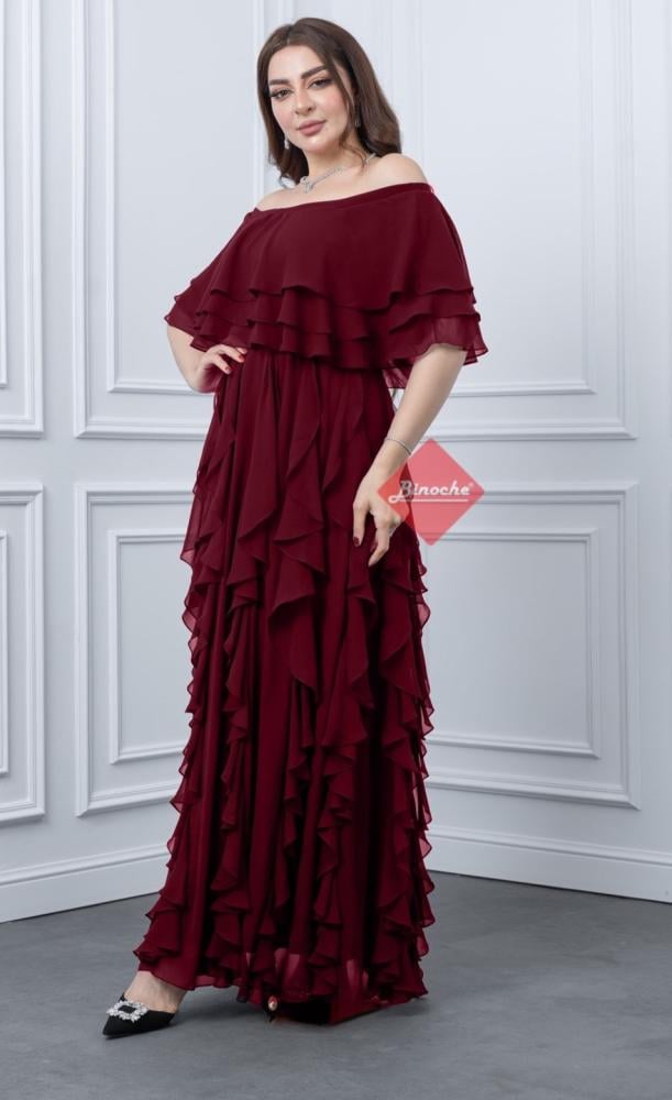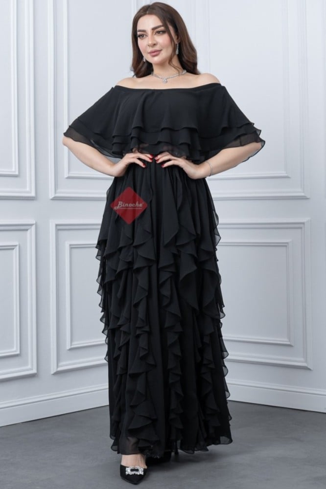 بينوش – فستان طويل كريب ناعم باكمام شيفون و كلفة مطرزة على الكتف
