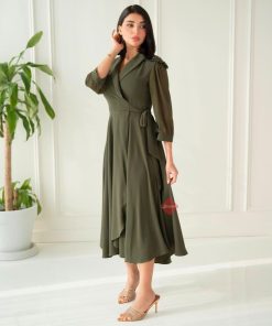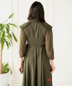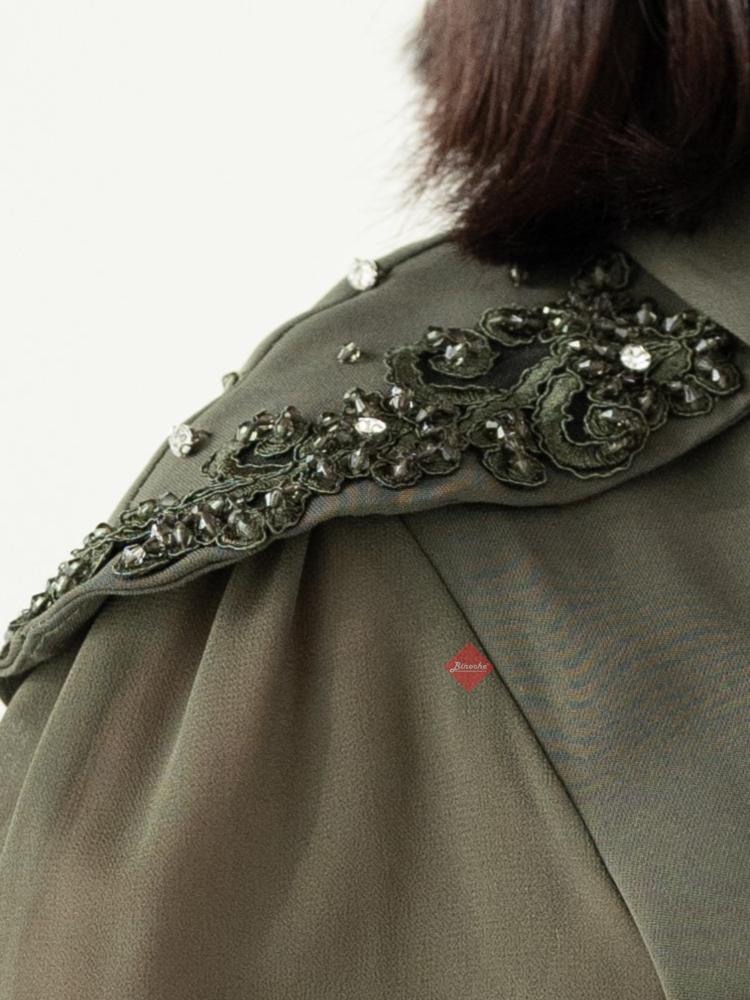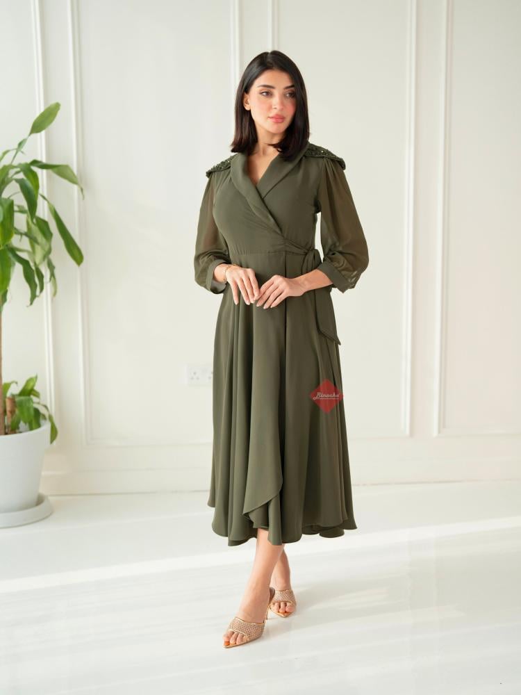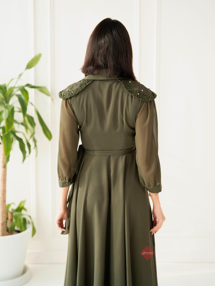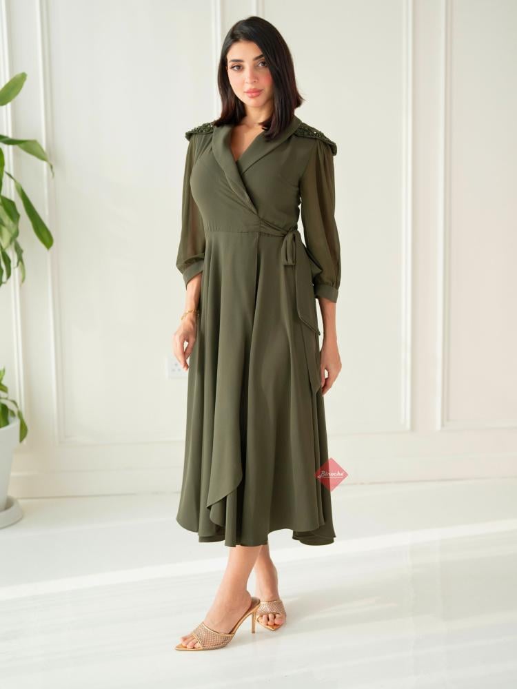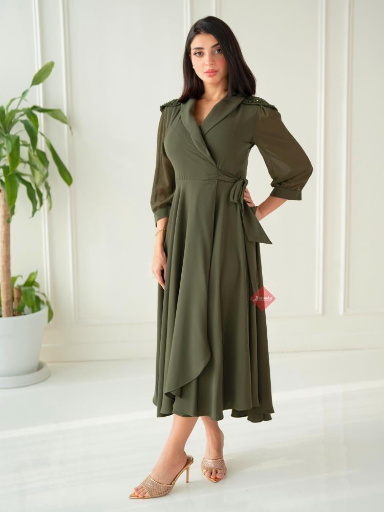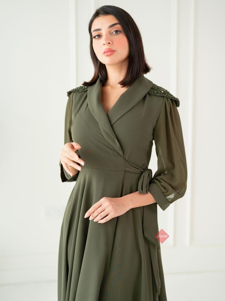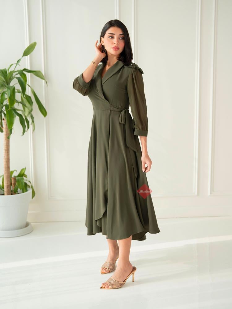 بينوش – فستان كريب ناعم باكمام شيفون و كلفة مطرزة على الكتف