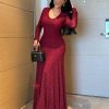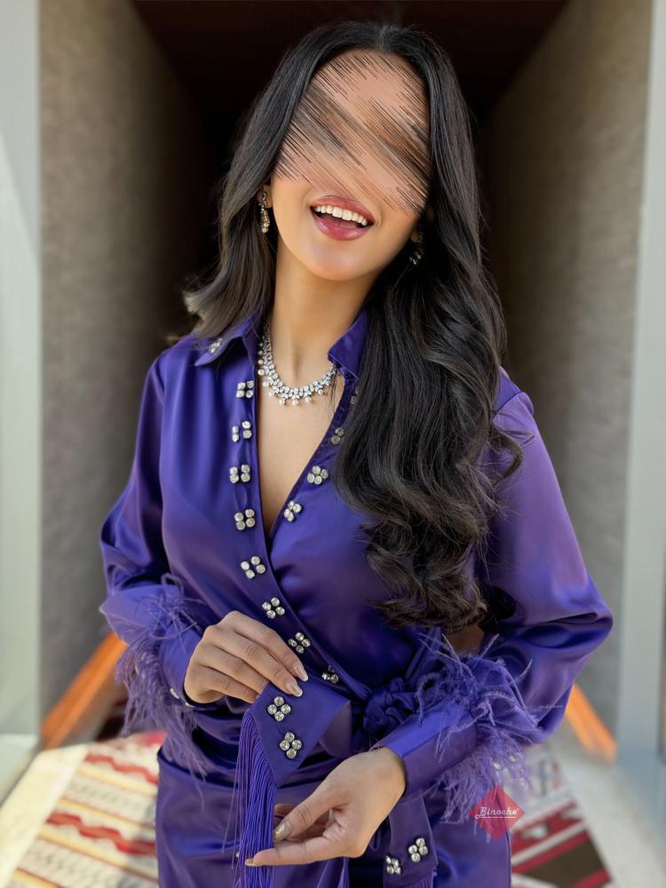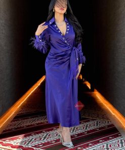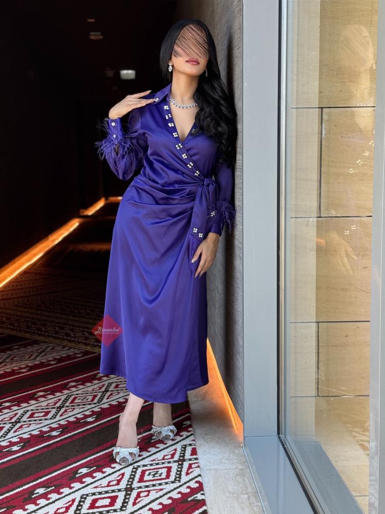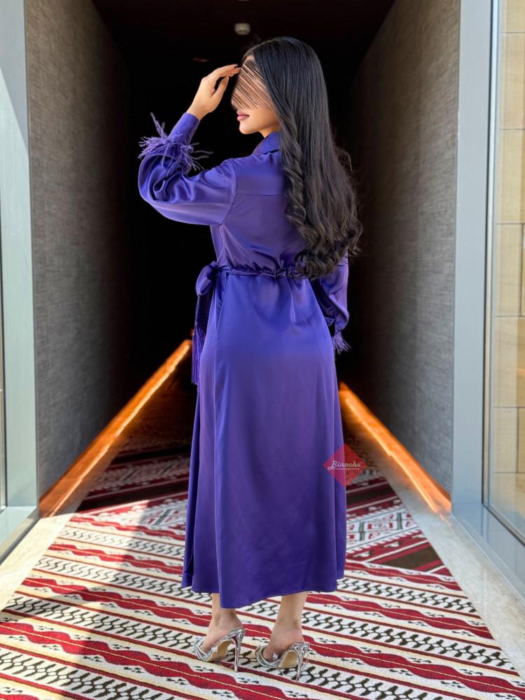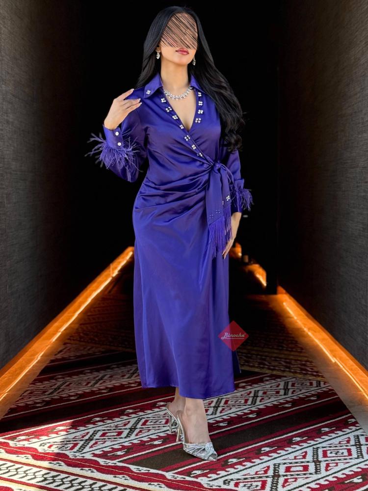 بينوش  – فستان ميدي ناعم ستايل لف و اكمام طويلة مزينة بالريش