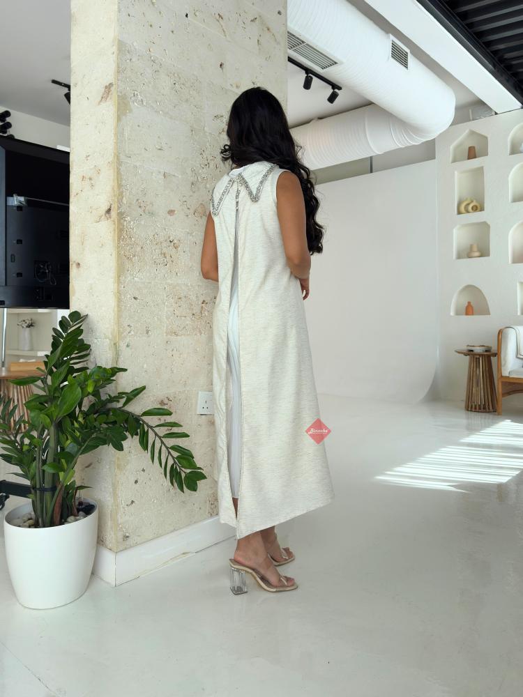 بينوش  – فستان ناعم بيج قطعتين ياقة كريستال