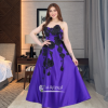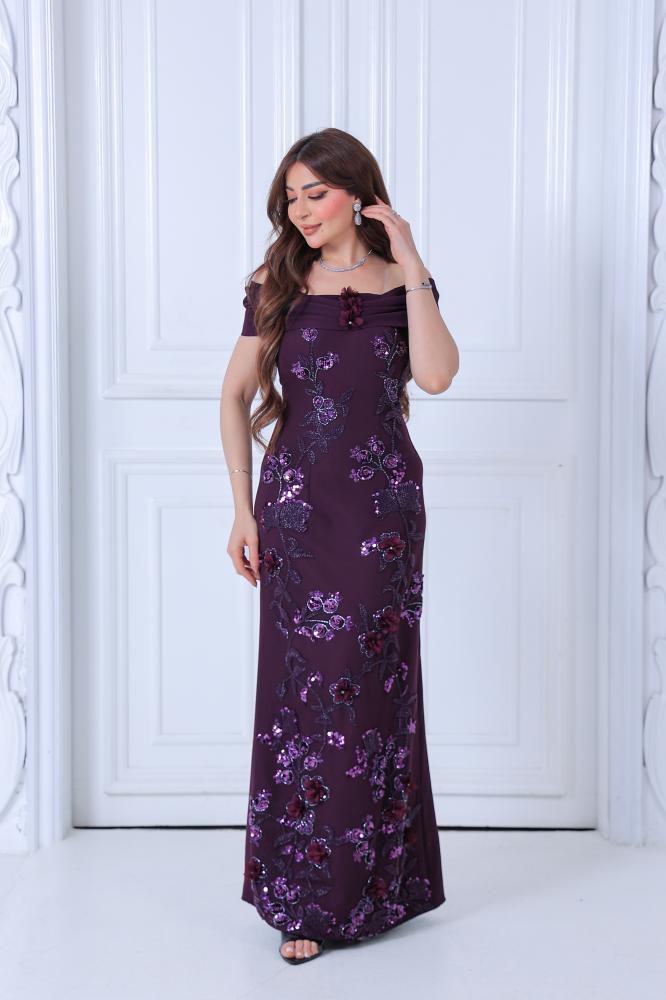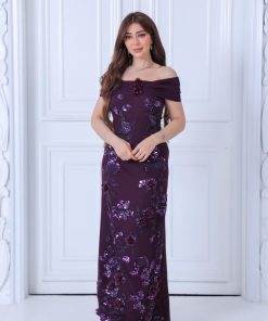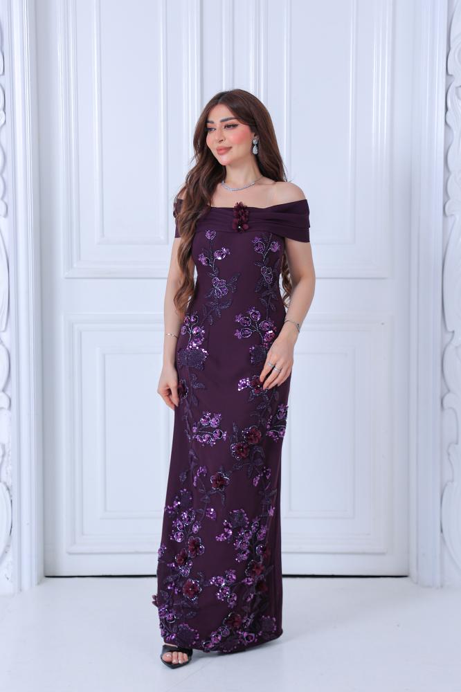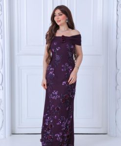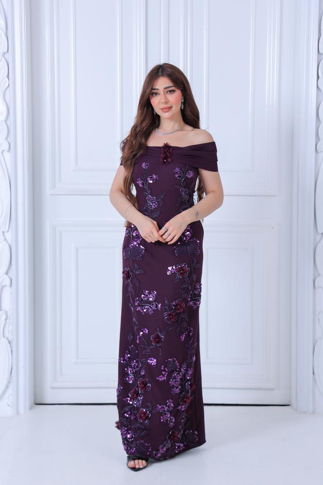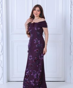 تريجر آيلاند – فستان سهرة بنفسجي بتصميم أوف شولدر مزين بتطريزات وردية