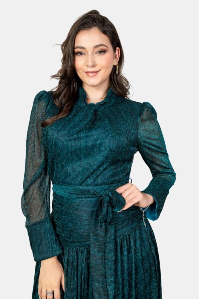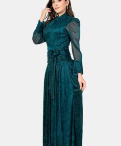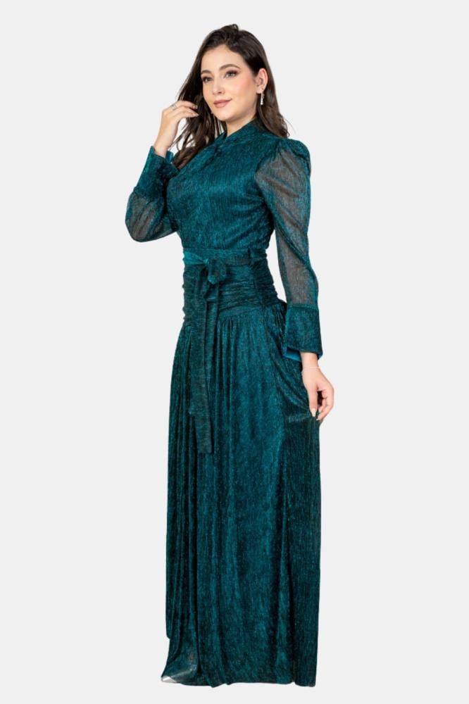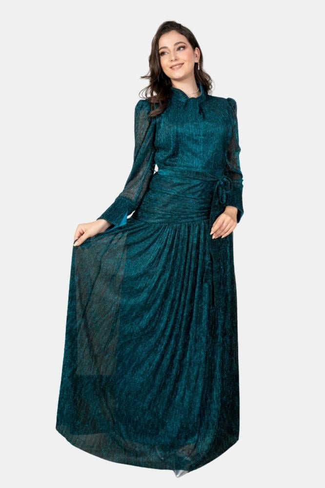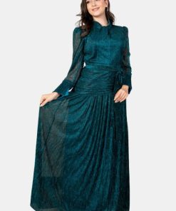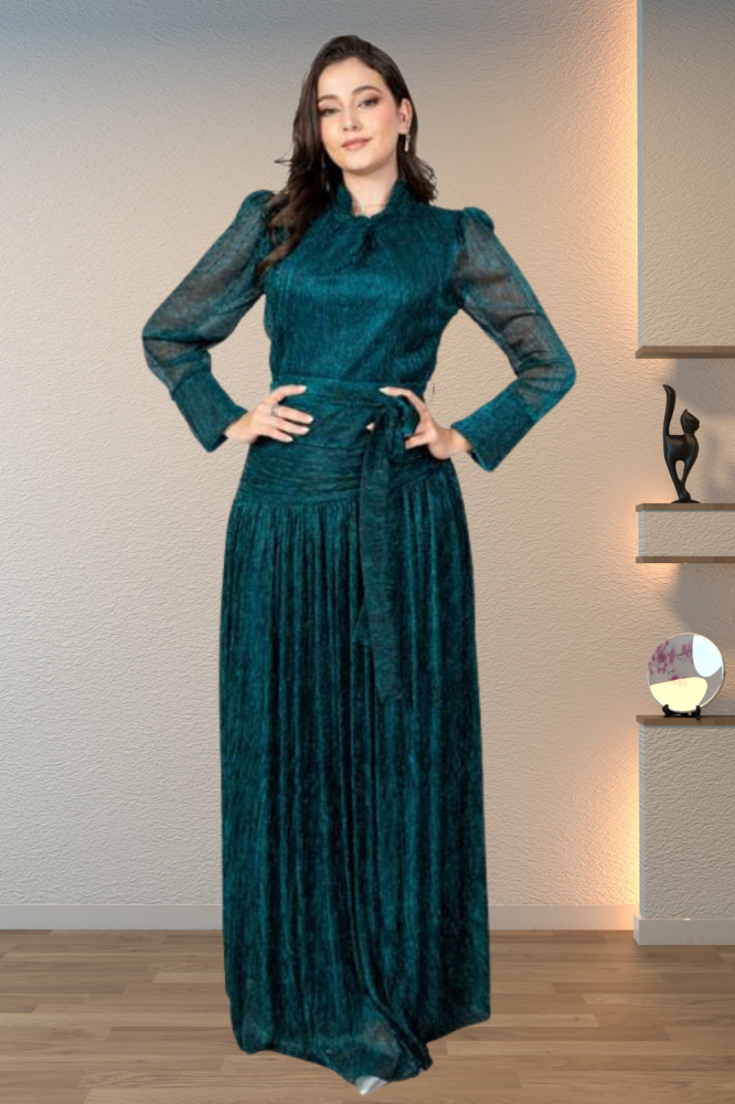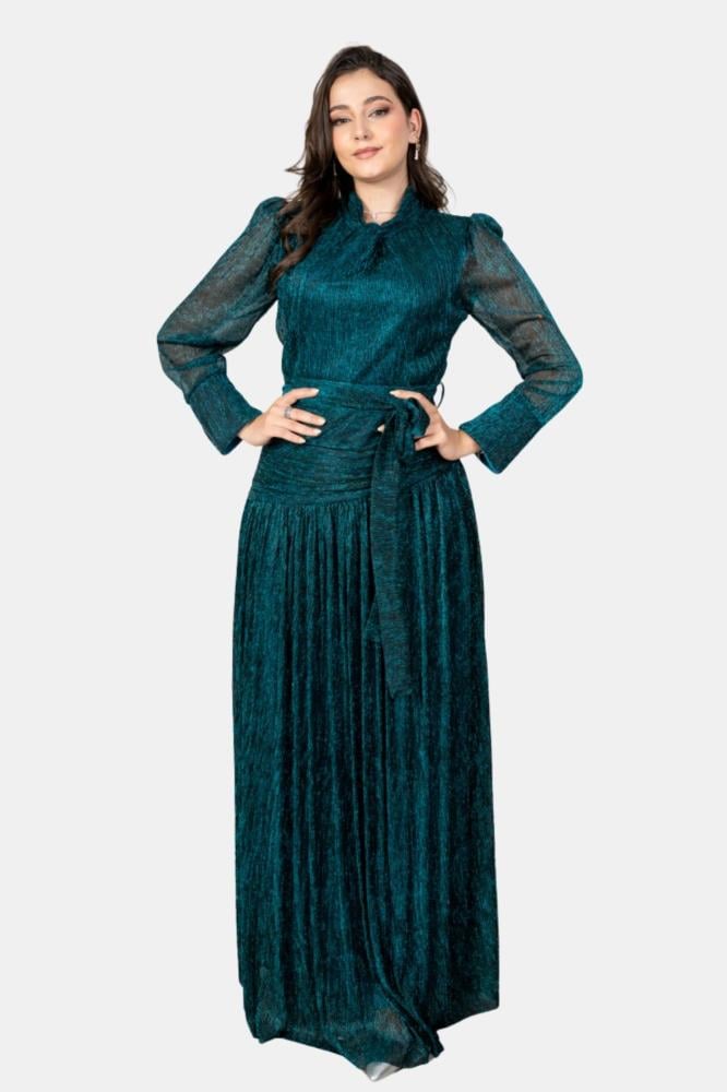 تريجر آيلاند – فستان سهرة ناعم طويل ساتر لامع بحزام على الخصر