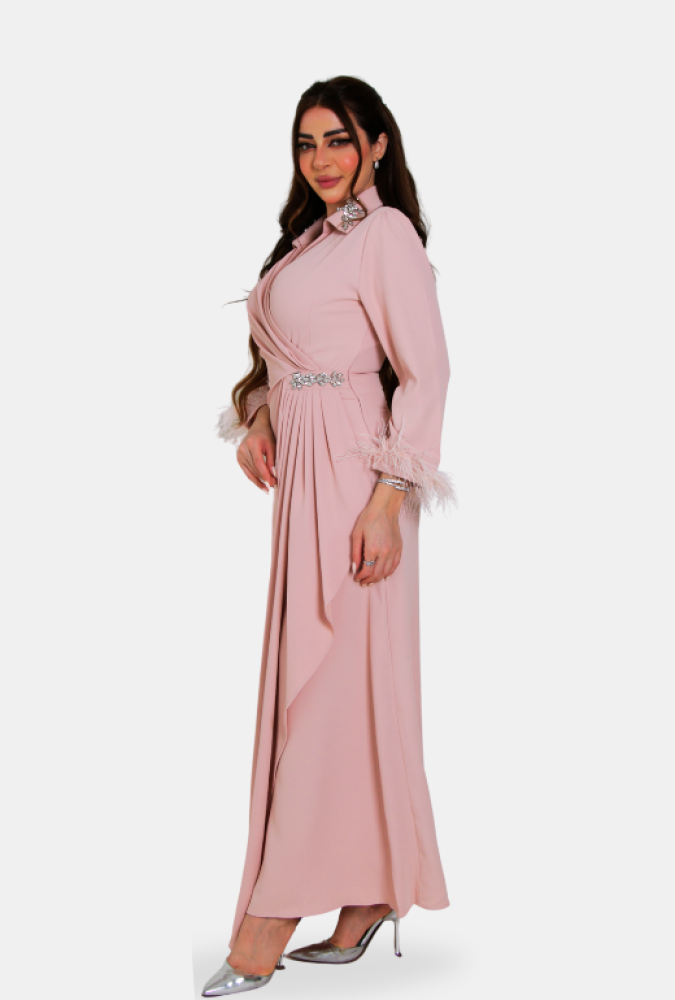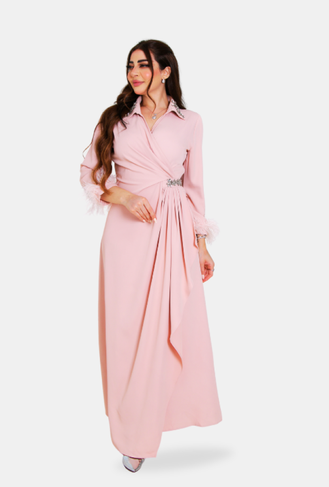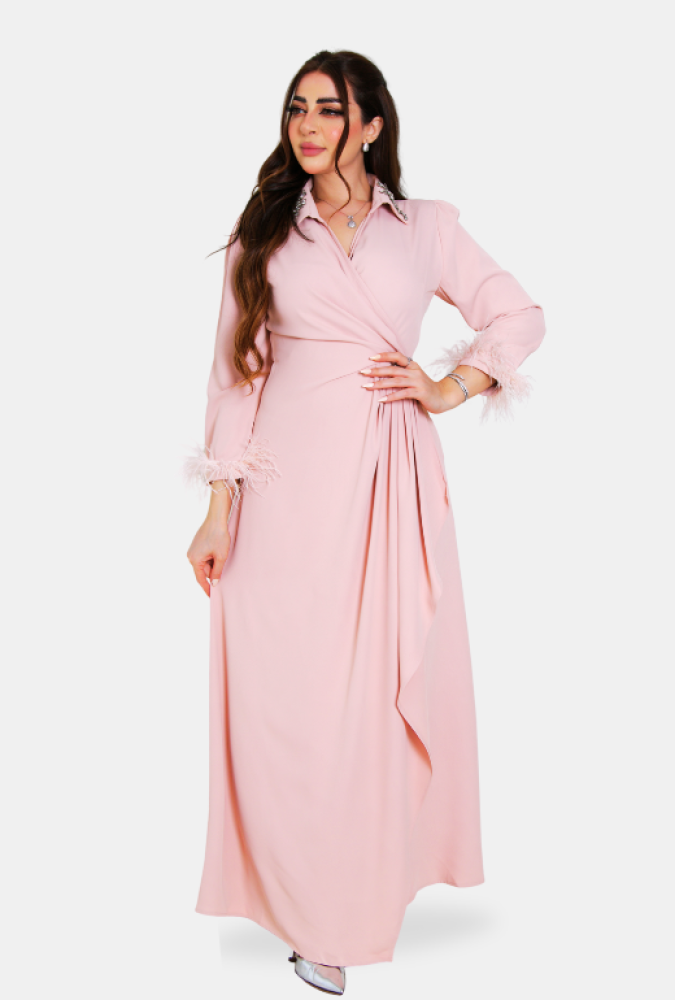 تريجر آيلاند – فستان ناعم طويل لف بأكمام مزينة بالريش